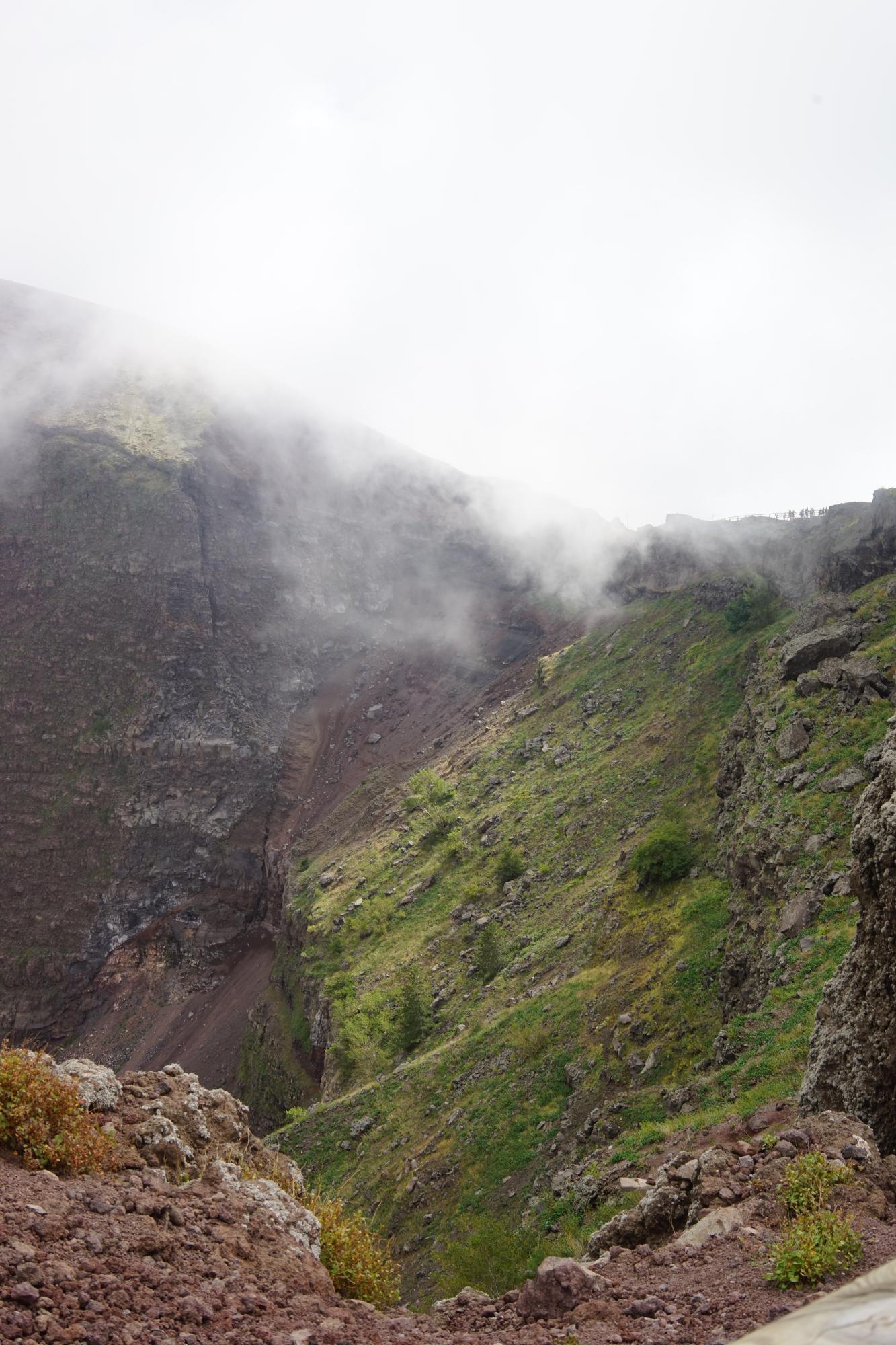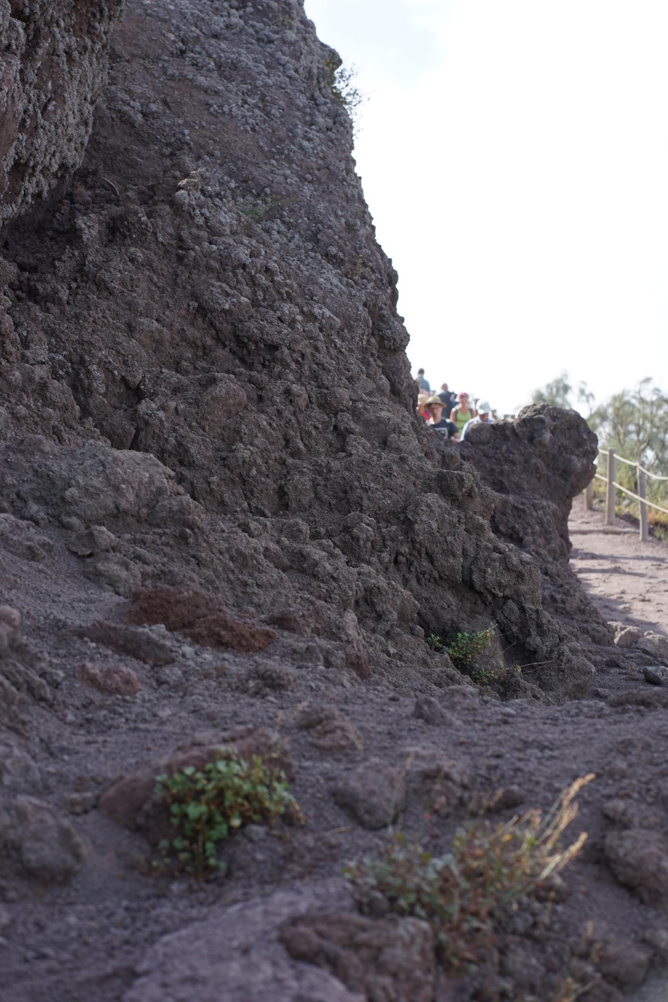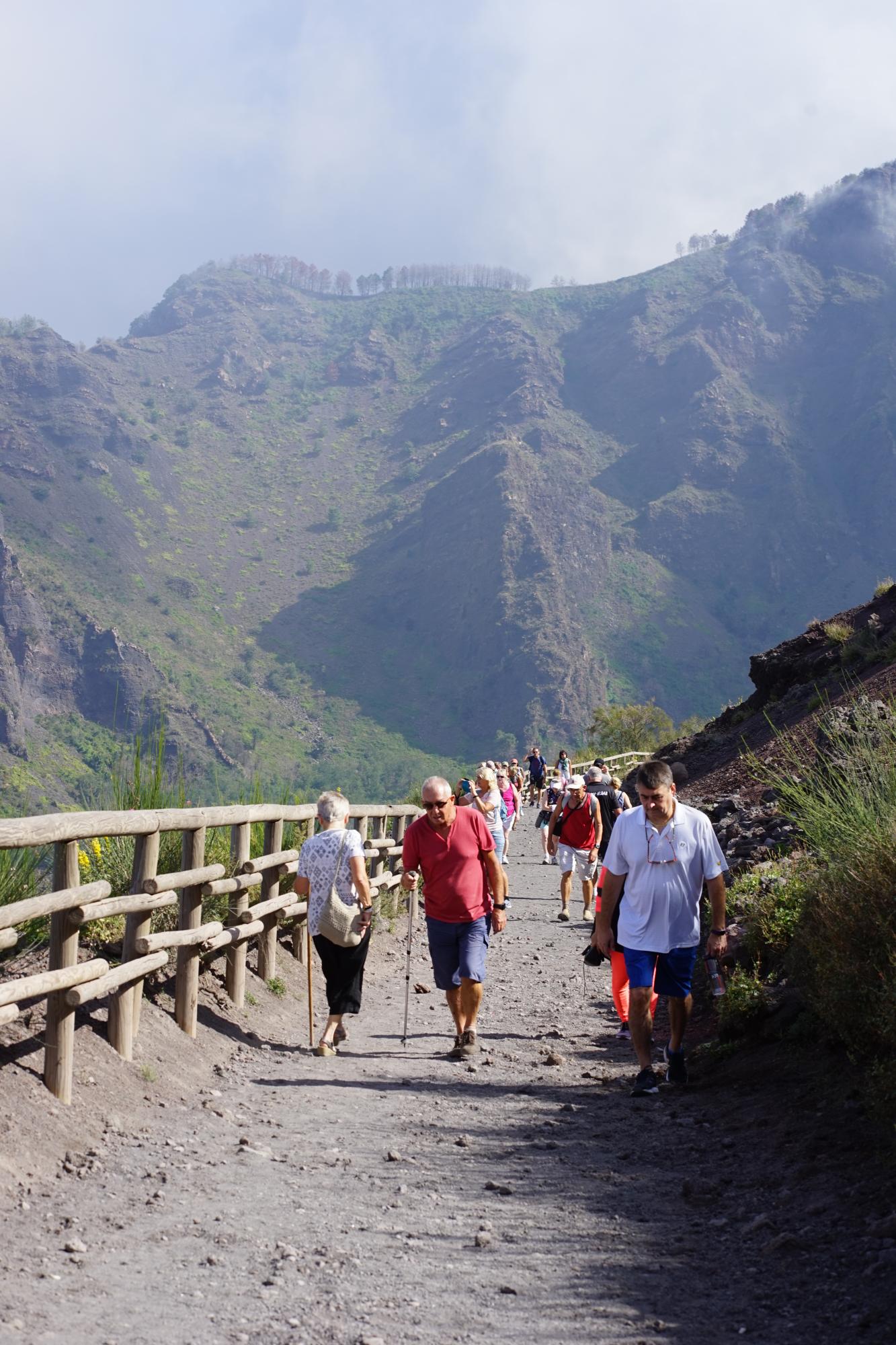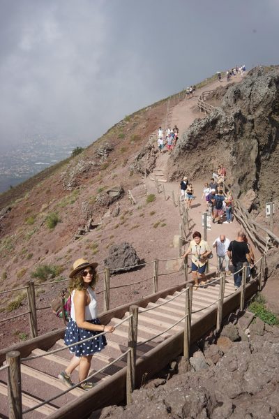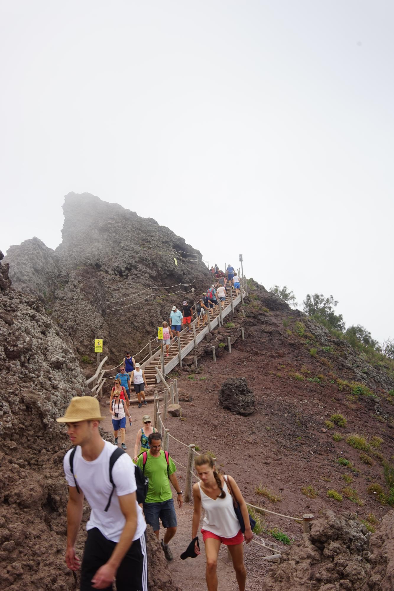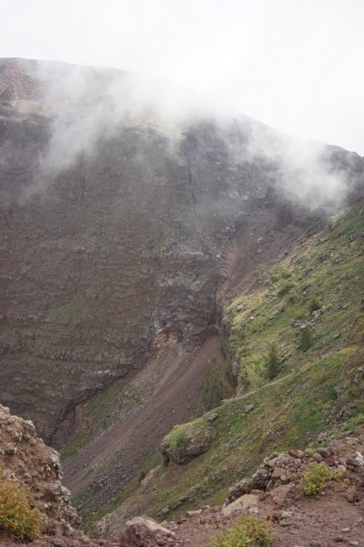 Nach dem Frühstück stand dann ein volles Programm für den zweiten Tag an. Als erstes fuhren wir mit dem Bus auf den Vesuv, wobei der Bus die meiste Zeit im stehenden Zustand verbachte da der Fahrer wild gestikulierend telefonieren musste. Generell ist in Italien jeder immer und überall am Telefonieren. Vor allem auf der Autobahn bei 120 km/h. Am Vesus angekommen ging es zu Fuß eine halbe Stunde steil bergauf. Wobei die Landschaft mehr an einen Spaziergang auf dem Mars erinnerte. Der Krater an sich war dann recht unspektakulär und der Vulkan machte nicht den Eindruck in nächster Zeit ausbrechen zu wollen. Die Aussicht war den Aufstieg aber trotzdem wert.