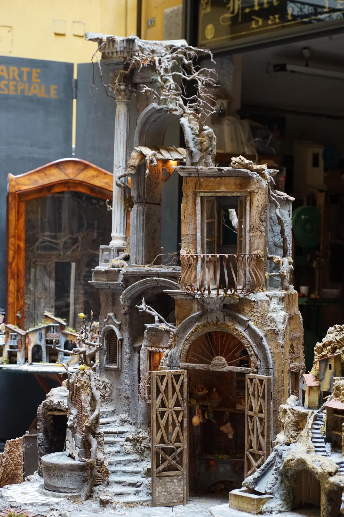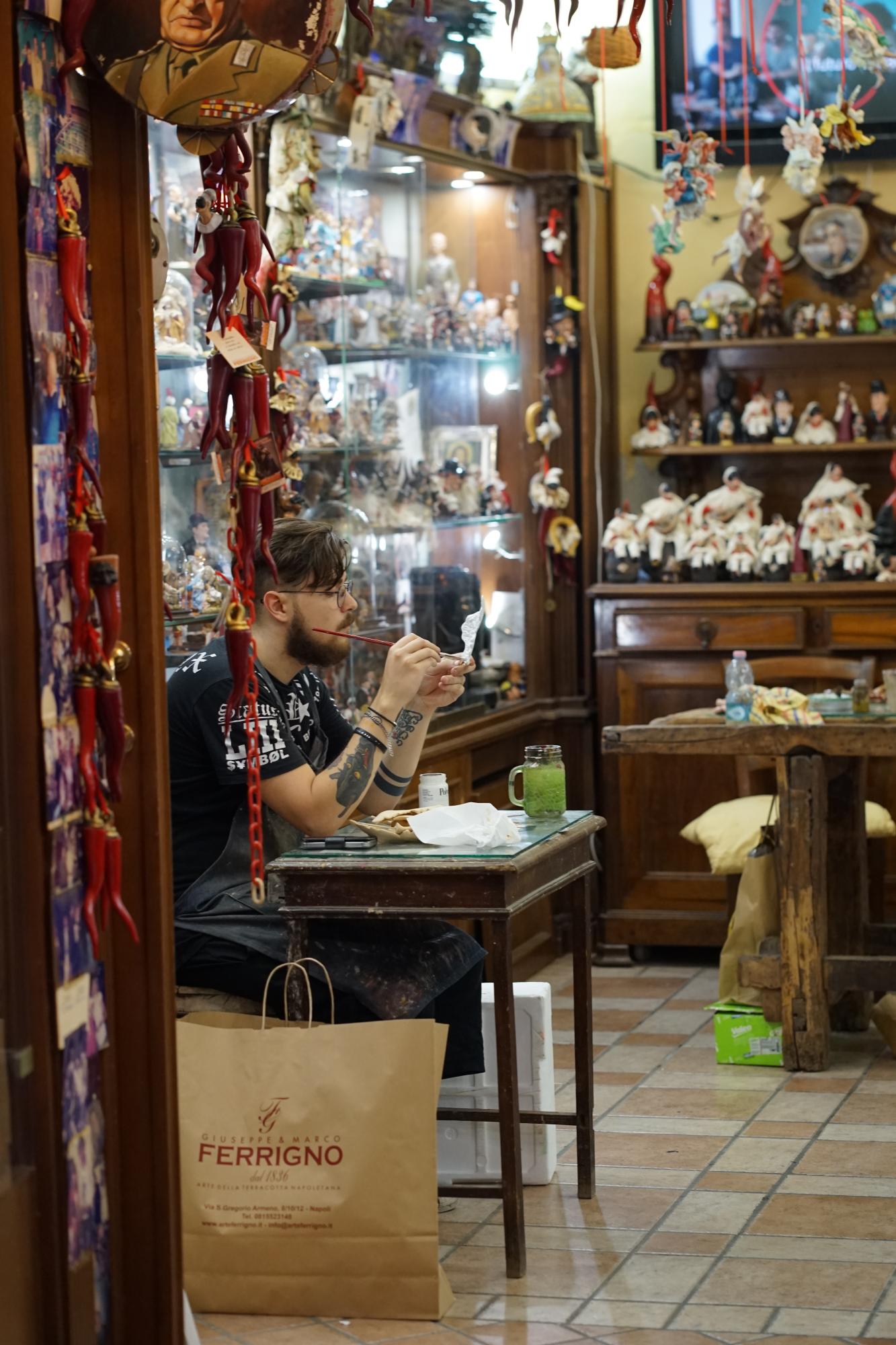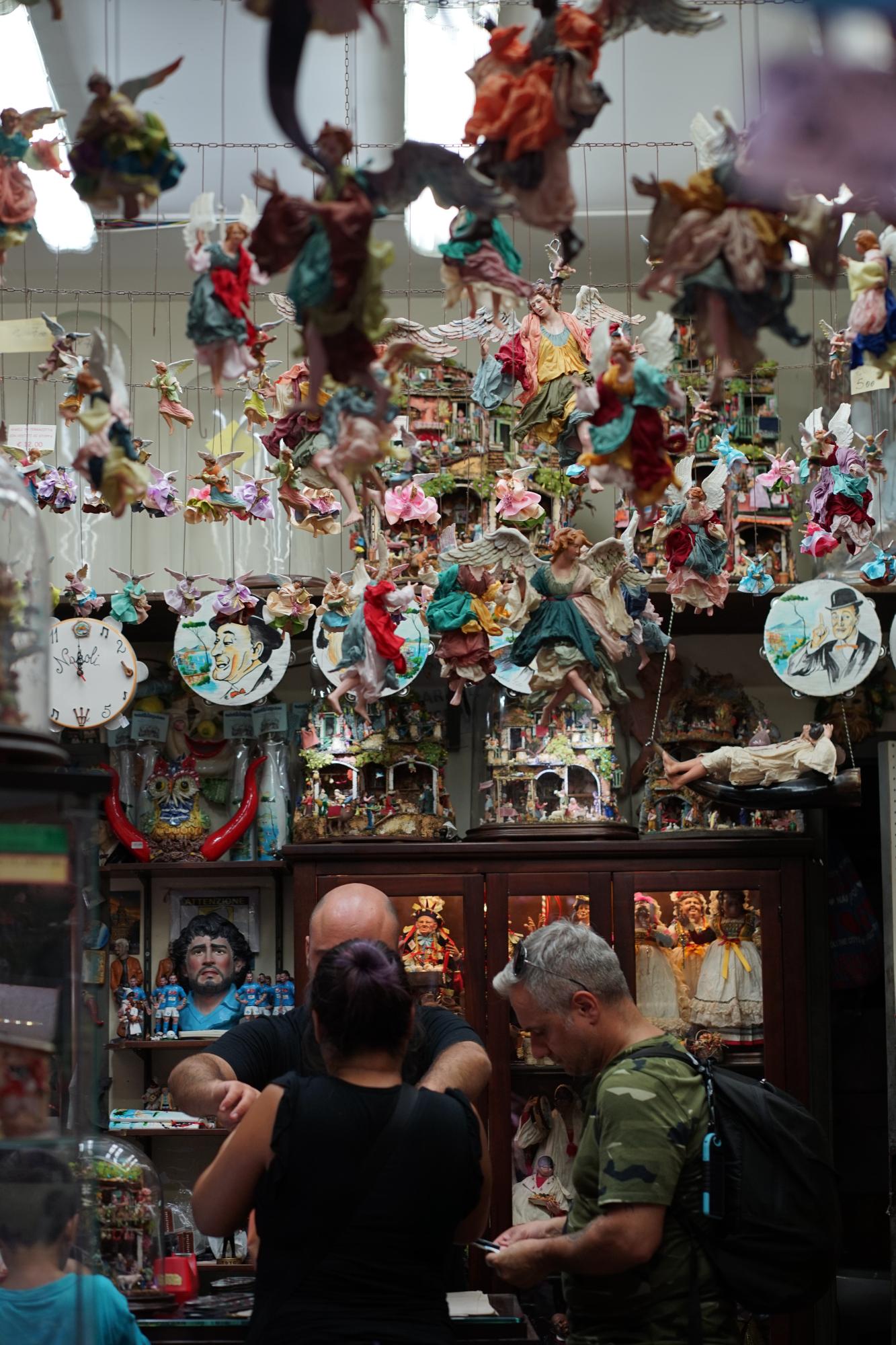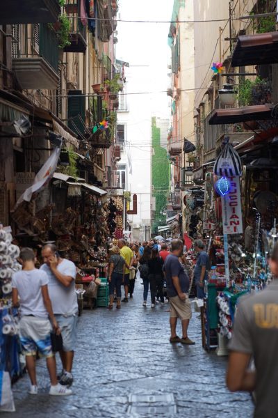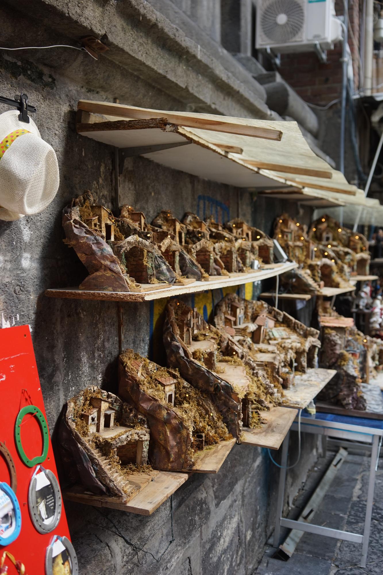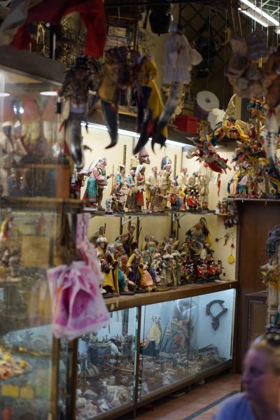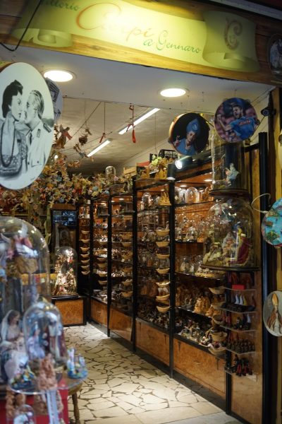 Zurück in Pompei stiegen wir dann in den Zug nach Neapel, wo wir am Hauptbahnhof erstmal vom Chaos und der puren Unordnung überwältigt waren. Über all auf den Straßen lag Plastikmüll herum und die alten schmalen Gassen waren komplett verstopft mit Autos und Motorollern. Der erste interessante Stopp für mich war dann das Viertel in dem das ganze Jahr über Grippen und anderer Nippes hergestellt werden. Eine beeindruckende Anzahl an Jesus Kindern und andere skurriler Figuren wurde uns geboten. Ein Großteil davon wird Vorort bemalt und hergestellt. Neben der Dekoration wurden uns die obligatorischen Handtaschen von Gucci und Versace auch an jeder Ecke angeboten.
