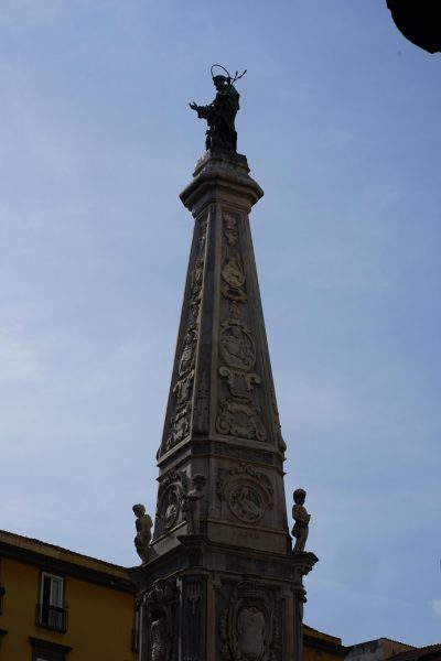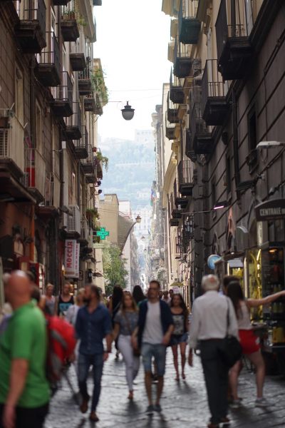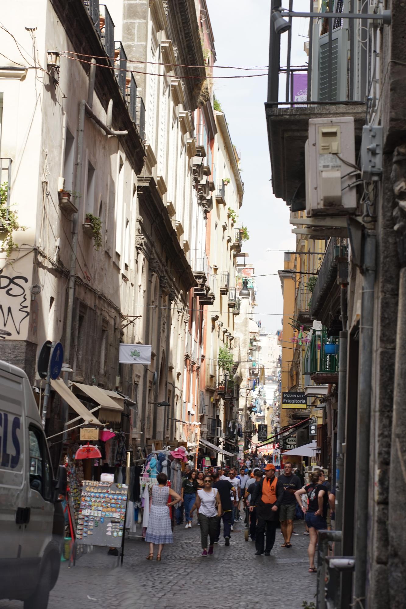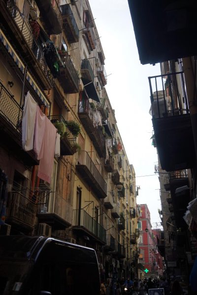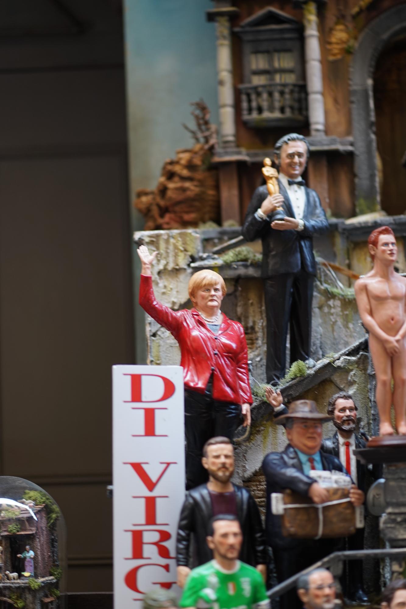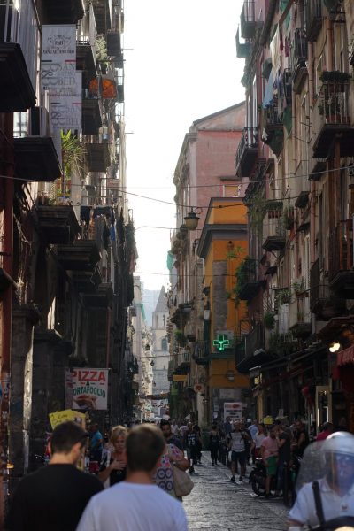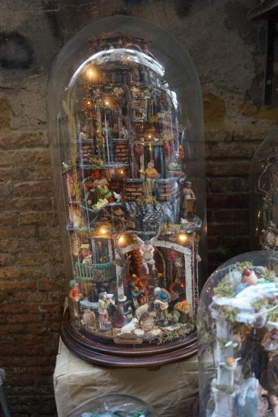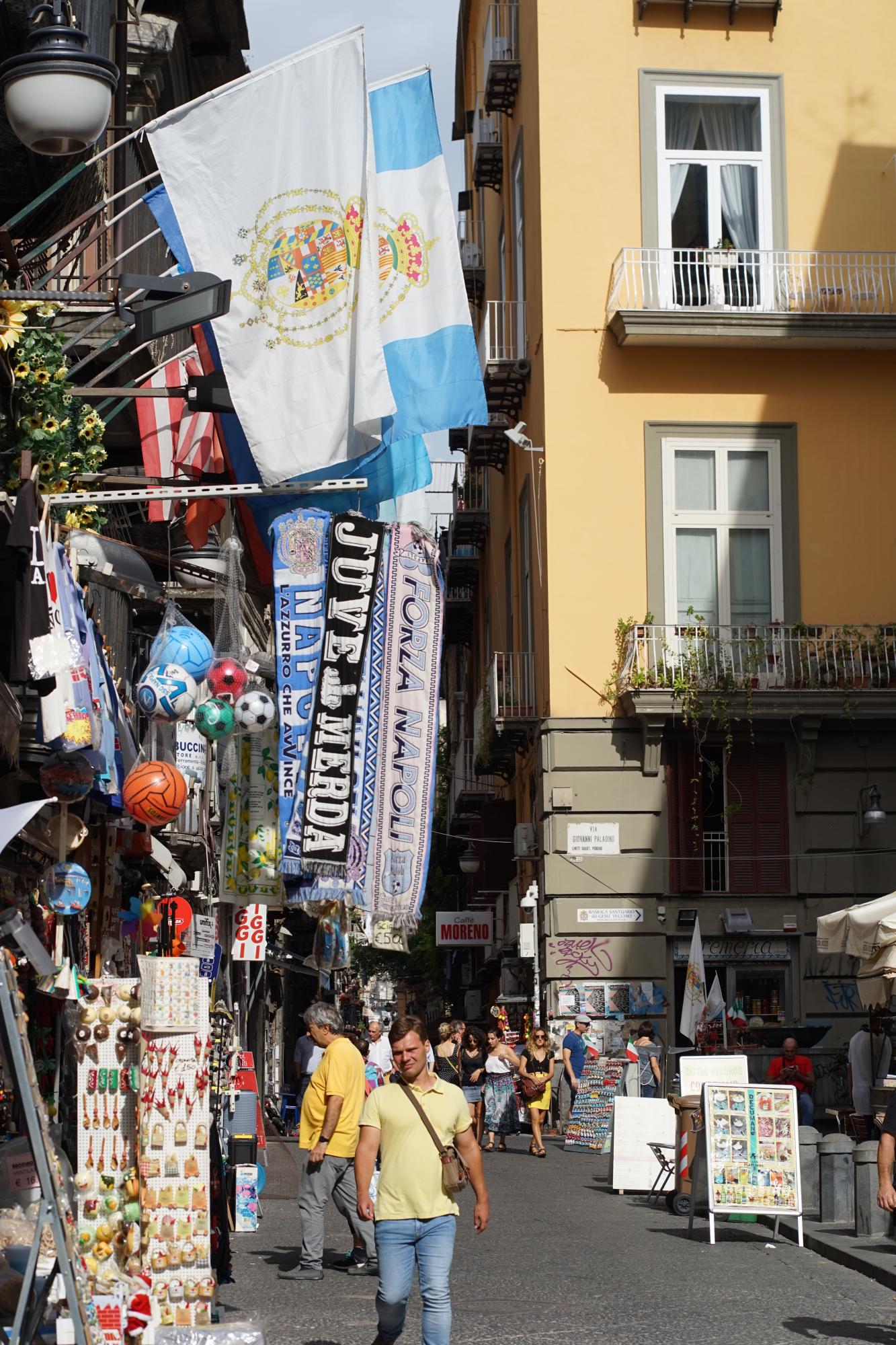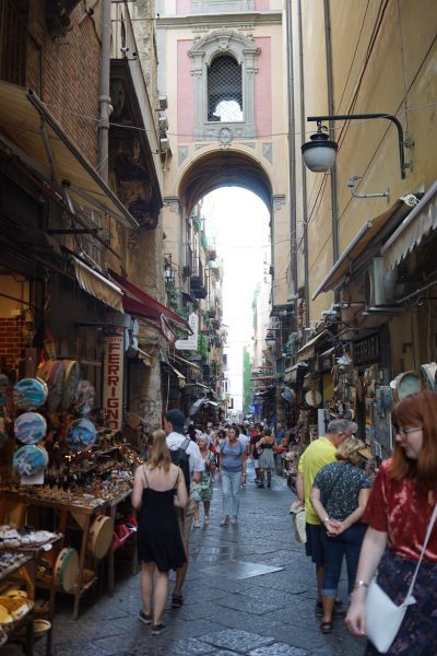 Zurück in Pompei stiegen wir dann in den Zug nach Neapel, wo wir am Hauptbahnhof erstmal vom Chaos und der puren Unordnung überwältigt waren. Über all auf den Straßen lag Plastikmüll herum und die alten schmalen Gassen waren komplett verstopft mit Autos und Motorollern. Der erste interessante Stopp für mich war dann das Viertel in dem das ganze Jahr über Grippen und anderer Nippes hergestellt werden. Eine beeindruckende Anzahl an Jesus Kindern und andere skurriler Figuren wurde uns geboten. Ein Großteil davon wird Vorort bemalt und hergestellt. Neben der Dekoration wurden uns die obligatorischen Handtaschen von Gucci und Versace auch an jeder Ecke angeboten.