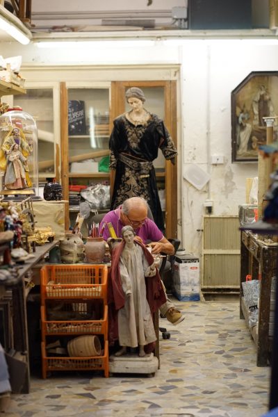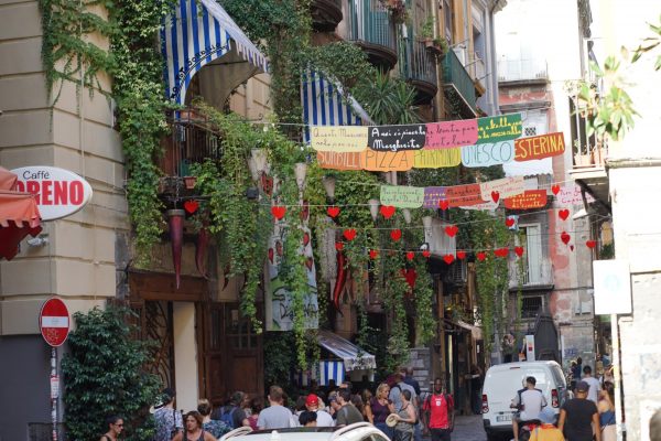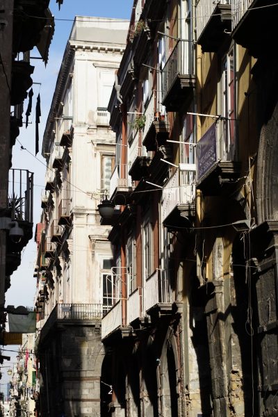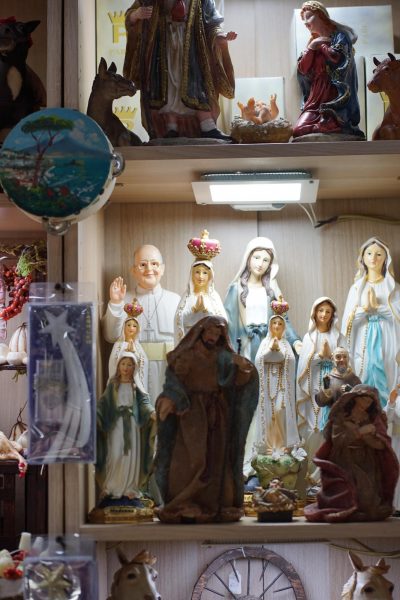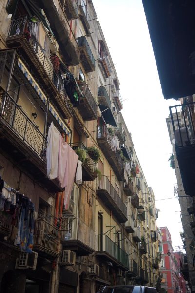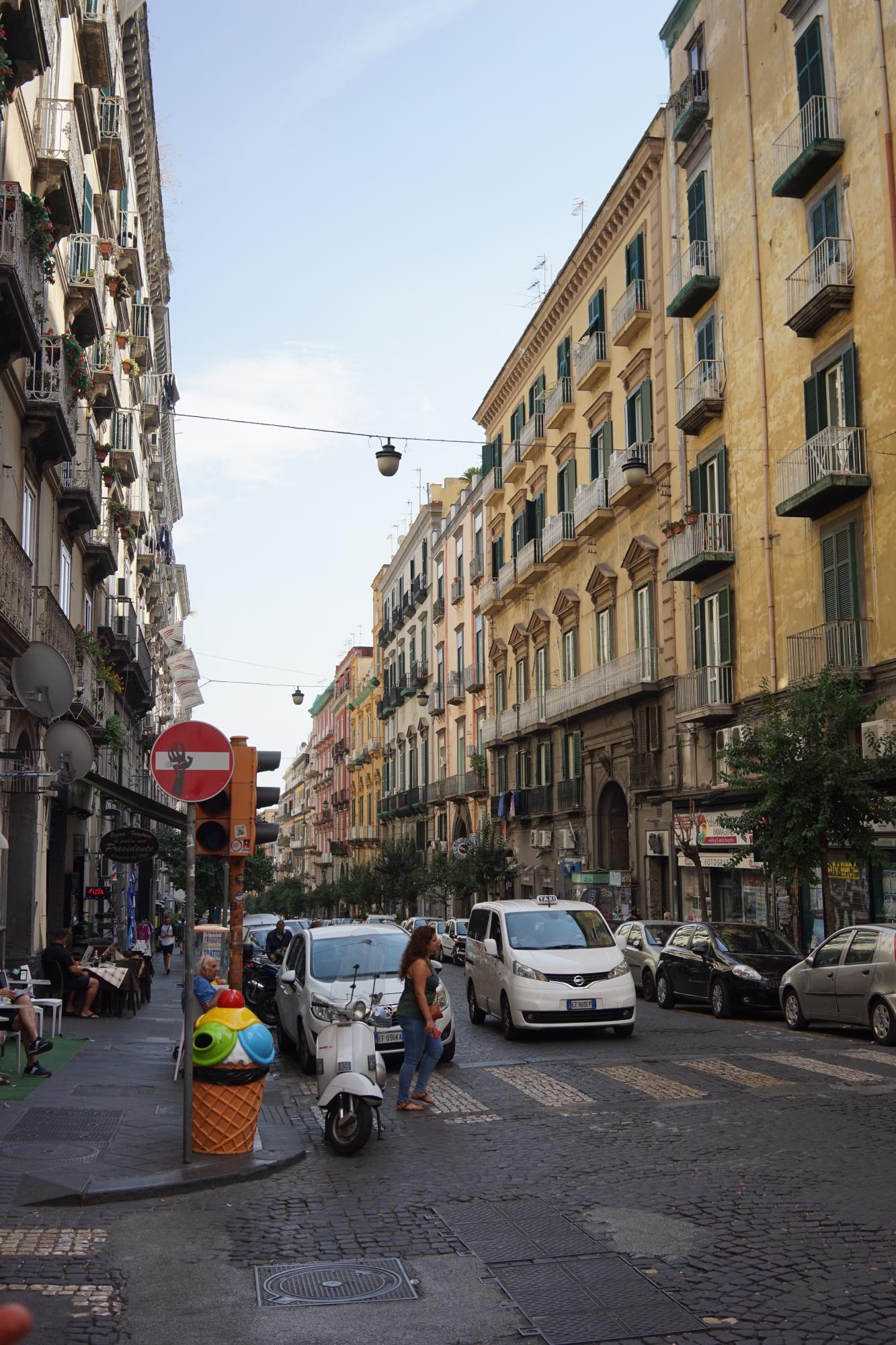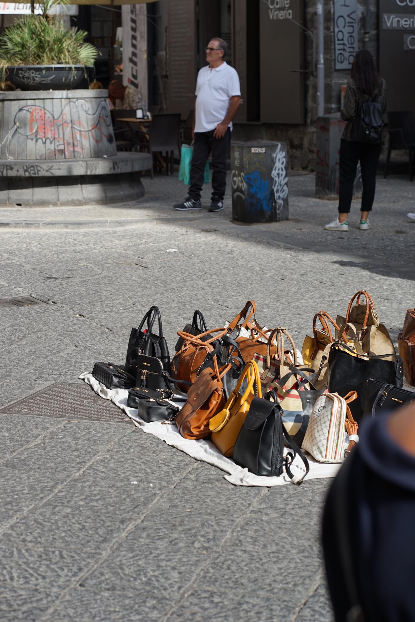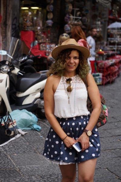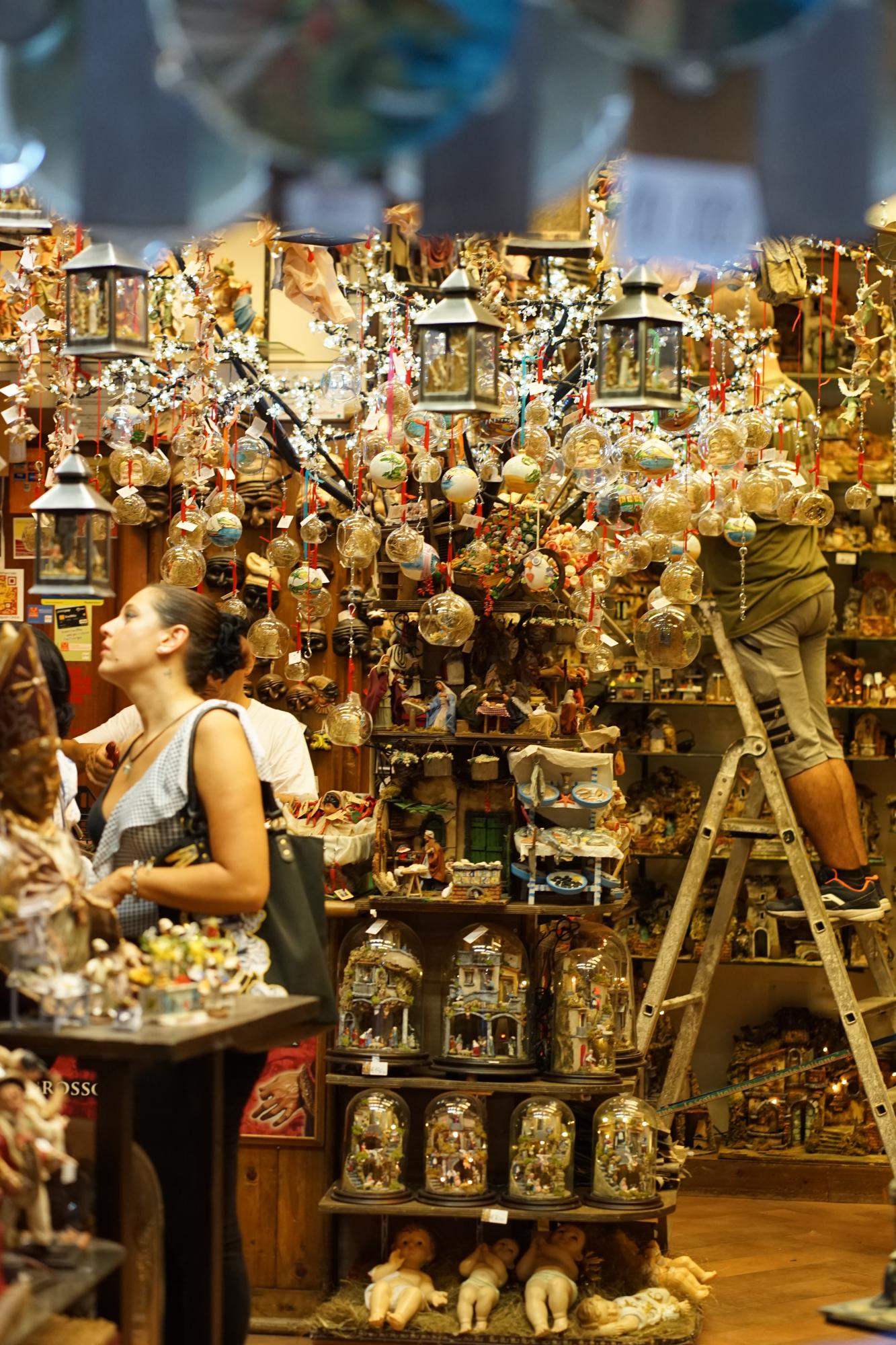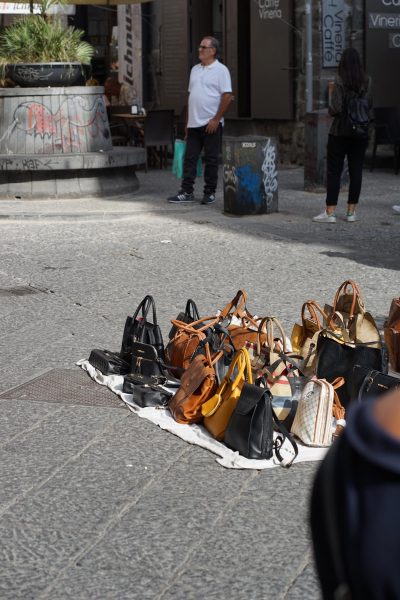 Zurück in Pompei stiegen wir dann in den Zug nach Neapel, wo wir am Hauptbahnhof erstmal vom Chaos und der puren Unordnung überwältigt waren. Über all auf den Straßen lag Plastikmüll herum und die alten schmalen Gassen waren komplett verstopft mit Autos und Motorollern. Der erste interessante Stopp für mich war dann das Viertel in dem das ganze Jahr über Grippen und anderer Nippes hergestellt werden. Eine beeindruckende Anzahl an Jesus Kindern und andere skurriler Figuren wurde uns geboten. Ein Großteil davon wird Vorort bemalt und hergestellt. Neben der Dekoration wurden uns die obligatorischen Handtaschen von Gucci und Versace auch an jeder Ecke angeboten.