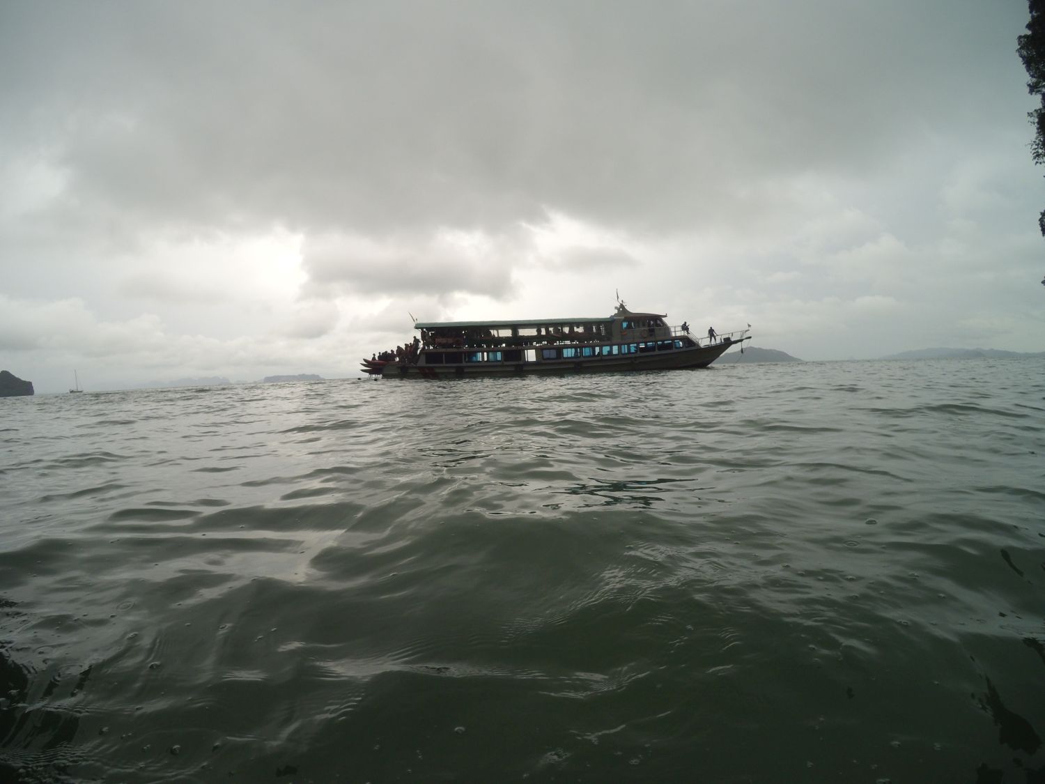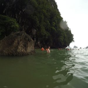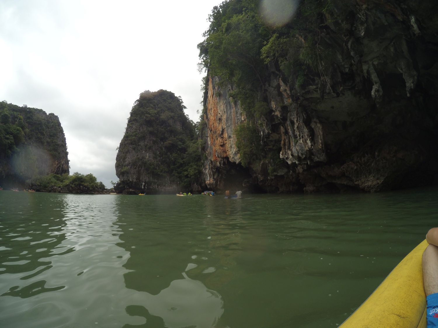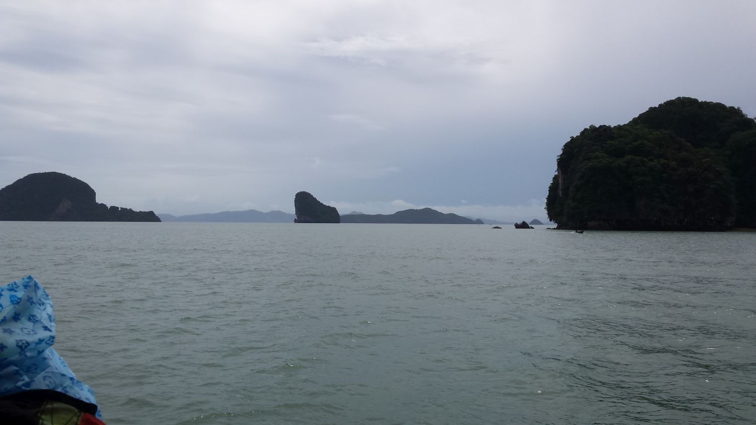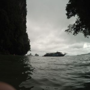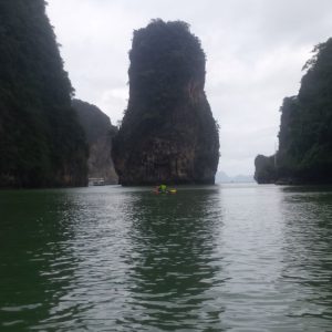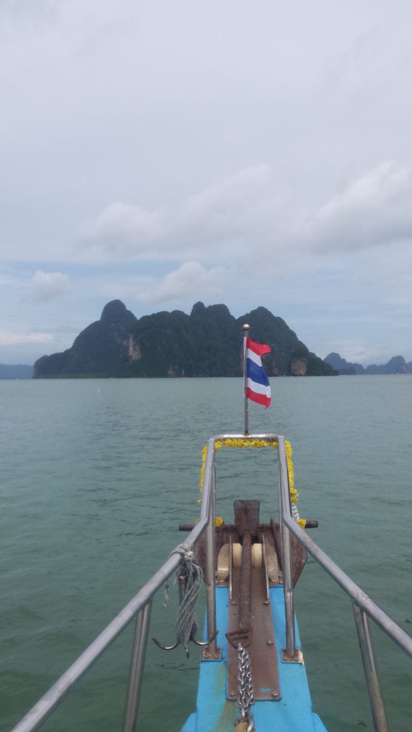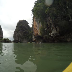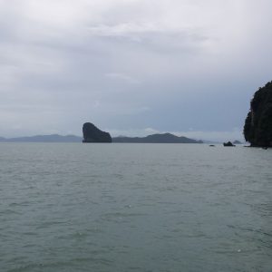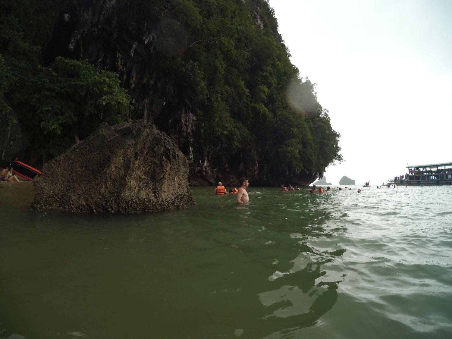 Heute war Sonntag, das hieß für Carsten, dass er die Zeit zum Morgengebet nutzte und erst einmal den ganzen Morgen auf der Toilette verbrachte. Da noch weitere Gebete im Laufe des Tages zu erwarten waren, beschloss er sich die Reise in die Phang Nga Bucht nicht mit anzutreten. Der Minivan startete also dieses Mal ohne Mr. Dietrich in Richtung Ostküste, von der wir ablegen sollten. Dort ging es dann gleich aufs Boot, wo uns bereits Bananen, kühle Getränke und ein redseliger Guide erwarteten, der uns die nächste Stunde Bootsfahrt in schlechtem, aber dafür sehr lautem Englisch zutextete. Die Japanerinnen, die mit uns unterwegs waren machten es genau richtig und entschieden sich das Geschrei zu ignorieren und einfach durchzuschlafen. Nach der ruhigen und glücklicherweise regenfreien Bootsfahrt, wurden wir in der Nähe eines Strandes in Taxi-Longboats umgefrachtet und auf die James Bond Insel gefahren. Roger Moore drehte hier einst „Der Mann mit dem goldenen Colt“, wodurch die Insel auch den Namen bekam, Ein kurzer Spaziergang über die Insel und ein paar Fotos später waren wir wieder auf unserem Schiff, wo schon das leckere Essensbuffet auf uns wartete. Mit vollem Magen ging es gleich weiter mit Kayak-Fahren.  Glücklicherweise wurden wir von unserem persönlichen Kayakfahrer direkt am Boot abgeholt und durch Höhlen und Mangroven geschippert, weshalb dies relativ entspannend war. Zwischendurch konnten wir auch vom Boot hüpfen und ein bisschen im Wasser schwimmen. Da gerade ein starker Regenschauer einsetzte als wir auf dem Kayak waren, wurde die Fahrt natürlich um einiges unterhaltsamer. Als letztes stand dann aber noch das eigentlich Schwimmen auf dem Programm, dass auf einem einsamen und leeren Strand – eine Seltenheit in Thailand – stattfand. Wieder im Hotel angekommen trafen wir auf einen von allen Sünden erlösten Carsten der sich uns für den zweiten Teil der Abendgestaltung anschloss.