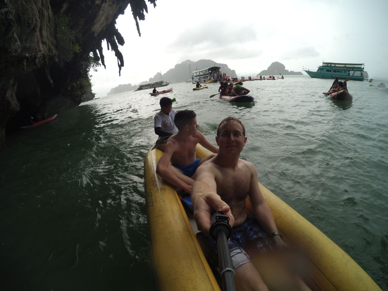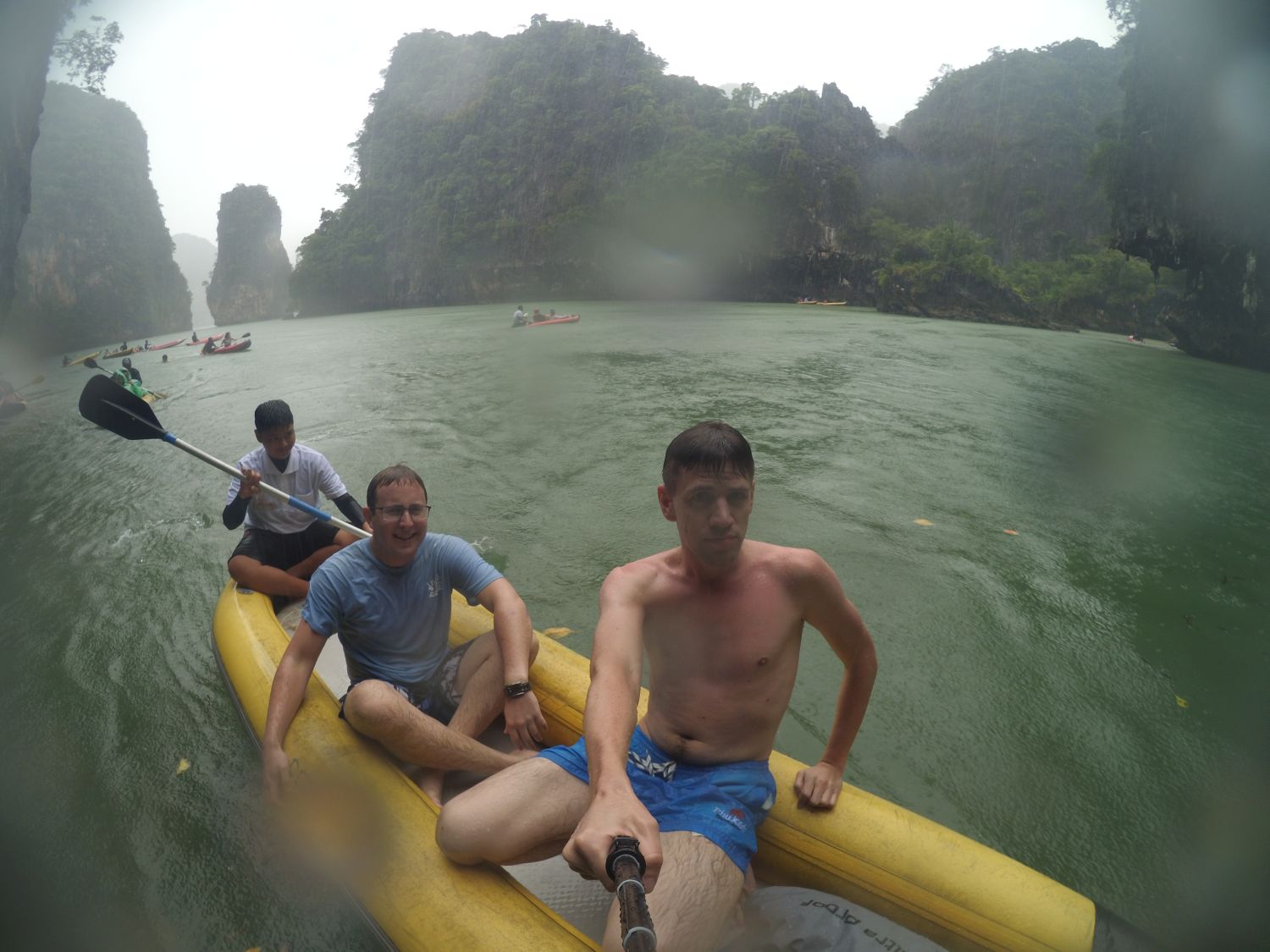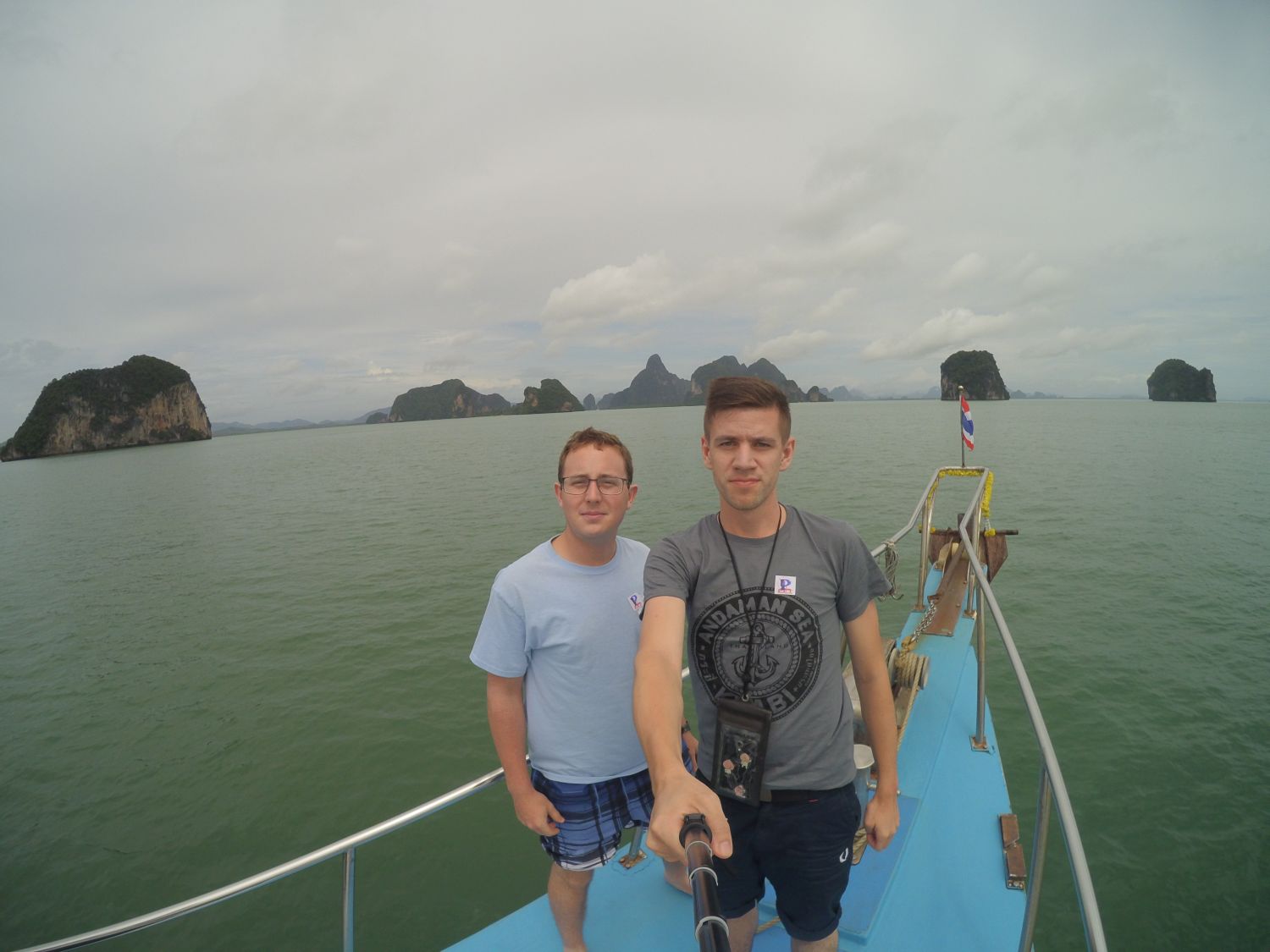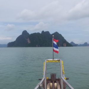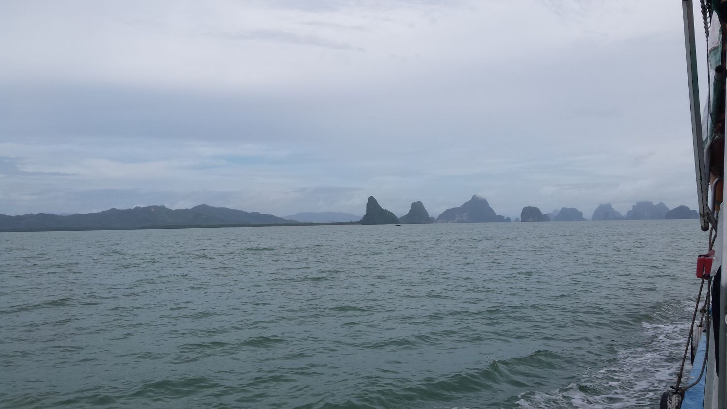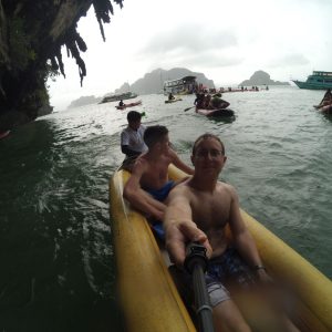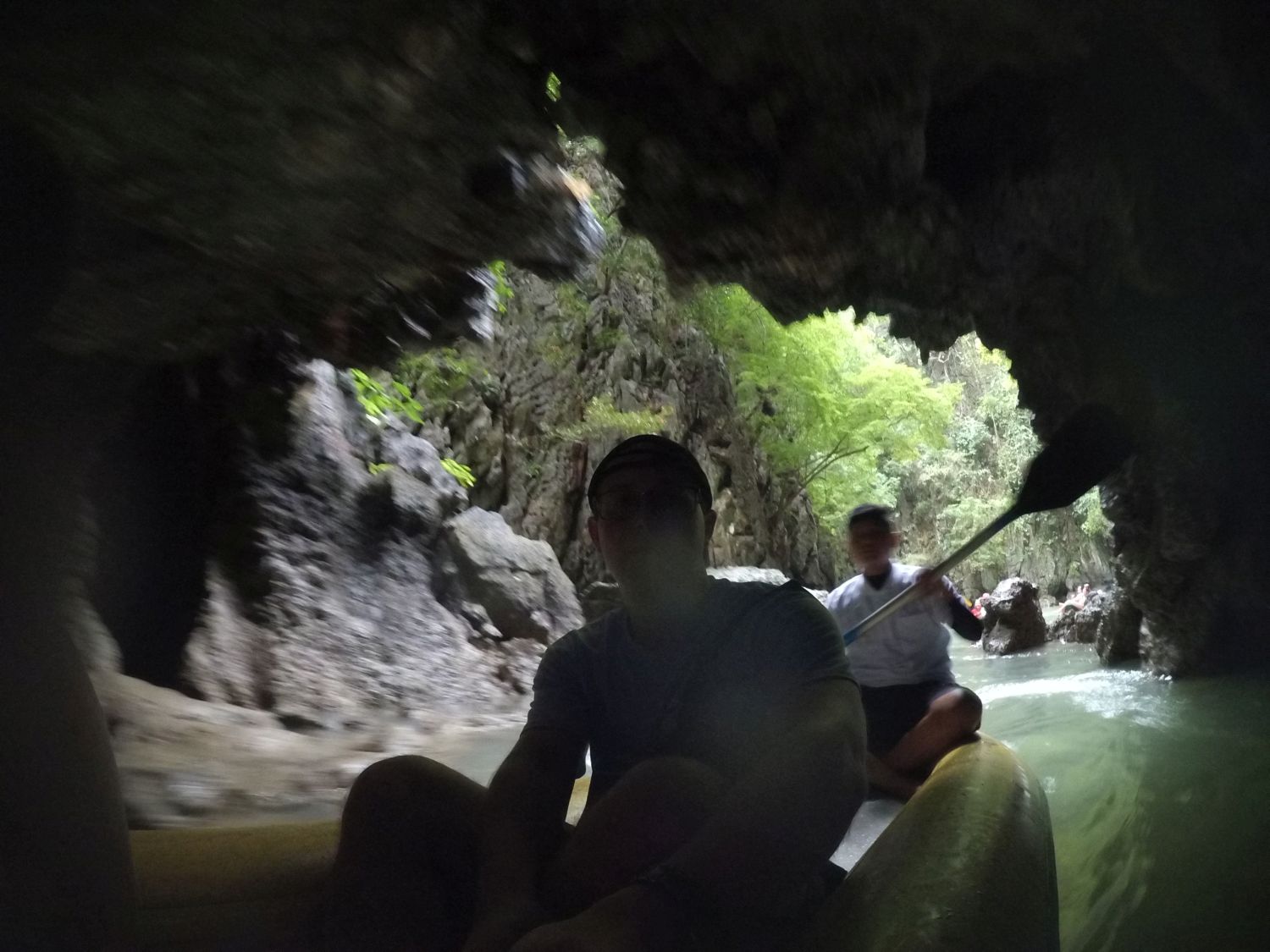 Heute war Sonntag, das hieß für Carsten, dass er die Zeit zum Morgengebet nutzte und erst einmal den ganzen Morgen auf der Toilette verbrachte. Da noch weitere Gebete im Laufe des Tages zu erwarten waren, beschloss er sich die Reise in die Phang Nga Bucht nicht mit anzutreten. Der Minivan startete also dieses Mal ohne Mr. Dietrich in Richtung Ostküste, von der wir ablegen sollten. Dort ging es dann gleich aufs Boot, wo uns bereits Bananen, kühle Getränke und ein redseliger Guide erwarteten, der uns die nächste Stunde Bootsfahrt in schlechtem, aber dafür sehr lautem Englisch zutextete. Die Japanerinnen, die mit uns unterwegs waren machten es genau richtig und entschieden sich das Geschrei zu ignorieren und einfach durchzuschlafen. Nach der ruhigen und glücklicherweise regenfreien Bootsfahrt, wurden wir in der Nähe eines Strandes in Taxi-Longboats umgefrachtet und auf die James Bond Insel gefahren. Roger Moore drehte hier einst „Der Mann mit dem goldenen Colt“, wodurch die Insel auch den Namen bekam, Ein kurzer Spaziergang über die Insel und ein paar Fotos später waren wir wieder auf unserem Schiff, wo schon das leckere Essensbuffet auf uns wartete. Mit vollem Magen ging es gleich weiter mit Kayak-Fahren.  Glücklicherweise wurden wir von unserem persönlichen Kayakfahrer direkt am Boot abgeholt und durch Höhlen und Mangroven geschippert, weshalb dies relativ entspannend war. Zwischendurch konnten wir auch vom Boot hüpfen und ein bisschen im Wasser schwimmen. Da gerade ein starker Regenschauer einsetzte als wir auf dem Kayak waren, wurde die Fahrt natürlich um einiges unterhaltsamer. Als letztes stand dann aber noch das eigentlich Schwimmen auf dem Programm, dass auf einem einsamen und leeren Strand – eine Seltenheit in Thailand – stattfand. Wieder im Hotel angekommen trafen wir auf einen von allen Sünden erlösten Carsten der sich uns für den zweiten Teil der Abendgestaltung anschloss.