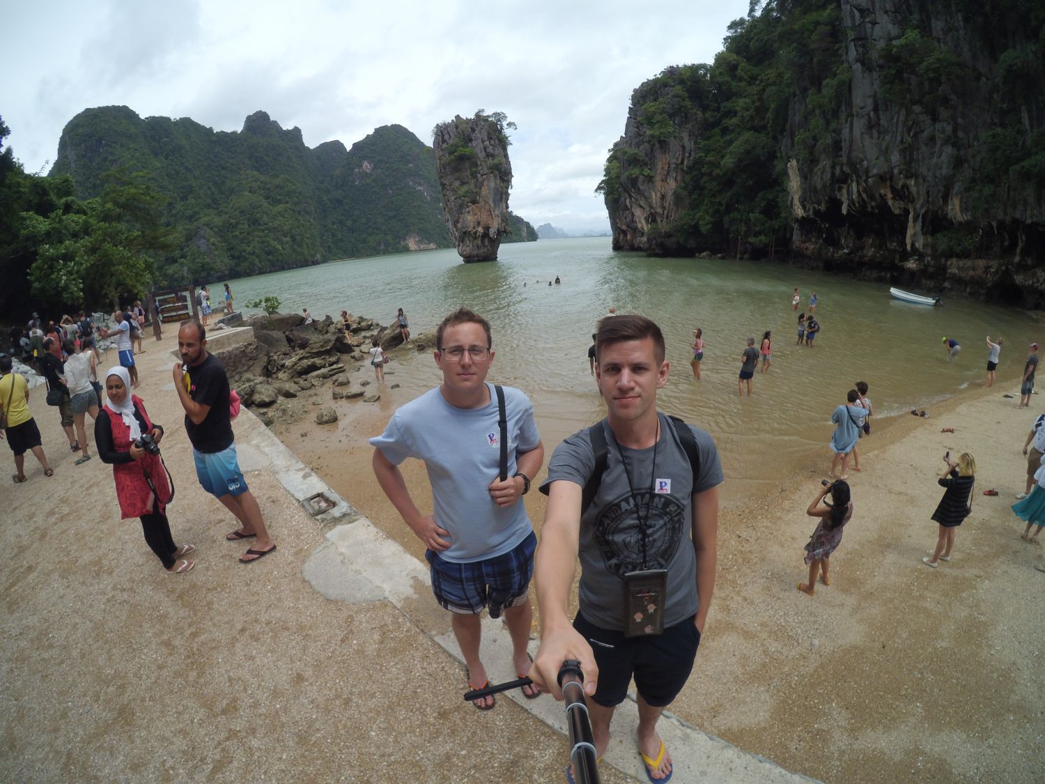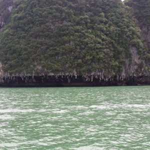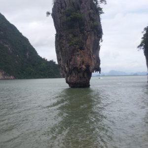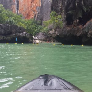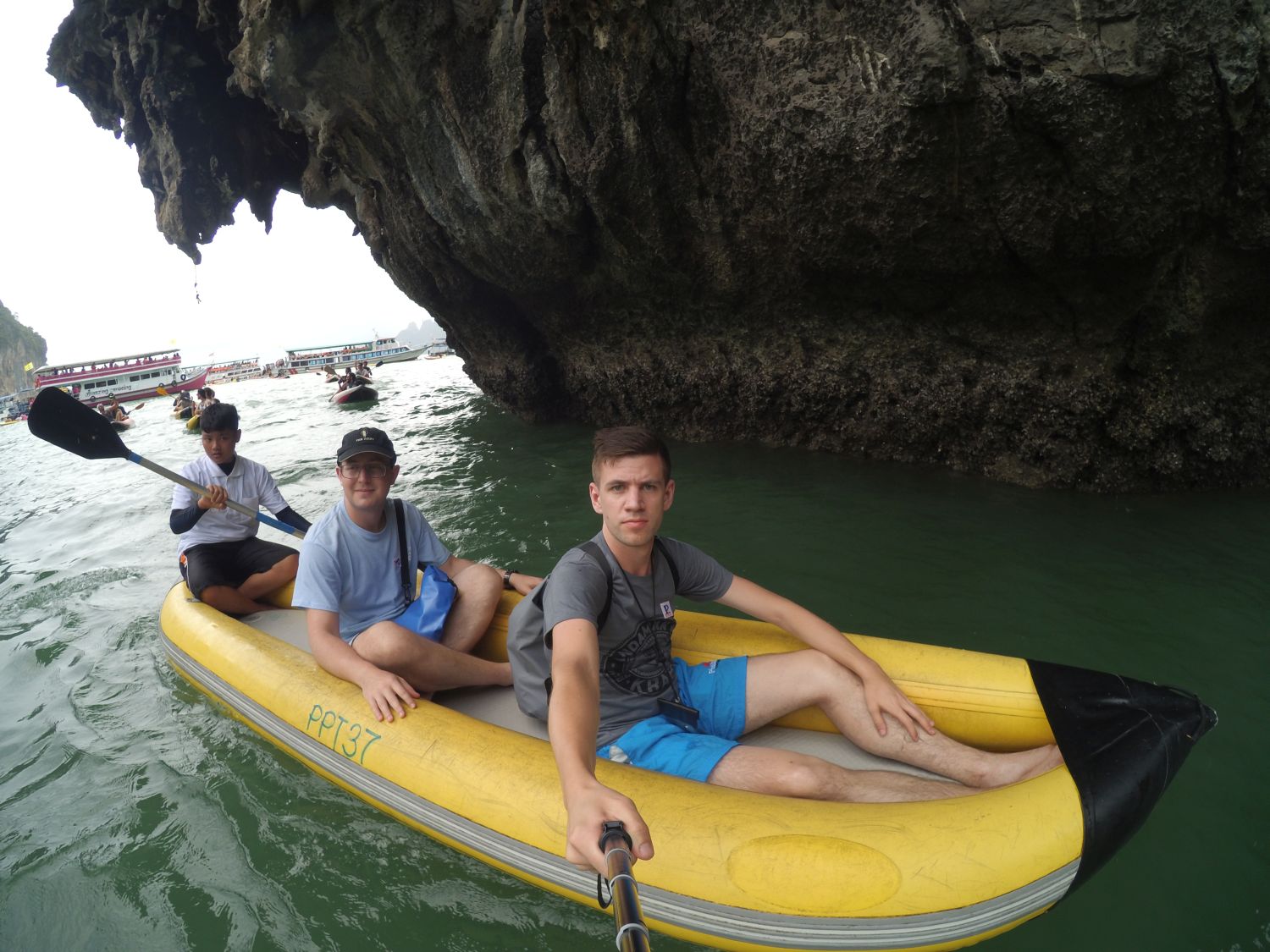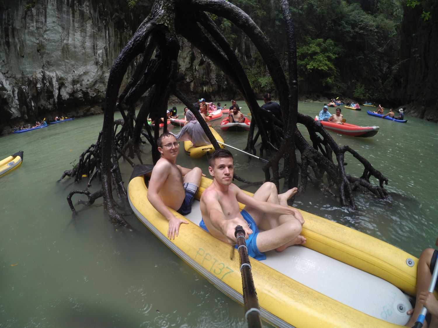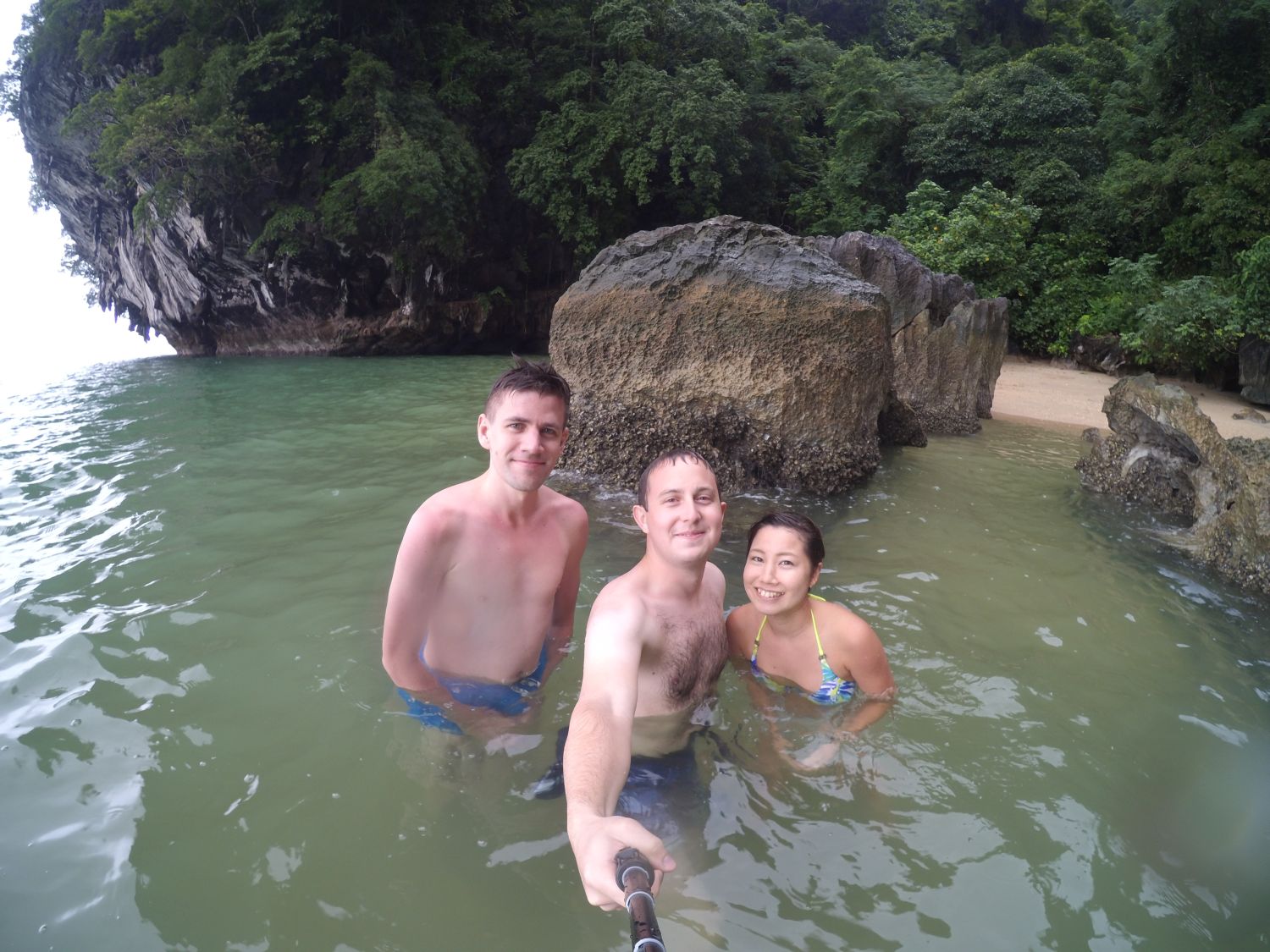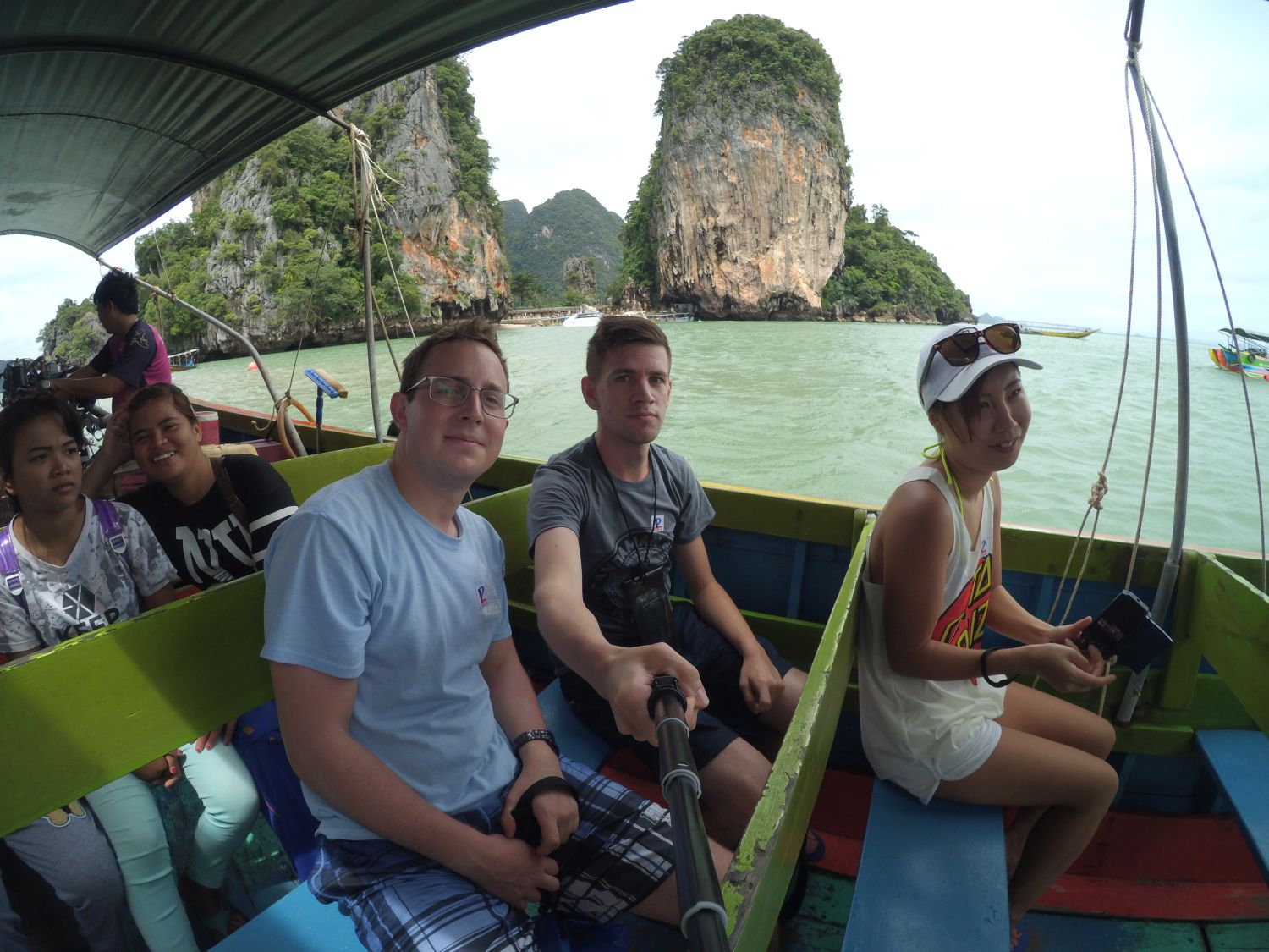 Heute war Sonntag, das hieß für Carsten, dass er die Zeit zum Morgengebet nutzte und erst einmal den ganzen Morgen auf der Toilette verbrachte. Da noch weitere Gebete im Laufe des Tages zu erwarten waren, beschloss er sich die Reise in die Phang Nga Bucht nicht mit anzutreten. Der Minivan startete also dieses Mal ohne Mr. Dietrich in Richtung Ostküste, von der wir ablegen sollten. Dort ging es dann gleich aufs Boot, wo uns bereits Bananen, kühle Getränke und ein redseliger Guide erwarteten, der uns die nächste Stunde Bootsfahrt in schlechtem, aber dafür sehr lautem Englisch zutextete. Die Japanerinnen, die mit uns unterwegs waren machten es genau richtig und entschieden sich das Geschrei zu ignorieren und einfach durchzuschlafen. Nach der ruhigen und glücklicherweise regenfreien Bootsfahrt, wurden wir in der Nähe eines Strandes in Taxi-Longboats umgefrachtet und auf die James Bond Insel gefahren. Roger Moore drehte hier einst „Der Mann mit dem goldenen Colt“, wodurch die Insel auch den Namen bekam, Ein kurzer Spaziergang über die Insel und ein paar Fotos später waren wir wieder auf unserem Schiff, wo schon das leckere Essensbuffet auf uns wartete. Mit vollem Magen ging es gleich weiter mit Kayak-Fahren.  Glücklicherweise wurden wir von unserem persönlichen Kayakfahrer direkt am Boot abgeholt und durch Höhlen und Mangroven geschippert, weshalb dies relativ entspannend war. Zwischendurch konnten wir auch vom Boot hüpfen und ein bisschen im Wasser schwimmen. Da gerade ein starker Regenschauer einsetzte als wir auf dem Kayak waren, wurde die Fahrt natürlich um einiges unterhaltsamer. Als letztes stand dann aber noch das eigentlich Schwimmen auf dem Programm, dass auf einem einsamen und leeren Strand – eine Seltenheit in Thailand – stattfand. Wieder im Hotel angekommen trafen wir auf einen von allen Sünden erlösten Carsten der sich uns für den zweiten Teil der Abendgestaltung anschloss.