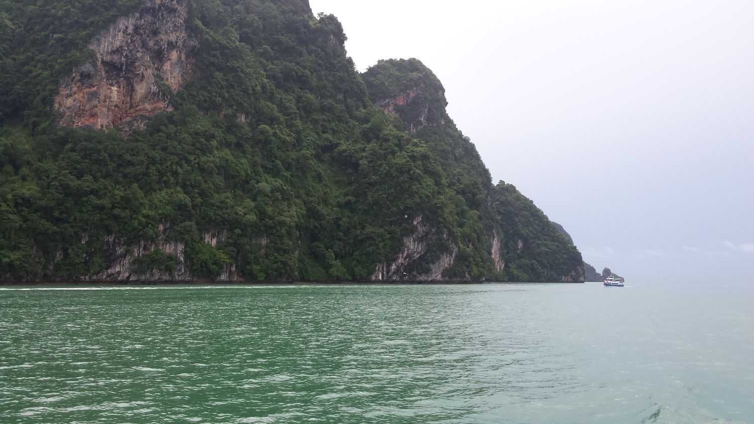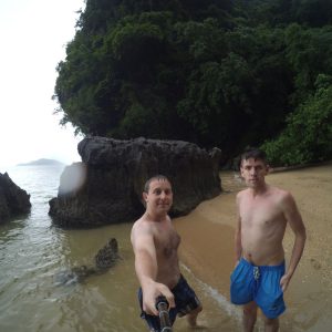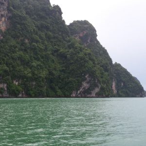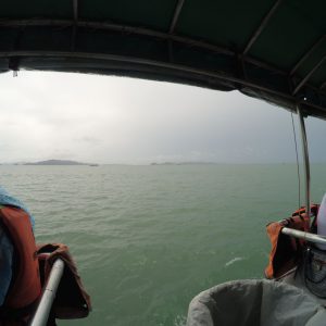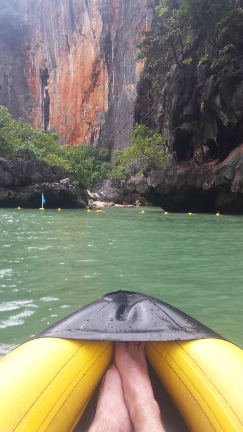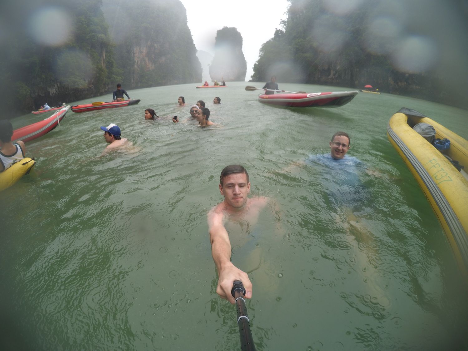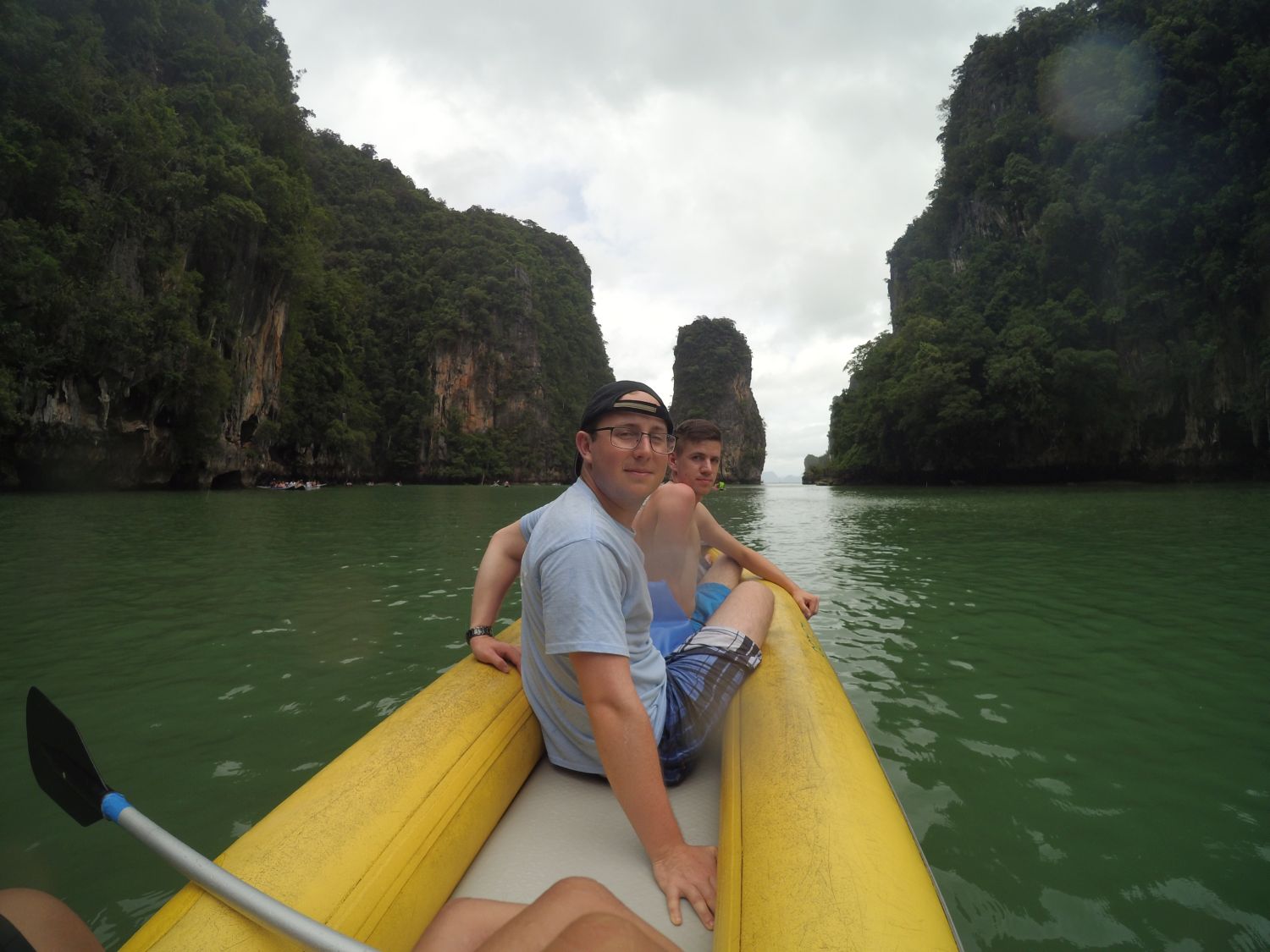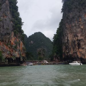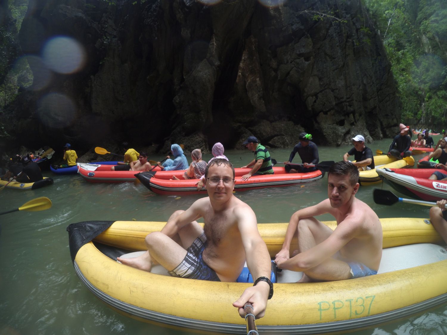 Heute war Sonntag, das hieß für Carsten, dass er die Zeit zum Morgengebet nutzte und erst einmal den ganzen Morgen auf der Toilette verbrachte. Da noch weitere Gebete im Laufe des Tages zu erwarten waren, beschloss er sich die Reise in die Phang Nga Bucht nicht mit anzutreten. Der Minivan startete also dieses Mal ohne Mr. Dietrich in Richtung Ostküste, von der wir ablegen sollten. Dort ging es dann gleich aufs Boot, wo uns bereits Bananen, kühle Getränke und ein redseliger Guide erwarteten, der uns die nächste Stunde Bootsfahrt in schlechtem, aber dafür sehr lautem Englisch zutextete. Die Japanerinnen, die mit uns unterwegs waren machten es genau richtig und entschieden sich das Geschrei zu ignorieren und einfach durchzuschlafen. Nach der ruhigen und glücklicherweise regenfreien Bootsfahrt, wurden wir in der Nähe eines Strandes in Taxi-Longboats umgefrachtet und auf die James Bond Insel gefahren. Roger Moore drehte hier einst „Der Mann mit dem goldenen Colt“, wodurch die Insel auch den Namen bekam, Ein kurzer Spaziergang über die Insel und ein paar Fotos später waren wir wieder auf unserem Schiff, wo schon das leckere Essensbuffet auf uns wartete. Mit vollem Magen ging es gleich weiter mit Kayak-Fahren.  Glücklicherweise wurden wir von unserem persönlichen Kayakfahrer direkt am Boot abgeholt und durch Höhlen und Mangroven geschippert, weshalb dies relativ entspannend war. Zwischendurch konnten wir auch vom Boot hüpfen und ein bisschen im Wasser schwimmen. Da gerade ein starker Regenschauer einsetzte als wir auf dem Kayak waren, wurde die Fahrt natürlich um einiges unterhaltsamer. Als letztes stand dann aber noch das eigentlich Schwimmen auf dem Programm, dass auf einem einsamen und leeren Strand – eine Seltenheit in Thailand – stattfand. Wieder im Hotel angekommen trafen wir auf einen von allen Sünden erlösten Carsten der sich uns für den zweiten Teil der Abendgestaltung anschloss.