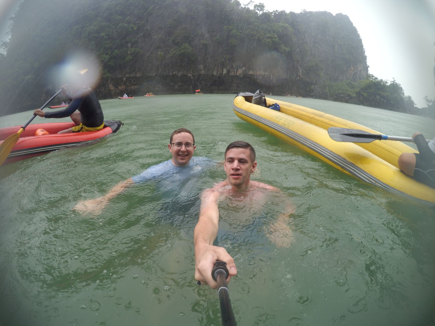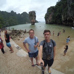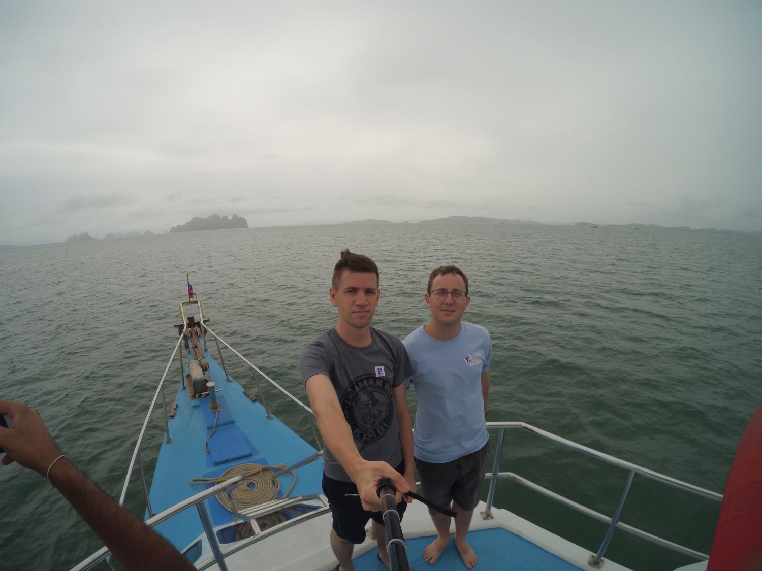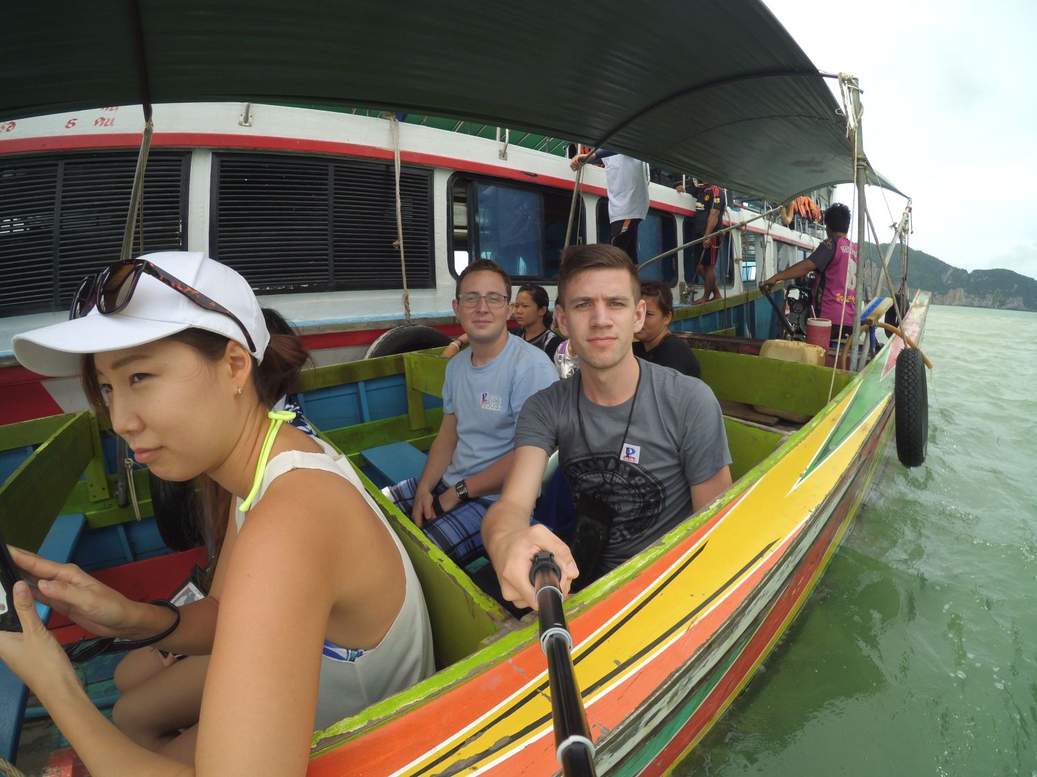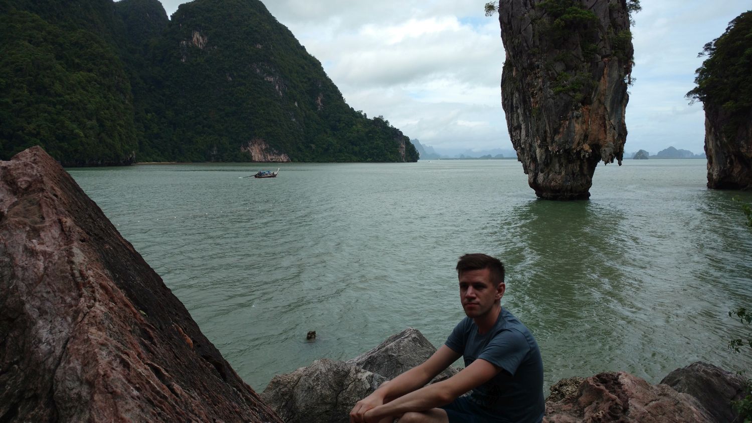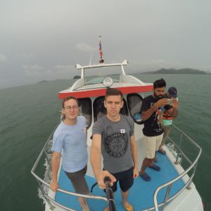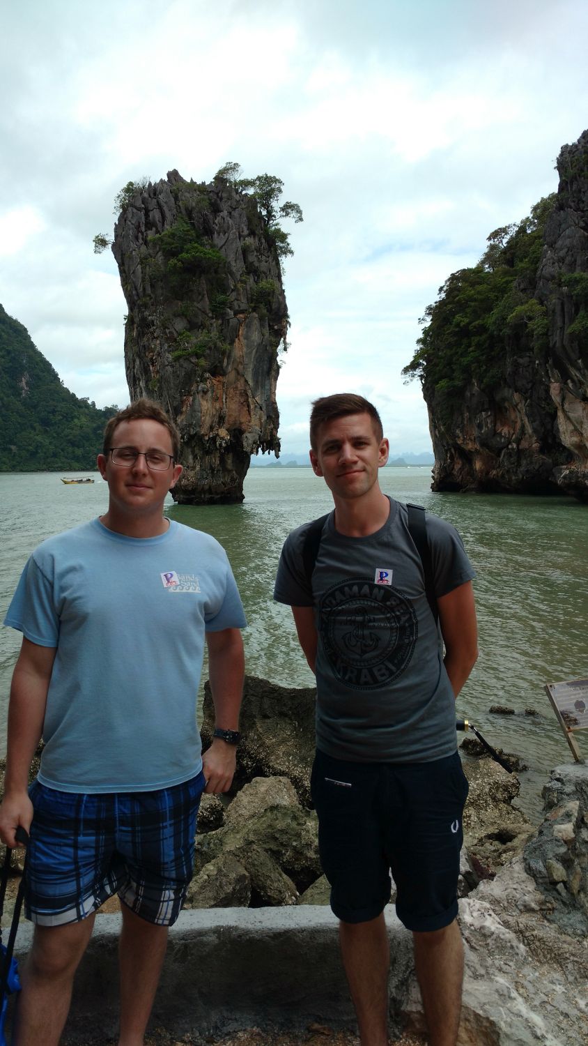 Heute war Sonntag, das hieß für Carsten, dass er die Zeit zum Morgengebet nutzte und erst einmal den ganzen Morgen auf der Toilette verbrachte. Da noch weitere Gebete im Laufe des Tages zu erwarten waren, beschloss er sich die Reise in die Phang Nga Bucht nicht mit anzutreten. Der Minivan startete also dieses Mal ohne Mr. Dietrich in Richtung Ostküste, von der wir ablegen sollten. Dort ging es dann gleich aufs Boot, wo uns bereits Bananen, kühle Getränke und ein redseliger Guide erwarteten, der uns die nächste Stunde Bootsfahrt in schlechtem, aber dafür sehr lautem Englisch zutextete. Die Japanerinnen, die mit uns unterwegs waren machten es genau richtig und entschieden sich das Geschrei zu ignorieren und einfach durchzuschlafen. Nach der ruhigen und glücklicherweise regenfreien Bootsfahrt, wurden wir in der Nähe eines Strandes in Taxi-Longboats umgefrachtet und auf die James Bond Insel gefahren. Roger Moore drehte hier einst „Der Mann mit dem goldenen Colt“, wodurch die Insel auch den Namen bekam, Ein kurzer Spaziergang über die Insel und ein paar Fotos später waren wir wieder auf unserem Schiff, wo schon das leckere Essensbuffet auf uns wartete. Mit vollem Magen ging es gleich weiter mit Kayak-Fahren.  Glücklicherweise wurden wir von unserem persönlichen Kayakfahrer direkt am Boot abgeholt und durch Höhlen und Mangroven geschippert, weshalb dies relativ entspannend war. Zwischendurch konnten wir auch vom Boot hüpfen und ein bisschen im Wasser schwimmen. Da gerade ein starker Regenschauer einsetzte als wir auf dem Kayak waren, wurde die Fahrt natürlich um einiges unterhaltsamer. Als letztes stand dann aber noch das eigentlich Schwimmen auf dem Programm, dass auf einem einsamen und leeren Strand – eine Seltenheit in Thailand – stattfand. Wieder im Hotel angekommen trafen wir auf einen von allen Sünden erlösten Carsten der sich uns für den zweiten Teil der Abendgestaltung anschloss.