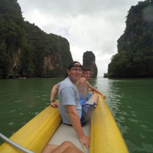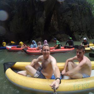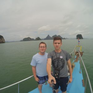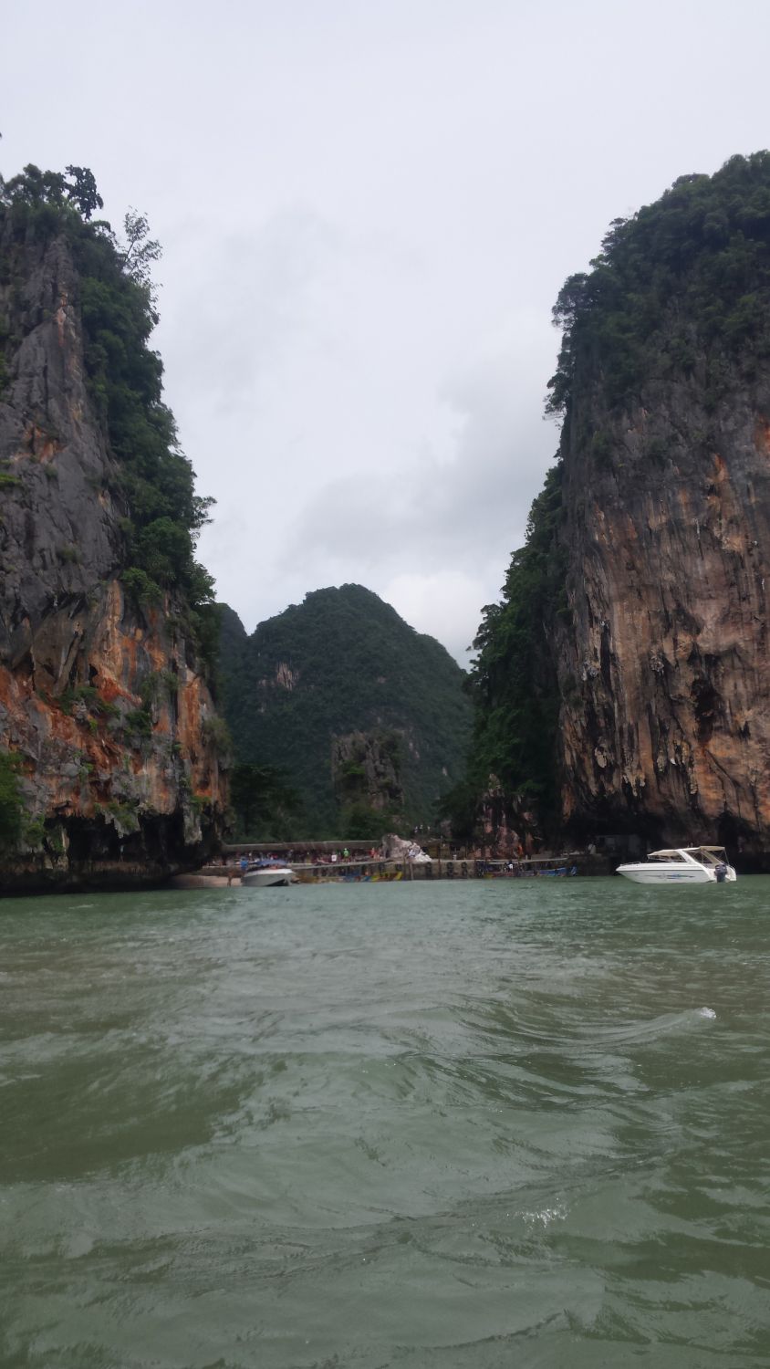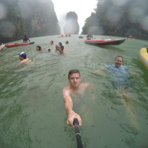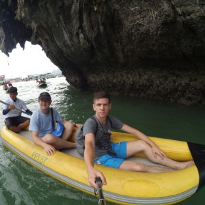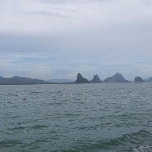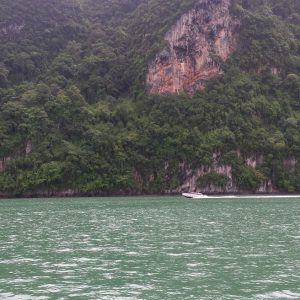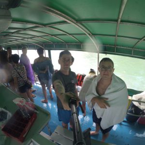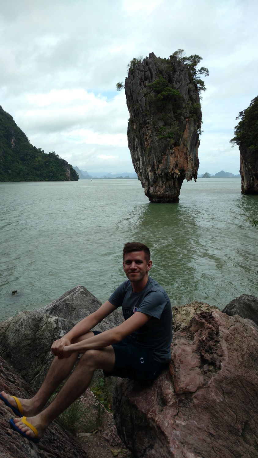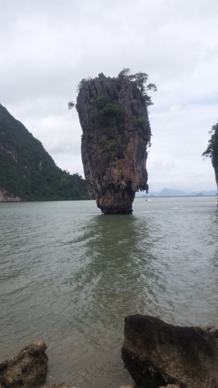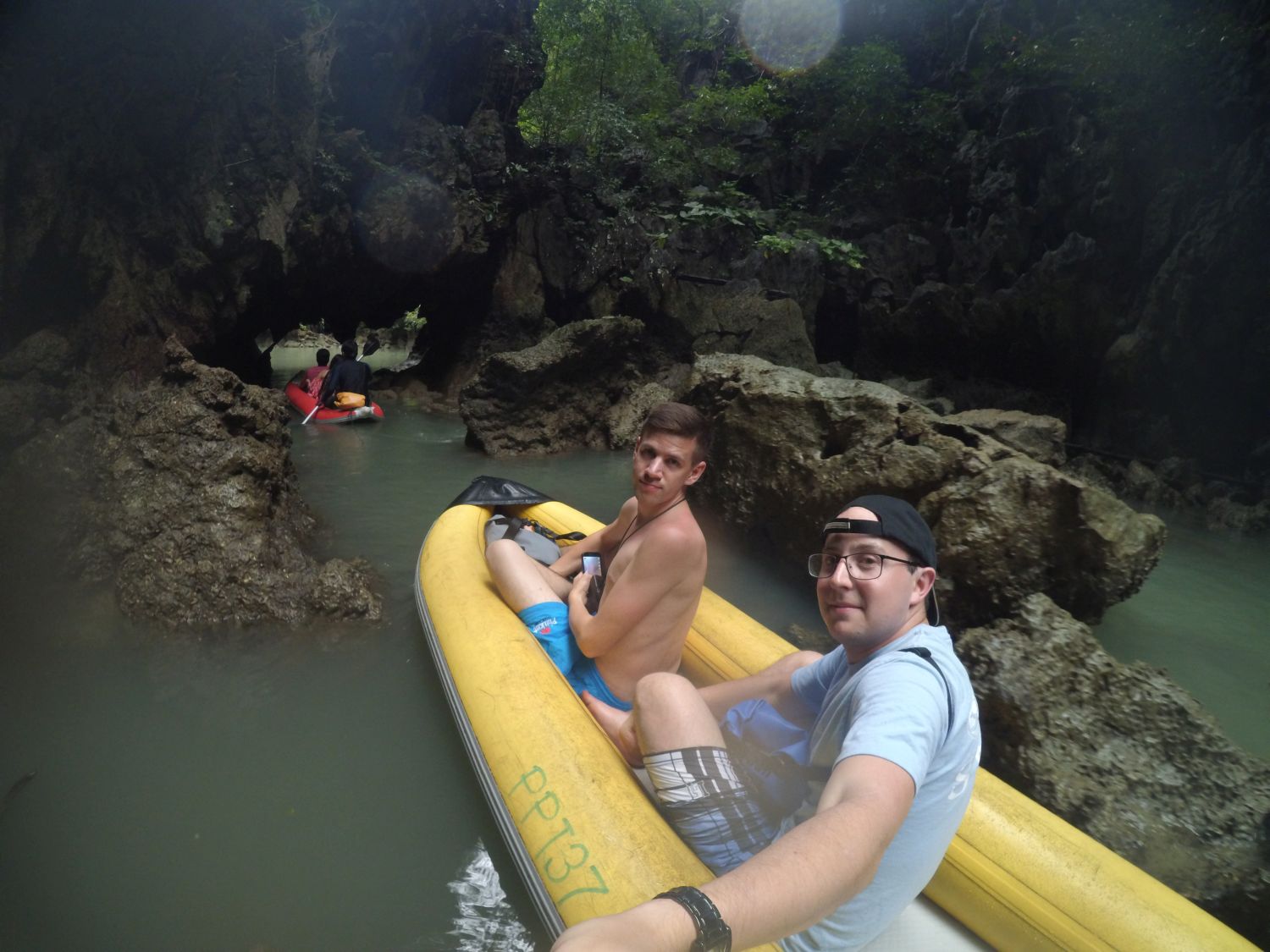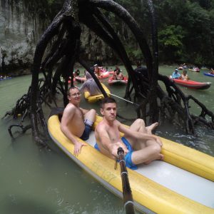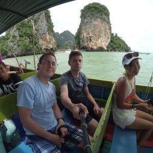 Heute war Sonntag, das hieß für Carsten, dass er die Zeit zum Morgengebet nutzte und erst einmal den ganzen Morgen auf der Toilette verbrachte. Da noch weitere Gebete im Laufe des Tages zu erwarten waren, beschloss er sich die Reise in die Phang Nga Bucht nicht mit anzutreten. Der Minivan startete also dieses Mal ohne Mr. Dietrich in Richtung Ostküste, von der wir ablegen sollten. Dort ging es dann gleich aufs Boot, wo uns bereits Bananen, kühle Getränke und ein redseliger Guide erwarteten, der uns die nächste Stunde Bootsfahrt in schlechtem, aber dafür sehr lautem Englisch zutextete. Die Japanerinnen, die mit uns unterwegs waren machten es genau richtig und entschieden sich das Geschrei zu ignorieren und einfach durchzuschlafen. Nach der ruhigen und glücklicherweise regenfreien Bootsfahrt, wurden wir in der Nähe eines Strandes in Taxi-Longboats umgefrachtet und auf die James Bond Insel gefahren. Roger Moore drehte hier einst „Der Mann mit dem goldenen Colt“, wodurch die Insel auch den Namen bekam, Ein kurzer Spaziergang über die Insel und ein paar Fotos später waren wir wieder auf unserem Schiff, wo schon das leckere Essensbuffet auf uns wartete. Mit vollem Magen ging es gleich weiter mit Kayak-Fahren.  Glücklicherweise wurden wir von unserem persönlichen Kayakfahrer direkt am Boot abgeholt und durch Höhlen und Mangroven geschippert, weshalb dies relativ entspannend war. Zwischendurch konnten wir auch vom Boot hüpfen und ein bisschen im Wasser schwimmen. Da gerade ein starker Regenschauer einsetzte als wir auf dem Kayak waren, wurde die Fahrt natürlich um einiges unterhaltsamer. Als letztes stand dann aber noch das eigentlich Schwimmen auf dem Programm, dass auf einem einsamen und leeren Strand – eine Seltenheit in Thailand – stattfand. Wieder im Hotel angekommen trafen wir auf einen von allen Sünden erlösten Carsten der sich uns für den zweiten Teil der Abendgestaltung anschloss.
