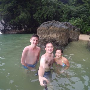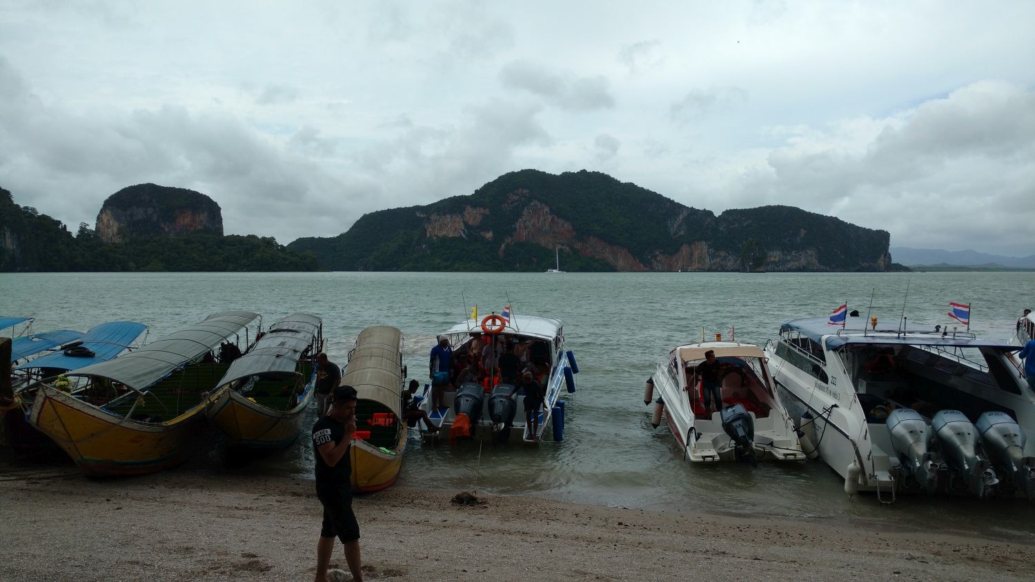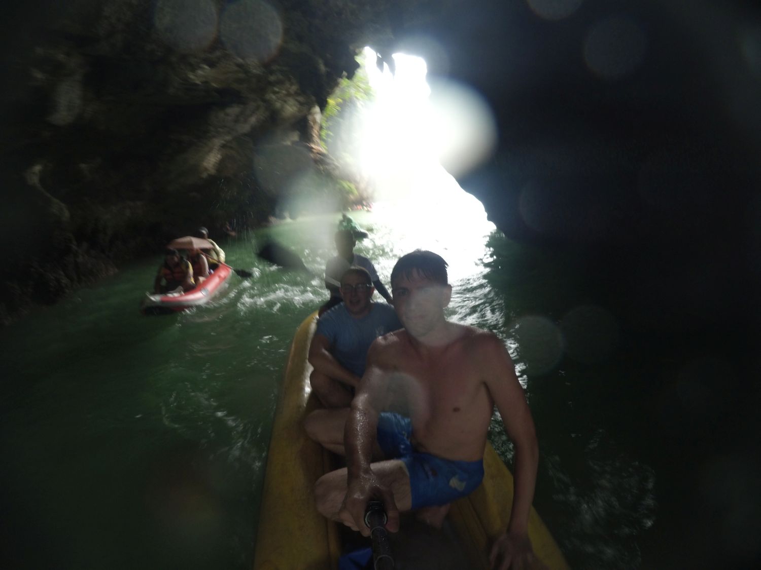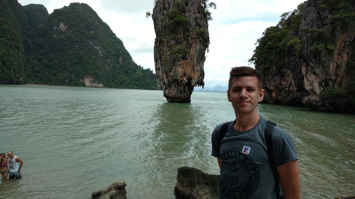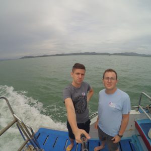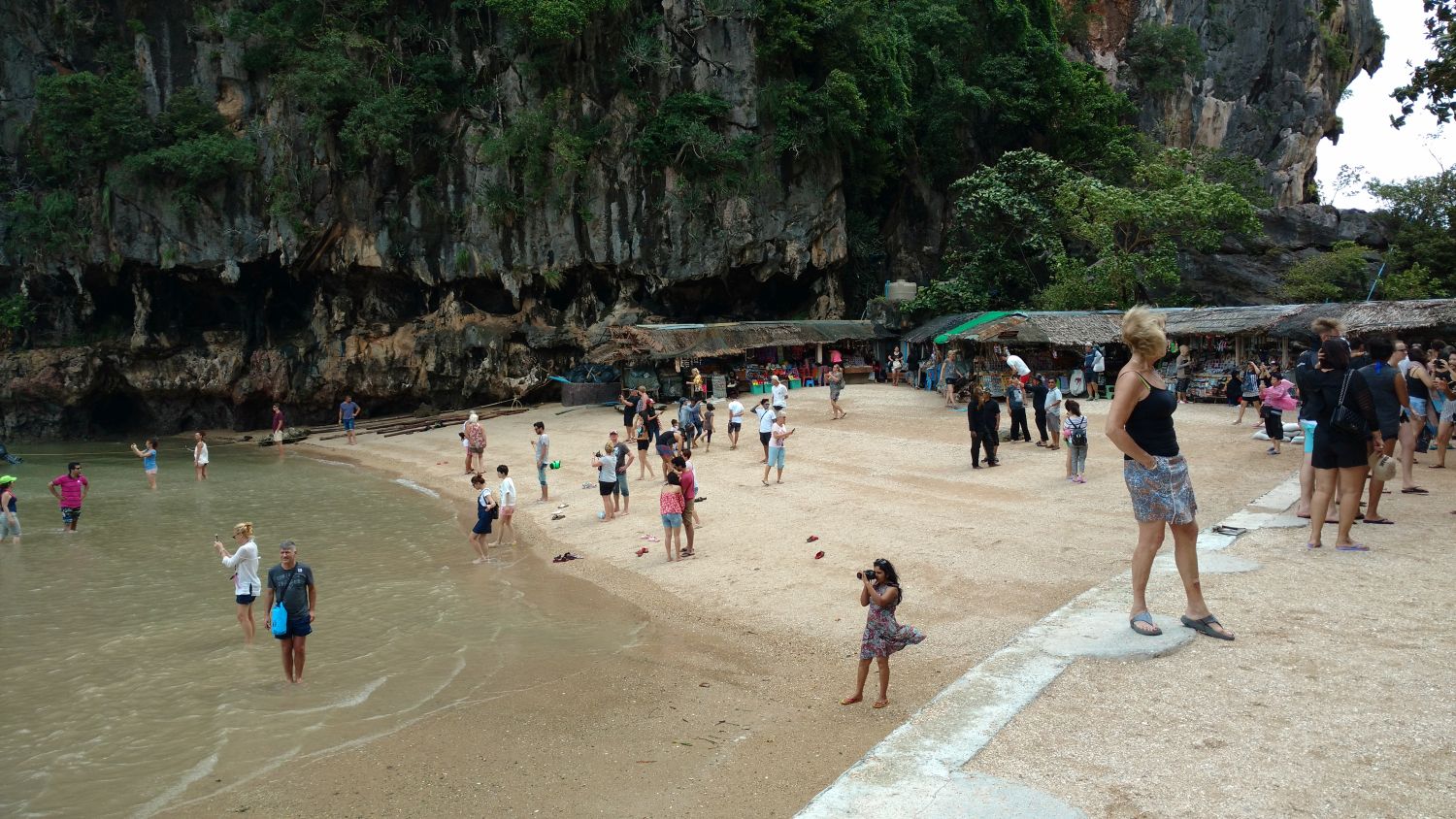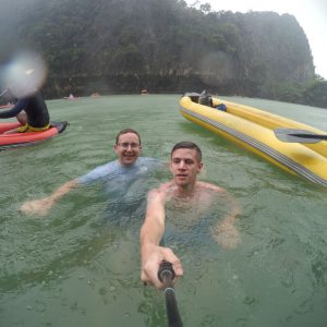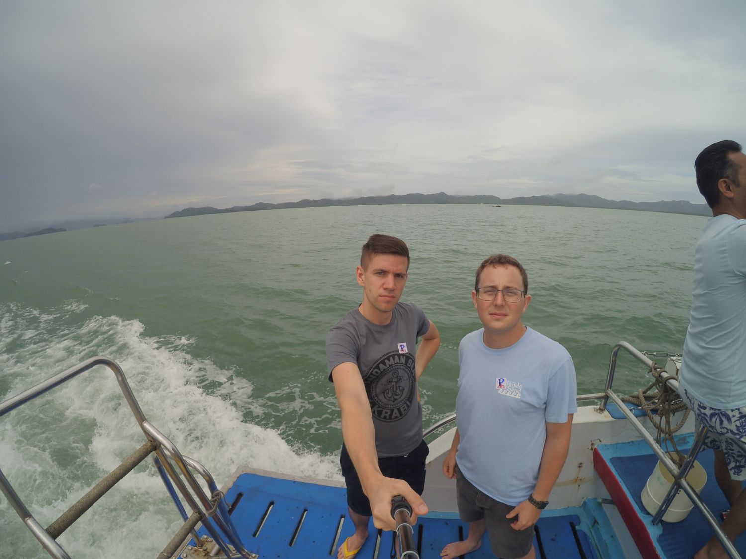 Heute war Sonntag, das hieß für Carsten, dass er die Zeit zum Morgengebet nutzte und erst einmal den ganzen Morgen auf der Toilette verbrachte. Da noch weitere Gebete im Laufe des Tages zu erwarten waren, beschloss er sich die Reise in die Phang Nga Bucht nicht mit anzutreten. Der Minivan startete also dieses Mal ohne Mr. Dietrich in Richtung Ostküste, von der wir ablegen sollten. Dort ging es dann gleich aufs Boot, wo uns bereits Bananen, kühle Getränke und ein redseliger Guide erwarteten, der uns die nächste Stunde Bootsfahrt in schlechtem, aber dafür sehr lautem Englisch zutextete. Die Japanerinnen, die mit uns unterwegs waren machten es genau richtig und entschieden sich das Geschrei zu ignorieren und einfach durchzuschlafen. Nach der ruhigen und glücklicherweise regenfreien Bootsfahrt, wurden wir in der Nähe eines Strandes in Taxi-Longboats umgefrachtet und auf die James Bond Insel gefahren. Roger Moore drehte hier einst „Der Mann mit dem goldenen Colt“, wodurch die Insel auch den Namen bekam, Ein kurzer Spaziergang über die Insel und ein paar Fotos später waren wir wieder auf unserem Schiff, wo schon das leckere Essensbuffet auf uns wartete. Mit vollem Magen ging es gleich weiter mit Kayak-Fahren.  Glücklicherweise wurden wir von unserem persönlichen Kayakfahrer direkt am Boot abgeholt und durch Höhlen und Mangroven geschippert, weshalb dies relativ entspannend war. Zwischendurch konnten wir auch vom Boot hüpfen und ein bisschen im Wasser schwimmen. Da gerade ein starker Regenschauer einsetzte als wir auf dem Kayak waren, wurde die Fahrt natürlich um einiges unterhaltsamer. Als letztes stand dann aber noch das eigentlich Schwimmen auf dem Programm, dass auf einem einsamen und leeren Strand – eine Seltenheit in Thailand – stattfand. Wieder im Hotel angekommen trafen wir auf einen von allen Sünden erlösten Carsten der sich uns für den zweiten Teil der Abendgestaltung anschloss.