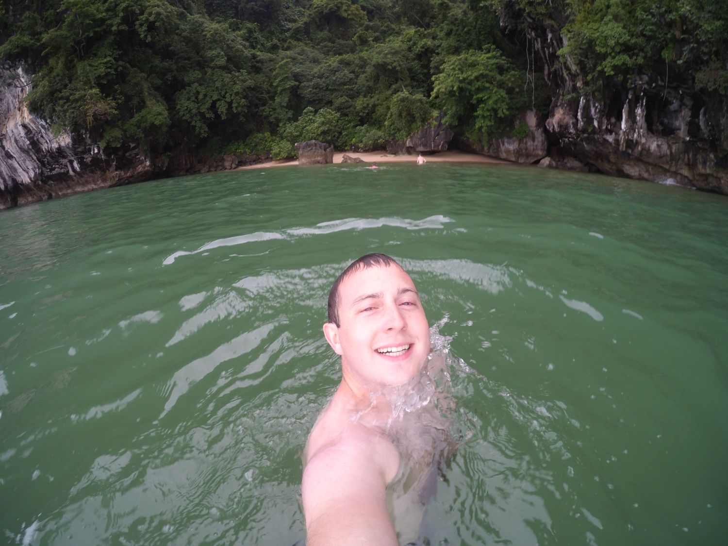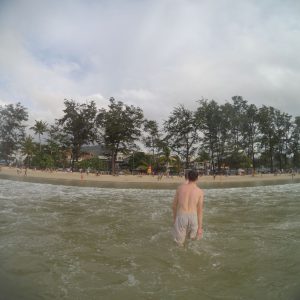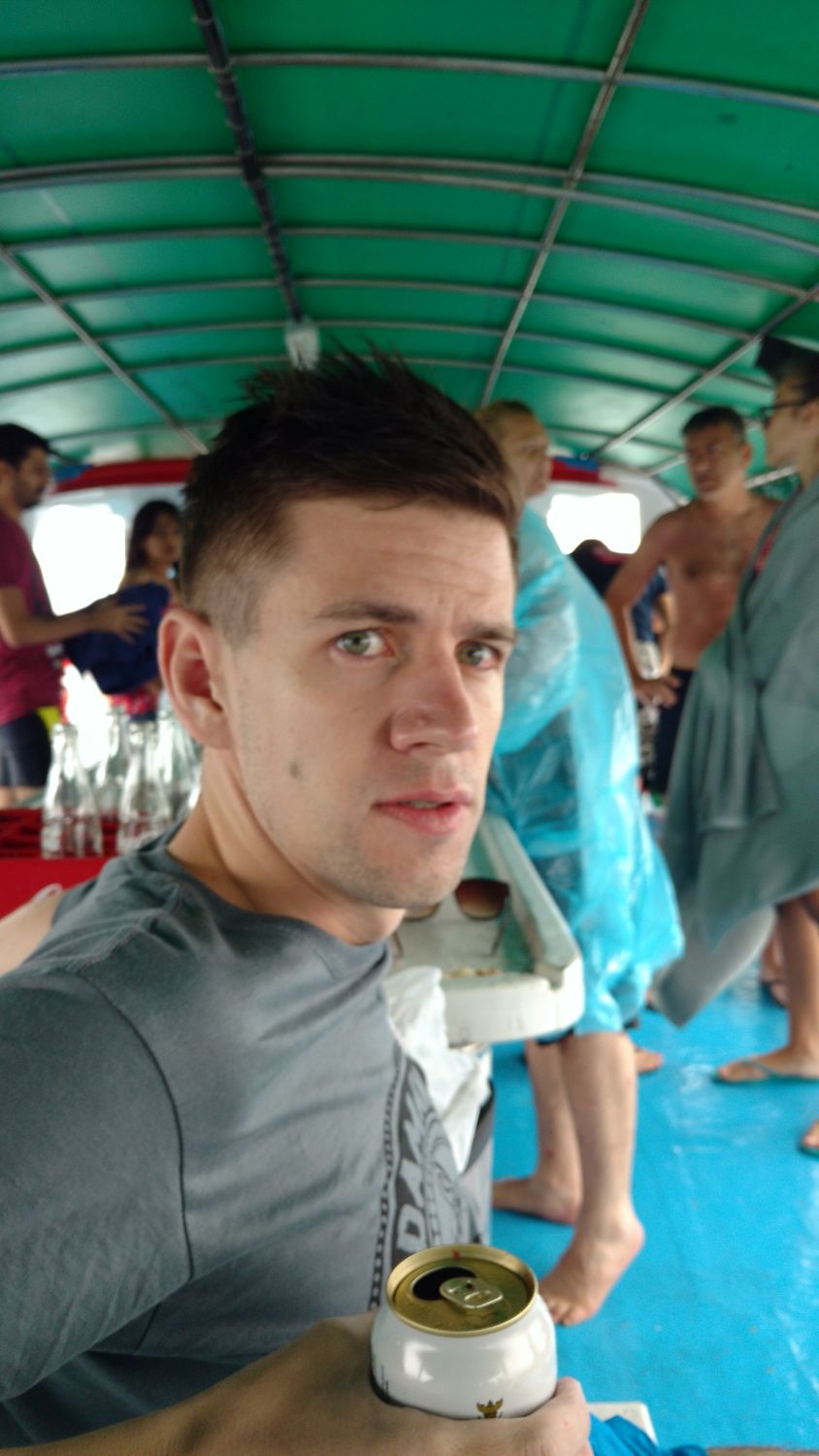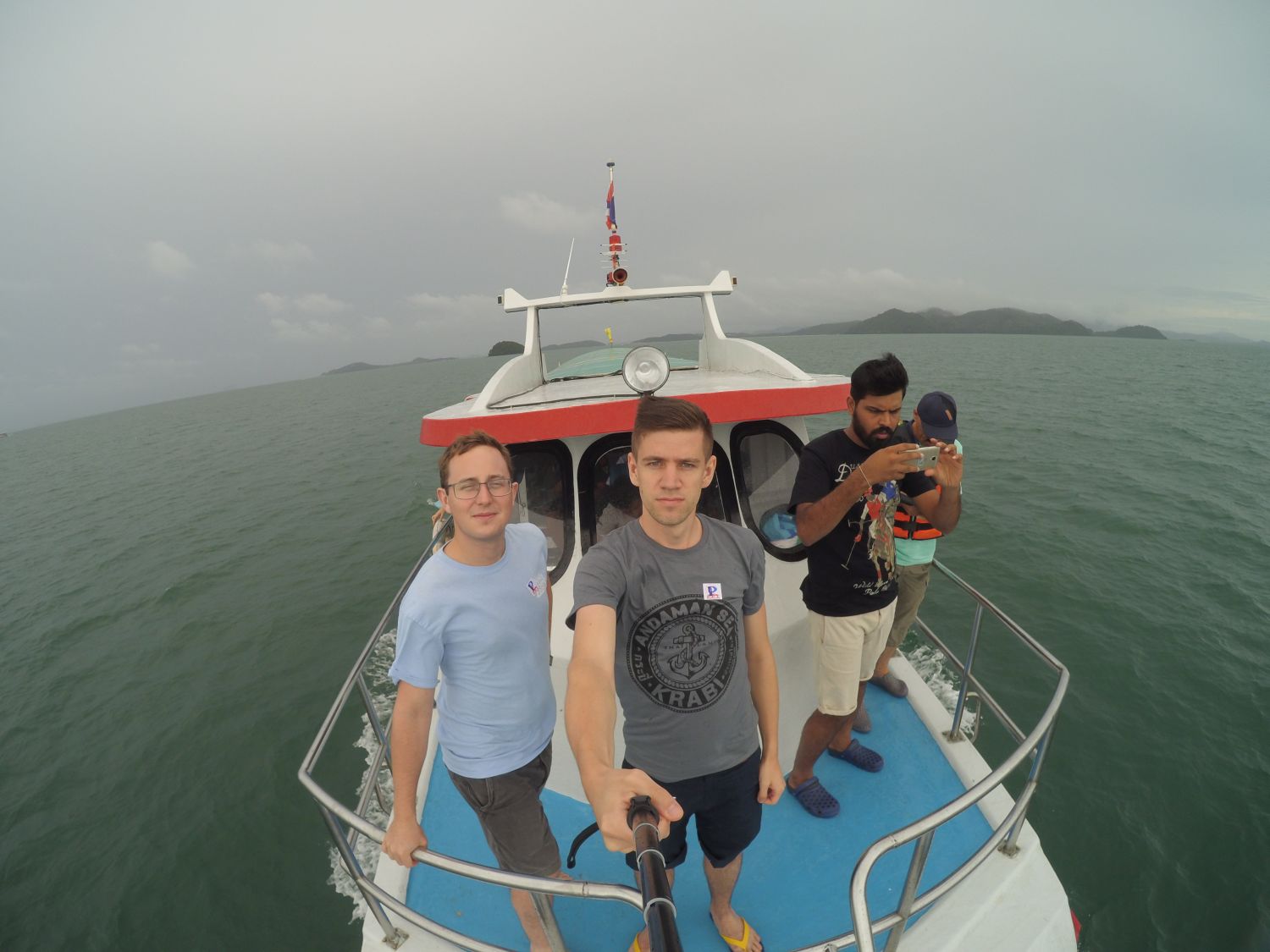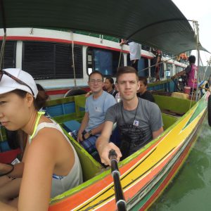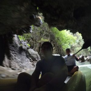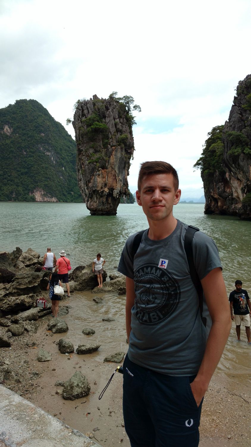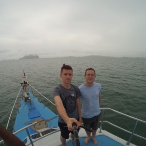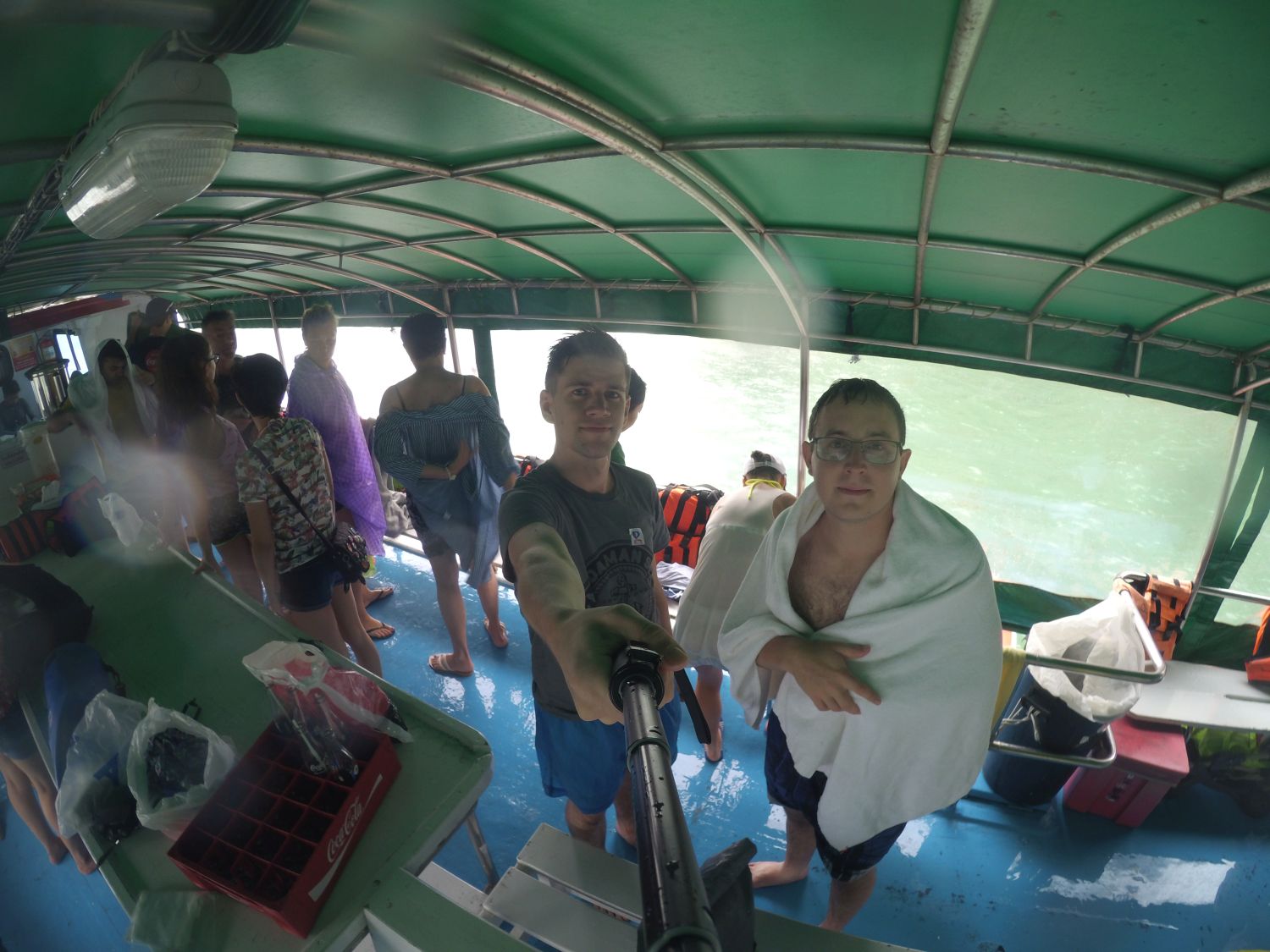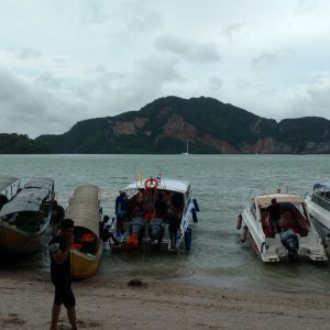 Heute war Sonntag, das hieß für Carsten, dass er die Zeit zum Morgengebet nutzte und erst einmal den ganzen Morgen auf der Toilette verbrachte. Da noch weitere Gebete im Laufe des Tages zu erwarten waren, beschloss er sich die Reise in die Phang Nga Bucht nicht mit anzutreten. Der Minivan startete also dieses Mal ohne Mr. Dietrich in Richtung Ostküste, von der wir ablegen sollten. Dort ging es dann gleich aufs Boot, wo uns bereits Bananen, kühle Getränke und ein redseliger Guide erwarteten, der uns die nächste Stunde Bootsfahrt in schlechtem, aber dafür sehr lautem Englisch zutextete. Die Japanerinnen, die mit uns unterwegs waren machten es genau richtig und entschieden sich das Geschrei zu ignorieren und einfach durchzuschlafen. Nach der ruhigen und glücklicherweise regenfreien Bootsfahrt, wurden wir in der Nähe eines Strandes in Taxi-Longboats umgefrachtet und auf die James Bond Insel gefahren. Roger Moore drehte hier einst „Der Mann mit dem goldenen Colt“, wodurch die Insel auch den Namen bekam, Ein kurzer Spaziergang über die Insel und ein paar Fotos später waren wir wieder auf unserem Schiff, wo schon das leckere Essensbuffet auf uns wartete. Mit vollem Magen ging es gleich weiter mit Kayak-Fahren.  Glücklicherweise wurden wir von unserem persönlichen Kayakfahrer direkt am Boot abgeholt und durch Höhlen und Mangroven geschippert, weshalb dies relativ entspannend war. Zwischendurch konnten wir auch vom Boot hüpfen und ein bisschen im Wasser schwimmen. Da gerade ein starker Regenschauer einsetzte als wir auf dem Kayak waren, wurde die Fahrt natürlich um einiges unterhaltsamer. Als letztes stand dann aber noch das eigentlich Schwimmen auf dem Programm, dass auf einem einsamen und leeren Strand – eine Seltenheit in Thailand – stattfand. Wieder im Hotel angekommen trafen wir auf einen von allen Sünden erlösten Carsten der sich uns für den zweiten Teil der Abendgestaltung anschloss.