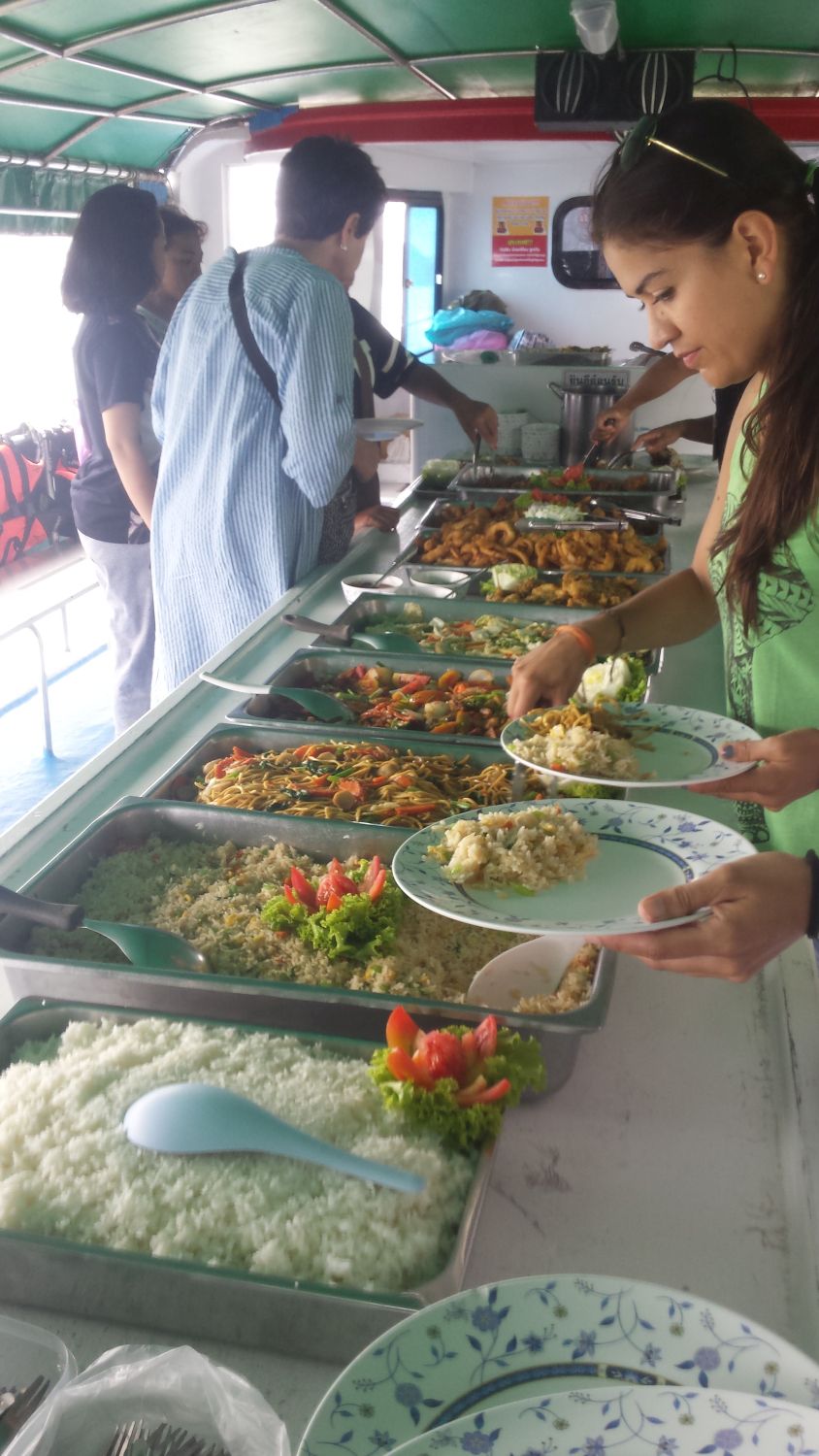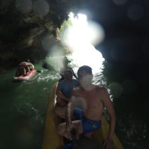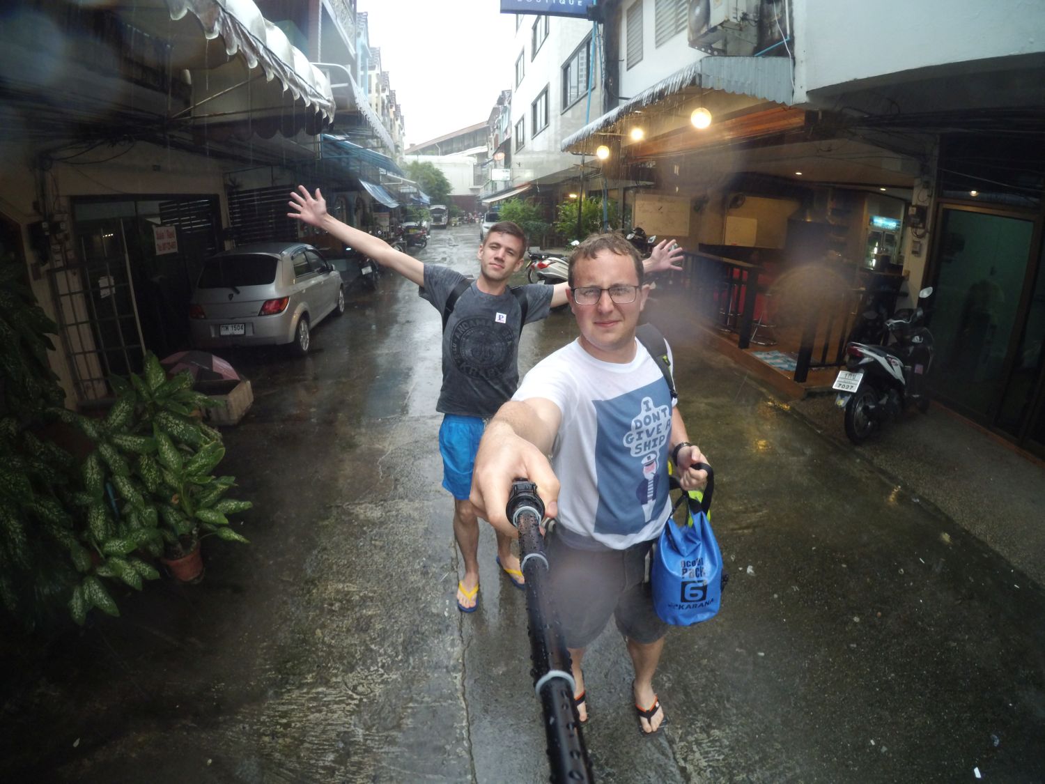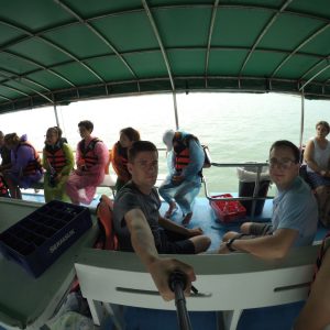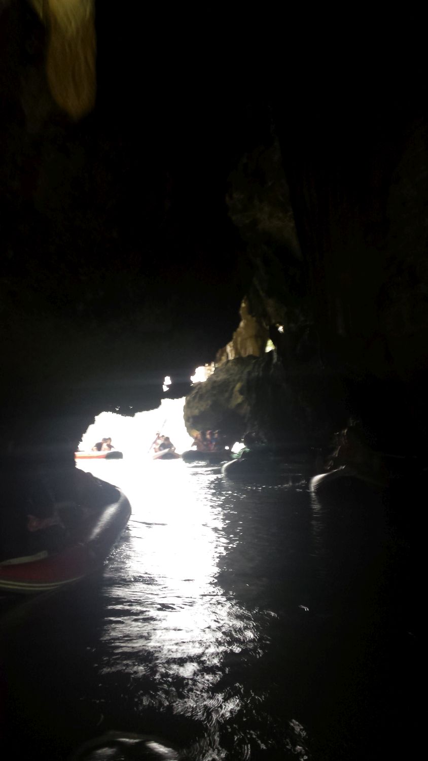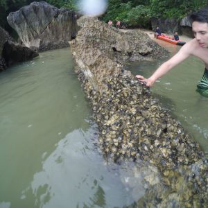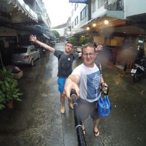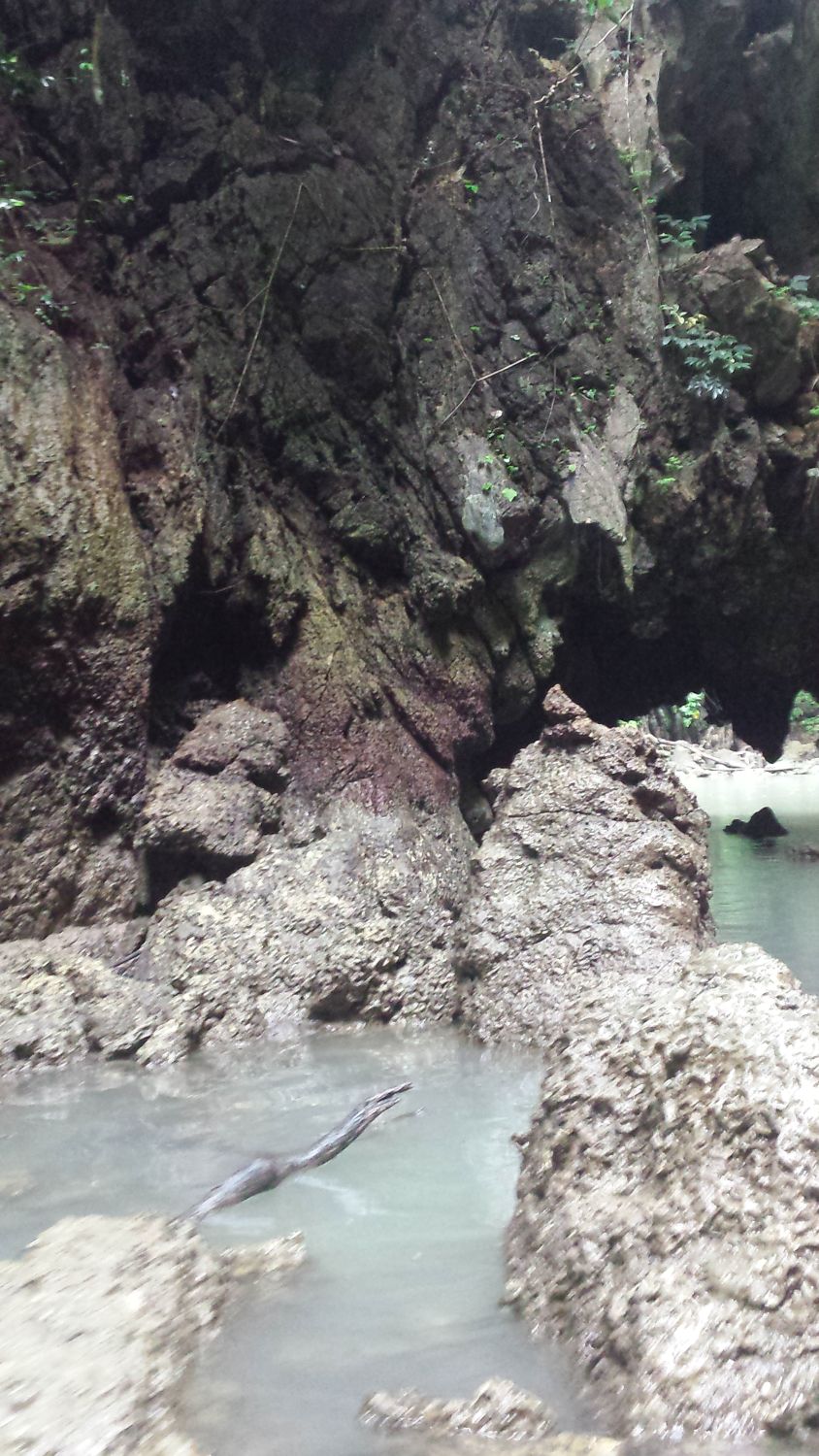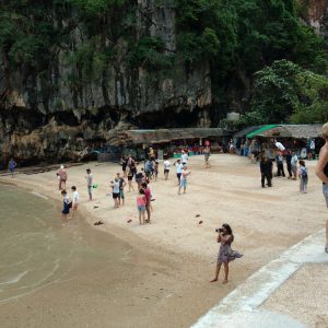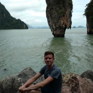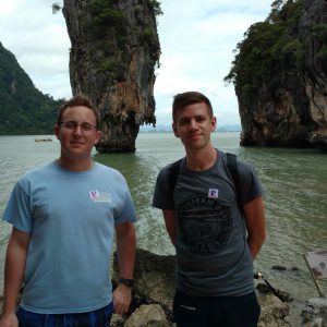 Heute war Sonntag, das hieß für Carsten, dass er die Zeit zum Morgengebet nutzte und erst einmal den ganzen Morgen auf der Toilette verbrachte. Da noch weitere Gebete im Laufe des Tages zu erwarten waren, beschloss er sich die Reise in die Phang Nga Bucht nicht mit anzutreten. Der Minivan startete also dieses Mal ohne Mr. Dietrich in Richtung Ostküste, von der wir ablegen sollten. Dort ging es dann gleich aufs Boot, wo uns bereits Bananen, kühle Getränke und ein redseliger Guide erwarteten, der uns die nächste Stunde Bootsfahrt in schlechtem, aber dafür sehr lautem Englisch zutextete. Die Japanerinnen, die mit uns unterwegs waren machten es genau richtig und entschieden sich das Geschrei zu ignorieren und einfach durchzuschlafen. Nach der ruhigen und glücklicherweise regenfreien Bootsfahrt, wurden wir in der Nähe eines Strandes in Taxi-Longboats umgefrachtet und auf die James Bond Insel gefahren. Roger Moore drehte hier einst „Der Mann mit dem goldenen Colt“, wodurch die Insel auch den Namen bekam, Ein kurzer Spaziergang über die Insel und ein paar Fotos später waren wir wieder auf unserem Schiff, wo schon das leckere Essensbuffet auf uns wartete. Mit vollem Magen ging es gleich weiter mit Kayak-Fahren.  Glücklicherweise wurden wir von unserem persönlichen Kayakfahrer direkt am Boot abgeholt und durch Höhlen und Mangroven geschippert, weshalb dies relativ entspannend war. Zwischendurch konnten wir auch vom Boot hüpfen und ein bisschen im Wasser schwimmen. Da gerade ein starker Regenschauer einsetzte als wir auf dem Kayak waren, wurde die Fahrt natürlich um einiges unterhaltsamer. Als letztes stand dann aber noch das eigentlich Schwimmen auf dem Programm, dass auf einem einsamen und leeren Strand – eine Seltenheit in Thailand – stattfand. Wieder im Hotel angekommen trafen wir auf einen von allen Sünden erlösten Carsten der sich uns für den zweiten Teil der Abendgestaltung anschloss.