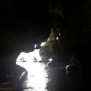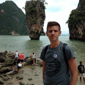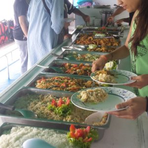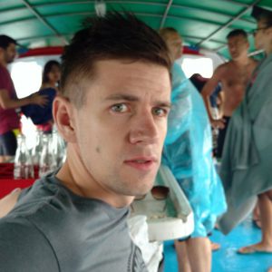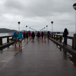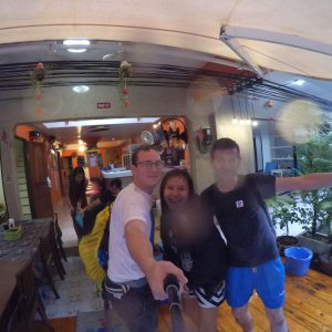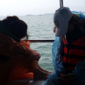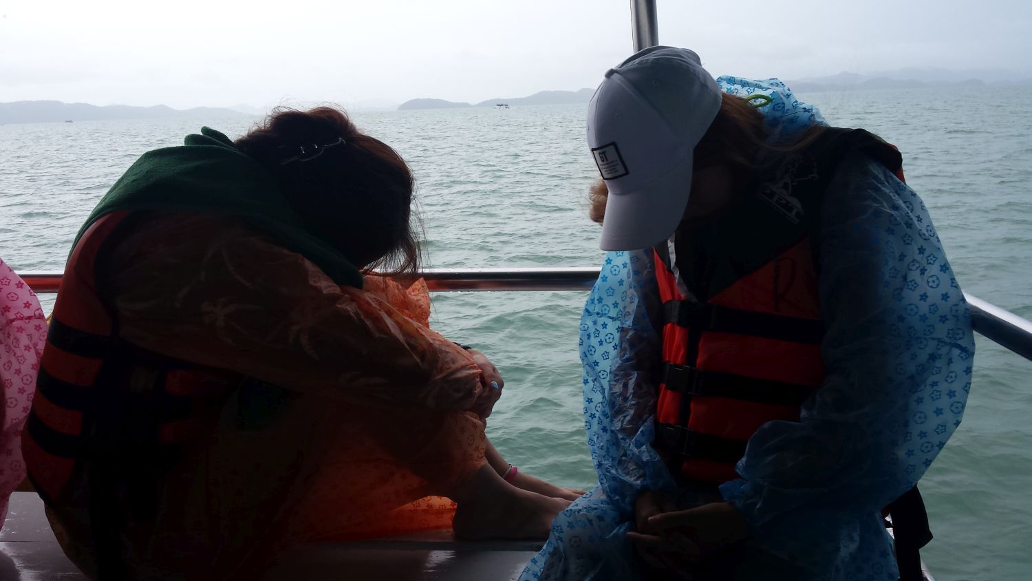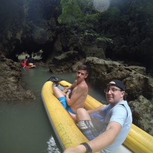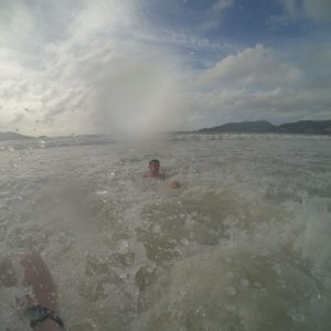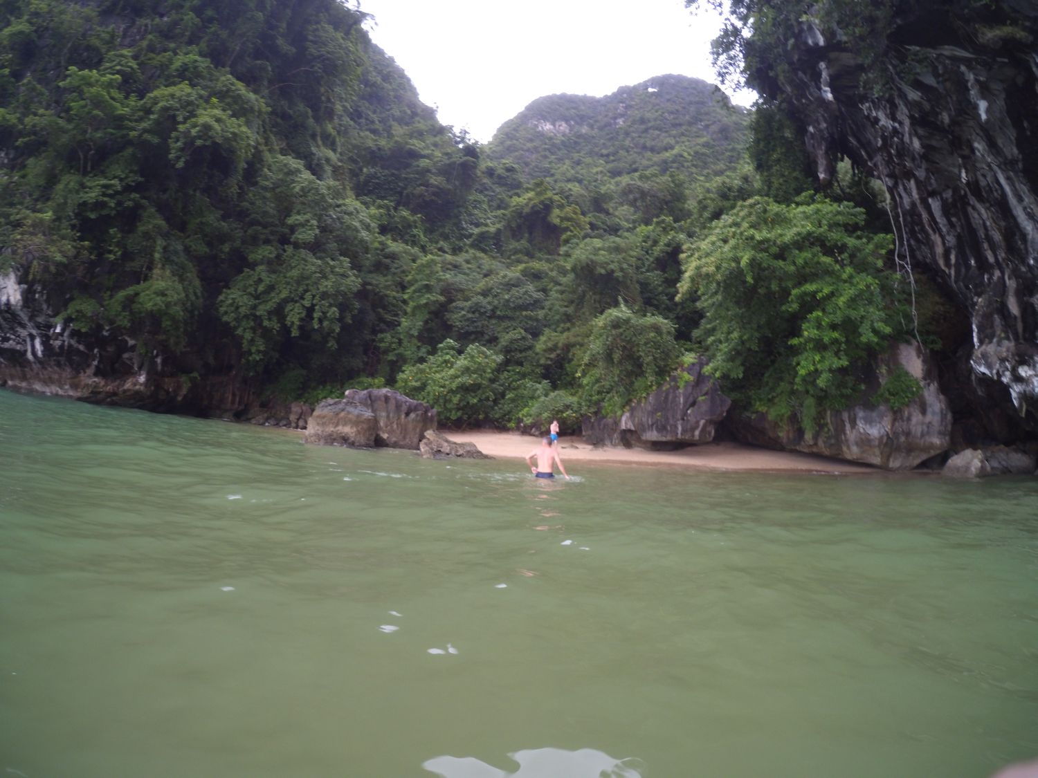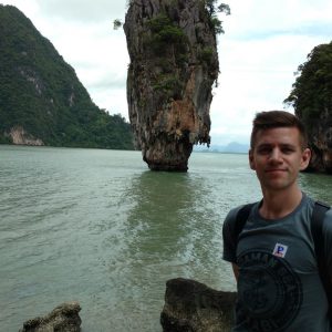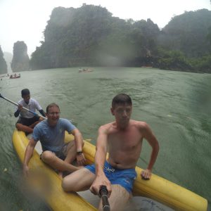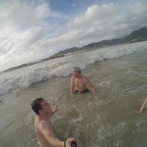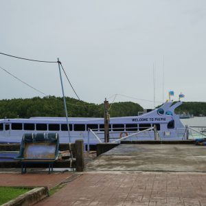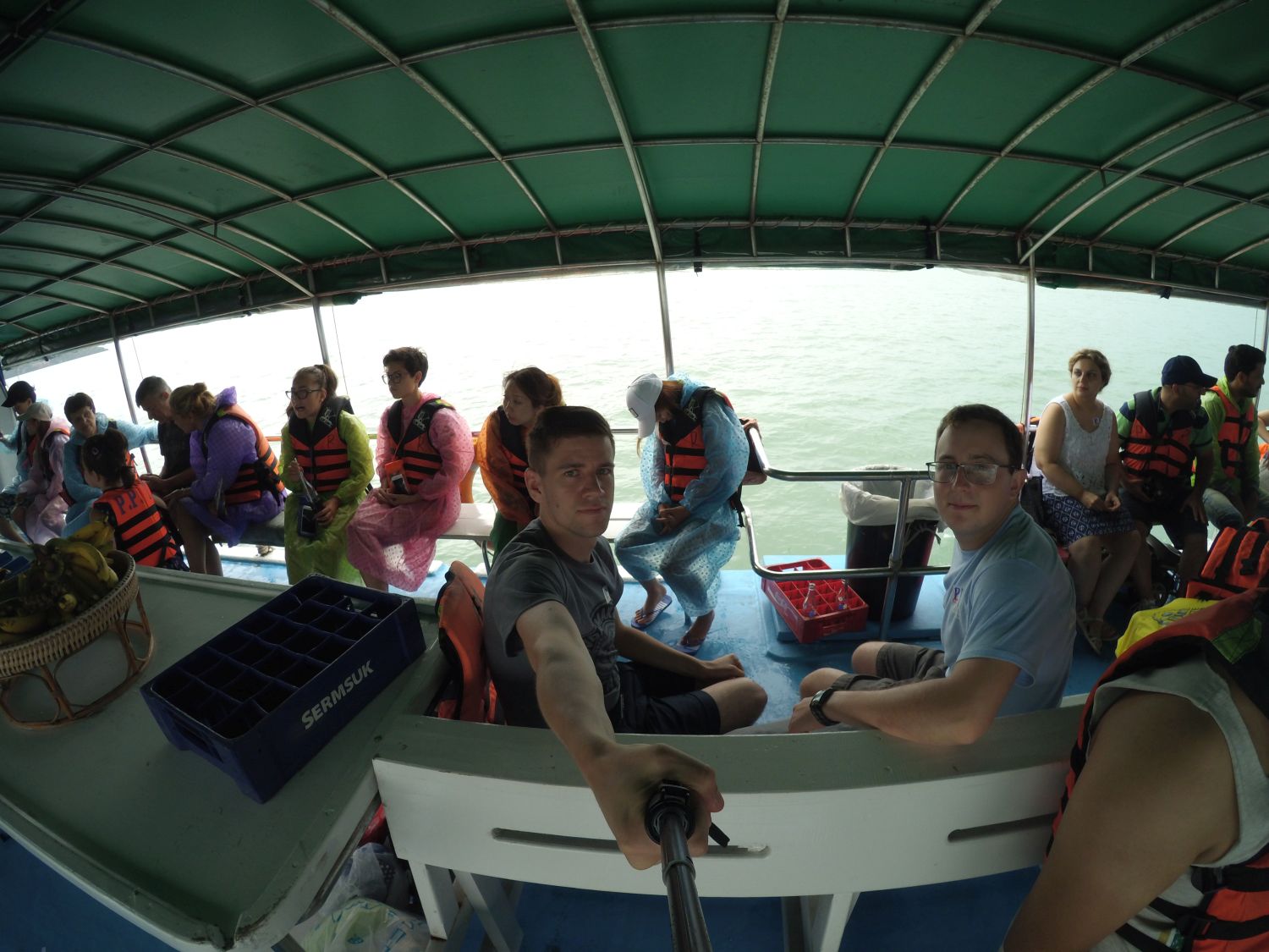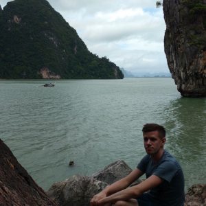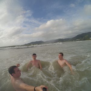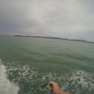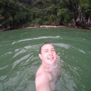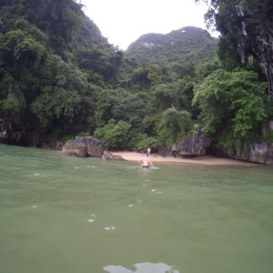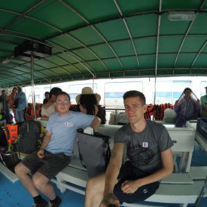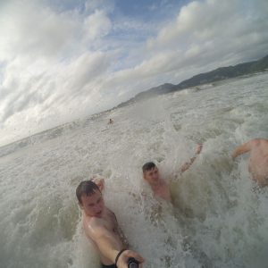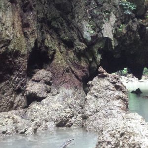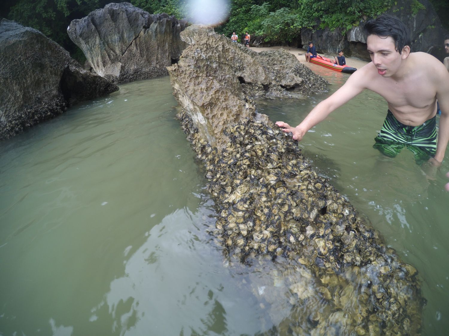 Heute war Sonntag, das hieß für Carsten, dass er die Zeit zum Morgengebet nutzte und erst einmal den ganzen Morgen auf der Toilette verbrachte. Da noch weitere Gebete im Laufe des Tages zu erwarten waren, beschloss er sich die Reise in die Phang Nga Bucht nicht mit anzutreten. Der Minivan startete also dieses Mal ohne Mr. Dietrich in Richtung Ostküste, von der wir ablegen sollten. Dort ging es dann gleich aufs Boot, wo uns bereits Bananen, kühle Getränke und ein redseliger Guide erwarteten, der uns die nächste Stunde Bootsfahrt in schlechtem, aber dafür sehr lautem Englisch zutextete. Die Japanerinnen, die mit uns unterwegs waren machten es genau richtig und entschieden sich das Geschrei zu ignorieren und einfach durchzuschlafen. Nach der ruhigen und glücklicherweise regenfreien Bootsfahrt, wurden wir in der Nähe eines Strandes in Taxi-Longboats umgefrachtet und auf die James Bond Insel gefahren. Roger Moore drehte hier einst „Der Mann mit dem goldenen Colt“, wodurch die Insel auch den Namen bekam, Ein kurzer Spaziergang über die Insel und ein paar Fotos später waren wir wieder auf unserem Schiff, wo schon das leckere Essensbuffet auf uns wartete. Mit vollem Magen ging es gleich weiter mit Kayak-Fahren.  Glücklicherweise wurden wir von unserem persönlichen Kayakfahrer direkt am Boot abgeholt und durch Höhlen und Mangroven geschippert, weshalb dies relativ entspannend war. Zwischendurch konnten wir auch vom Boot hüpfen und ein bisschen im Wasser schwimmen. Da gerade ein starker Regenschauer einsetzte als wir auf dem Kayak waren, wurde die Fahrt natürlich um einiges unterhaltsamer. Als letztes stand dann aber noch das eigentlich Schwimmen auf dem Programm, dass auf einem einsamen und leeren Strand – eine Seltenheit in Thailand – stattfand. Wieder im Hotel angekommen trafen wir auf einen von allen Sünden erlösten Carsten der sich uns für den zweiten Teil der Abendgestaltung anschloss.
