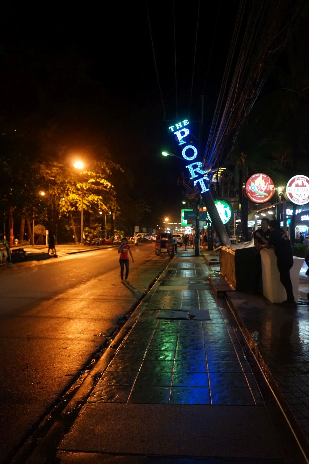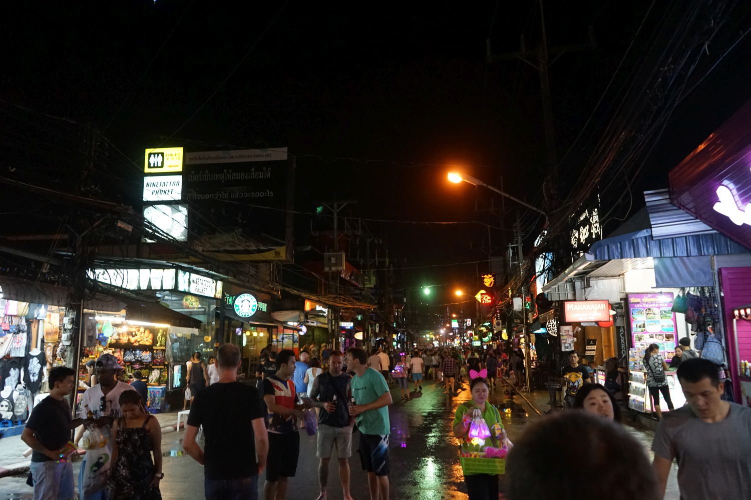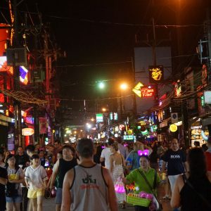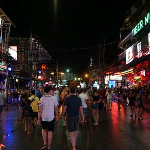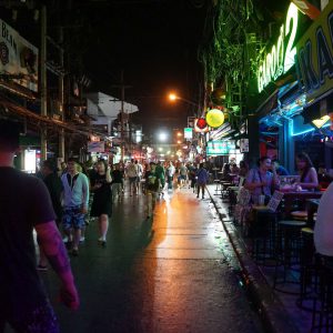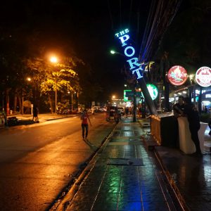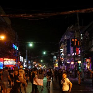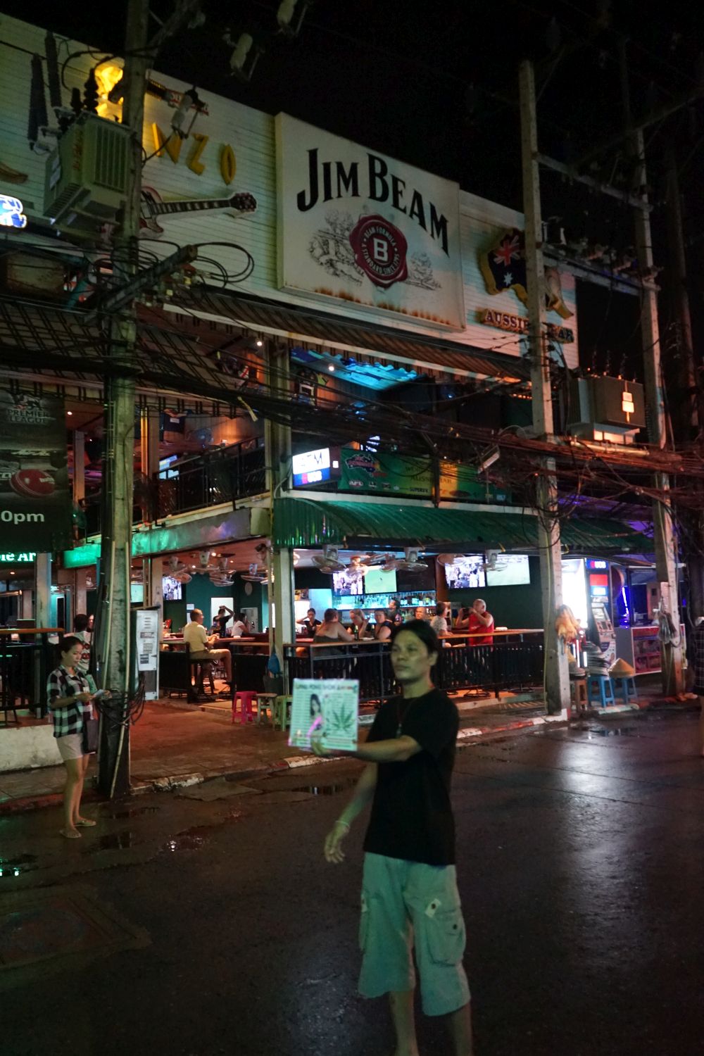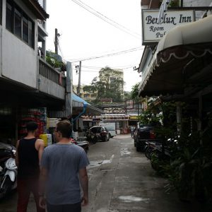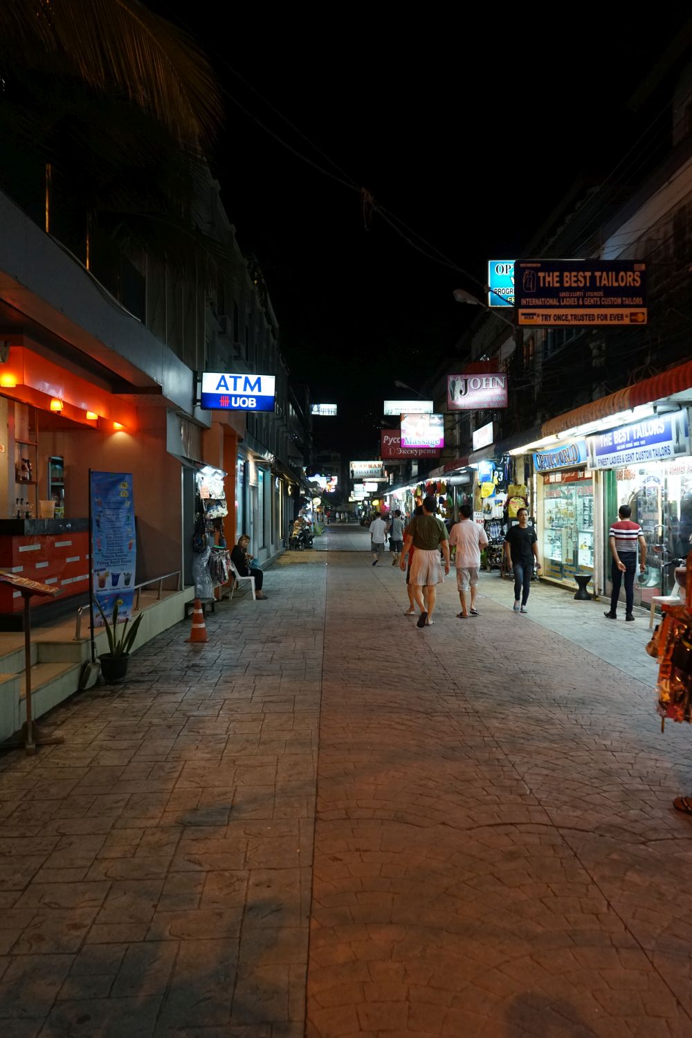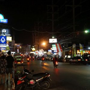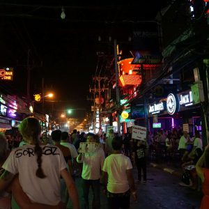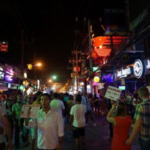 Gemeinsam begann der Spießroutenlauf durch die Straßen von Patong. Zu nächst ging es an einer schier unendlichen Zahl von Massagestudios vorbei. Vor diesen sitzen die Masseusen wie Hühner auf der Stange und warten auf männliche Opfer die direkt mit den Rufen „Massag, Massag“ angesprungen werden. Nach dem wir die ersten Wellen an Masseusen abgewehrt hatten ging es über die Partymeile von Patong. Hier warteten neue Gegner auf uns. Das Angebot an Massagen ist hier verschwinden gering dafür muss man sich vor Ladyboys, Prostituierten, Bardamen, Sexshow-Promotern und anderen schmierigen Gestalten in acht nehmen. Dieser Ort hat überhaupt nichts mit der asiatischen Zurückhaltung zu tun und sogar Familien mit Kindern werden auf dieser Meile mit dubiosen Angeboten überschüttet. Wie man hier mehr als 1-2 Abende freiwillig verbringen kann ist uns ein Rätsel. Wir würden es daher auch als Moloch von Thailand bezeichnen.