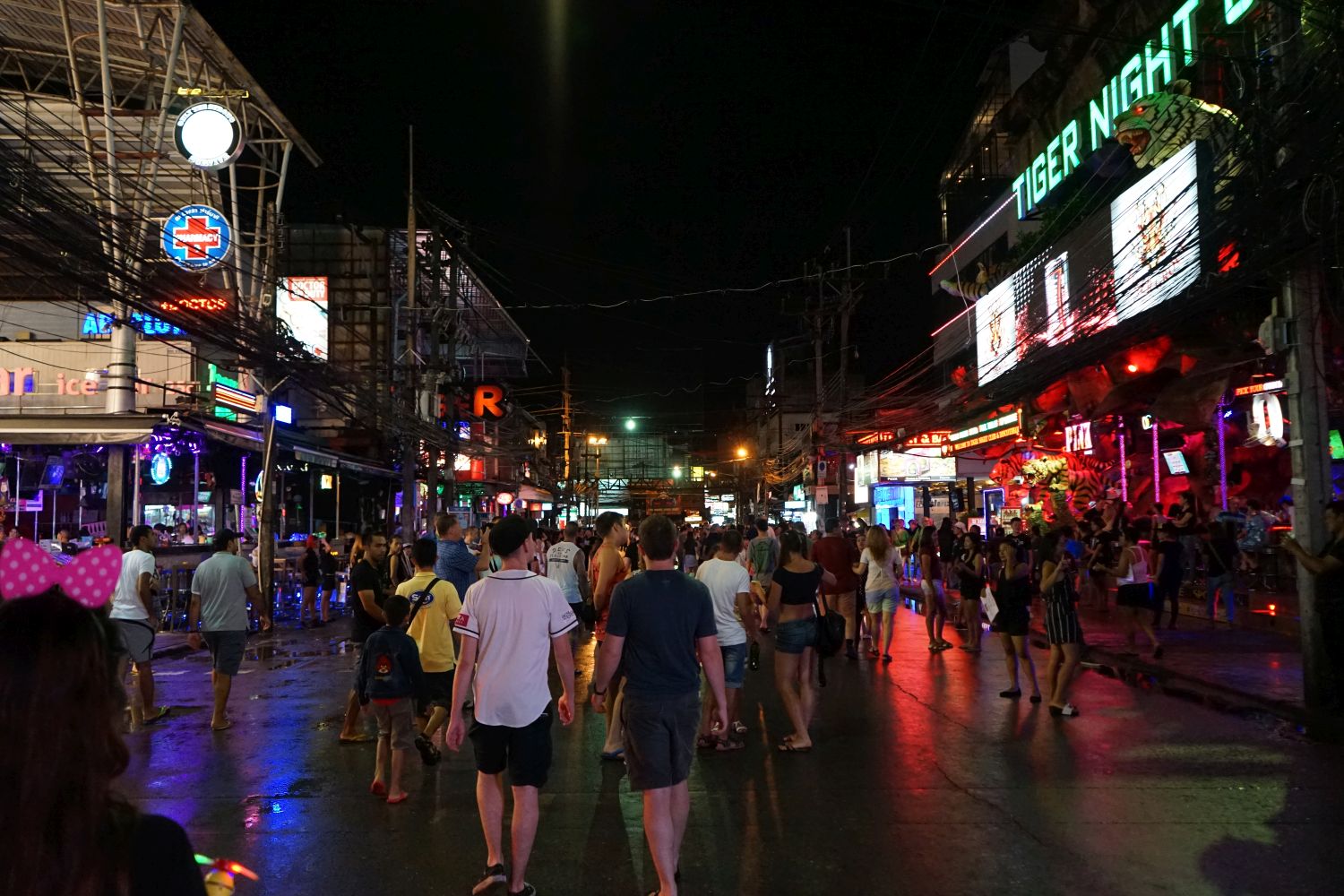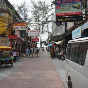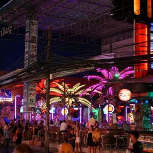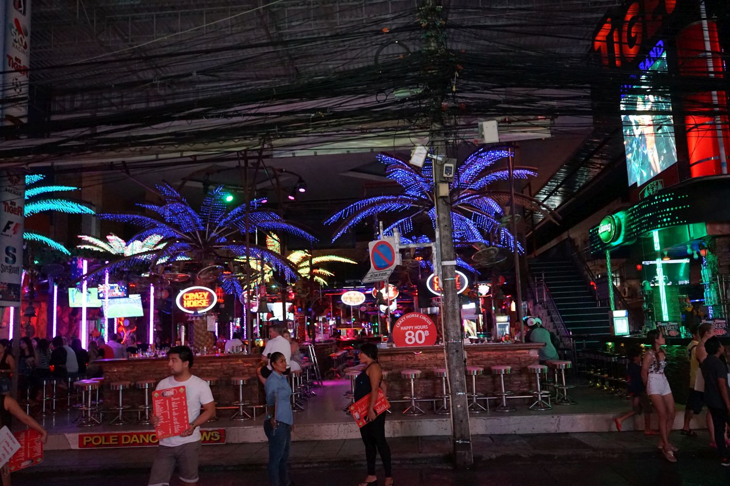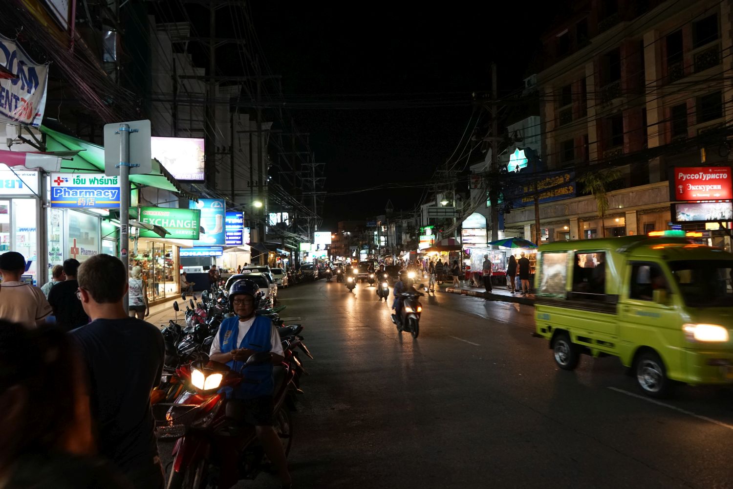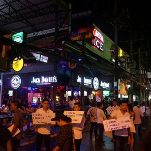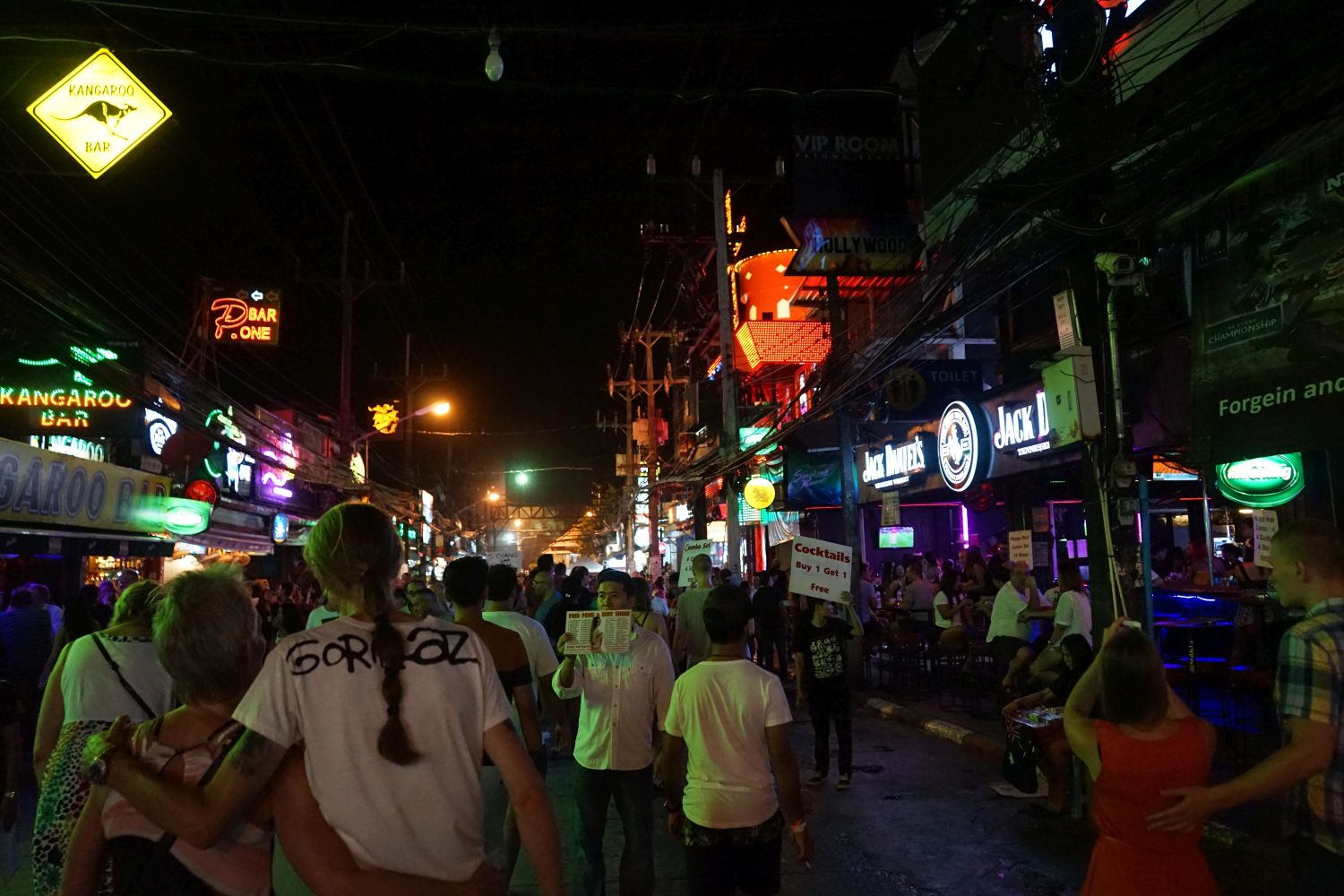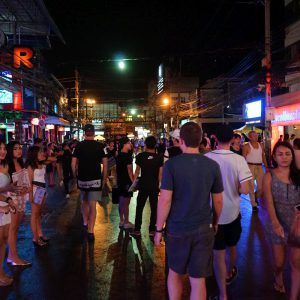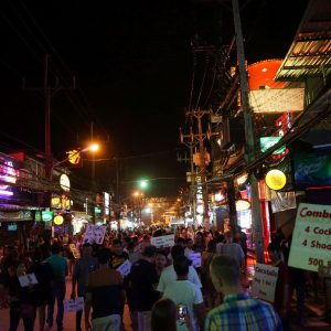 Gemeinsam begann der Spießroutenlauf durch die Straßen von Patong. Zu nächst ging es an einer schier unendlichen Zahl von Massagestudios vorbei. Vor diesen sitzen die Masseusen wie Hühner auf der Stange und warten auf männliche Opfer die direkt mit den Rufen „Massag, Massag“ angesprungen werden. Nach dem wir die ersten Wellen an Masseusen abgewehrt hatten ging es über die Partymeile von Patong. Hier warteten neue Gegner auf uns. Das Angebot an Massagen ist hier verschwinden gering dafür muss man sich vor Ladyboys, Prostituierten, Bardamen, Sexshow-Promotern und anderen schmierigen Gestalten in acht nehmen. Dieser Ort hat überhaupt nichts mit der asiatischen Zurückhaltung zu tun und sogar Familien mit Kindern werden auf dieser Meile mit dubiosen Angeboten überschüttet. Wie man hier mehr als 1-2 Abende freiwillig verbringen kann ist uns ein Rätsel. Wir würden es daher auch als Moloch von Thailand bezeichnen.