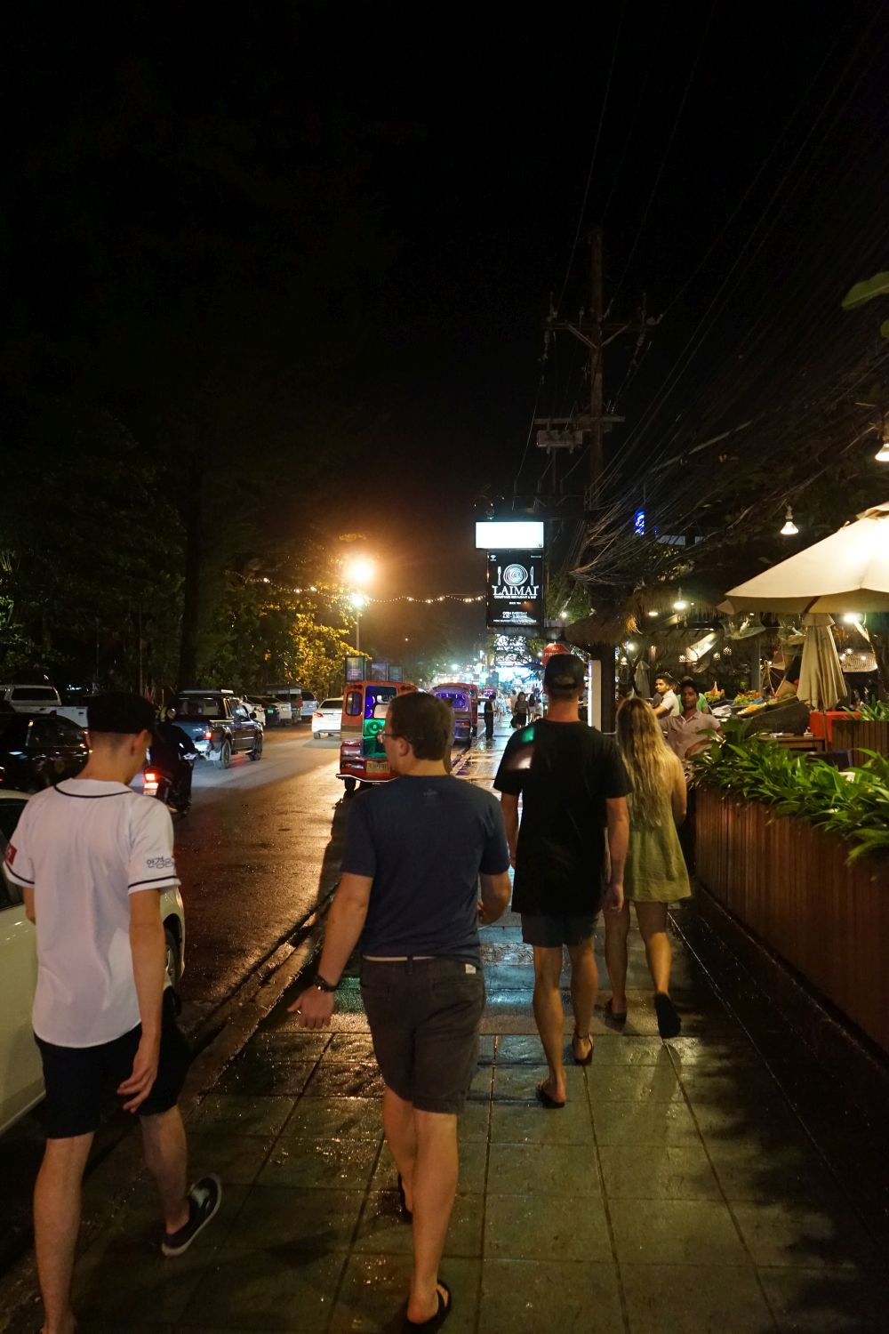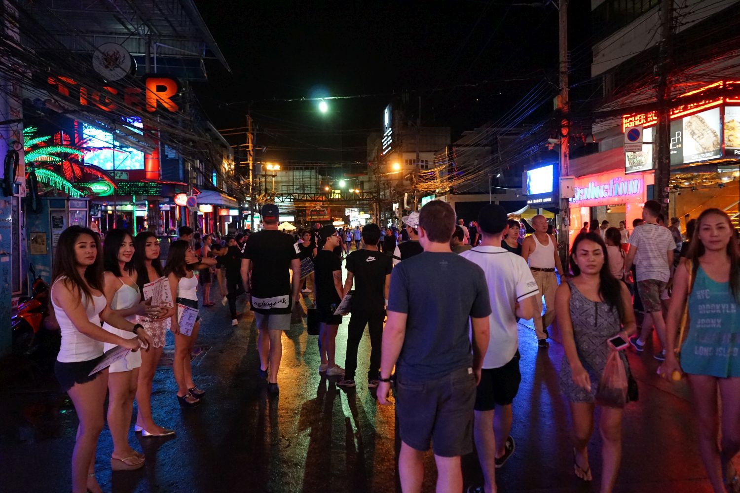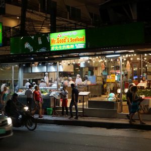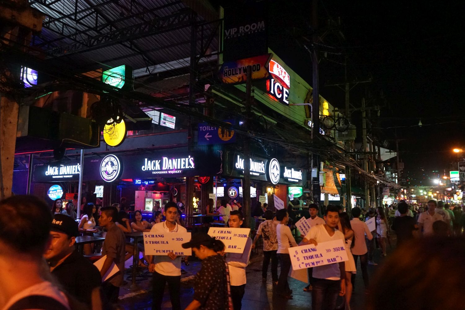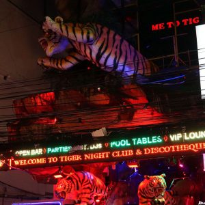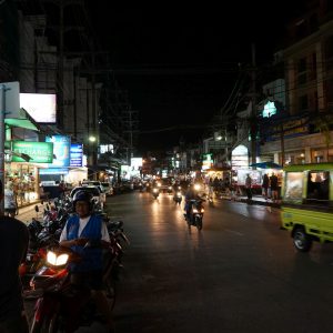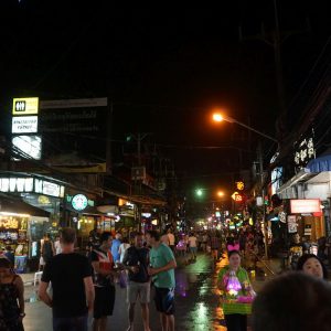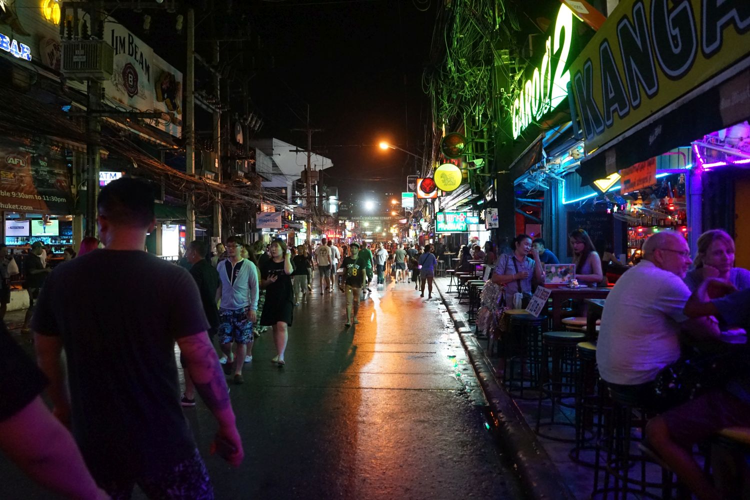 Gemeinsam begann der Spießroutenlauf durch die Straßen von Patong. Zu nächst ging es an einer schier unendlichen Zahl von Massagestudios vorbei. Vor diesen sitzen die Masseusen wie Hühner auf der Stange und warten auf männliche Opfer die direkt mit den Rufen „Massag, Massag“ angesprungen werden. Nach dem wir die ersten Wellen an Masseusen abgewehrt hatten ging es über die Partymeile von Patong. Hier warteten neue Gegner auf uns. Das Angebot an Massagen ist hier verschwinden gering dafür muss man sich vor Ladyboys, Prostituierten, Bardamen, Sexshow-Promotern und anderen schmierigen Gestalten in acht nehmen. Dieser Ort hat überhaupt nichts mit der asiatischen Zurückhaltung zu tun und sogar Familien mit Kindern werden auf dieser Meile mit dubiosen Angeboten überschüttet. Wie man hier mehr als 1-2 Abende freiwillig verbringen kann ist uns ein Rätsel. Wir würden es daher auch als Moloch von Thailand bezeichnen.