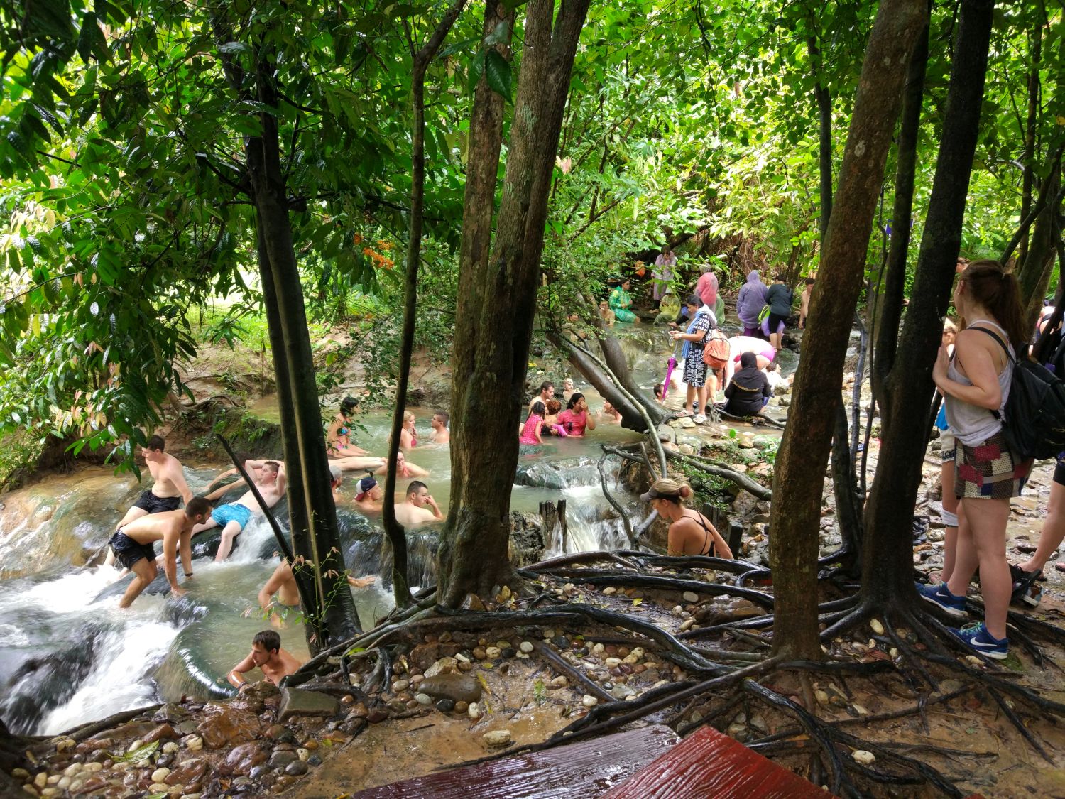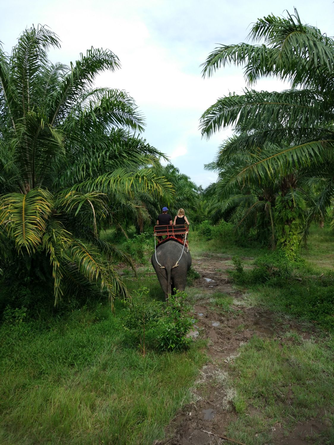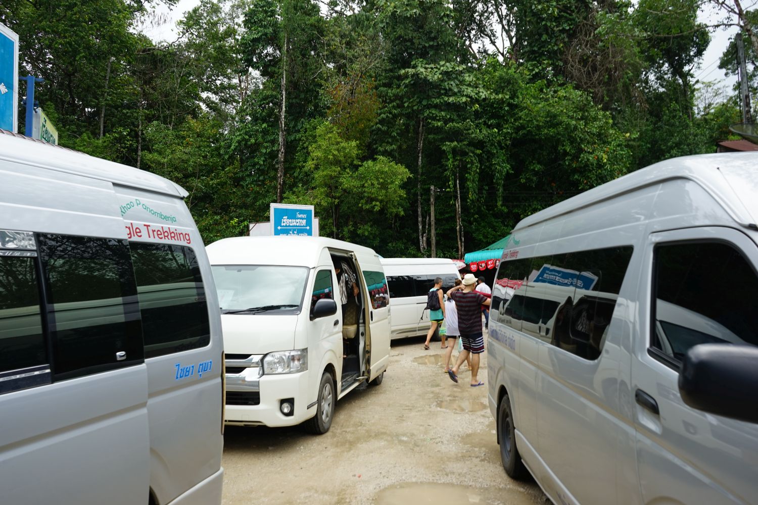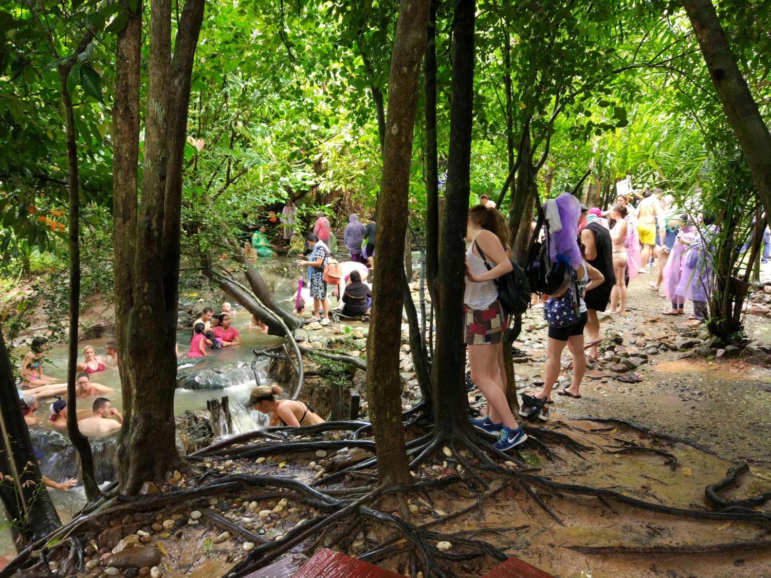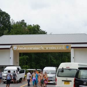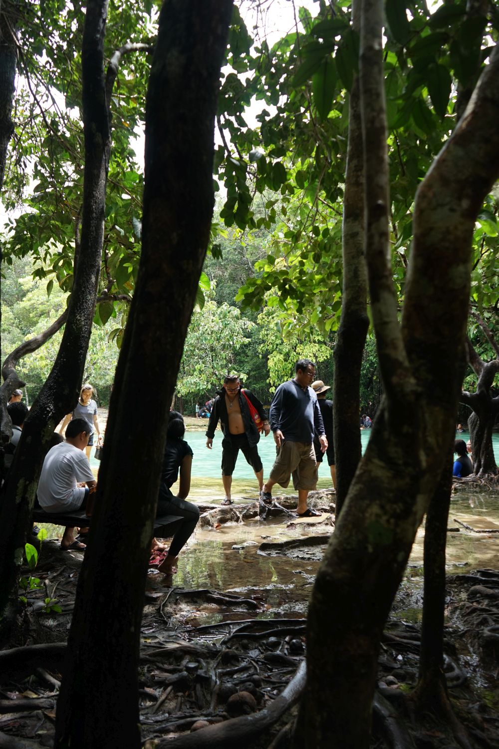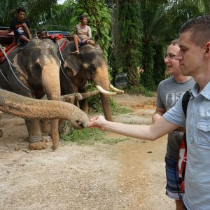 Endlich wieder Regen. Einer verregneten Nacht folgte ein verregneter Morgen, den wir glücklicherweise erst einmal in einem Minivan verbrachten. Wir hatten uns eine Tour mit „Guide“ gebucht, die uns in die Urwälder Thailands führen sollte. Guide bedeutet in diesem Zusammenhang aber nur, dass es eine Person gab, die einem Uhrzeiten in einer Sprache zuschrie, die dem Englischen zumindest ein bisschen ähnelte. Erklärungen zu irgendwas gab es leider keine. Als Erstes ging es zu den heißen Quellen (Namtok Ron) die leider ziemlich überfüllt und aufgrund des Regens alles andere als glasklar waren. Wir hielten uns dort also nicht besonders lange auf und so waren wir schnell wieder in unserem gemütlichen Minivan. Als nächster Stop war der Emerald See (Sa Morakot) geplant. Hier verbrachten wir auch die meiste Zeit. Nach dem ausgiebigen Baden in einem ebenfalls überfüllten Pool, plantschten wir dann noch ein bisschen in einem abseits gelegen Wasserfällchen, wo es deutlich entspannter zuging. Wie bei allen Touren in Südostasien ist der Zeitplan immer sehr straff und so ging es schnell wieder zum Minivan und dann fast direkt – zwei Chinesen aus unserer Reisegruppe waren kurz verschollen-  zum Elephant Trekking. Wie der Name schon andeutet ist das ein Elefantenritt durch den Dschungel. Abgesehen von der Tatsache, dass es sich dabei um massive Tierquälerei handelte, war es aber ganz unterhaltsam, zumal die Guides die ganze Zeit ein paar Chinesinnen aus unserer Reisegruppe veräppelten. Auf dem Rückweg machten wir dann noch einen kurzen Stop bei 7Eleven, dem Laden unseres Vertrauens, wo wir uns mit Proviant eindeckten. Im Hotel angekommen, entspannten wir noch ein bisschen bei ein paar Stückchen Thai-Pizza und traten wir unsere Reise ins Traumland an, um für den folgenden Tag in Topform zu sein. Aber das ist eine andere Geschichte und ein neuer Blogeintrag 😉