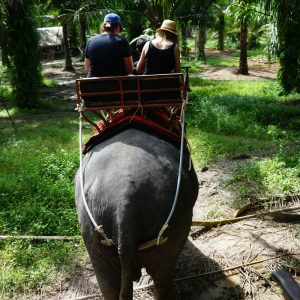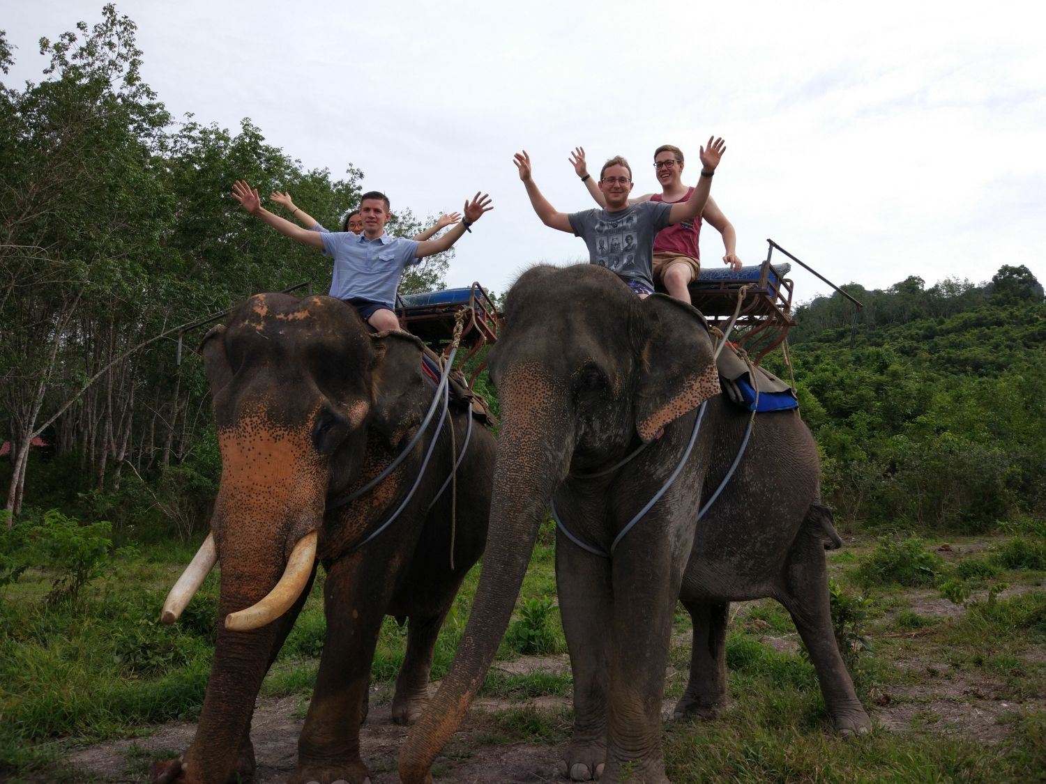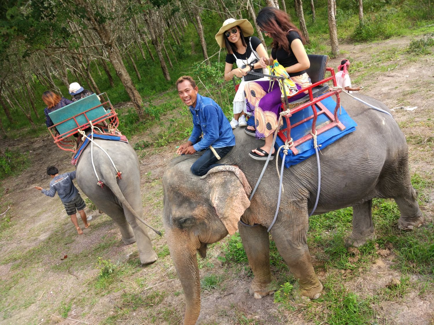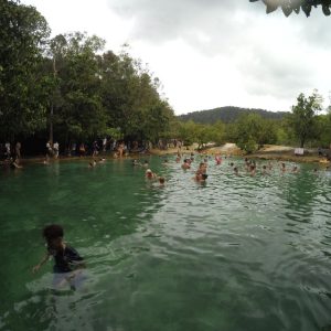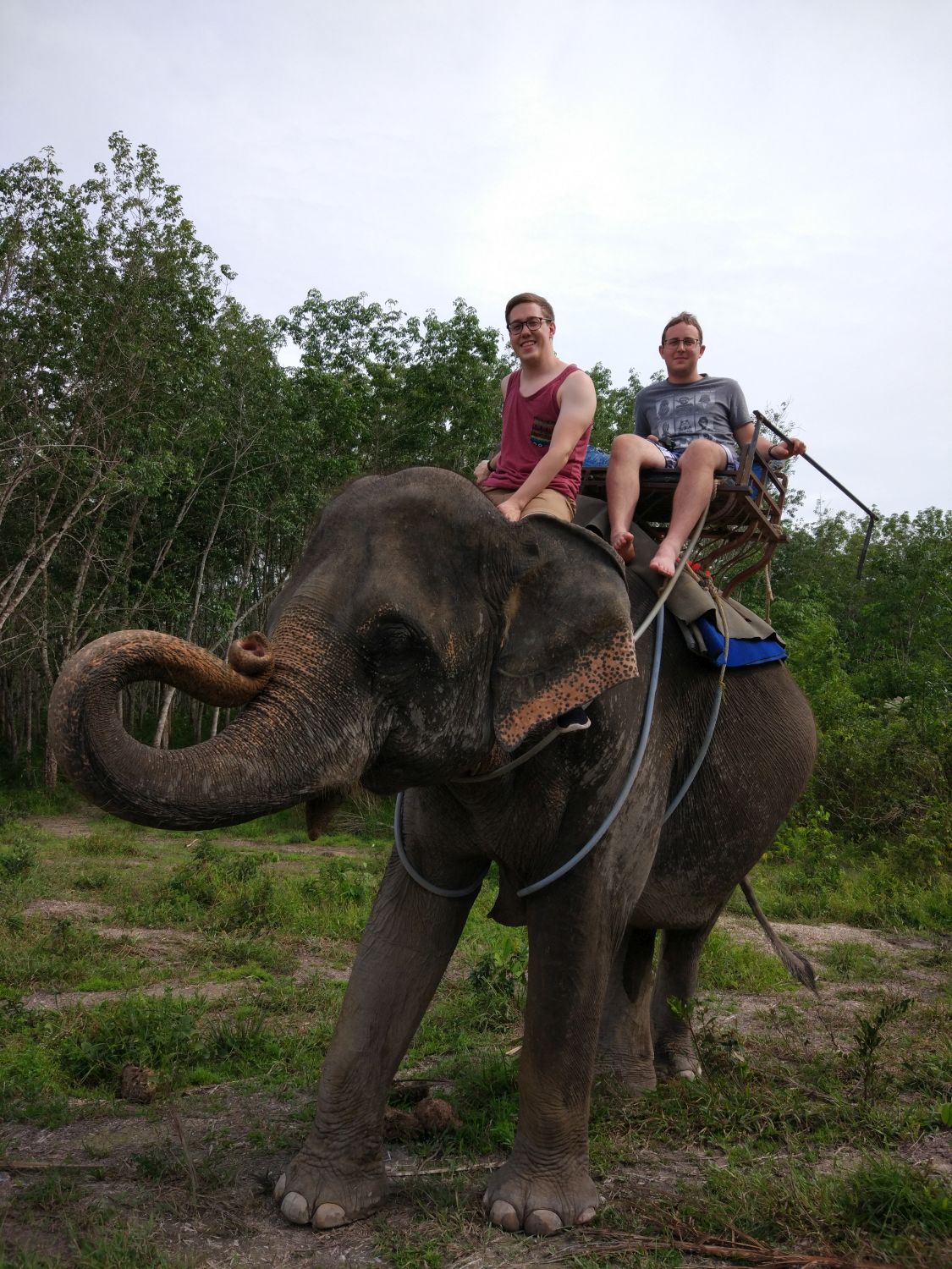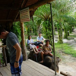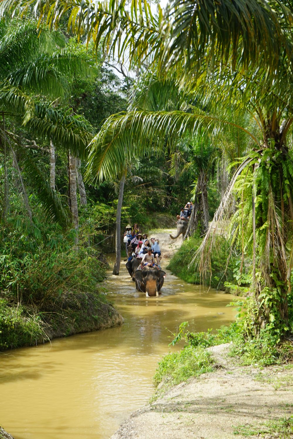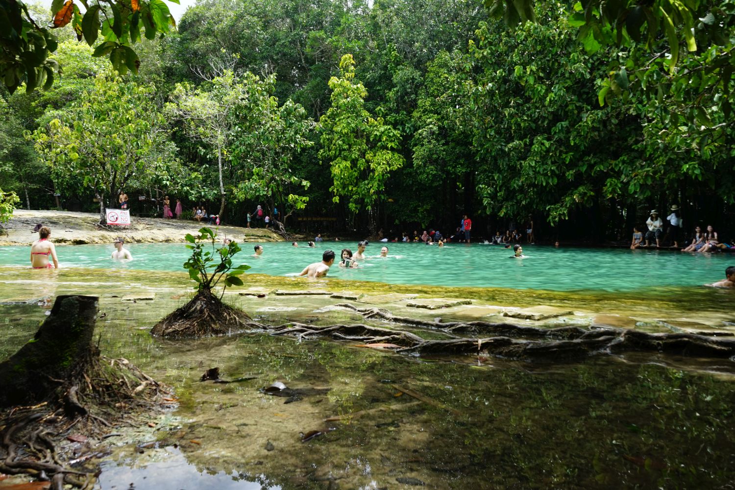 Endlich wieder Regen. Einer verregneten Nacht folgte ein verregneter Morgen, den wir glücklicherweise erst einmal in einem Minivan verbrachten. Wir hatten uns eine Tour mit „Guide“ gebucht, die uns in die Urwälder Thailands führen sollte. Guide bedeutet in diesem Zusammenhang aber nur, dass es eine Person gab, die einem Uhrzeiten in einer Sprache zuschrie, die dem Englischen zumindest ein bisschen ähnelte. Erklärungen zu irgendwas gab es leider keine. Als Erstes ging es zu den heißen Quellen (Namtok Ron) die leider ziemlich überfüllt und aufgrund des Regens alles andere als glasklar waren. Wir hielten uns dort also nicht besonders lange auf und so waren wir schnell wieder in unserem gemütlichen Minivan. Als nächster Stop war der Emerald See (Sa Morakot) geplant. Hier verbrachten wir auch die meiste Zeit. Nach dem ausgiebigen Baden in einem ebenfalls überfüllten Pool, plantschten wir dann noch ein bisschen in einem abseits gelegen Wasserfällchen, wo es deutlich entspannter zuging. Wie bei allen Touren in Südostasien ist der Zeitplan immer sehr straff und so ging es schnell wieder zum Minivan und dann fast direkt – zwei Chinesen aus unserer Reisegruppe waren kurz verschollen-  zum Elephant Trekking. Wie der Name schon andeutet ist das ein Elefantenritt durch den Dschungel. Abgesehen von der Tatsache, dass es sich dabei um massive Tierquälerei handelte, war es aber ganz unterhaltsam, zumal die Guides die ganze Zeit ein paar Chinesinnen aus unserer Reisegruppe veräppelten. Auf dem Rückweg machten wir dann noch einen kurzen Stop bei 7Eleven, dem Laden unseres Vertrauens, wo wir uns mit Proviant eindeckten. Im Hotel angekommen, entspannten wir noch ein bisschen bei ein paar Stückchen Thai-Pizza und traten wir unsere Reise ins Traumland an, um für den folgenden Tag in Topform zu sein. Aber das ist eine andere Geschichte und ein neuer Blogeintrag 😉