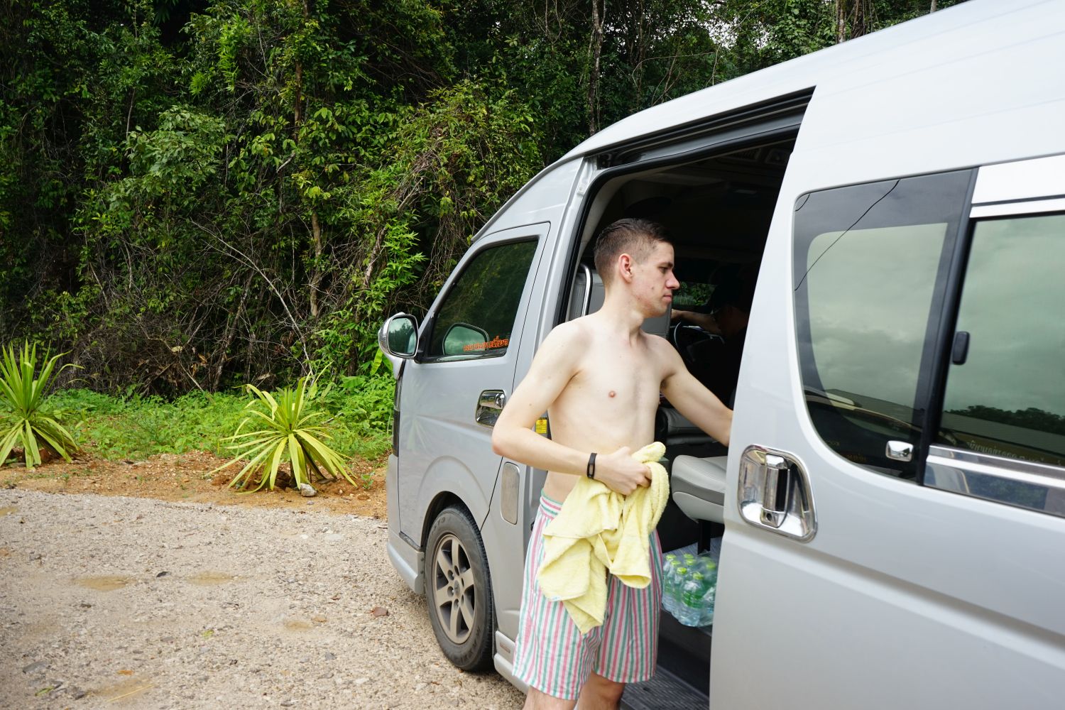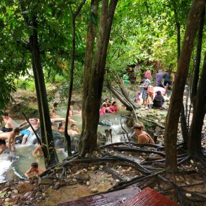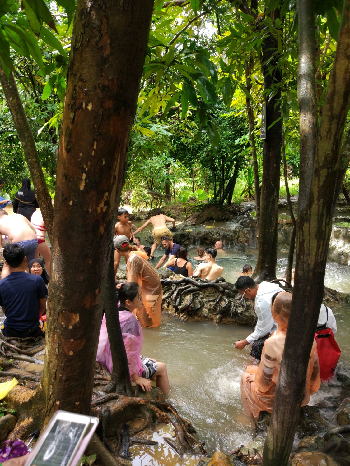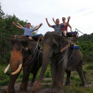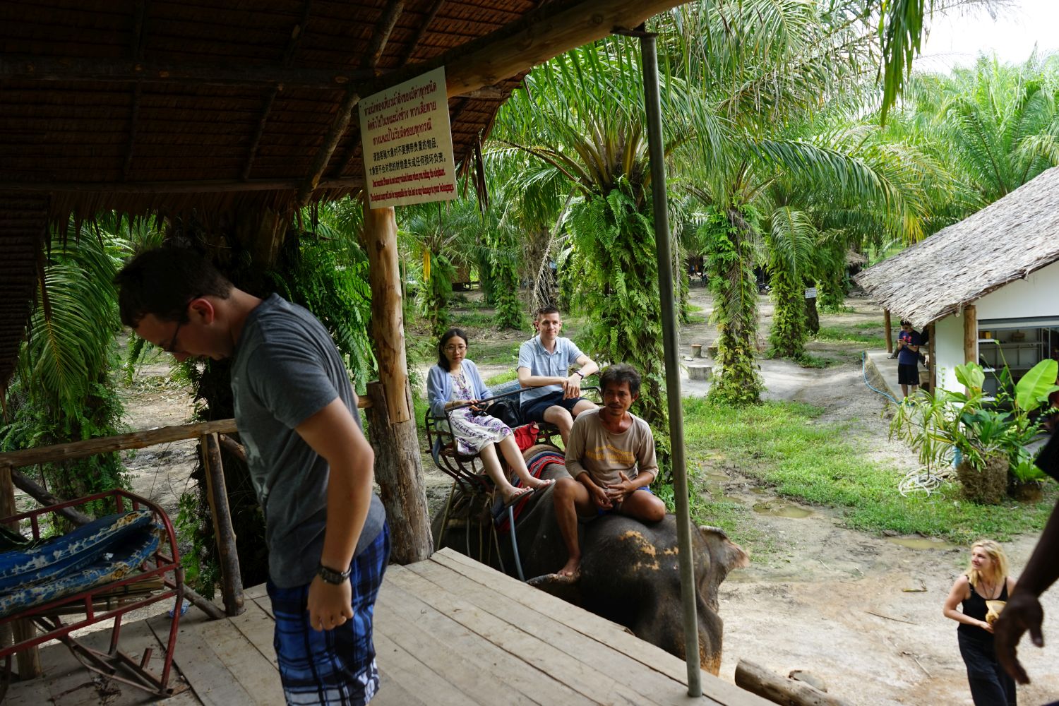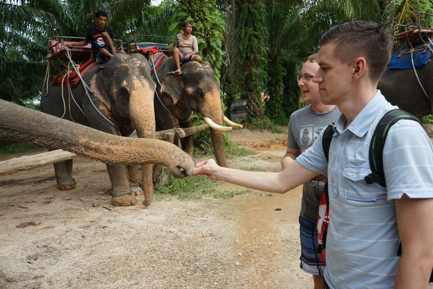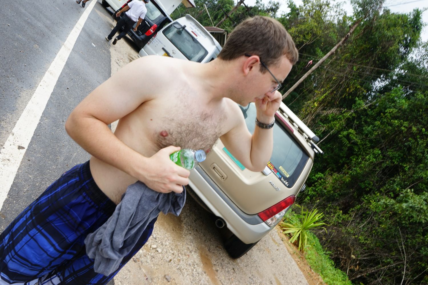 Endlich wieder Regen. Einer verregneten Nacht folgte ein verregneter Morgen, den wir glücklicherweise erst einmal in einem Minivan verbrachten. Wir hatten uns eine Tour mit „Guide“ gebucht, die uns in die Urwälder Thailands führen sollte. Guide bedeutet in diesem Zusammenhang aber nur, dass es eine Person gab, die einem Uhrzeiten in einer Sprache zuschrie, die dem Englischen zumindest ein bisschen ähnelte. Erklärungen zu irgendwas gab es leider keine. Als Erstes ging es zu den heißen Quellen (Namtok Ron) die leider ziemlich überfüllt und aufgrund des Regens alles andere als glasklar waren. Wir hielten uns dort also nicht besonders lange auf und so waren wir schnell wieder in unserem gemütlichen Minivan. Als nächster Stop war der Emerald See (Sa Morakot) geplant. Hier verbrachten wir auch die meiste Zeit. Nach dem ausgiebigen Baden in einem ebenfalls überfüllten Pool, plantschten wir dann noch ein bisschen in einem abseits gelegen Wasserfällchen, wo es deutlich entspannter zuging. Wie bei allen Touren in Südostasien ist der Zeitplan immer sehr straff und so ging es schnell wieder zum Minivan und dann fast direkt – zwei Chinesen aus unserer Reisegruppe waren kurz verschollen-  zum Elephant Trekking. Wie der Name schon andeutet ist das ein Elefantenritt durch den Dschungel. Abgesehen von der Tatsache, dass es sich dabei um massive Tierquälerei handelte, war es aber ganz unterhaltsam, zumal die Guides die ganze Zeit ein paar Chinesinnen aus unserer Reisegruppe veräppelten. Auf dem Rückweg machten wir dann noch einen kurzen Stop bei 7Eleven, dem Laden unseres Vertrauens, wo wir uns mit Proviant eindeckten. Im Hotel angekommen, entspannten wir noch ein bisschen bei ein paar Stückchen Thai-Pizza und traten wir unsere Reise ins Traumland an, um für den folgenden Tag in Topform zu sein. Aber das ist eine andere Geschichte und ein neuer Blogeintrag 😉