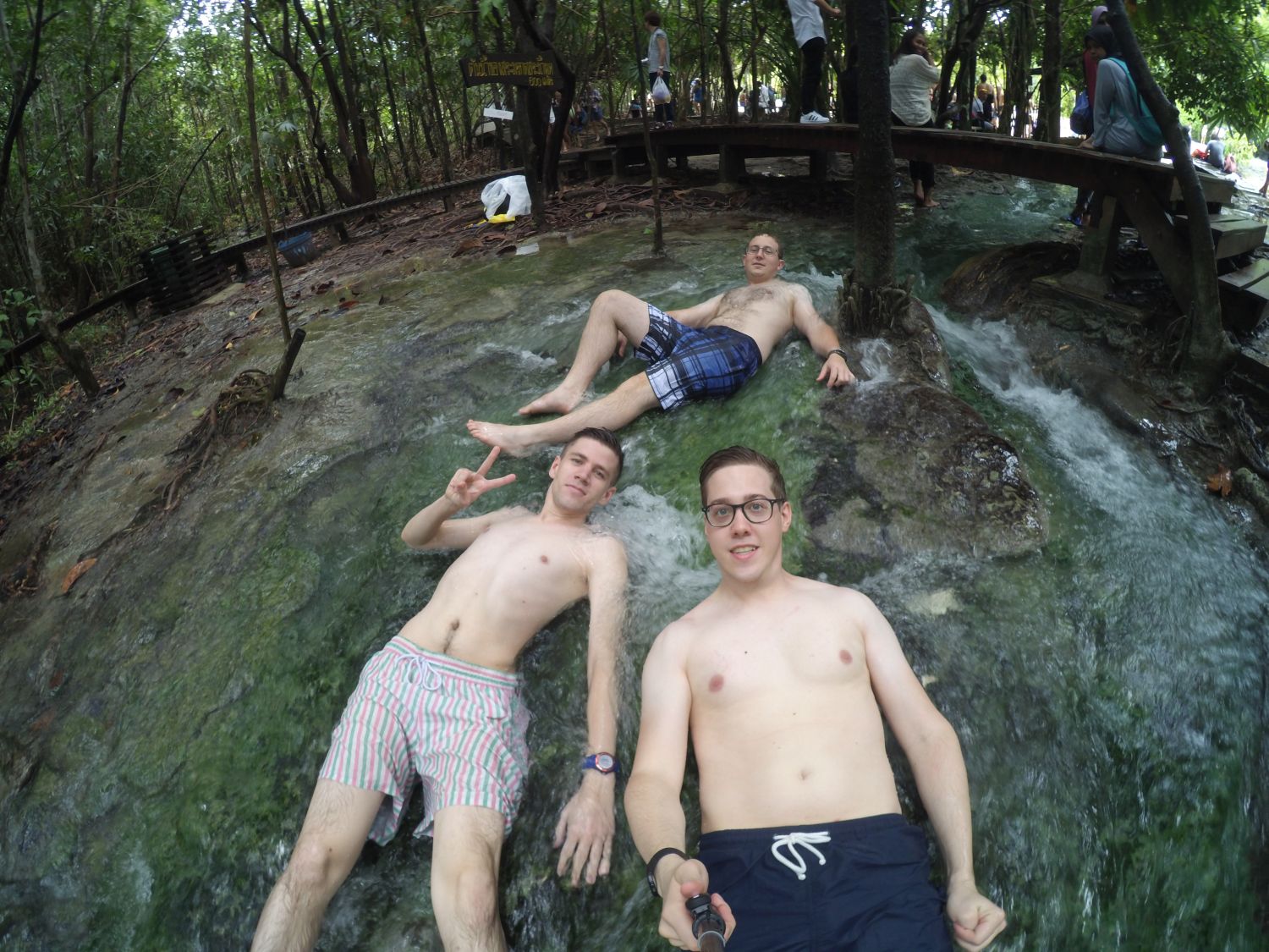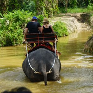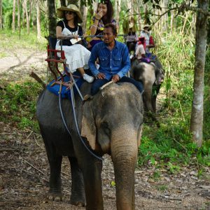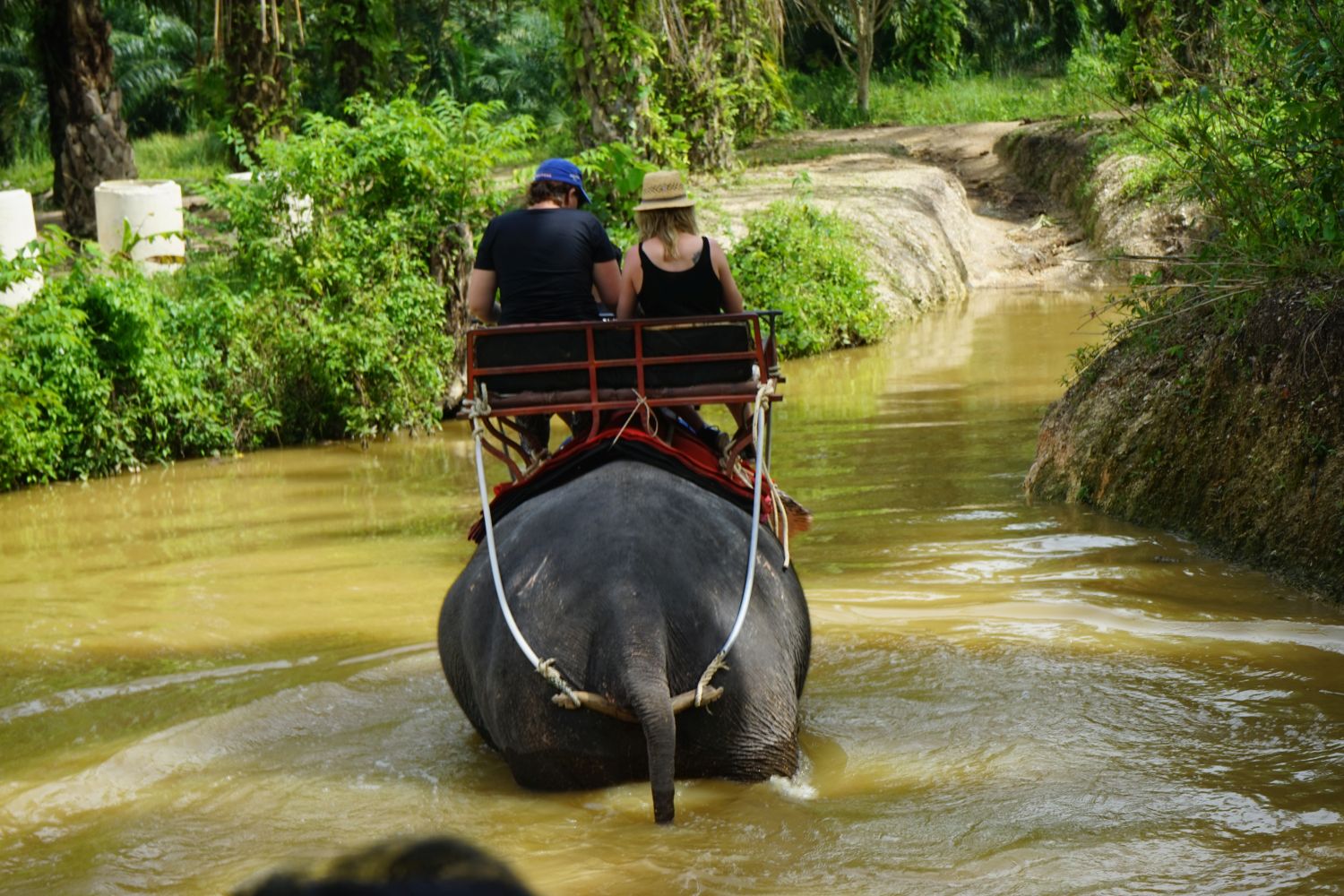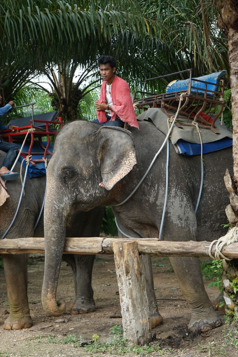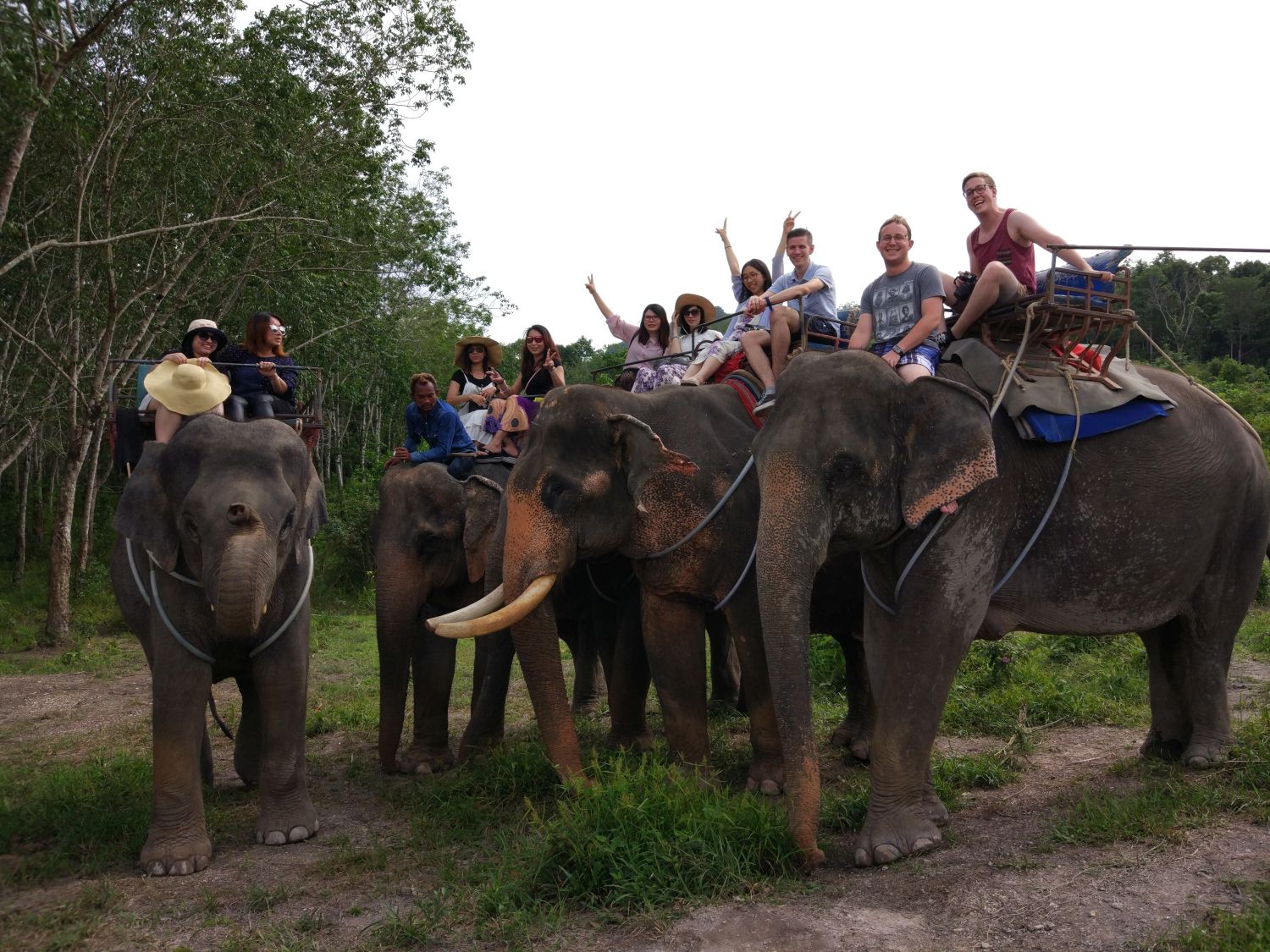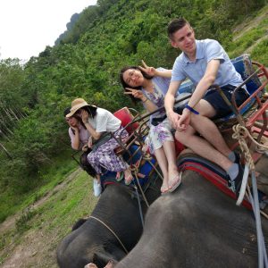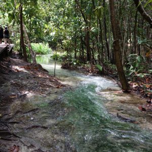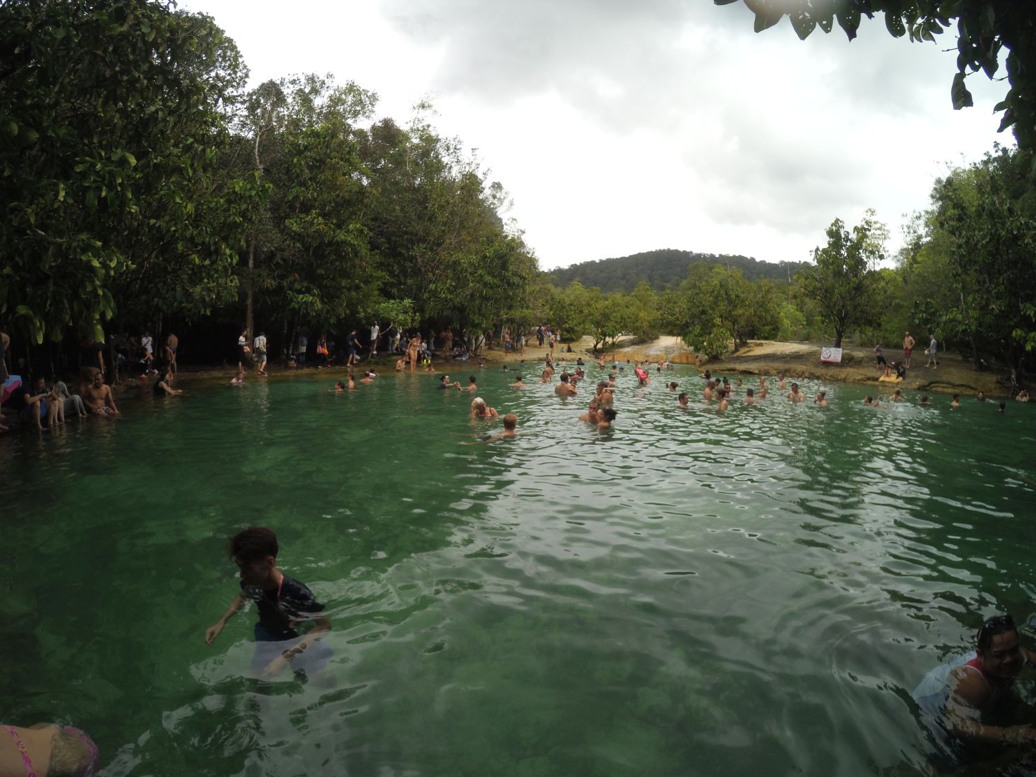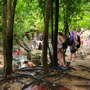 Endlich wieder Regen. Einer verregneten Nacht folgte ein verregneter Morgen, den wir glücklicherweise erst einmal in einem Minivan verbrachten. Wir hatten uns eine Tour mit „Guide“ gebucht, die uns in die Urwälder Thailands führen sollte. Guide bedeutet in diesem Zusammenhang aber nur, dass es eine Person gab, die einem Uhrzeiten in einer Sprache zuschrie, die dem Englischen zumindest ein bisschen ähnelte. Erklärungen zu irgendwas gab es leider keine. Als Erstes ging es zu den heißen Quellen (Namtok Ron) die leider ziemlich überfüllt und aufgrund des Regens alles andere als glasklar waren. Wir hielten uns dort also nicht besonders lange auf und so waren wir schnell wieder in unserem gemütlichen Minivan. Als nächster Stop war der Emerald See (Sa Morakot) geplant. Hier verbrachten wir auch die meiste Zeit. Nach dem ausgiebigen Baden in einem ebenfalls überfüllten Pool, plantschten wir dann noch ein bisschen in einem abseits gelegen Wasserfällchen, wo es deutlich entspannter zuging. Wie bei allen Touren in Südostasien ist der Zeitplan immer sehr straff und so ging es schnell wieder zum Minivan und dann fast direkt – zwei Chinesen aus unserer Reisegruppe waren kurz verschollen-  zum Elephant Trekking. Wie der Name schon andeutet ist das ein Elefantenritt durch den Dschungel. Abgesehen von der Tatsache, dass es sich dabei um massive Tierquälerei handelte, war es aber ganz unterhaltsam, zumal die Guides die ganze Zeit ein paar Chinesinnen aus unserer Reisegruppe veräppelten. Auf dem Rückweg machten wir dann noch einen kurzen Stop bei 7Eleven, dem Laden unseres Vertrauens, wo wir uns mit Proviant eindeckten. Im Hotel angekommen, entspannten wir noch ein bisschen bei ein paar Stückchen Thai-Pizza und traten wir unsere Reise ins Traumland an, um für den folgenden Tag in Topform zu sein. Aber das ist eine andere Geschichte und ein neuer Blogeintrag 😉