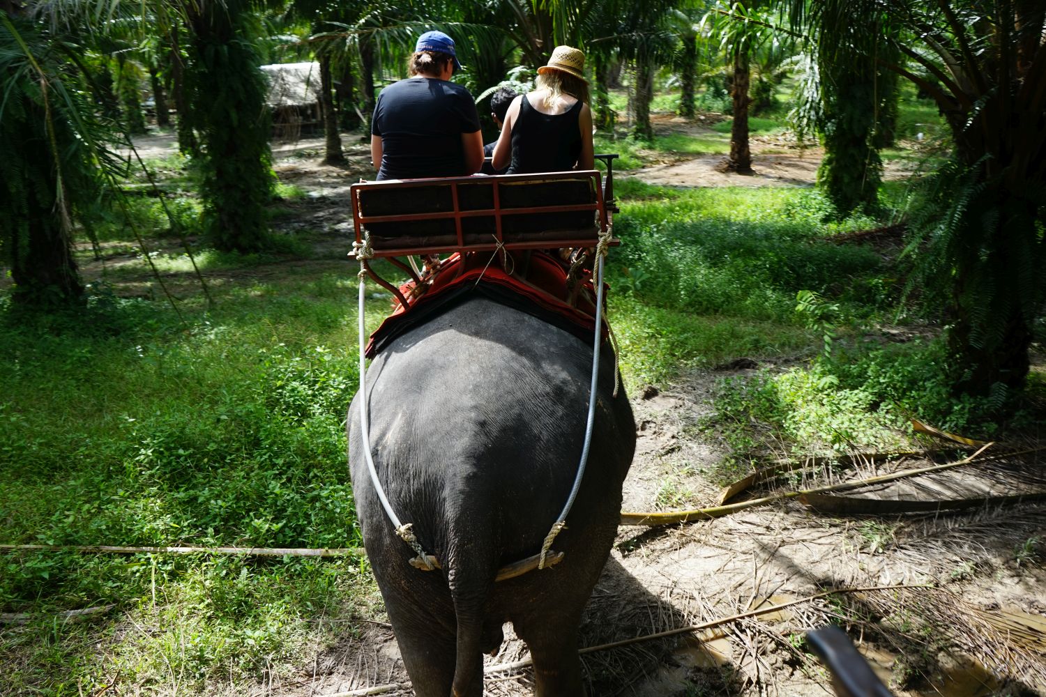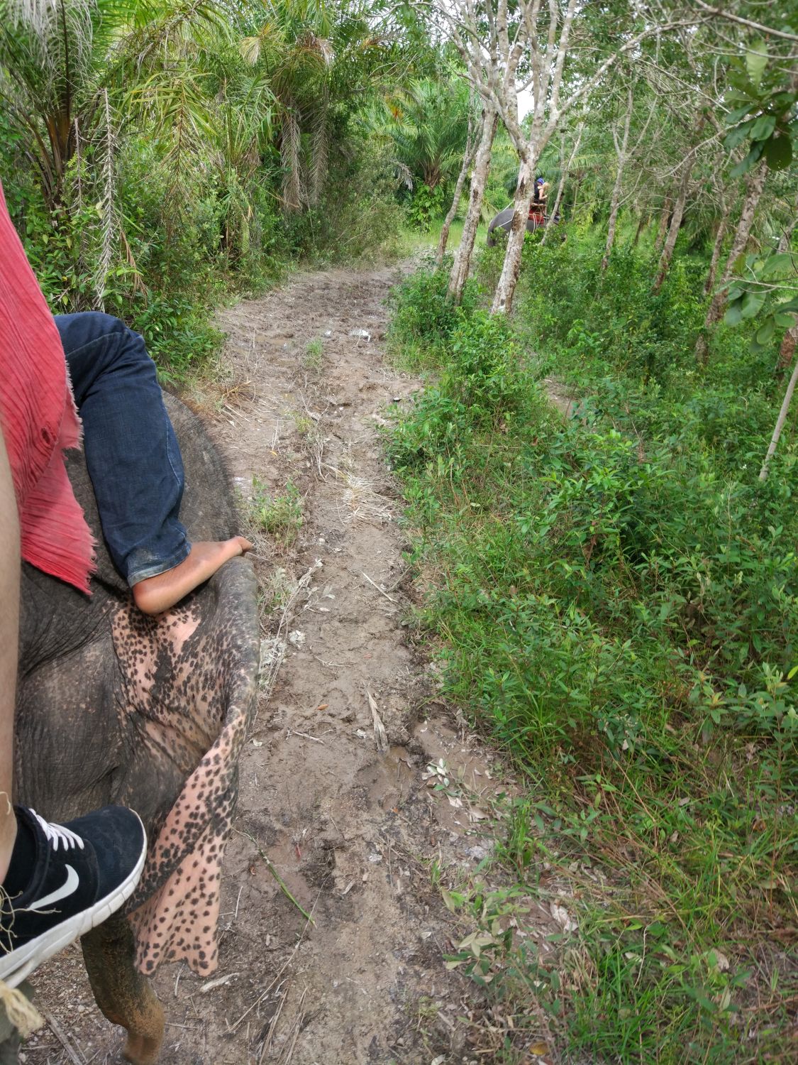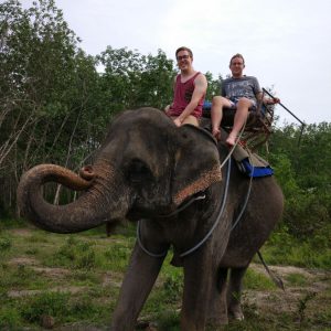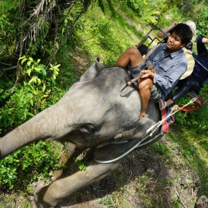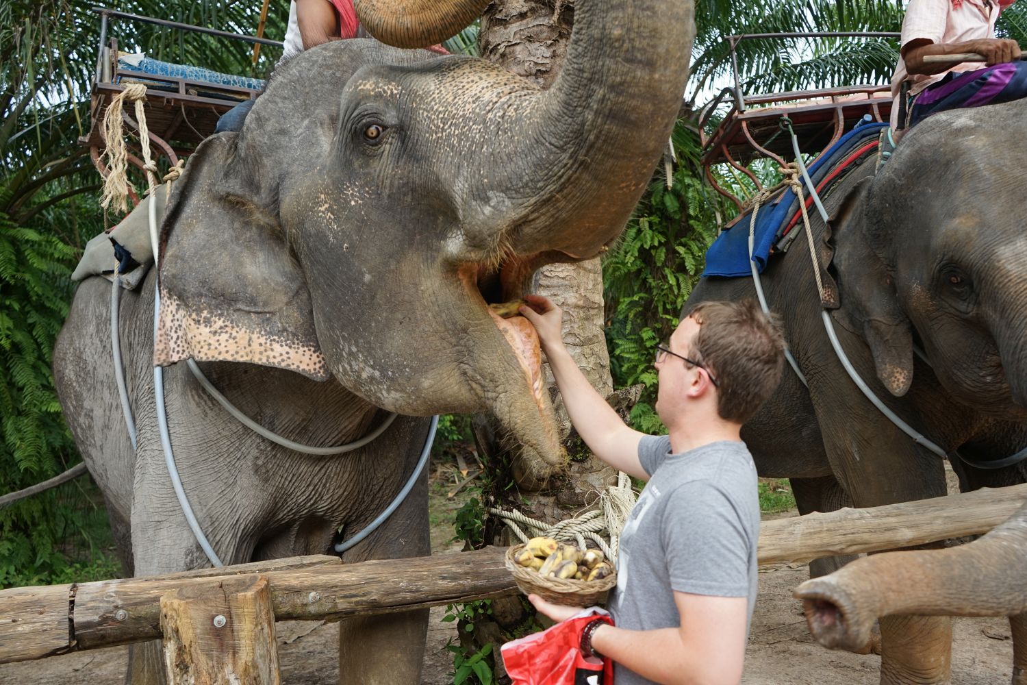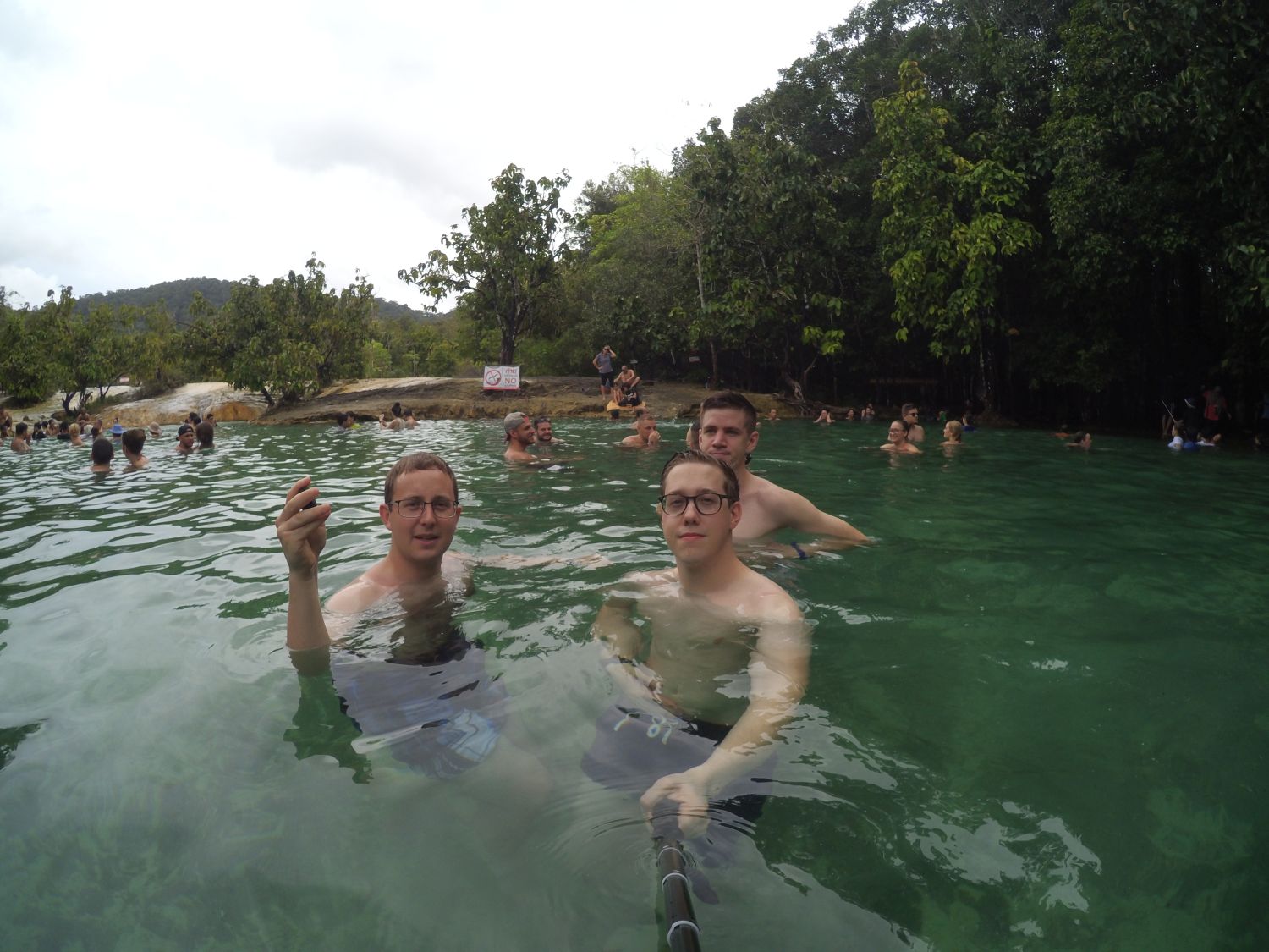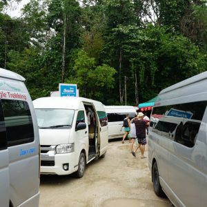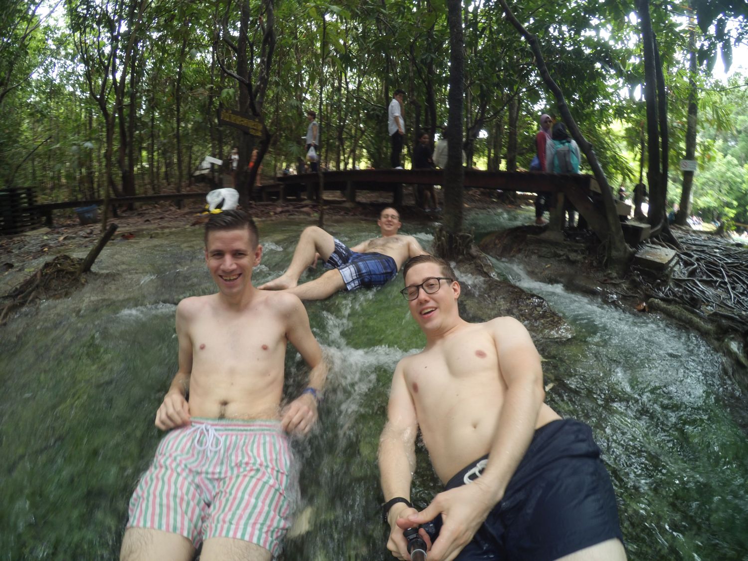 Endlich wieder Regen. Einer verregneten Nacht folgte ein verregneter Morgen, den wir glücklicherweise erst einmal in einem Minivan verbrachten. Wir hatten uns eine Tour mit „Guide“ gebucht, die uns in die Urwälder Thailands führen sollte. Guide bedeutet in diesem Zusammenhang aber nur, dass es eine Person gab, die einem Uhrzeiten in einer Sprache zuschrie, die dem Englischen zumindest ein bisschen ähnelte. Erklärungen zu irgendwas gab es leider keine. Als Erstes ging es zu den heißen Quellen (Namtok Ron) die leider ziemlich überfüllt und aufgrund des Regens alles andere als glasklar waren. Wir hielten uns dort also nicht besonders lange auf und so waren wir schnell wieder in unserem gemütlichen Minivan. Als nächster Stop war der Emerald See (Sa Morakot) geplant. Hier verbrachten wir auch die meiste Zeit. Nach dem ausgiebigen Baden in einem ebenfalls überfüllten Pool, plantschten wir dann noch ein bisschen in einem abseits gelegen Wasserfällchen, wo es deutlich entspannter zuging. Wie bei allen Touren in Südostasien ist der Zeitplan immer sehr straff und so ging es schnell wieder zum Minivan und dann fast direkt – zwei Chinesen aus unserer Reisegruppe waren kurz verschollen-  zum Elephant Trekking. Wie der Name schon andeutet ist das ein Elefantenritt durch den Dschungel. Abgesehen von der Tatsache, dass es sich dabei um massive Tierquälerei handelte, war es aber ganz unterhaltsam, zumal die Guides die ganze Zeit ein paar Chinesinnen aus unserer Reisegruppe veräppelten. Auf dem Rückweg machten wir dann noch einen kurzen Stop bei 7Eleven, dem Laden unseres Vertrauens, wo wir uns mit Proviant eindeckten. Im Hotel angekommen, entspannten wir noch ein bisschen bei ein paar Stückchen Thai-Pizza und traten wir unsere Reise ins Traumland an, um für den folgenden Tag in Topform zu sein. Aber das ist eine andere Geschichte und ein neuer Blogeintrag 😉