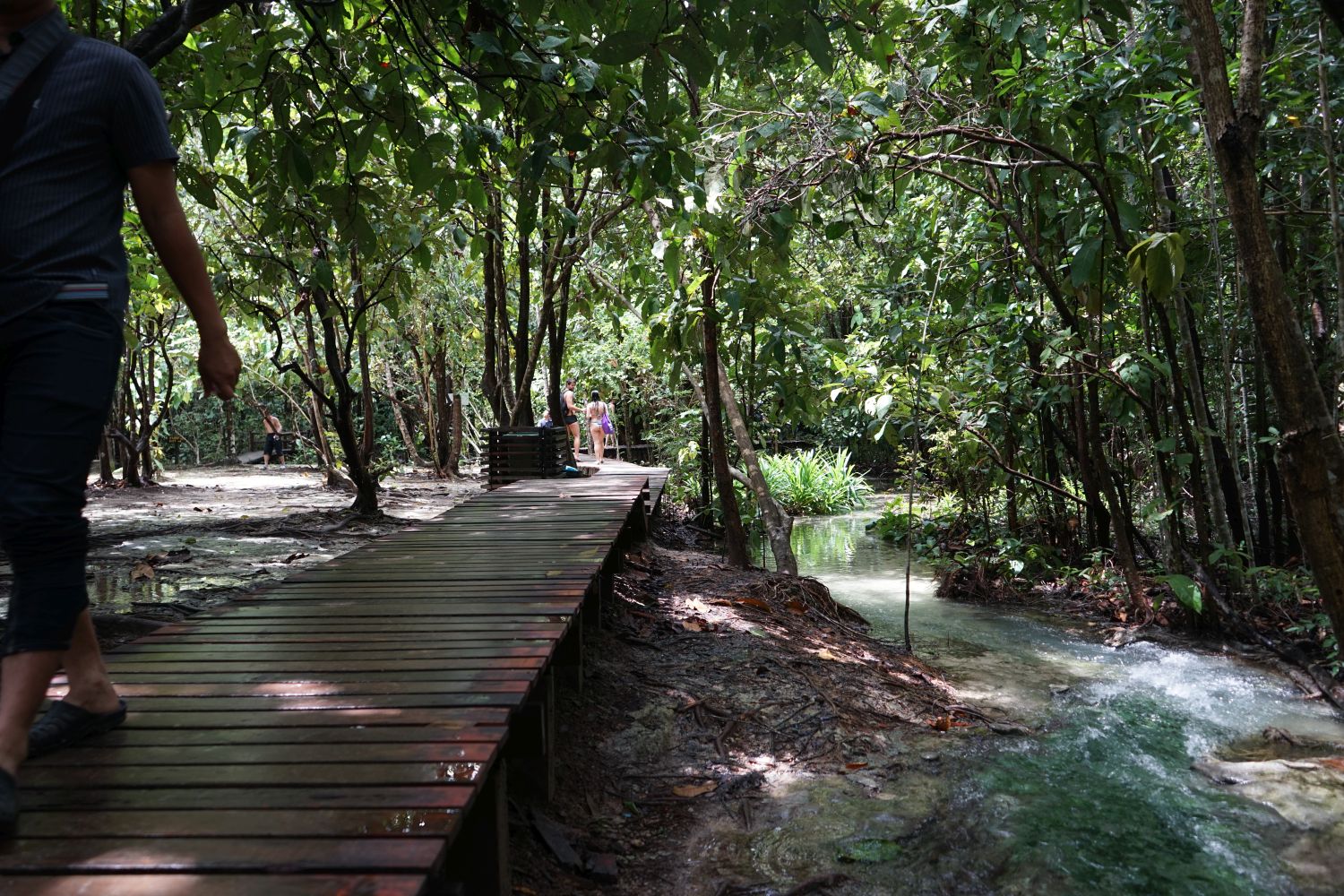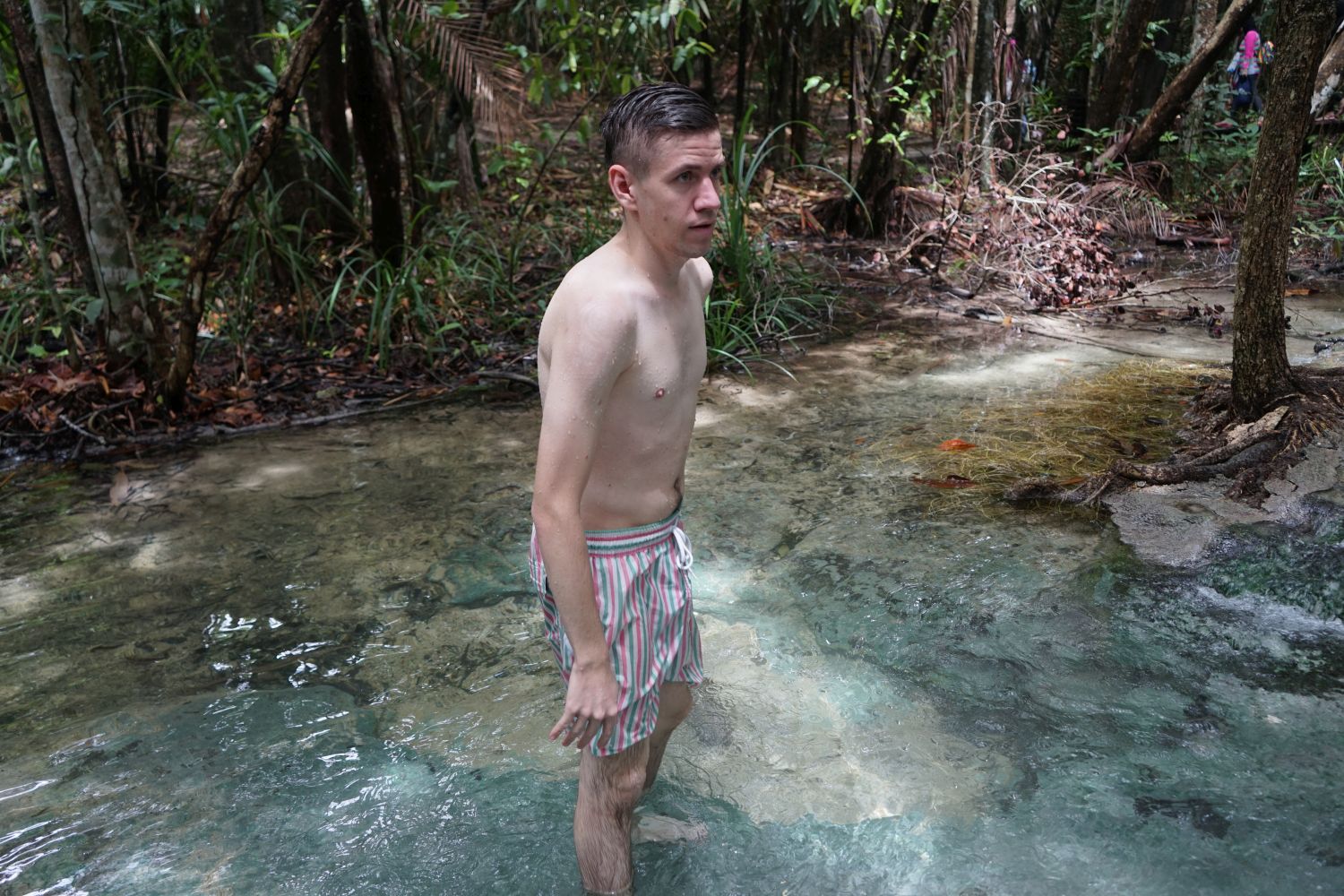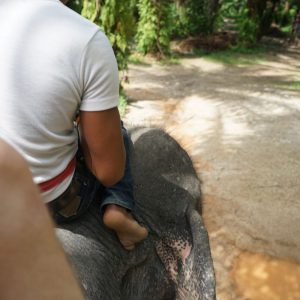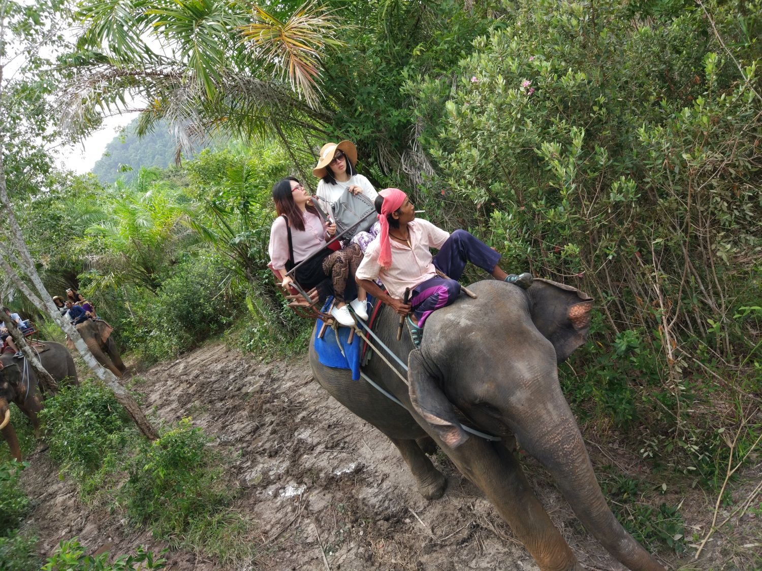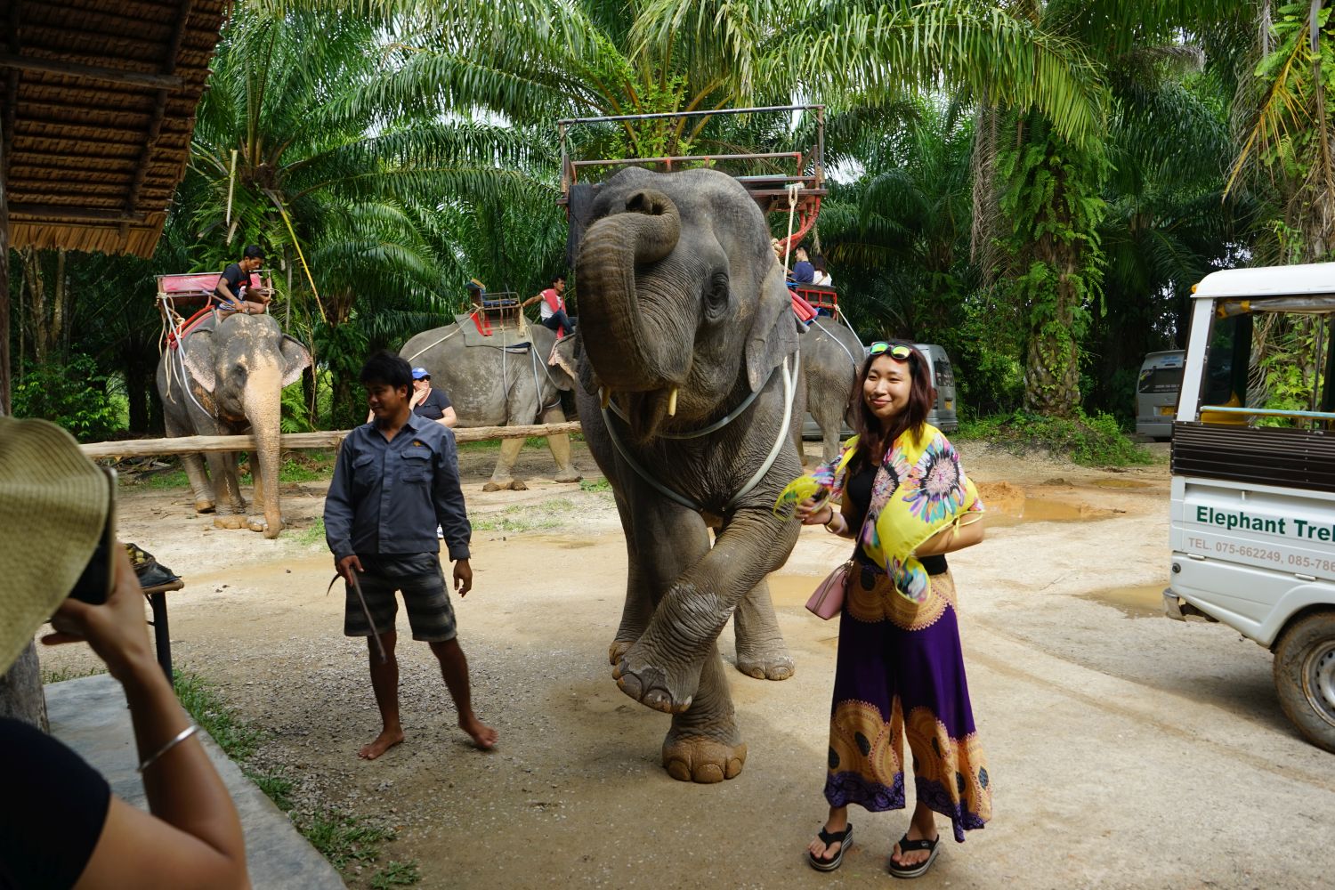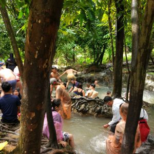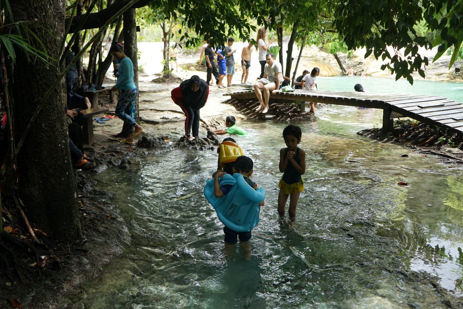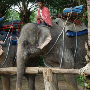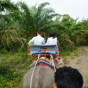 Endlich wieder Regen. Einer verregneten Nacht folgte ein verregneter Morgen, den wir glücklicherweise erst einmal in einem Minivan verbrachten. Wir hatten uns eine Tour mit „Guide“ gebucht, die uns in die Urwälder Thailands führen sollte. Guide bedeutet in diesem Zusammenhang aber nur, dass es eine Person gab, die einem Uhrzeiten in einer Sprache zuschrie, die dem Englischen zumindest ein bisschen ähnelte. Erklärungen zu irgendwas gab es leider keine. Als Erstes ging es zu den heißen Quellen (Namtok Ron) die leider ziemlich überfüllt und aufgrund des Regens alles andere als glasklar waren. Wir hielten uns dort also nicht besonders lange auf und so waren wir schnell wieder in unserem gemütlichen Minivan. Als nächster Stop war der Emerald See (Sa Morakot) geplant. Hier verbrachten wir auch die meiste Zeit. Nach dem ausgiebigen Baden in einem ebenfalls überfüllten Pool, plantschten wir dann noch ein bisschen in einem abseits gelegen Wasserfällchen, wo es deutlich entspannter zuging. Wie bei allen Touren in Südostasien ist der Zeitplan immer sehr straff und so ging es schnell wieder zum Minivan und dann fast direkt – zwei Chinesen aus unserer Reisegruppe waren kurz verschollen-  zum Elephant Trekking. Wie der Name schon andeutet ist das ein Elefantenritt durch den Dschungel. Abgesehen von der Tatsache, dass es sich dabei um massive Tierquälerei handelte, war es aber ganz unterhaltsam, zumal die Guides die ganze Zeit ein paar Chinesinnen aus unserer Reisegruppe veräppelten. Auf dem Rückweg machten wir dann noch einen kurzen Stop bei 7Eleven, dem Laden unseres Vertrauens, wo wir uns mit Proviant eindeckten. Im Hotel angekommen, entspannten wir noch ein bisschen bei ein paar Stückchen Thai-Pizza und traten wir unsere Reise ins Traumland an, um für den folgenden Tag in Topform zu sein. Aber das ist eine andere Geschichte und ein neuer Blogeintrag 😉