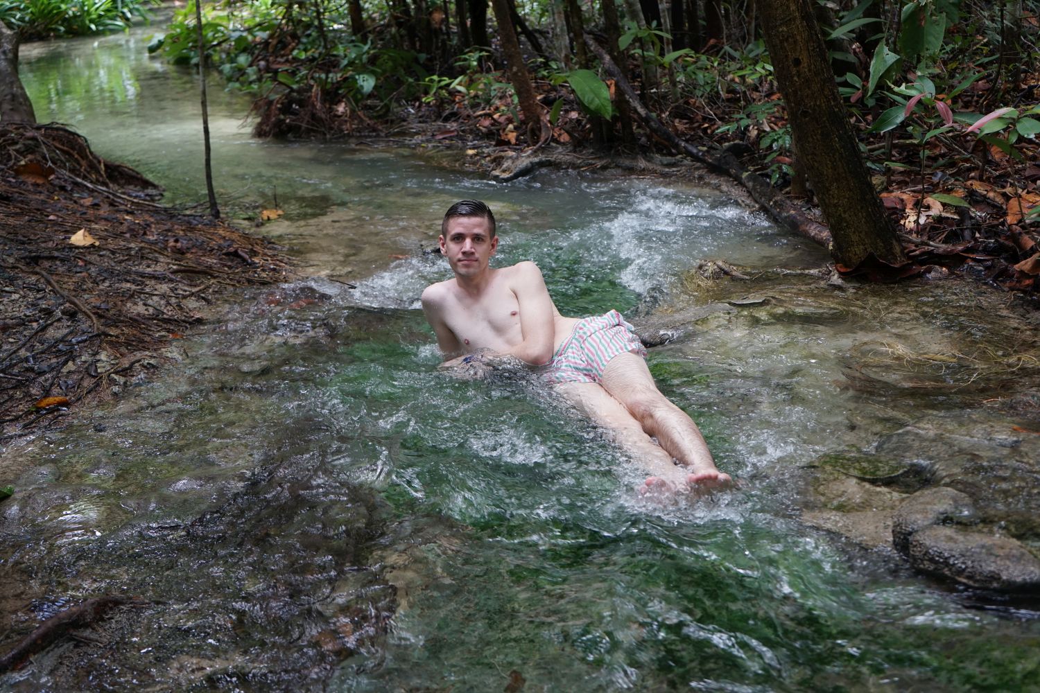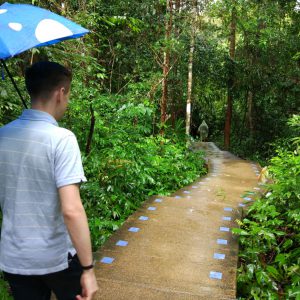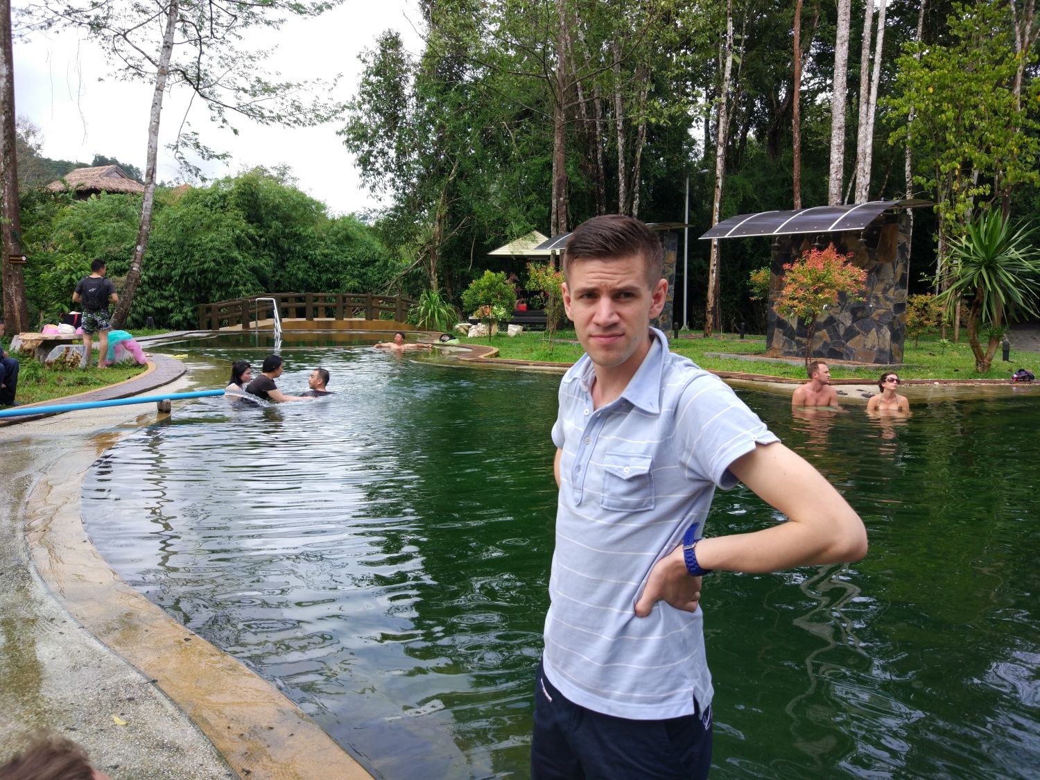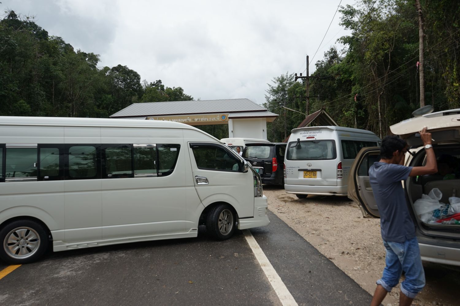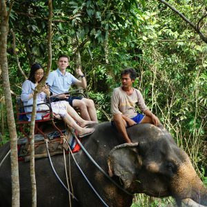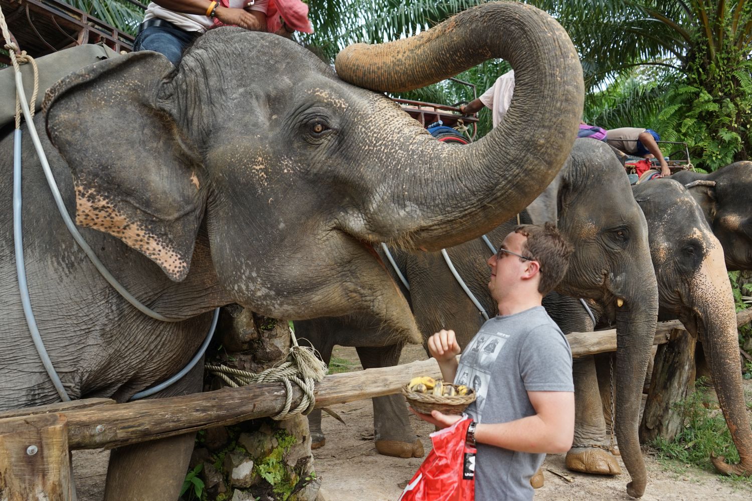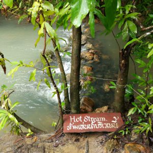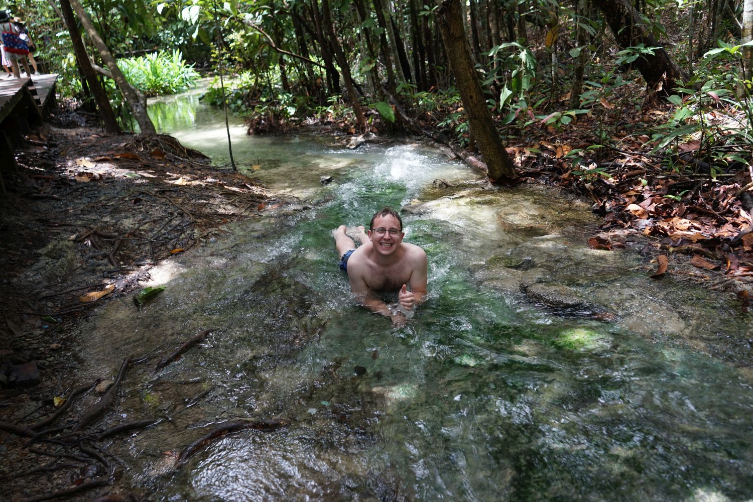 Endlich wieder Regen. Einer verregneten Nacht folgte ein verregneter Morgen, den wir glücklicherweise erst einmal in einem Minivan verbrachten. Wir hatten uns eine Tour mit „Guide“ gebucht, die uns in die Urwälder Thailands führen sollte. Guide bedeutet in diesem Zusammenhang aber nur, dass es eine Person gab, die einem Uhrzeiten in einer Sprache zuschrie, die dem Englischen zumindest ein bisschen ähnelte. Erklärungen zu irgendwas gab es leider keine. Als Erstes ging es zu den heißen Quellen (Namtok Ron) die leider ziemlich überfüllt und aufgrund des Regens alles andere als glasklar waren. Wir hielten uns dort also nicht besonders lange auf und so waren wir schnell wieder in unserem gemütlichen Minivan. Als nächster Stop war der Emerald See (Sa Morakot) geplant. Hier verbrachten wir auch die meiste Zeit. Nach dem ausgiebigen Baden in einem ebenfalls überfüllten Pool, plantschten wir dann noch ein bisschen in einem abseits gelegen Wasserfällchen, wo es deutlich entspannter zuging. Wie bei allen Touren in Südostasien ist der Zeitplan immer sehr straff und so ging es schnell wieder zum Minivan und dann fast direkt – zwei Chinesen aus unserer Reisegruppe waren kurz verschollen-  zum Elephant Trekking. Wie der Name schon andeutet ist das ein Elefantenritt durch den Dschungel. Abgesehen von der Tatsache, dass es sich dabei um massive Tierquälerei handelte, war es aber ganz unterhaltsam, zumal die Guides die ganze Zeit ein paar Chinesinnen aus unserer Reisegruppe veräppelten. Auf dem Rückweg machten wir dann noch einen kurzen Stop bei 7Eleven, dem Laden unseres Vertrauens, wo wir uns mit Proviant eindeckten. Im Hotel angekommen, entspannten wir noch ein bisschen bei ein paar Stückchen Thai-Pizza und traten wir unsere Reise ins Traumland an, um für den folgenden Tag in Topform zu sein. Aber das ist eine andere Geschichte und ein neuer Blogeintrag 😉