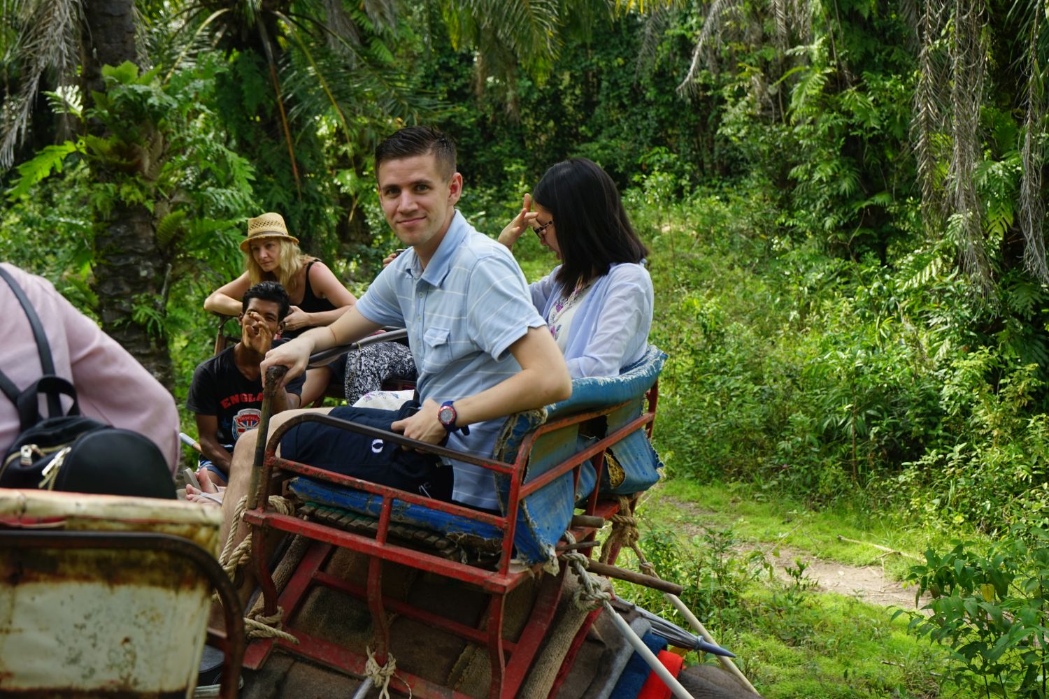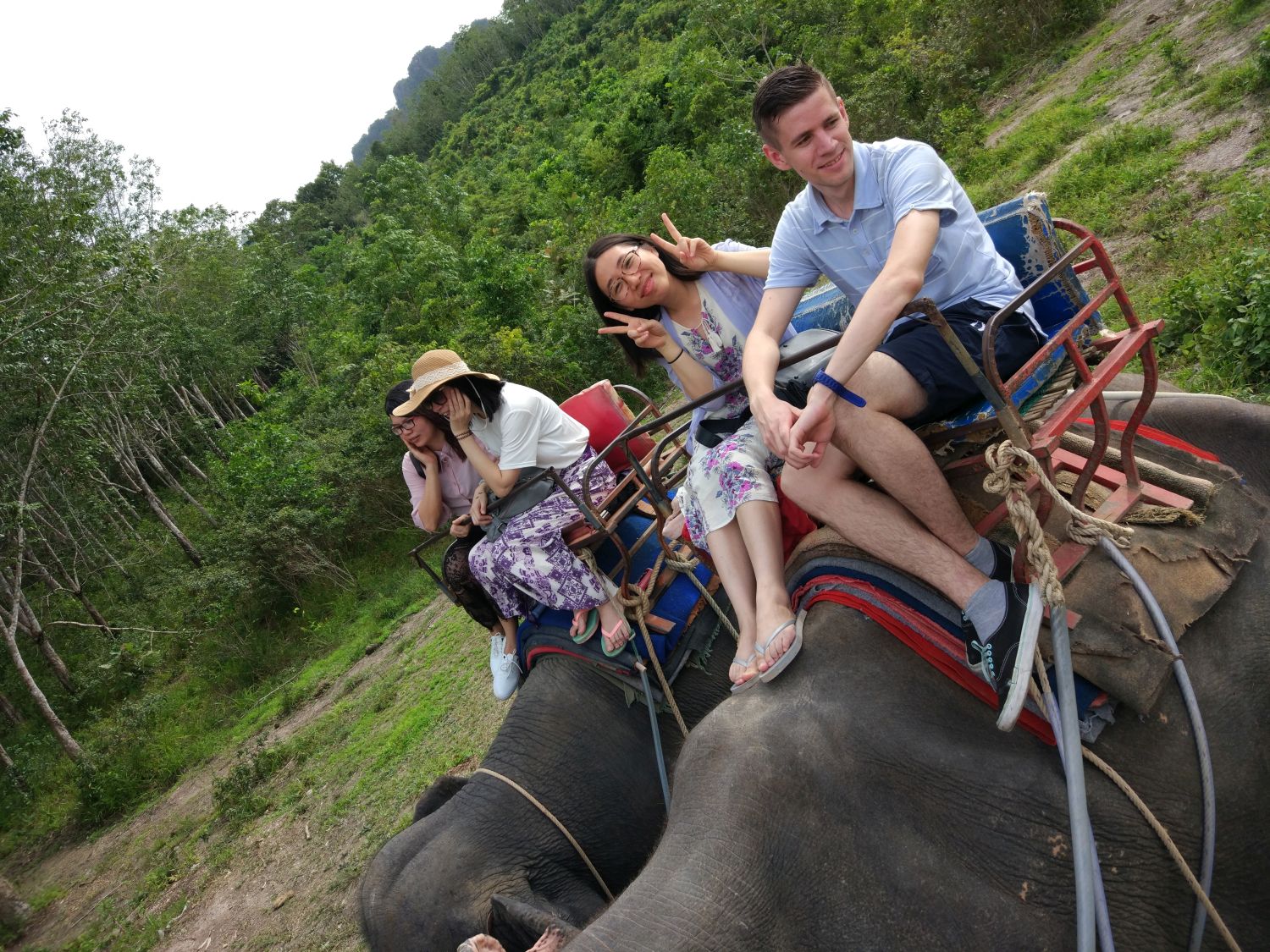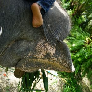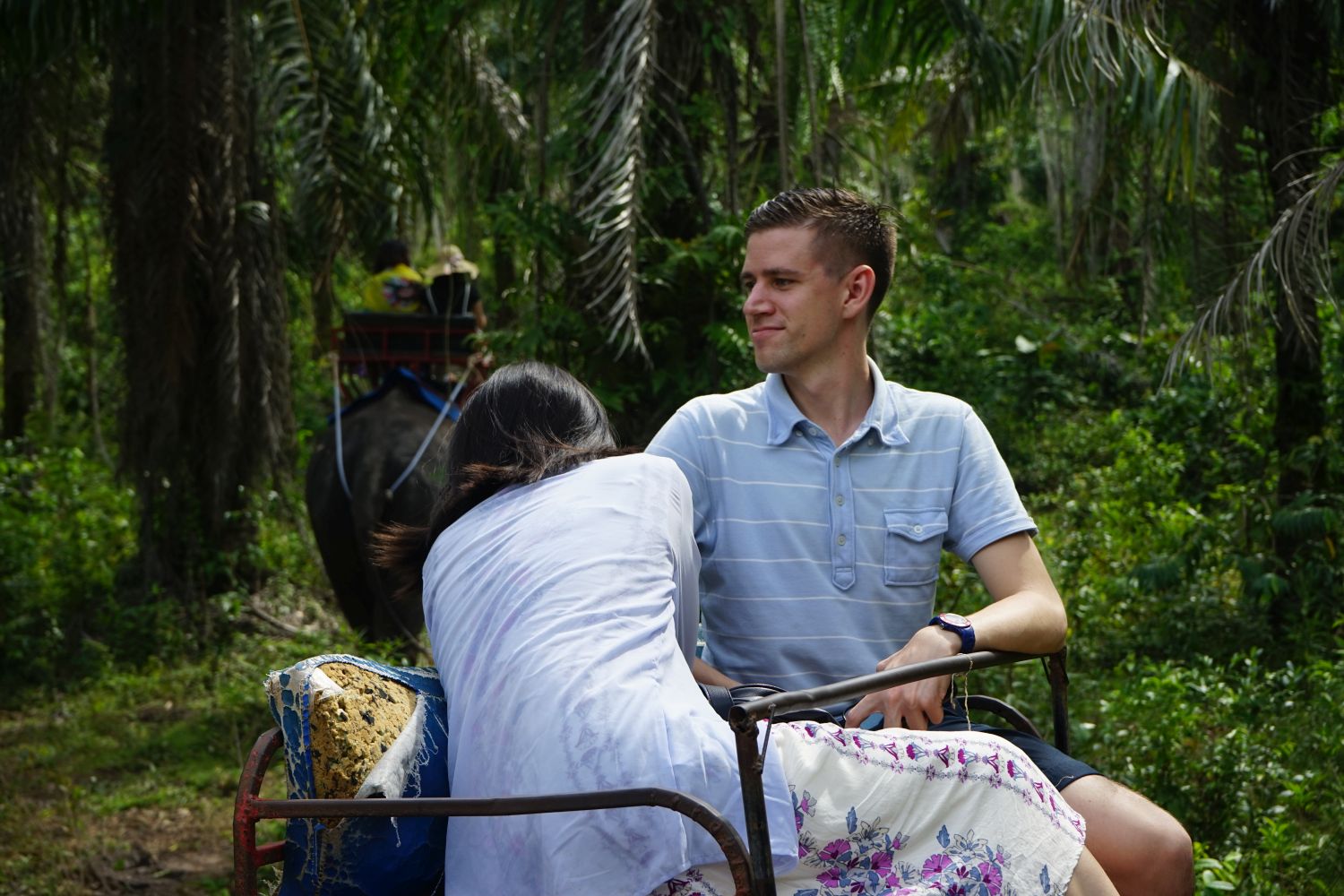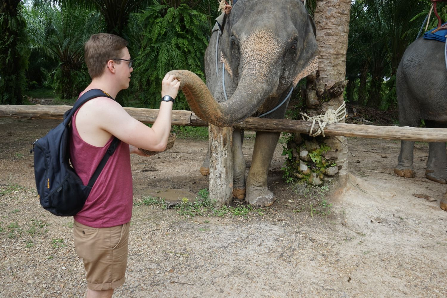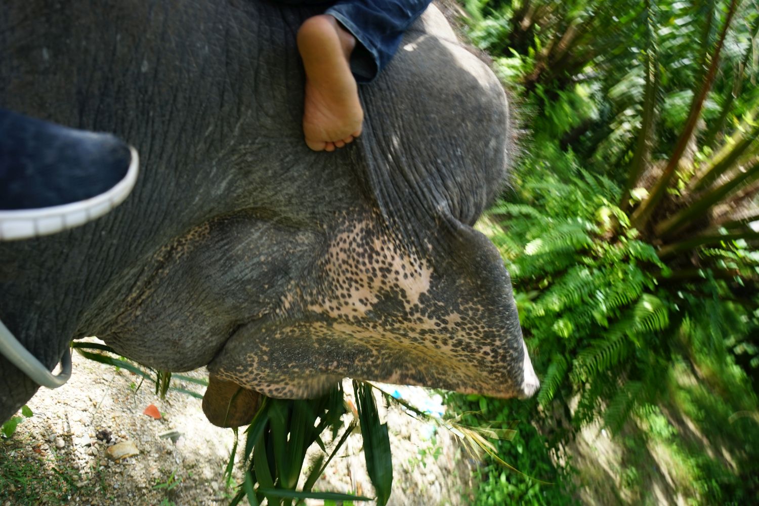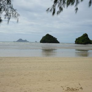 Endlich wieder Regen. Einer verregneten Nacht folgte ein verregneter Morgen, den wir glücklicherweise erst einmal in einem Minivan verbrachten. Wir hatten uns eine Tour mit „Guide“ gebucht, die uns in die Urwälder Thailands führen sollte. Guide bedeutet in diesem Zusammenhang aber nur, dass es eine Person gab, die einem Uhrzeiten in einer Sprache zuschrie, die dem Englischen zumindest ein bisschen ähnelte. Erklärungen zu irgendwas gab es leider keine. Als Erstes ging es zu den heißen Quellen (Namtok Ron) die leider ziemlich überfüllt und aufgrund des Regens alles andere als glasklar waren. Wir hielten uns dort also nicht besonders lange auf und so waren wir schnell wieder in unserem gemütlichen Minivan. Als nächster Stop war der Emerald See (Sa Morakot) geplant. Hier verbrachten wir auch die meiste Zeit. Nach dem ausgiebigen Baden in einem ebenfalls überfüllten Pool, plantschten wir dann noch ein bisschen in einem abseits gelegen Wasserfällchen, wo es deutlich entspannter zuging. Wie bei allen Touren in Südostasien ist der Zeitplan immer sehr straff und so ging es schnell wieder zum Minivan und dann fast direkt – zwei Chinesen aus unserer Reisegruppe waren kurz verschollen-  zum Elephant Trekking. Wie der Name schon andeutet ist das ein Elefantenritt durch den Dschungel. Abgesehen von der Tatsache, dass es sich dabei um massive Tierquälerei handelte, war es aber ganz unterhaltsam, zumal die Guides die ganze Zeit ein paar Chinesinnen aus unserer Reisegruppe veräppelten. Auf dem Rückweg machten wir dann noch einen kurzen Stop bei 7Eleven, dem Laden unseres Vertrauens, wo wir uns mit Proviant eindeckten. Im Hotel angekommen, entspannten wir noch ein bisschen bei ein paar Stückchen Thai-Pizza und traten wir unsere Reise ins Traumland an, um für den folgenden Tag in Topform zu sein. Aber das ist eine andere Geschichte und ein neuer Blogeintrag 😉