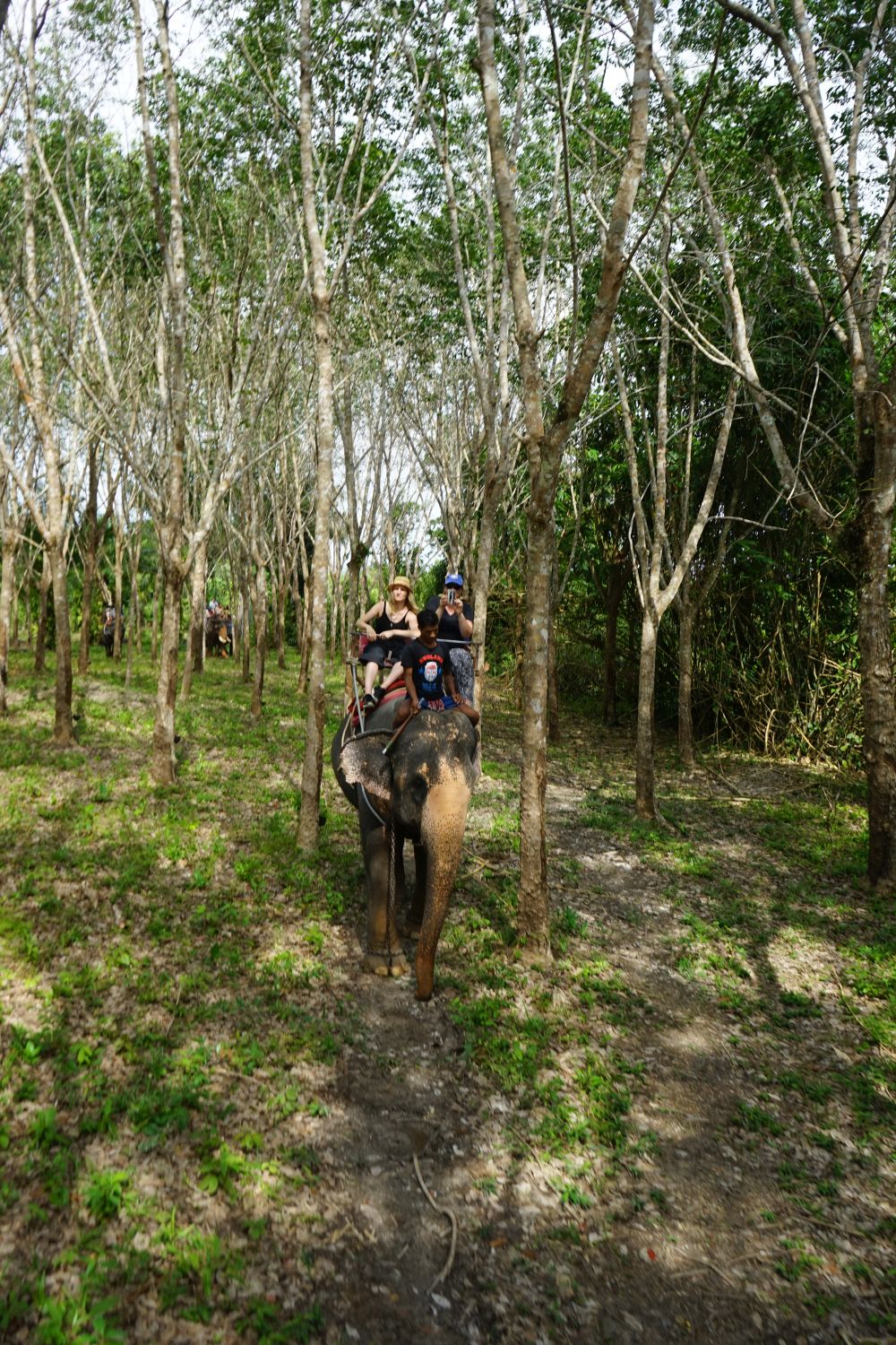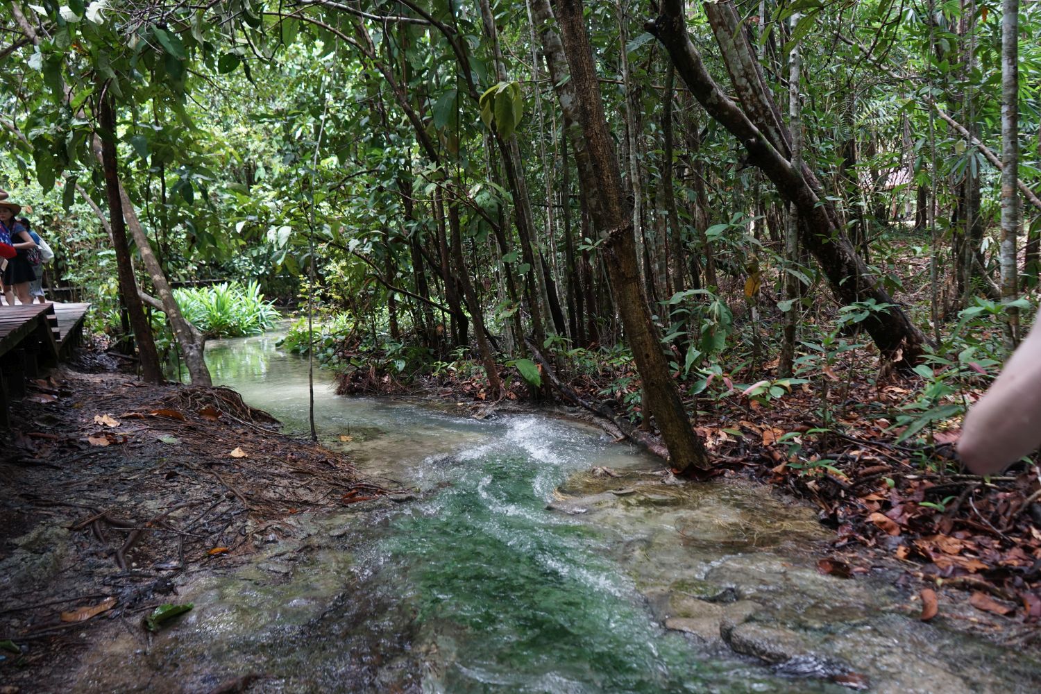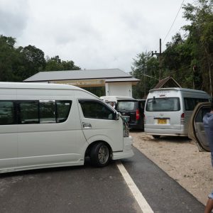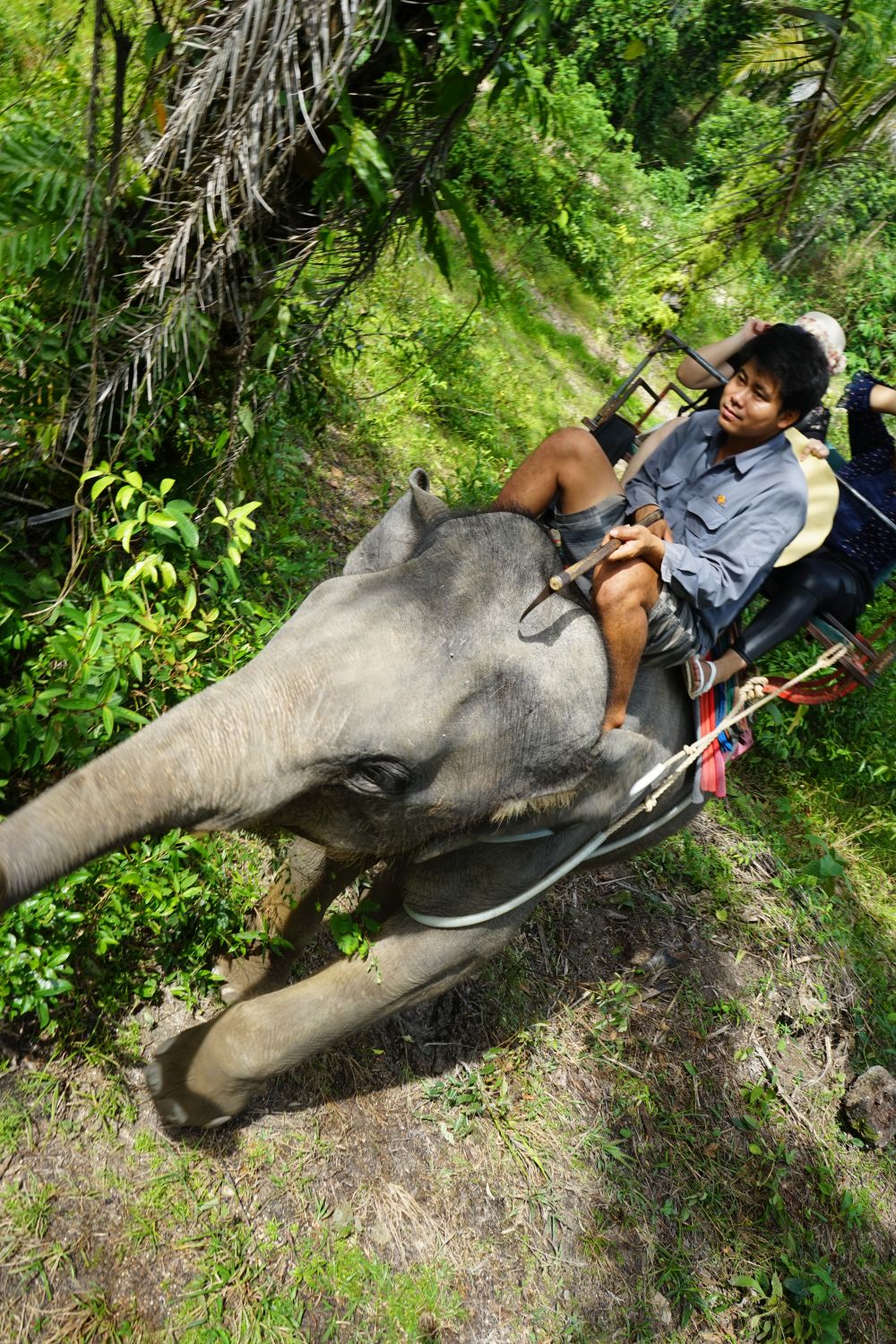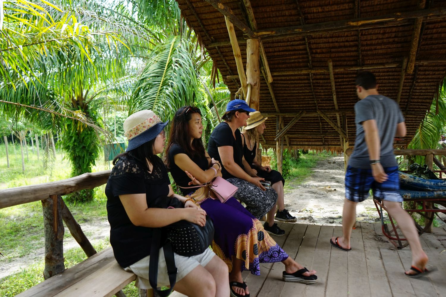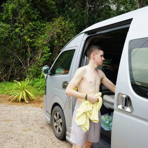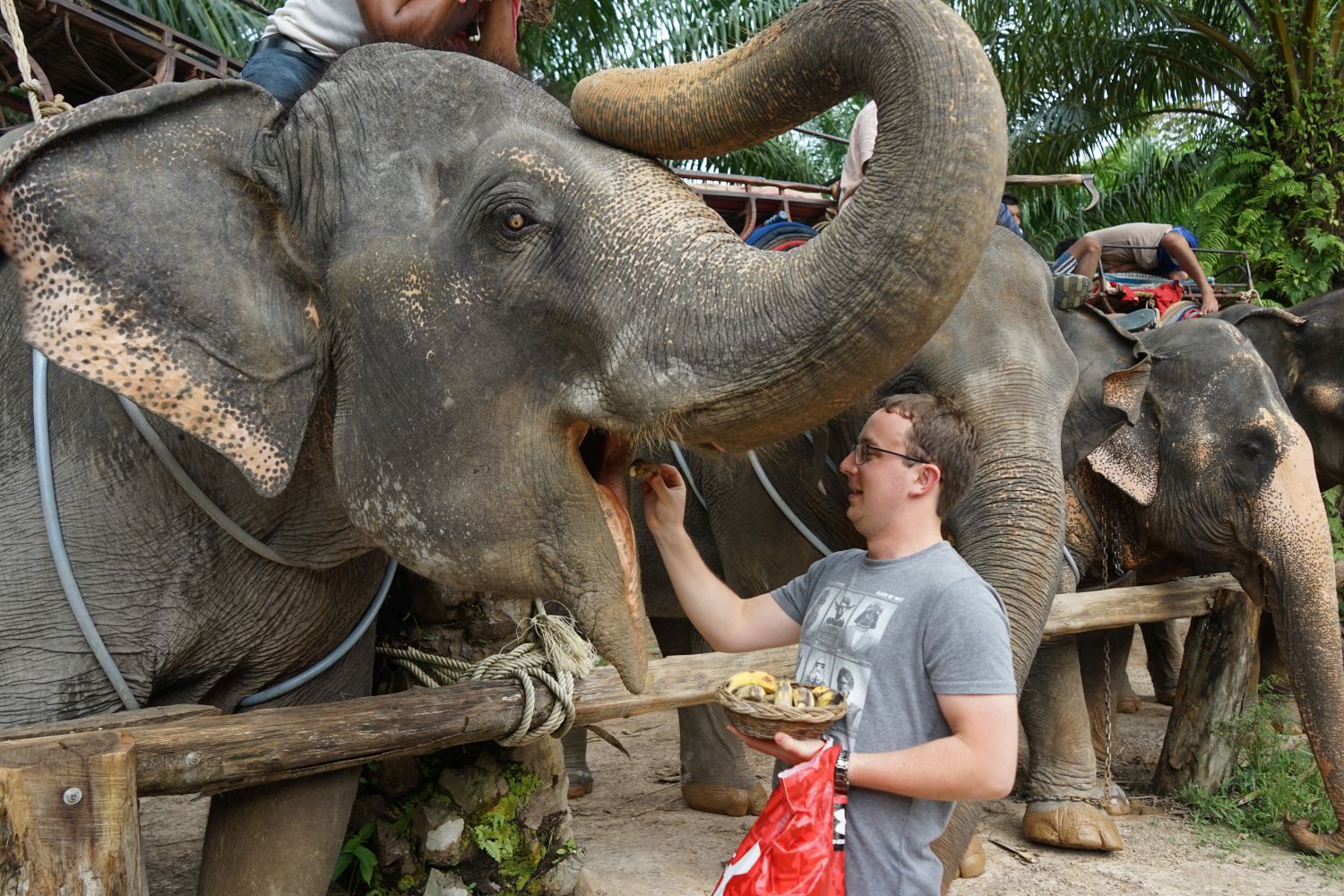 Endlich wieder Regen. Einer verregneten Nacht folgte ein verregneter Morgen, den wir glücklicherweise erst einmal in einem Minivan verbrachten. Wir hatten uns eine Tour mit „Guide“ gebucht, die uns in die Urwälder Thailands führen sollte. Guide bedeutet in diesem Zusammenhang aber nur, dass es eine Person gab, die einem Uhrzeiten in einer Sprache zuschrie, die dem Englischen zumindest ein bisschen ähnelte. Erklärungen zu irgendwas gab es leider keine. Als Erstes ging es zu den heißen Quellen (Namtok Ron) die leider ziemlich überfüllt und aufgrund des Regens alles andere als glasklar waren. Wir hielten uns dort also nicht besonders lange auf und so waren wir schnell wieder in unserem gemütlichen Minivan. Als nächster Stop war der Emerald See (Sa Morakot) geplant. Hier verbrachten wir auch die meiste Zeit. Nach dem ausgiebigen Baden in einem ebenfalls überfüllten Pool, plantschten wir dann noch ein bisschen in einem abseits gelegen Wasserfällchen, wo es deutlich entspannter zuging. Wie bei allen Touren in Südostasien ist der Zeitplan immer sehr straff und so ging es schnell wieder zum Minivan und dann fast direkt – zwei Chinesen aus unserer Reisegruppe waren kurz verschollen-  zum Elephant Trekking. Wie der Name schon andeutet ist das ein Elefantenritt durch den Dschungel. Abgesehen von der Tatsache, dass es sich dabei um massive Tierquälerei handelte, war es aber ganz unterhaltsam, zumal die Guides die ganze Zeit ein paar Chinesinnen aus unserer Reisegruppe veräppelten. Auf dem Rückweg machten wir dann noch einen kurzen Stop bei 7Eleven, dem Laden unseres Vertrauens, wo wir uns mit Proviant eindeckten. Im Hotel angekommen, entspannten wir noch ein bisschen bei ein paar Stückchen Thai-Pizza und traten wir unsere Reise ins Traumland an, um für den folgenden Tag in Topform zu sein. Aber das ist eine andere Geschichte und ein neuer Blogeintrag 😉