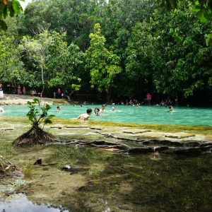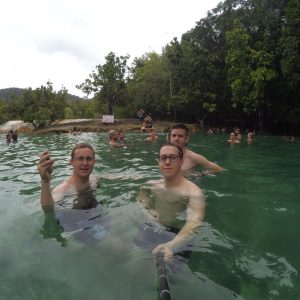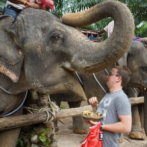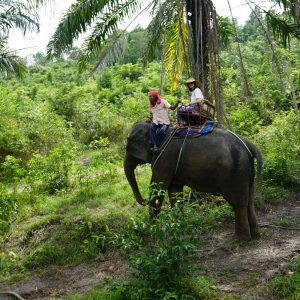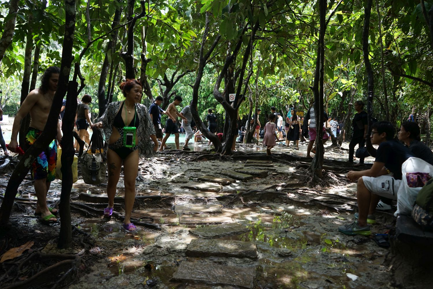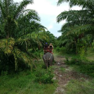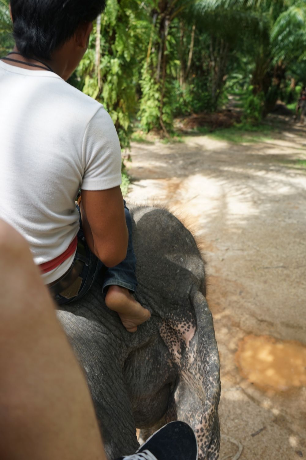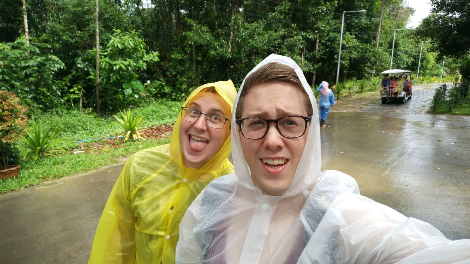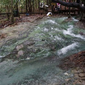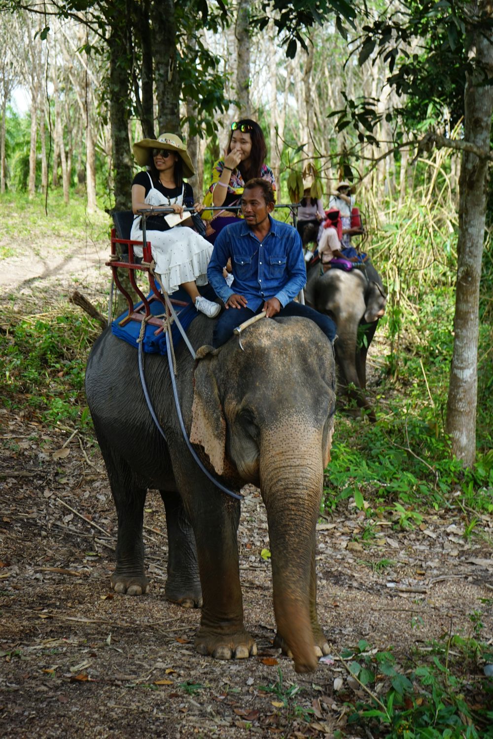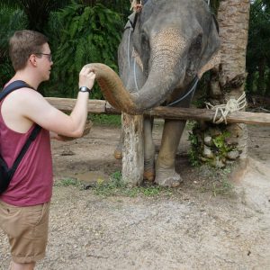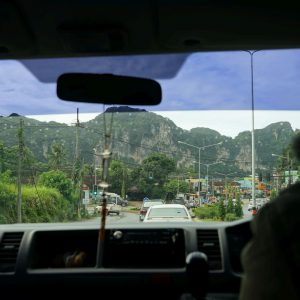 Endlich wieder Regen. Einer verregneten Nacht folgte ein verregneter Morgen, den wir glücklicherweise erst einmal in einem Minivan verbrachten. Wir hatten uns eine Tour mit „Guide“ gebucht, die uns in die Urwälder Thailands führen sollte. Guide bedeutet in diesem Zusammenhang aber nur, dass es eine Person gab, die einem Uhrzeiten in einer Sprache zuschrie, die dem Englischen zumindest ein bisschen ähnelte. Erklärungen zu irgendwas gab es leider keine. Als Erstes ging es zu den heißen Quellen (Namtok Ron) die leider ziemlich überfüllt und aufgrund des Regens alles andere als glasklar waren. Wir hielten uns dort also nicht besonders lange auf und so waren wir schnell wieder in unserem gemütlichen Minivan. Als nächster Stop war der Emerald See (Sa Morakot) geplant. Hier verbrachten wir auch die meiste Zeit. Nach dem ausgiebigen Baden in einem ebenfalls überfüllten Pool, plantschten wir dann noch ein bisschen in einem abseits gelegen Wasserfällchen, wo es deutlich entspannter zuging. Wie bei allen Touren in Südostasien ist der Zeitplan immer sehr straff und so ging es schnell wieder zum Minivan und dann fast direkt – zwei Chinesen aus unserer Reisegruppe waren kurz verschollen-  zum Elephant Trekking. Wie der Name schon andeutet ist das ein Elefantenritt durch den Dschungel. Abgesehen von der Tatsache, dass es sich dabei um massive Tierquälerei handelte, war es aber ganz unterhaltsam, zumal die Guides die ganze Zeit ein paar Chinesinnen aus unserer Reisegruppe veräppelten. Auf dem Rückweg machten wir dann noch einen kurzen Stop bei 7Eleven, dem Laden unseres Vertrauens, wo wir uns mit Proviant eindeckten. Im Hotel angekommen, entspannten wir noch ein bisschen bei ein paar Stückchen Thai-Pizza und traten wir unsere Reise ins Traumland an, um für den folgenden Tag in Topform zu sein. Aber das ist eine andere Geschichte und ein neuer Blogeintrag 😉