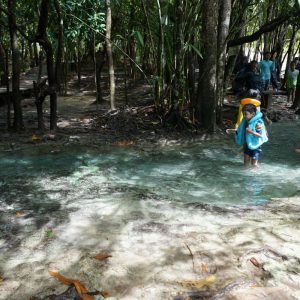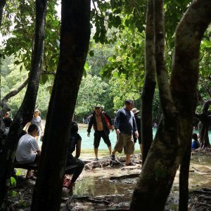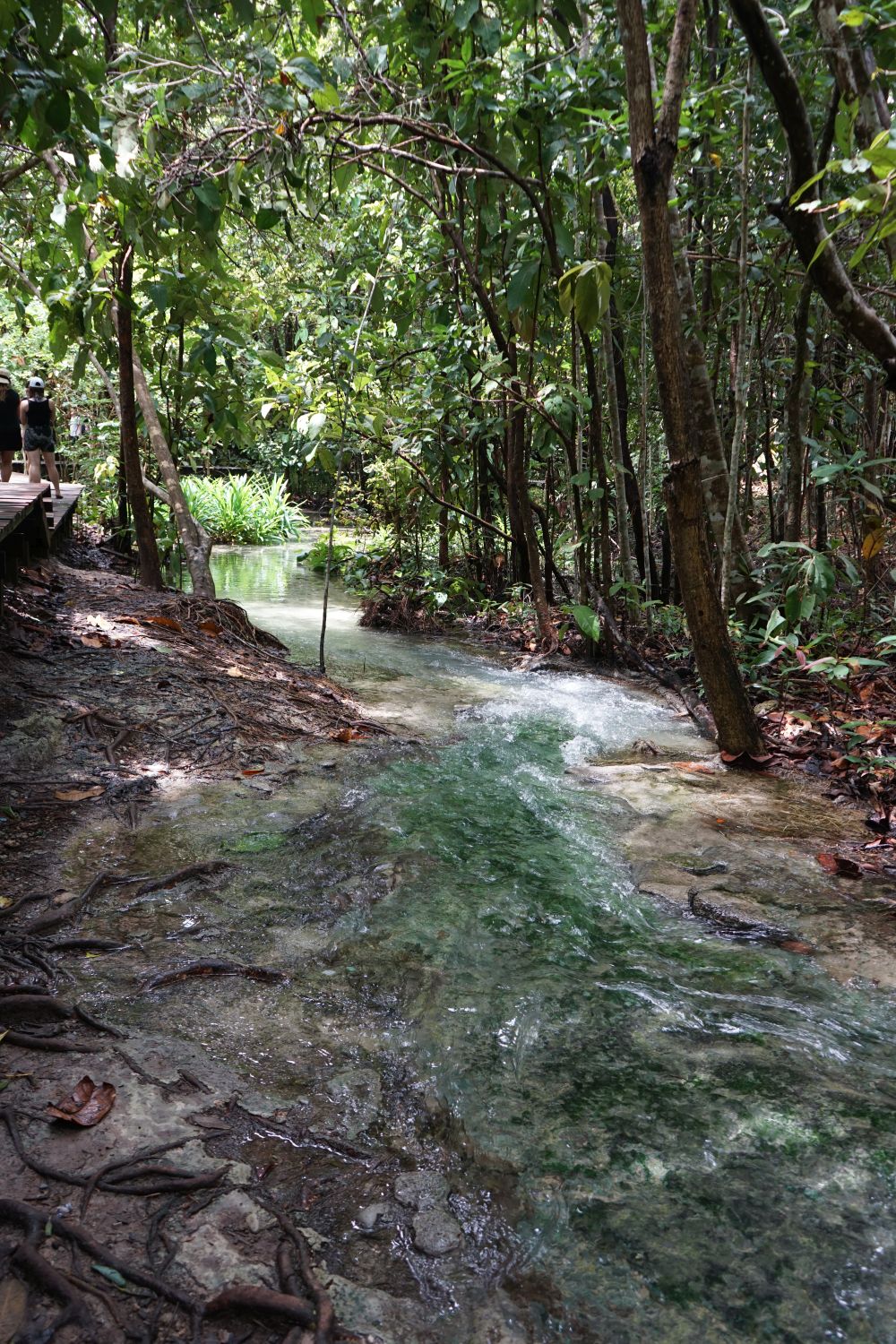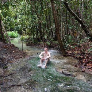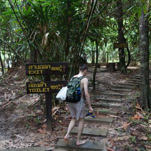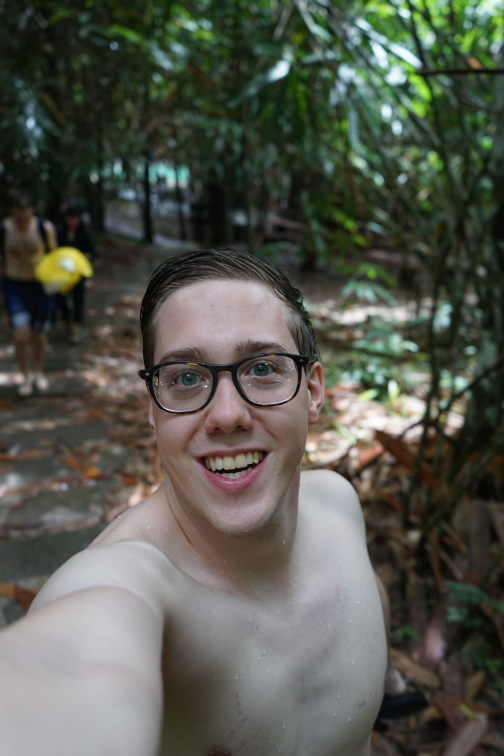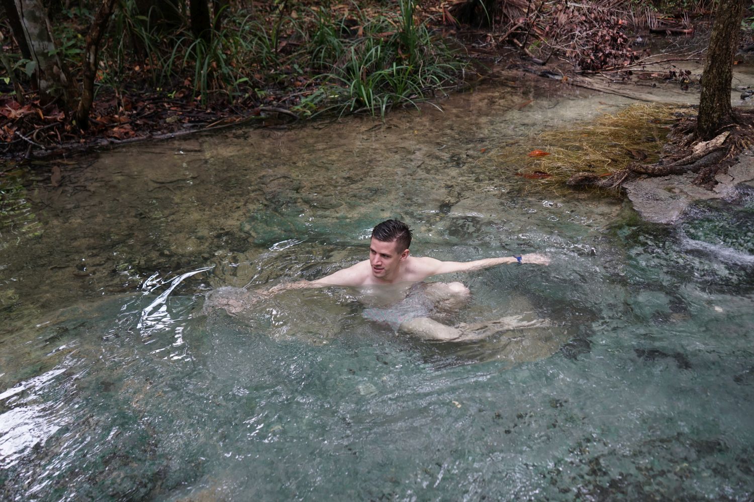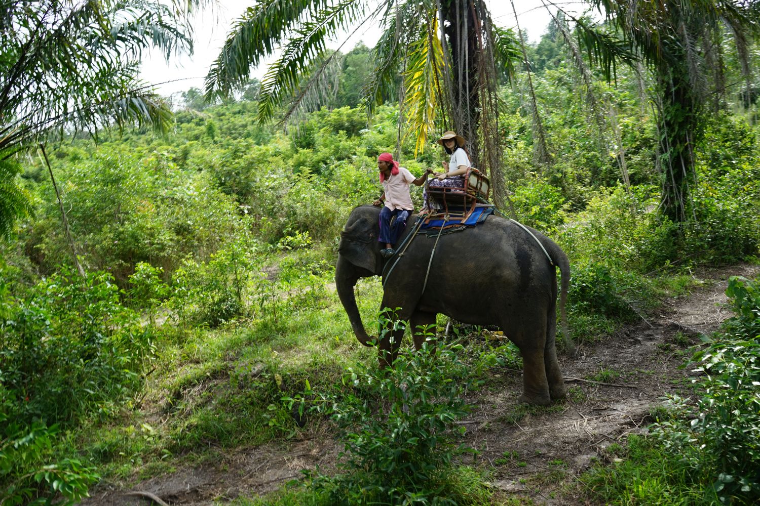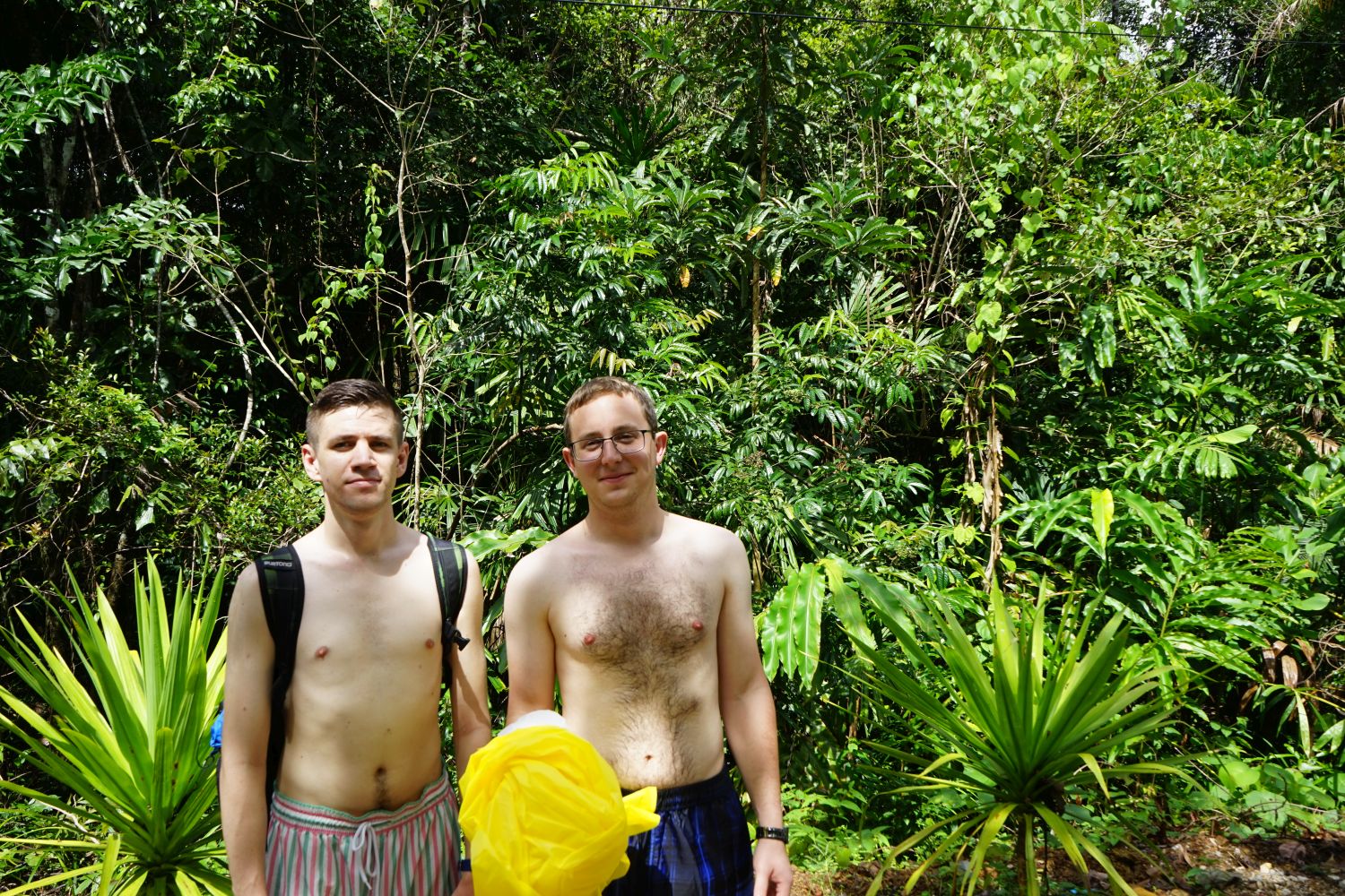 Endlich wieder Regen. Einer verregneten Nacht folgte ein verregneter Morgen, den wir glücklicherweise erst einmal in einem Minivan verbrachten. Wir hatten uns eine Tour mit „Guide“ gebucht, die uns in die Urwälder Thailands führen sollte. Guide bedeutet in diesem Zusammenhang aber nur, dass es eine Person gab, die einem Uhrzeiten in einer Sprache zuschrie, die dem Englischen zumindest ein bisschen ähnelte. Erklärungen zu irgendwas gab es leider keine. Als Erstes ging es zu den heißen Quellen (Namtok Ron) die leider ziemlich überfüllt und aufgrund des Regens alles andere als glasklar waren. Wir hielten uns dort also nicht besonders lange auf und so waren wir schnell wieder in unserem gemütlichen Minivan. Als nächster Stop war der Emerald See (Sa Morakot) geplant. Hier verbrachten wir auch die meiste Zeit. Nach dem ausgiebigen Baden in einem ebenfalls überfüllten Pool, plantschten wir dann noch ein bisschen in einem abseits gelegen Wasserfällchen, wo es deutlich entspannter zuging. Wie bei allen Touren in Südostasien ist der Zeitplan immer sehr straff und so ging es schnell wieder zum Minivan und dann fast direkt – zwei Chinesen aus unserer Reisegruppe waren kurz verschollen-  zum Elephant Trekking. Wie der Name schon andeutet ist das ein Elefantenritt durch den Dschungel. Abgesehen von der Tatsache, dass es sich dabei um massive Tierquälerei handelte, war es aber ganz unterhaltsam, zumal die Guides die ganze Zeit ein paar Chinesinnen aus unserer Reisegruppe veräppelten. Auf dem Rückweg machten wir dann noch einen kurzen Stop bei 7Eleven, dem Laden unseres Vertrauens, wo wir uns mit Proviant eindeckten. Im Hotel angekommen, entspannten wir noch ein bisschen bei ein paar Stückchen Thai-Pizza und traten wir unsere Reise ins Traumland an, um für den folgenden Tag in Topform zu sein. Aber das ist eine andere Geschichte und ein neuer Blogeintrag 😉