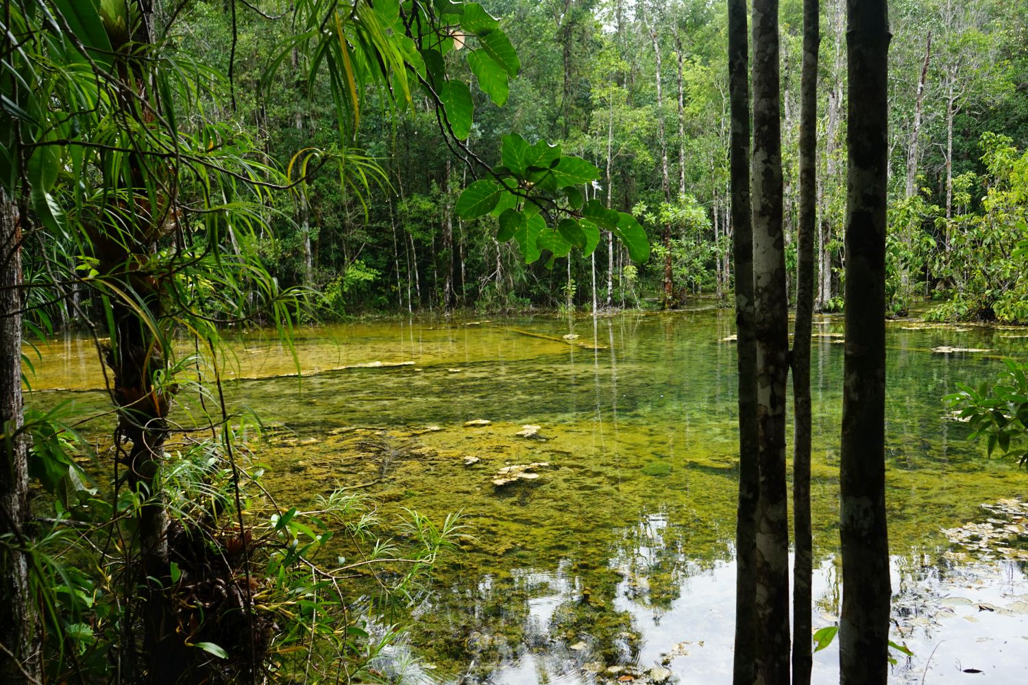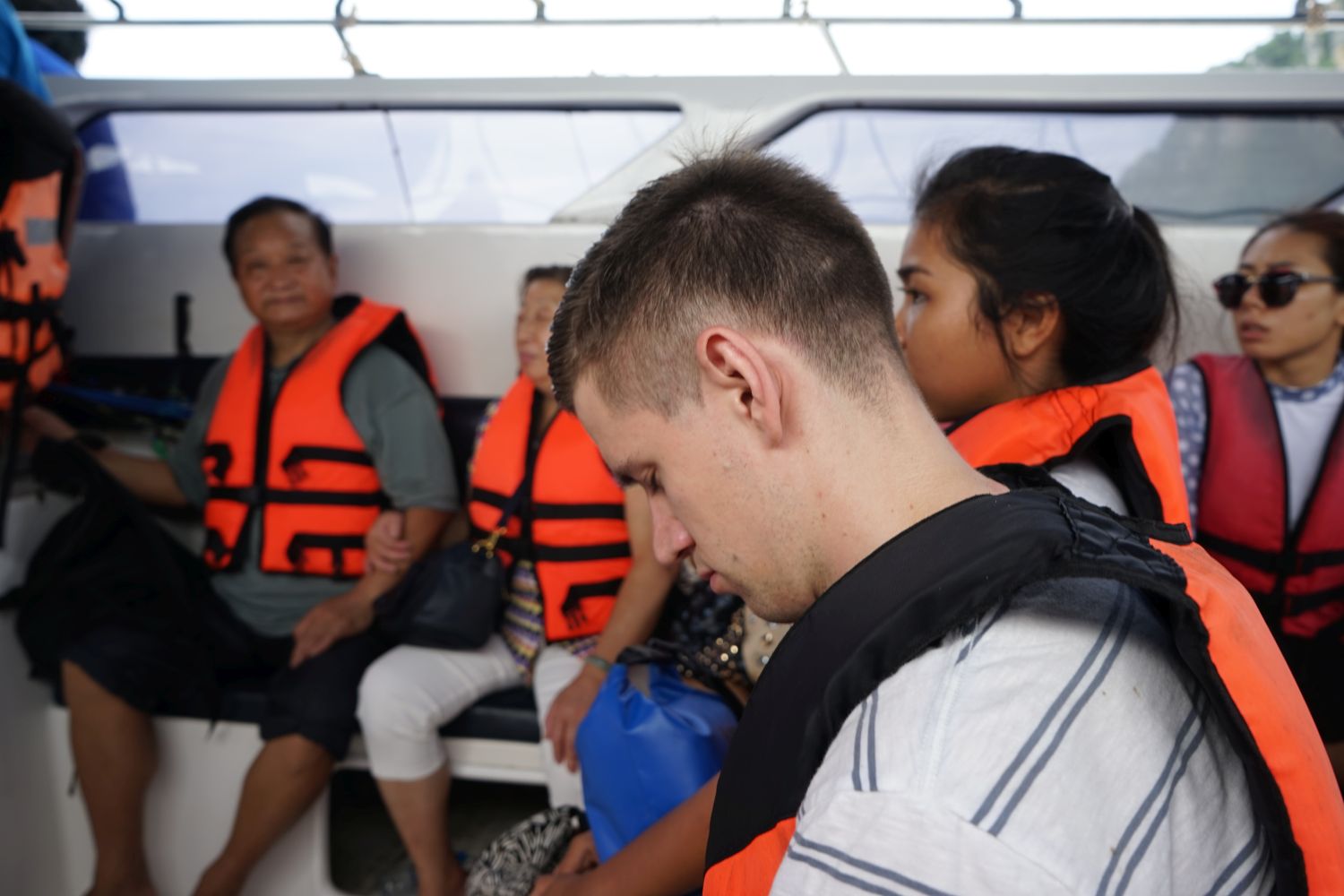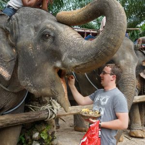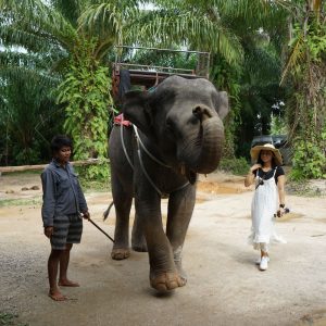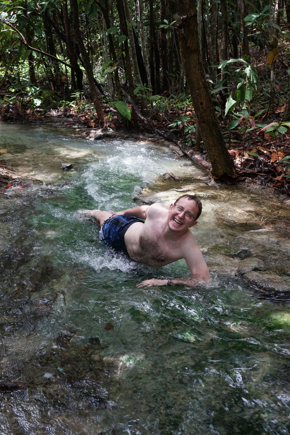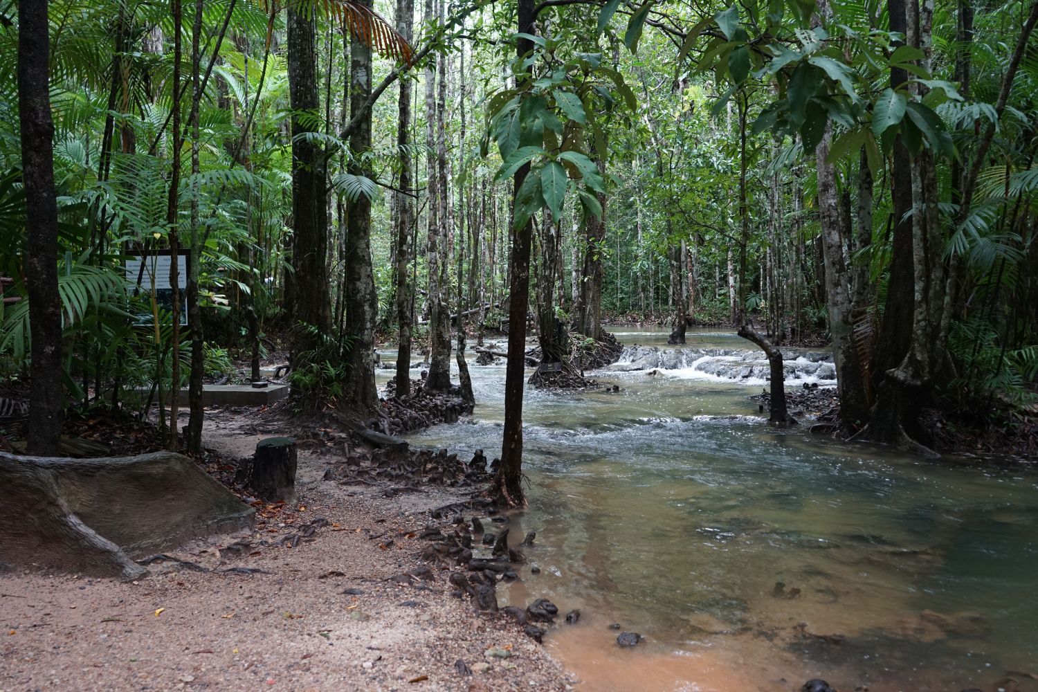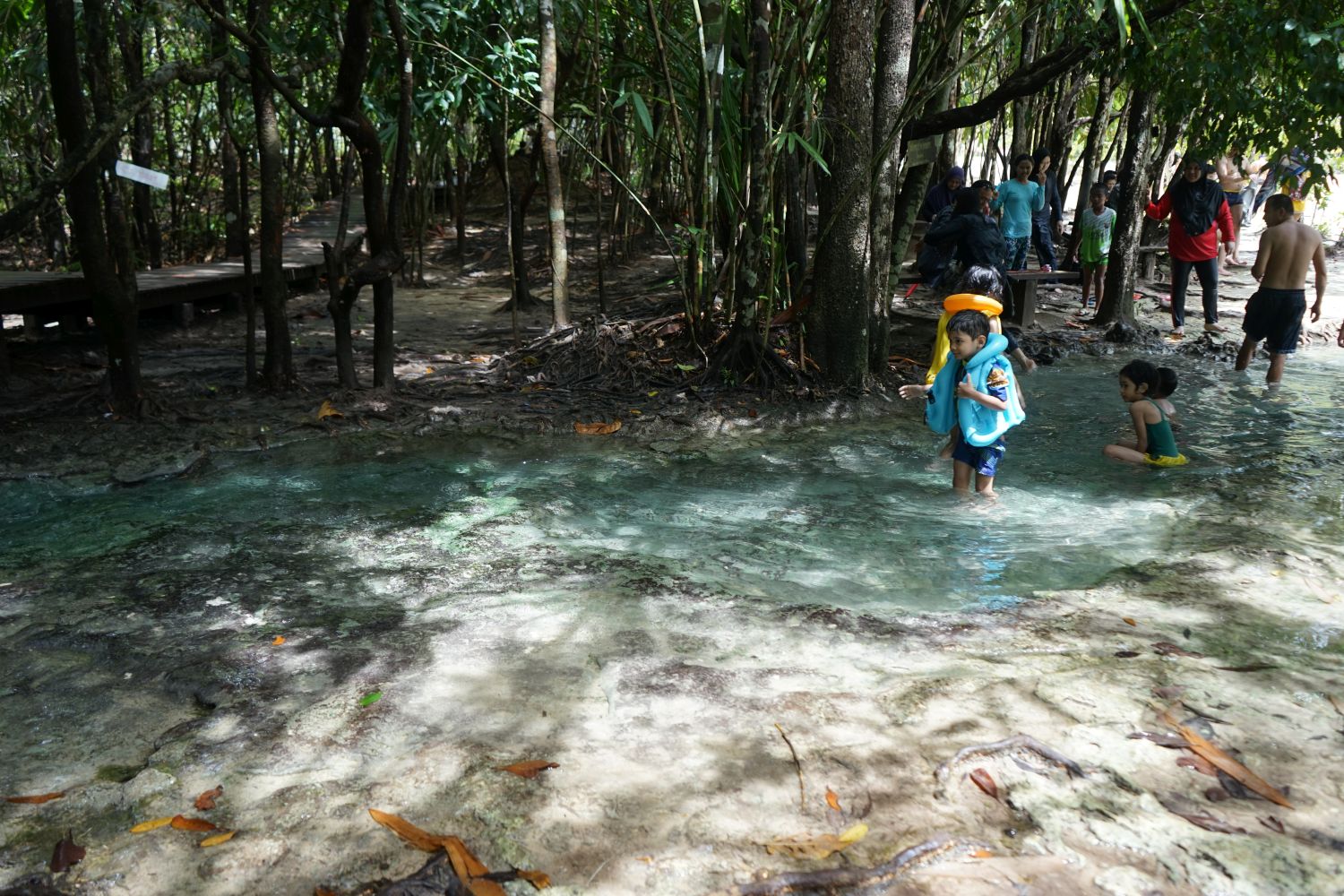 Endlich wieder Regen. Einer verregneten Nacht folgte ein verregneter Morgen, den wir glücklicherweise erst einmal in einem Minivan verbrachten. Wir hatten uns eine Tour mit „Guide“ gebucht, die uns in die Urwälder Thailands führen sollte. Guide bedeutet in diesem Zusammenhang aber nur, dass es eine Person gab, die einem Uhrzeiten in einer Sprache zuschrie, die dem Englischen zumindest ein bisschen ähnelte. Erklärungen zu irgendwas gab es leider keine. Als Erstes ging es zu den heißen Quellen (Namtok Ron) die leider ziemlich überfüllt und aufgrund des Regens alles andere als glasklar waren. Wir hielten uns dort also nicht besonders lange auf und so waren wir schnell wieder in unserem gemütlichen Minivan. Als nächster Stop war der Emerald See (Sa Morakot) geplant. Hier verbrachten wir auch die meiste Zeit. Nach dem ausgiebigen Baden in einem ebenfalls überfüllten Pool, plantschten wir dann noch ein bisschen in einem abseits gelegen Wasserfällchen, wo es deutlich entspannter zuging. Wie bei allen Touren in Südostasien ist der Zeitplan immer sehr straff und so ging es schnell wieder zum Minivan und dann fast direkt – zwei Chinesen aus unserer Reisegruppe waren kurz verschollen-  zum Elephant Trekking. Wie der Name schon andeutet ist das ein Elefantenritt durch den Dschungel. Abgesehen von der Tatsache, dass es sich dabei um massive Tierquälerei handelte, war es aber ganz unterhaltsam, zumal die Guides die ganze Zeit ein paar Chinesinnen aus unserer Reisegruppe veräppelten. Auf dem Rückweg machten wir dann noch einen kurzen Stop bei 7Eleven, dem Laden unseres Vertrauens, wo wir uns mit Proviant eindeckten. Im Hotel angekommen, entspannten wir noch ein bisschen bei ein paar Stückchen Thai-Pizza und traten wir unsere Reise ins Traumland an, um für den folgenden Tag in Topform zu sein. Aber das ist eine andere Geschichte und ein neuer Blogeintrag 😉