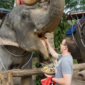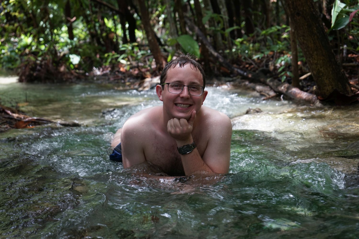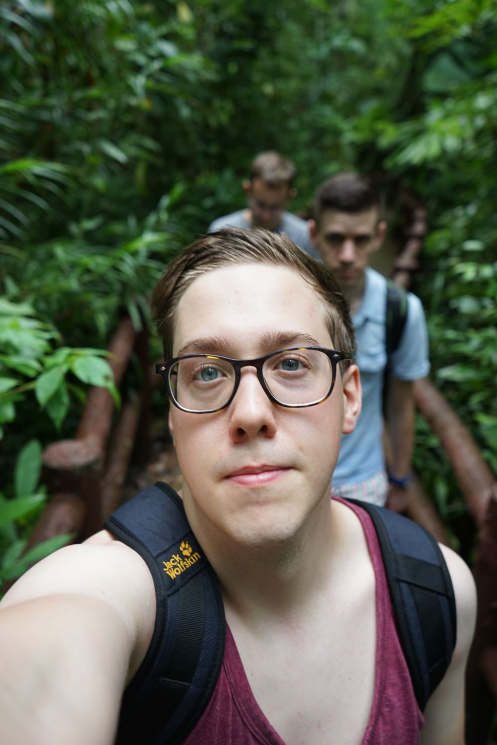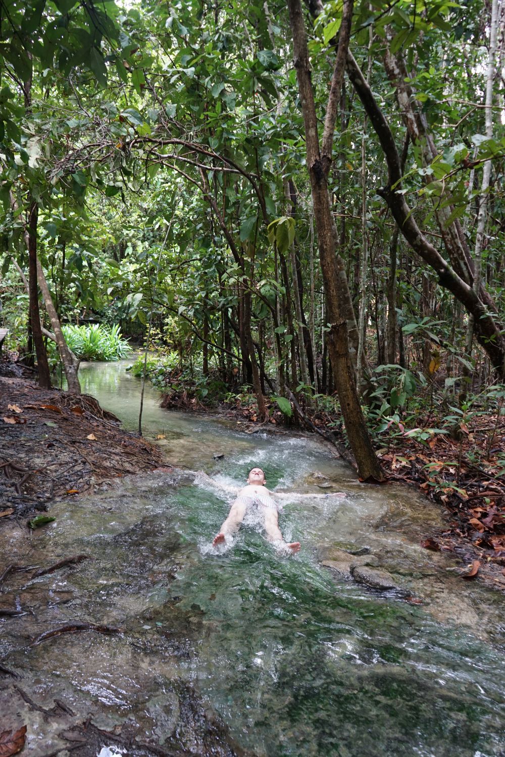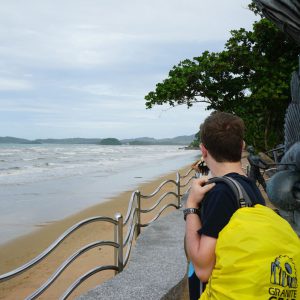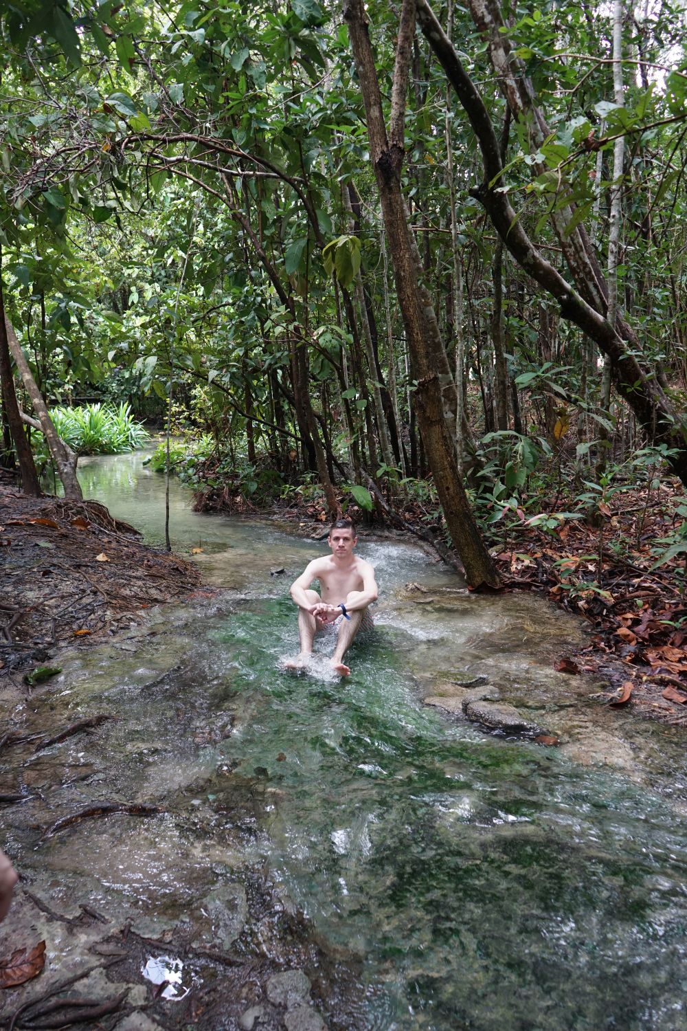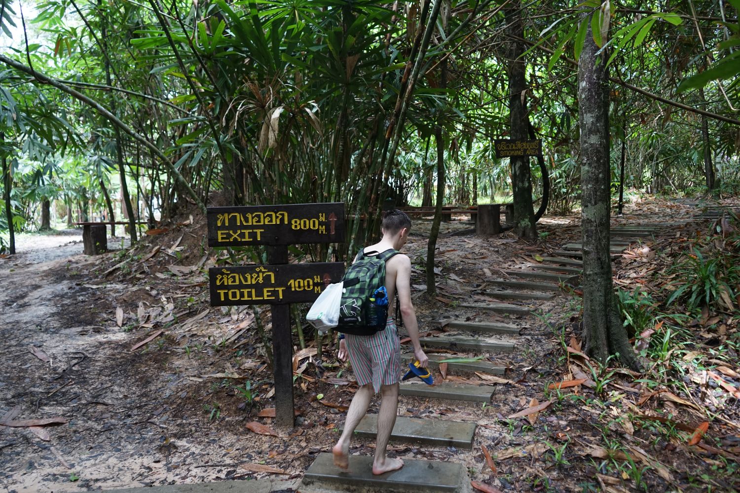 Endlich wieder Regen. Einer verregneten Nacht folgte ein verregneter Morgen, den wir glücklicherweise erst einmal in einem Minivan verbrachten. Wir hatten uns eine Tour mit „Guide“ gebucht, die uns in die Urwälder Thailands führen sollte. Guide bedeutet in diesem Zusammenhang aber nur, dass es eine Person gab, die einem Uhrzeiten in einer Sprache zuschrie, die dem Englischen zumindest ein bisschen ähnelte. Erklärungen zu irgendwas gab es leider keine. Als Erstes ging es zu den heißen Quellen (Namtok Ron) die leider ziemlich überfüllt und aufgrund des Regens alles andere als glasklar waren. Wir hielten uns dort also nicht besonders lange auf und so waren wir schnell wieder in unserem gemütlichen Minivan. Als nächster Stop war der Emerald See (Sa Morakot) geplant. Hier verbrachten wir auch die meiste Zeit. Nach dem ausgiebigen Baden in einem ebenfalls überfüllten Pool, plantschten wir dann noch ein bisschen in einem abseits gelegen Wasserfällchen, wo es deutlich entspannter zuging. Wie bei allen Touren in Südostasien ist der Zeitplan immer sehr straff und so ging es schnell wieder zum Minivan und dann fast direkt – zwei Chinesen aus unserer Reisegruppe waren kurz verschollen-  zum Elephant Trekking. Wie der Name schon andeutet ist das ein Elefantenritt durch den Dschungel. Abgesehen von der Tatsache, dass es sich dabei um massive Tierquälerei handelte, war es aber ganz unterhaltsam, zumal die Guides die ganze Zeit ein paar Chinesinnen aus unserer Reisegruppe veräppelten. Auf dem Rückweg machten wir dann noch einen kurzen Stop bei 7Eleven, dem Laden unseres Vertrauens, wo wir uns mit Proviant eindeckten. Im Hotel angekommen, entspannten wir noch ein bisschen bei ein paar Stückchen Thai-Pizza und traten wir unsere Reise ins Traumland an, um für den folgenden Tag in Topform zu sein. Aber das ist eine andere Geschichte und ein neuer Blogeintrag 😉