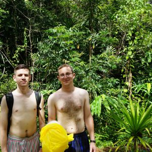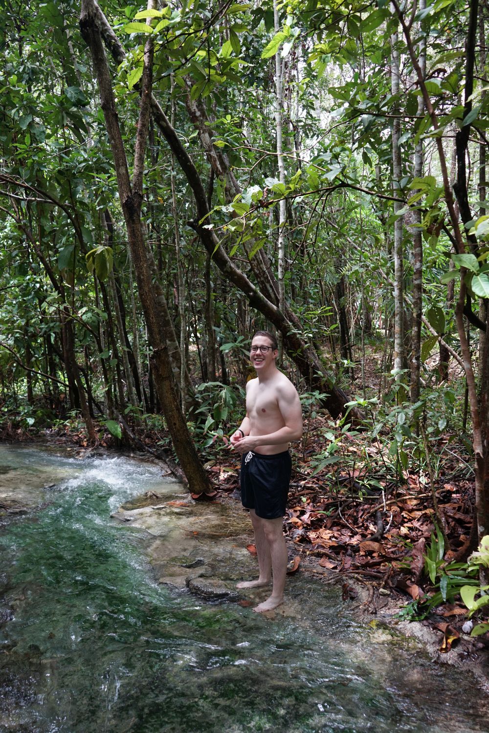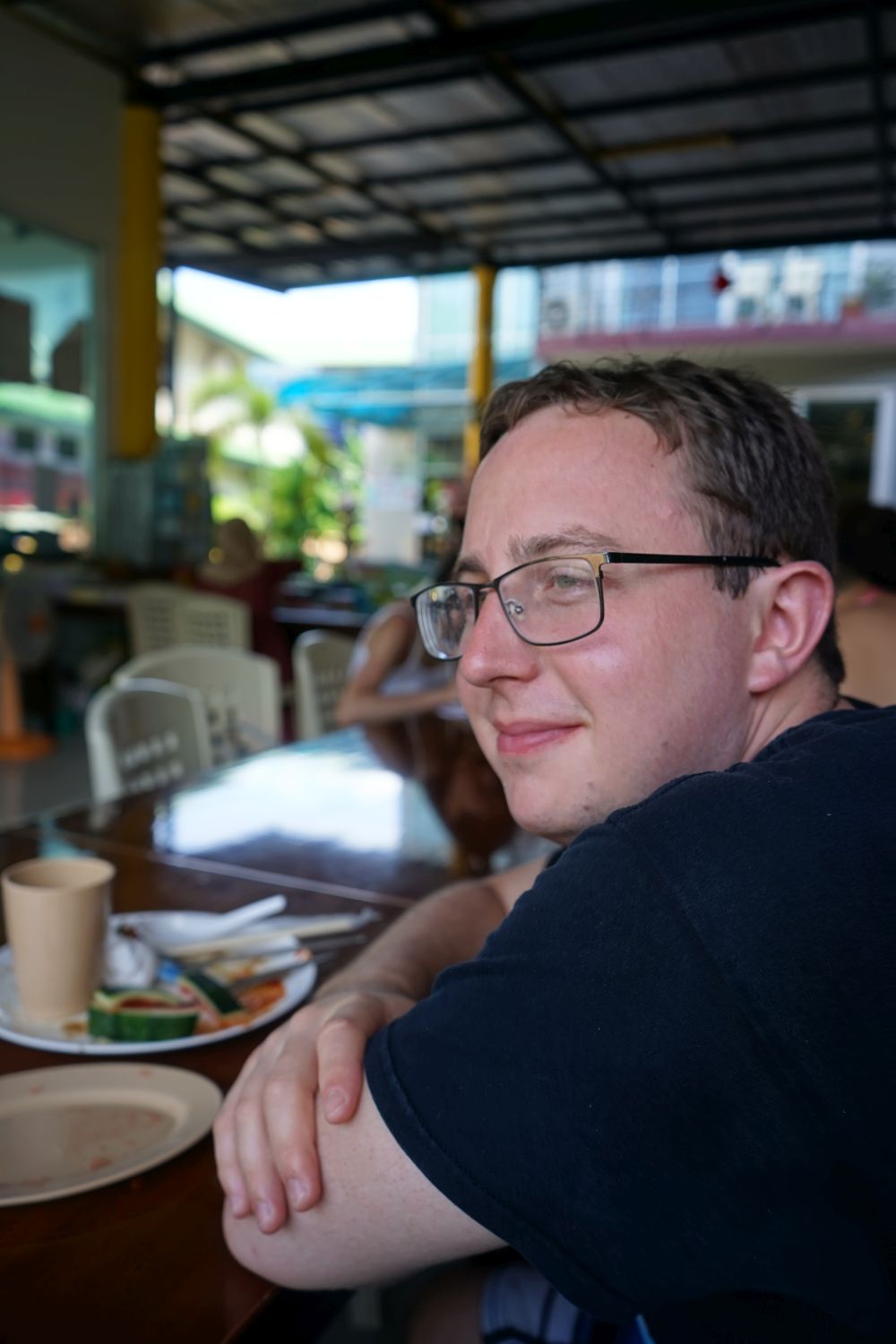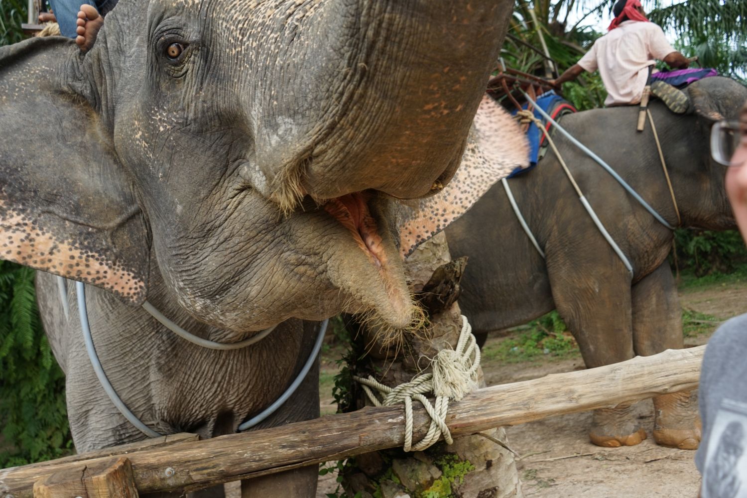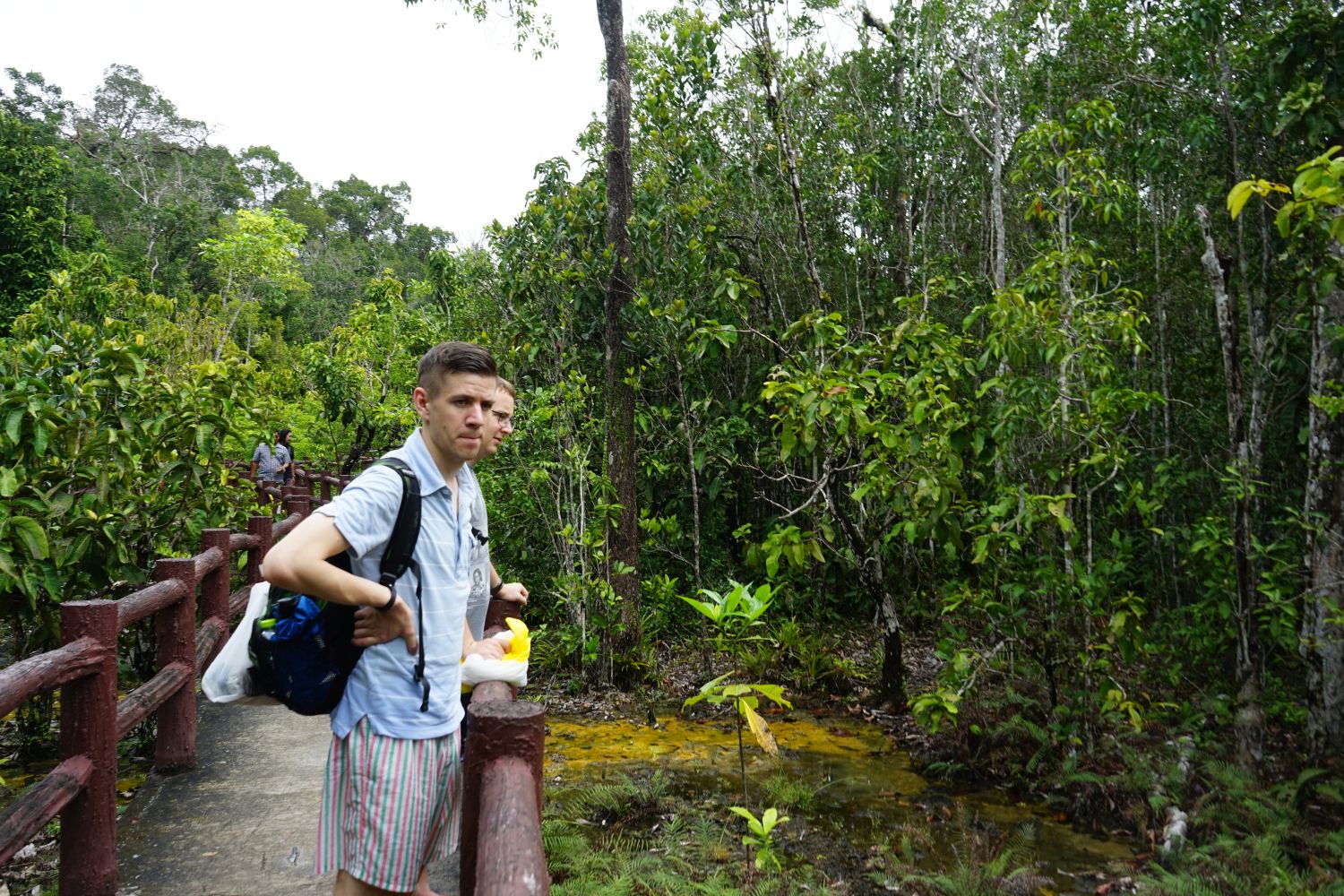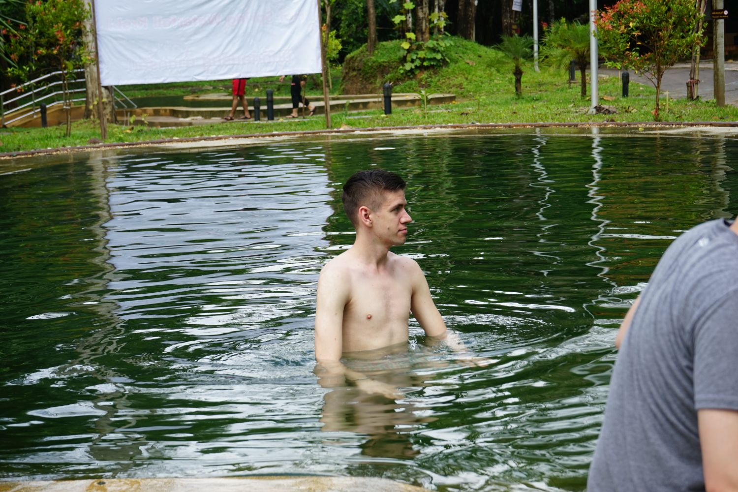 Endlich wieder Regen. Einer verregneten Nacht folgte ein verregneter Morgen, den wir glücklicherweise erst einmal in einem Minivan verbrachten. Wir hatten uns eine Tour mit „Guide“ gebucht, die uns in die Urwälder Thailands führen sollte. Guide bedeutet in diesem Zusammenhang aber nur, dass es eine Person gab, die einem Uhrzeiten in einer Sprache zuschrie, die dem Englischen zumindest ein bisschen ähnelte. Erklärungen zu irgendwas gab es leider keine. Als Erstes ging es zu den heißen Quellen (Namtok Ron) die leider ziemlich überfüllt und aufgrund des Regens alles andere als glasklar waren. Wir hielten uns dort also nicht besonders lange auf und so waren wir schnell wieder in unserem gemütlichen Minivan. Als nächster Stop war der Emerald See (Sa Morakot) geplant. Hier verbrachten wir auch die meiste Zeit. Nach dem ausgiebigen Baden in einem ebenfalls überfüllten Pool, plantschten wir dann noch ein bisschen in einem abseits gelegen Wasserfällchen, wo es deutlich entspannter zuging. Wie bei allen Touren in Südostasien ist der Zeitplan immer sehr straff und so ging es schnell wieder zum Minivan und dann fast direkt – zwei Chinesen aus unserer Reisegruppe waren kurz verschollen-  zum Elephant Trekking. Wie der Name schon andeutet ist das ein Elefantenritt durch den Dschungel. Abgesehen von der Tatsache, dass es sich dabei um massive Tierquälerei handelte, war es aber ganz unterhaltsam, zumal die Guides die ganze Zeit ein paar Chinesinnen aus unserer Reisegruppe veräppelten. Auf dem Rückweg machten wir dann noch einen kurzen Stop bei 7Eleven, dem Laden unseres Vertrauens, wo wir uns mit Proviant eindeckten. Im Hotel angekommen, entspannten wir noch ein bisschen bei ein paar Stückchen Thai-Pizza und traten wir unsere Reise ins Traumland an, um für den folgenden Tag in Topform zu sein. Aber das ist eine andere Geschichte und ein neuer Blogeintrag 😉
