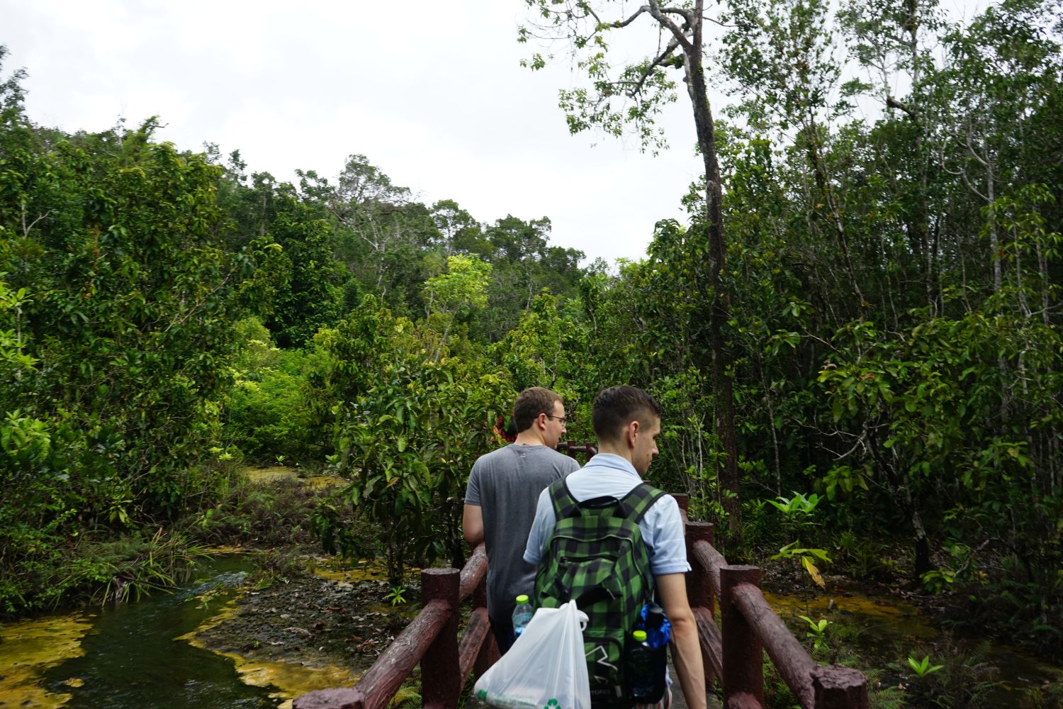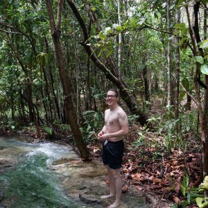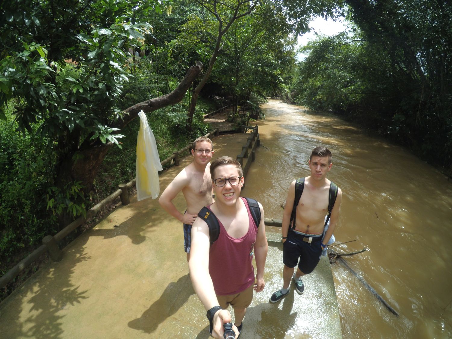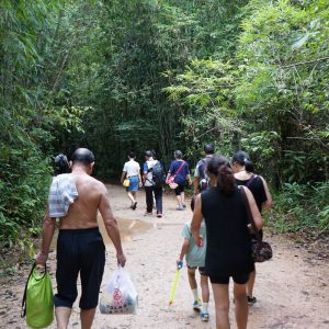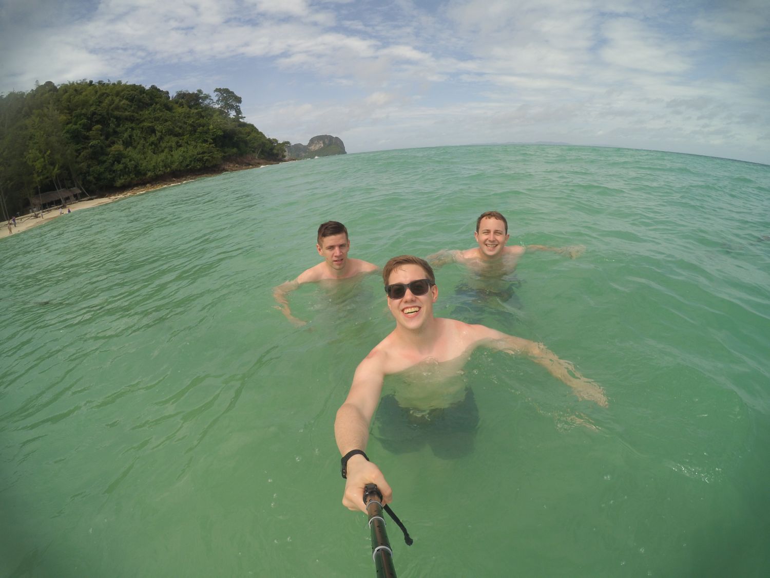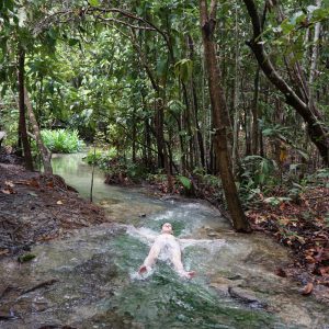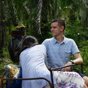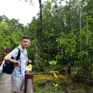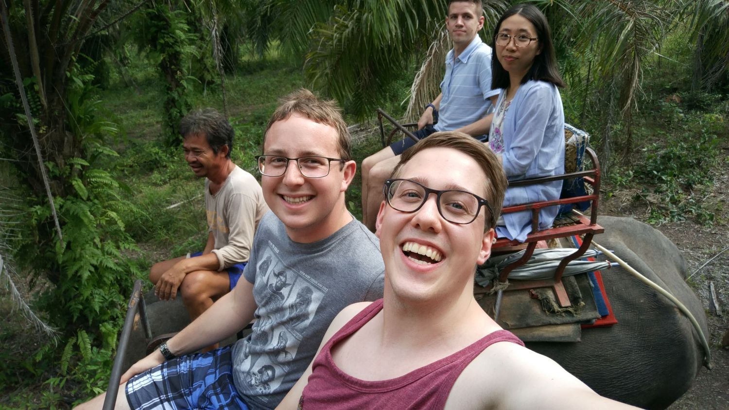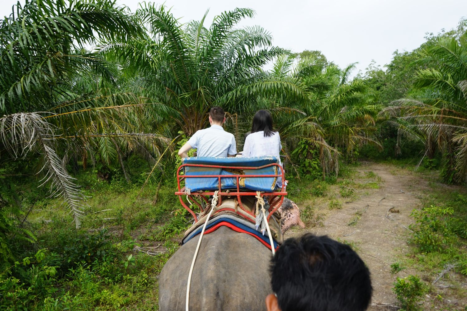 Endlich wieder Regen. Einer verregneten Nacht folgte ein verregneter Morgen, den wir glücklicherweise erst einmal in einem Minivan verbrachten. Wir hatten uns eine Tour mit „Guide“ gebucht, die uns in die Urwälder Thailands führen sollte. Guide bedeutet in diesem Zusammenhang aber nur, dass es eine Person gab, die einem Uhrzeiten in einer Sprache zuschrie, die dem Englischen zumindest ein bisschen ähnelte. Erklärungen zu irgendwas gab es leider keine. Als Erstes ging es zu den heißen Quellen (Namtok Ron) die leider ziemlich überfüllt und aufgrund des Regens alles andere als glasklar waren. Wir hielten uns dort also nicht besonders lange auf und so waren wir schnell wieder in unserem gemütlichen Minivan. Als nächster Stop war der Emerald See (Sa Morakot) geplant. Hier verbrachten wir auch die meiste Zeit. Nach dem ausgiebigen Baden in einem ebenfalls überfüllten Pool, plantschten wir dann noch ein bisschen in einem abseits gelegen Wasserfällchen, wo es deutlich entspannter zuging. Wie bei allen Touren in Südostasien ist der Zeitplan immer sehr straff und so ging es schnell wieder zum Minivan und dann fast direkt – zwei Chinesen aus unserer Reisegruppe waren kurz verschollen-  zum Elephant Trekking. Wie der Name schon andeutet ist das ein Elefantenritt durch den Dschungel. Abgesehen von der Tatsache, dass es sich dabei um massive Tierquälerei handelte, war es aber ganz unterhaltsam, zumal die Guides die ganze Zeit ein paar Chinesinnen aus unserer Reisegruppe veräppelten. Auf dem Rückweg machten wir dann noch einen kurzen Stop bei 7Eleven, dem Laden unseres Vertrauens, wo wir uns mit Proviant eindeckten. Im Hotel angekommen, entspannten wir noch ein bisschen bei ein paar Stückchen Thai-Pizza und traten wir unsere Reise ins Traumland an, um für den folgenden Tag in Topform zu sein. Aber das ist eine andere Geschichte und ein neuer Blogeintrag 😉