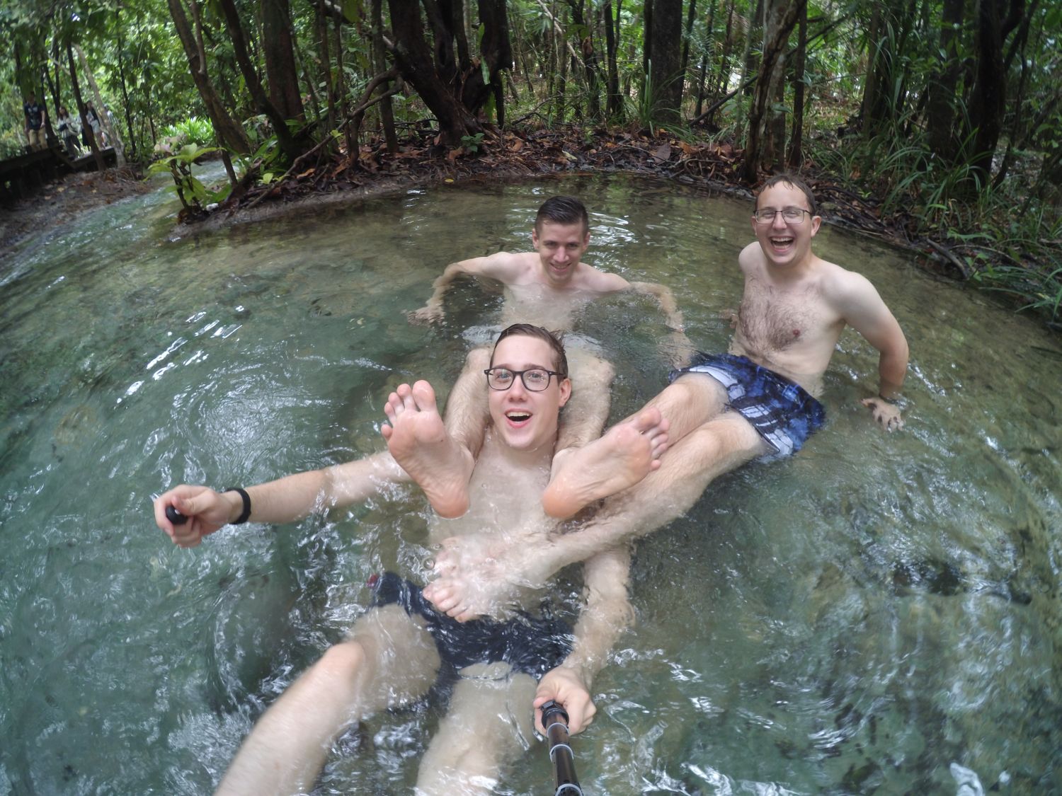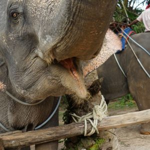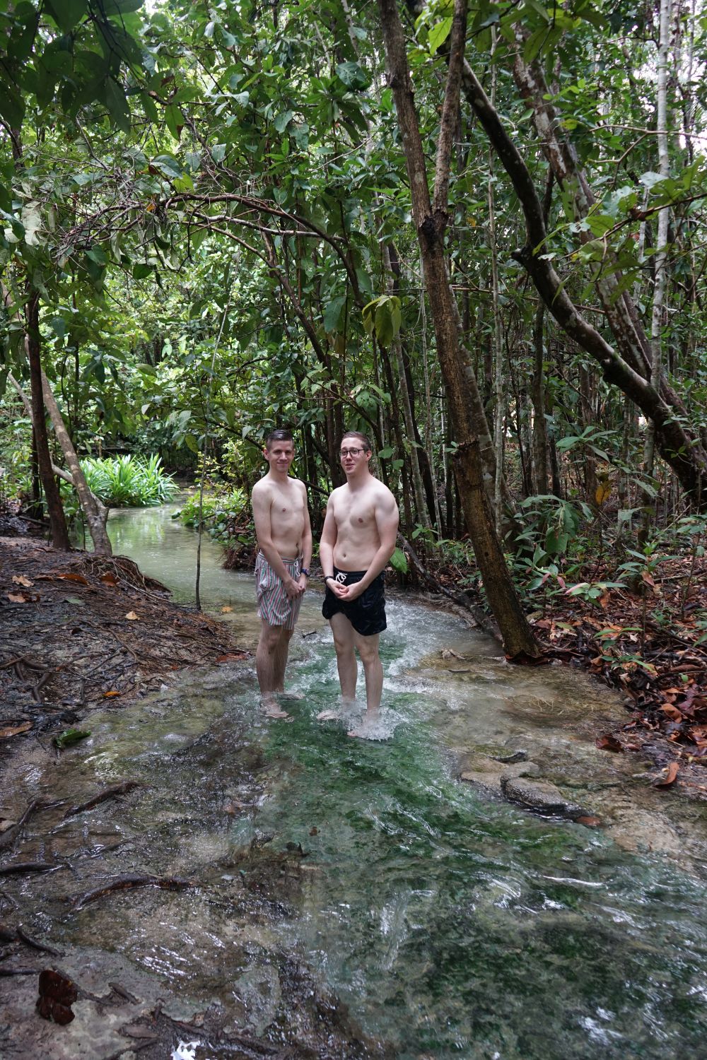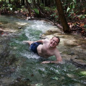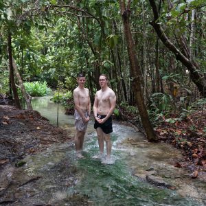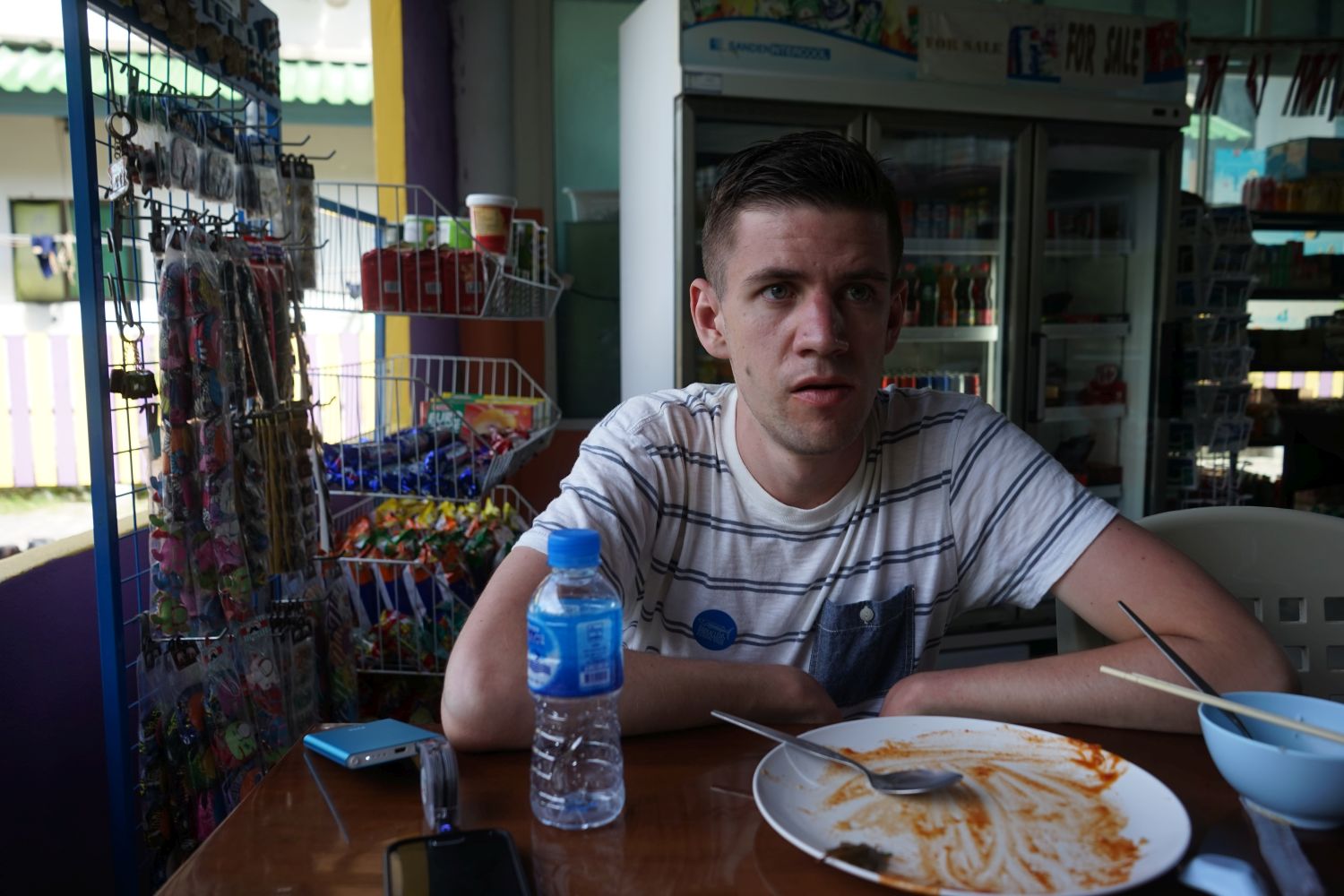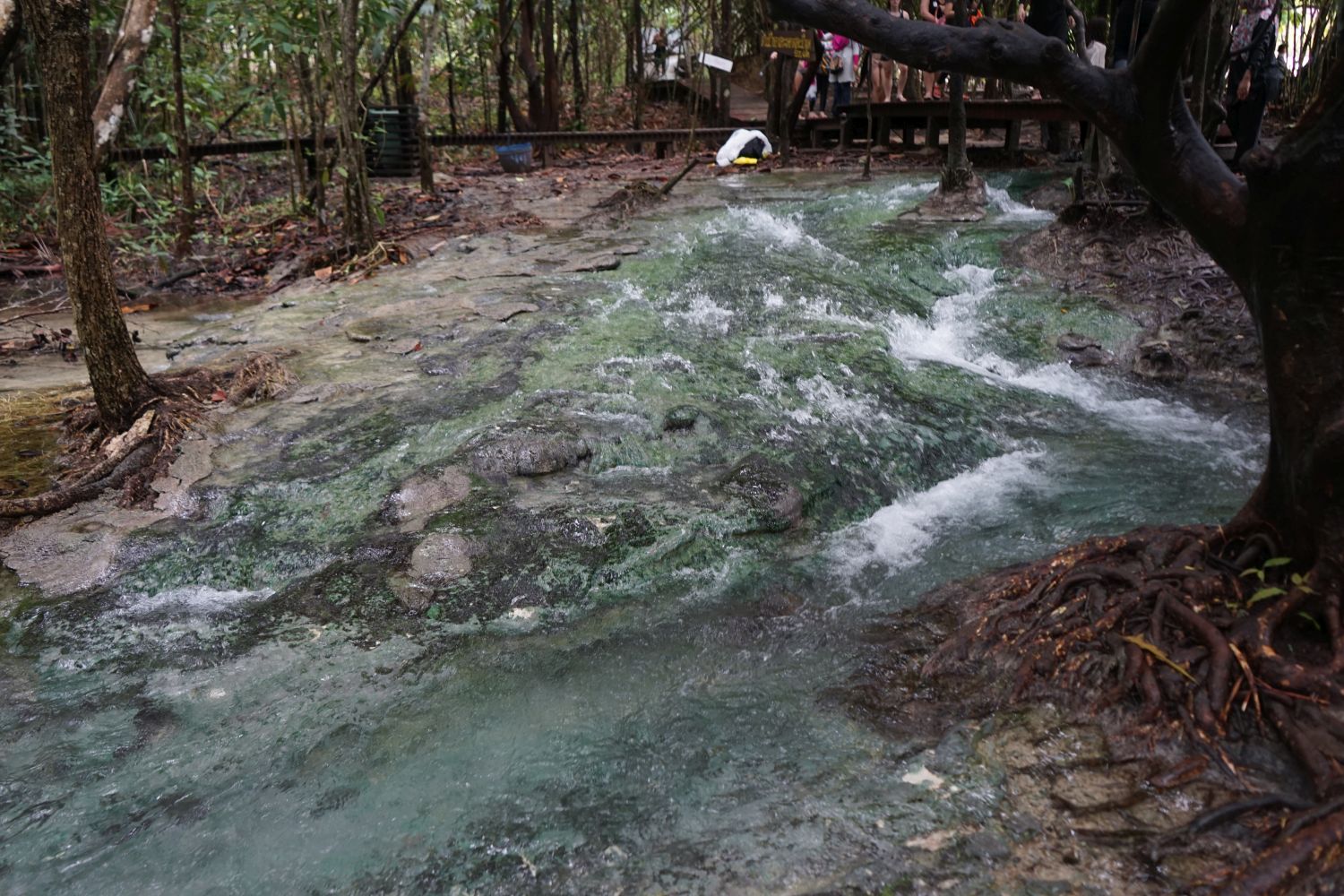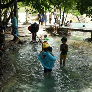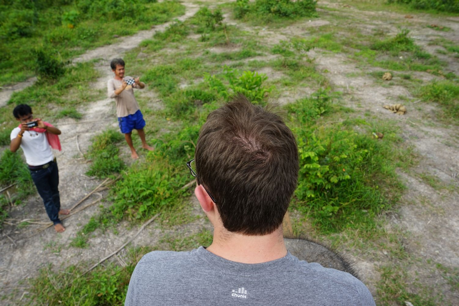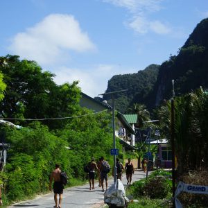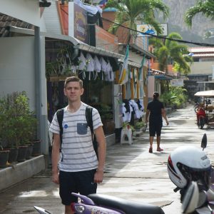 Endlich wieder Regen. Einer verregneten Nacht folgte ein verregneter Morgen, den wir glücklicherweise erst einmal in einem Minivan verbrachten. Wir hatten uns eine Tour mit „Guide“ gebucht, die uns in die Urwälder Thailands führen sollte. Guide bedeutet in diesem Zusammenhang aber nur, dass es eine Person gab, die einem Uhrzeiten in einer Sprache zuschrie, die dem Englischen zumindest ein bisschen ähnelte. Erklärungen zu irgendwas gab es leider keine. Als Erstes ging es zu den heißen Quellen (Namtok Ron) die leider ziemlich überfüllt und aufgrund des Regens alles andere als glasklar waren. Wir hielten uns dort also nicht besonders lange auf und so waren wir schnell wieder in unserem gemütlichen Minivan. Als nächster Stop war der Emerald See (Sa Morakot) geplant. Hier verbrachten wir auch die meiste Zeit. Nach dem ausgiebigen Baden in einem ebenfalls überfüllten Pool, plantschten wir dann noch ein bisschen in einem abseits gelegen Wasserfällchen, wo es deutlich entspannter zuging. Wie bei allen Touren in Südostasien ist der Zeitplan immer sehr straff und so ging es schnell wieder zum Minivan und dann fast direkt – zwei Chinesen aus unserer Reisegruppe waren kurz verschollen-  zum Elephant Trekking. Wie der Name schon andeutet ist das ein Elefantenritt durch den Dschungel. Abgesehen von der Tatsache, dass es sich dabei um massive Tierquälerei handelte, war es aber ganz unterhaltsam, zumal die Guides die ganze Zeit ein paar Chinesinnen aus unserer Reisegruppe veräppelten. Auf dem Rückweg machten wir dann noch einen kurzen Stop bei 7Eleven, dem Laden unseres Vertrauens, wo wir uns mit Proviant eindeckten. Im Hotel angekommen, entspannten wir noch ein bisschen bei ein paar Stückchen Thai-Pizza und traten wir unsere Reise ins Traumland an, um für den folgenden Tag in Topform zu sein. Aber das ist eine andere Geschichte und ein neuer Blogeintrag 😉