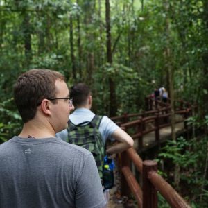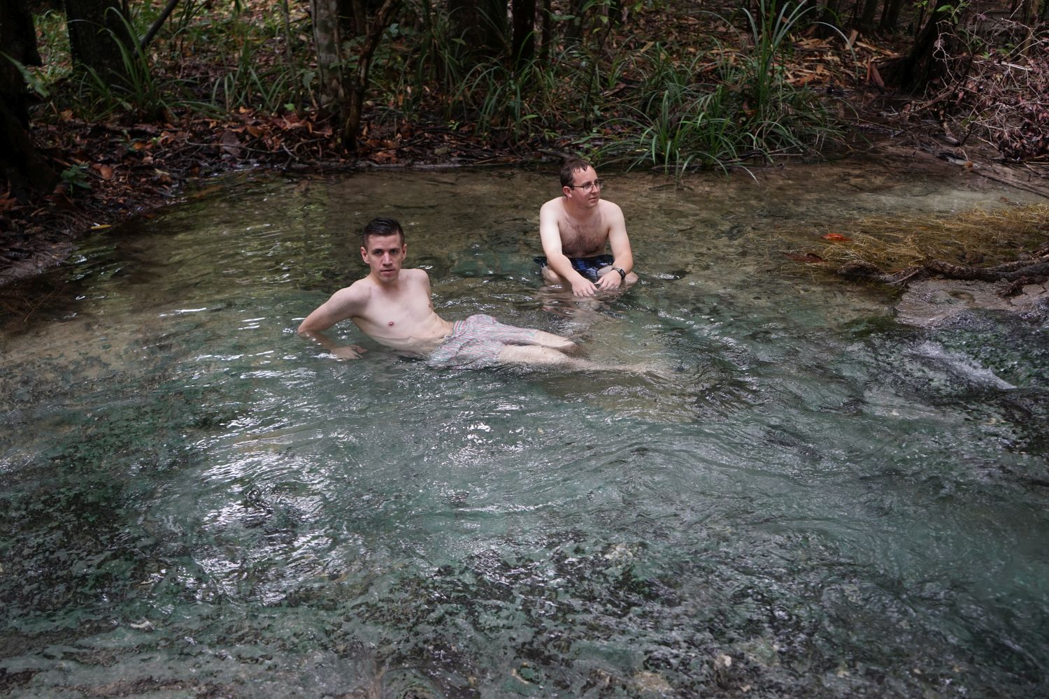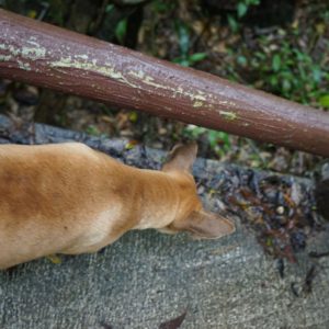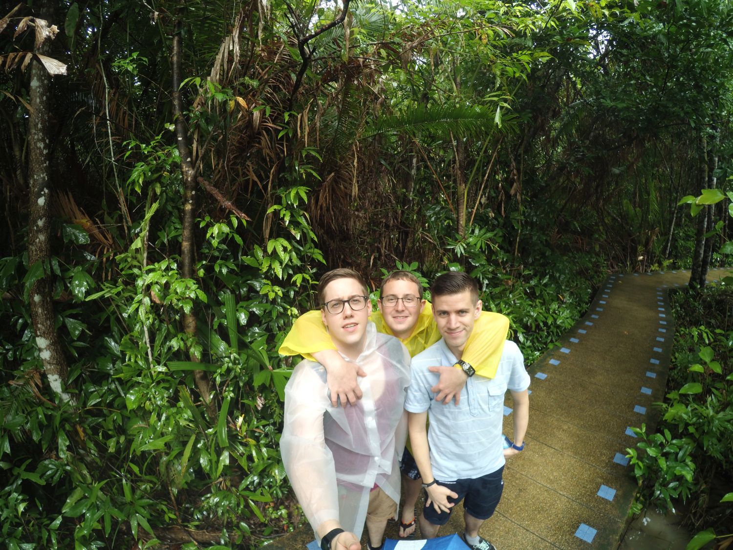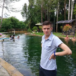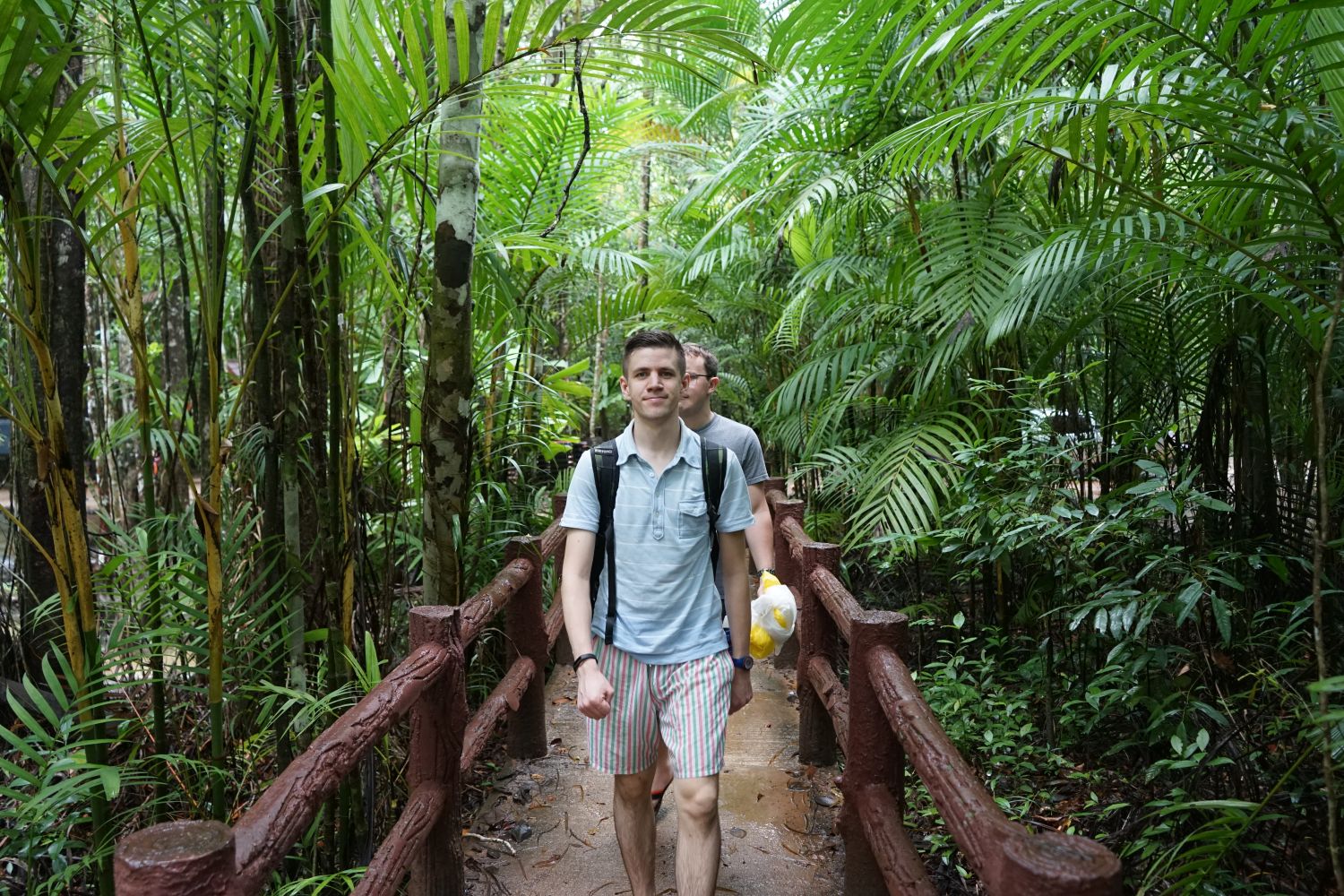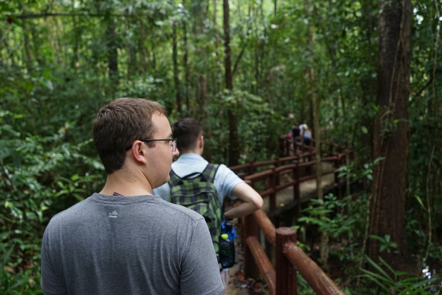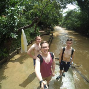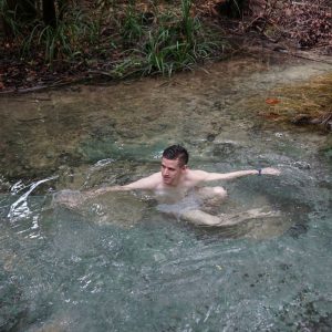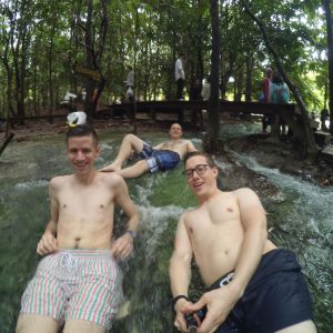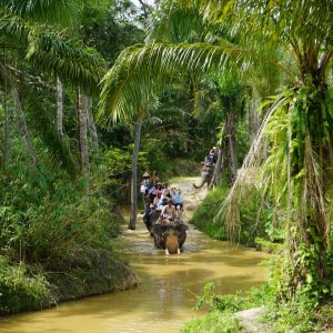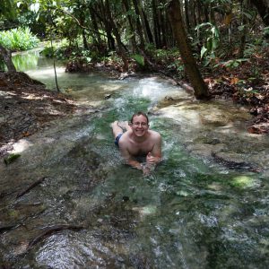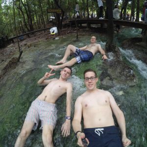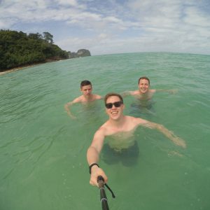 Endlich wieder Regen. Einer verregneten Nacht folgte ein verregneter Morgen, den wir glücklicherweise erst einmal in einem Minivan verbrachten. Wir hatten uns eine Tour mit „Guide“ gebucht, die uns in die Urwälder Thailands führen sollte. Guide bedeutet in diesem Zusammenhang aber nur, dass es eine Person gab, die einem Uhrzeiten in einer Sprache zuschrie, die dem Englischen zumindest ein bisschen ähnelte. Erklärungen zu irgendwas gab es leider keine. Als Erstes ging es zu den heißen Quellen (Namtok Ron) die leider ziemlich überfüllt und aufgrund des Regens alles andere als glasklar waren. Wir hielten uns dort also nicht besonders lange auf und so waren wir schnell wieder in unserem gemütlichen Minivan. Als nächster Stop war der Emerald See (Sa Morakot) geplant. Hier verbrachten wir auch die meiste Zeit. Nach dem ausgiebigen Baden in einem ebenfalls überfüllten Pool, plantschten wir dann noch ein bisschen in einem abseits gelegen Wasserfällchen, wo es deutlich entspannter zuging. Wie bei allen Touren in Südostasien ist der Zeitplan immer sehr straff und so ging es schnell wieder zum Minivan und dann fast direkt – zwei Chinesen aus unserer Reisegruppe waren kurz verschollen-  zum Elephant Trekking. Wie der Name schon andeutet ist das ein Elefantenritt durch den Dschungel. Abgesehen von der Tatsache, dass es sich dabei um massive Tierquälerei handelte, war es aber ganz unterhaltsam, zumal die Guides die ganze Zeit ein paar Chinesinnen aus unserer Reisegruppe veräppelten. Auf dem Rückweg machten wir dann noch einen kurzen Stop bei 7Eleven, dem Laden unseres Vertrauens, wo wir uns mit Proviant eindeckten. Im Hotel angekommen, entspannten wir noch ein bisschen bei ein paar Stückchen Thai-Pizza und traten wir unsere Reise ins Traumland an, um für den folgenden Tag in Topform zu sein. Aber das ist eine andere Geschichte und ein neuer Blogeintrag 😉