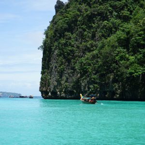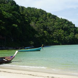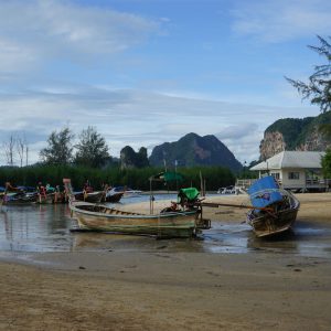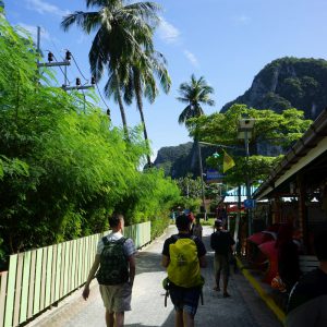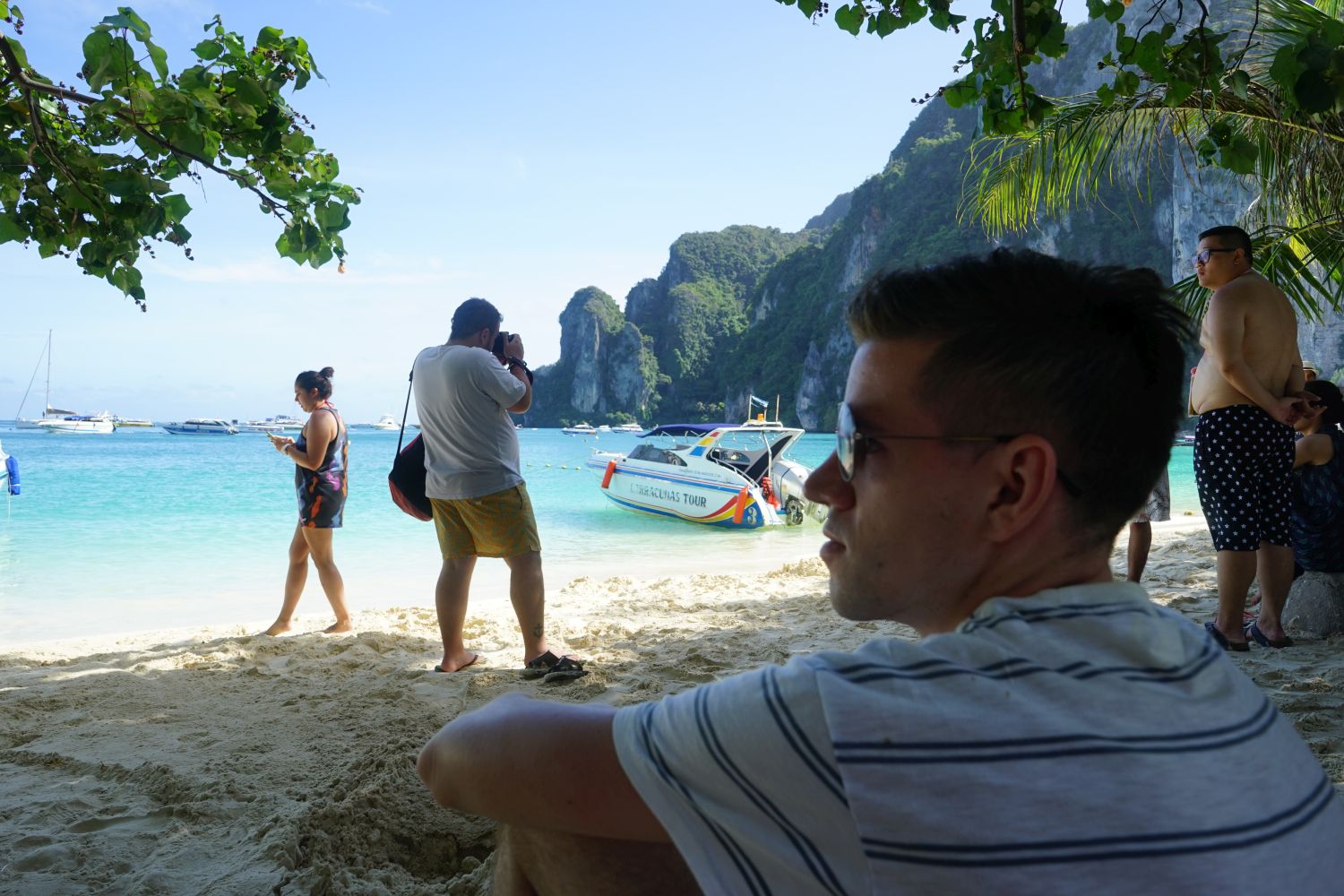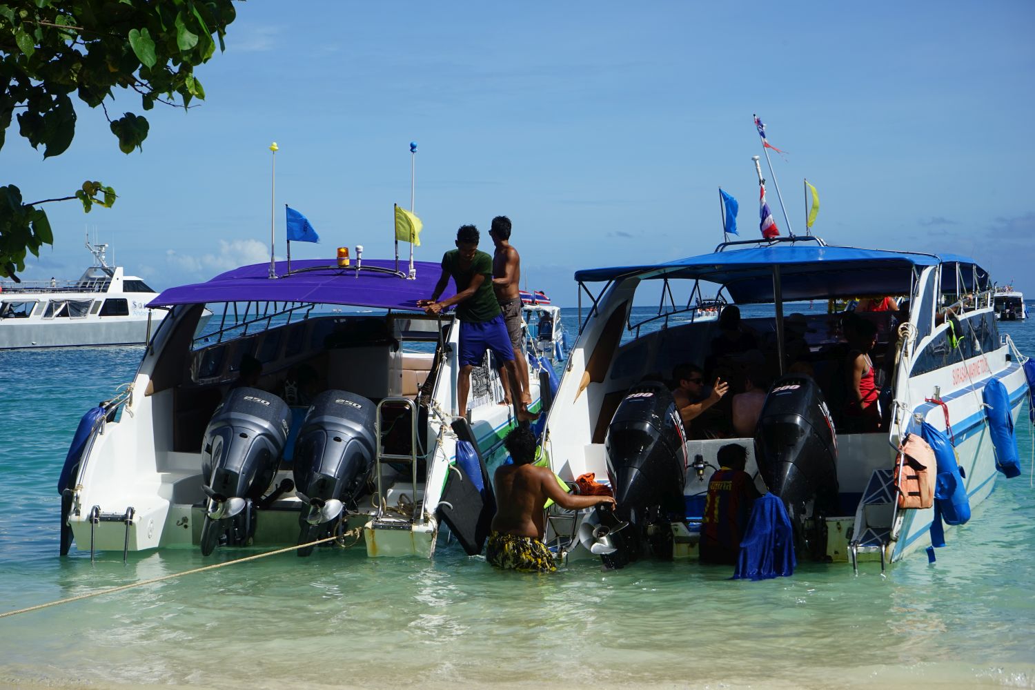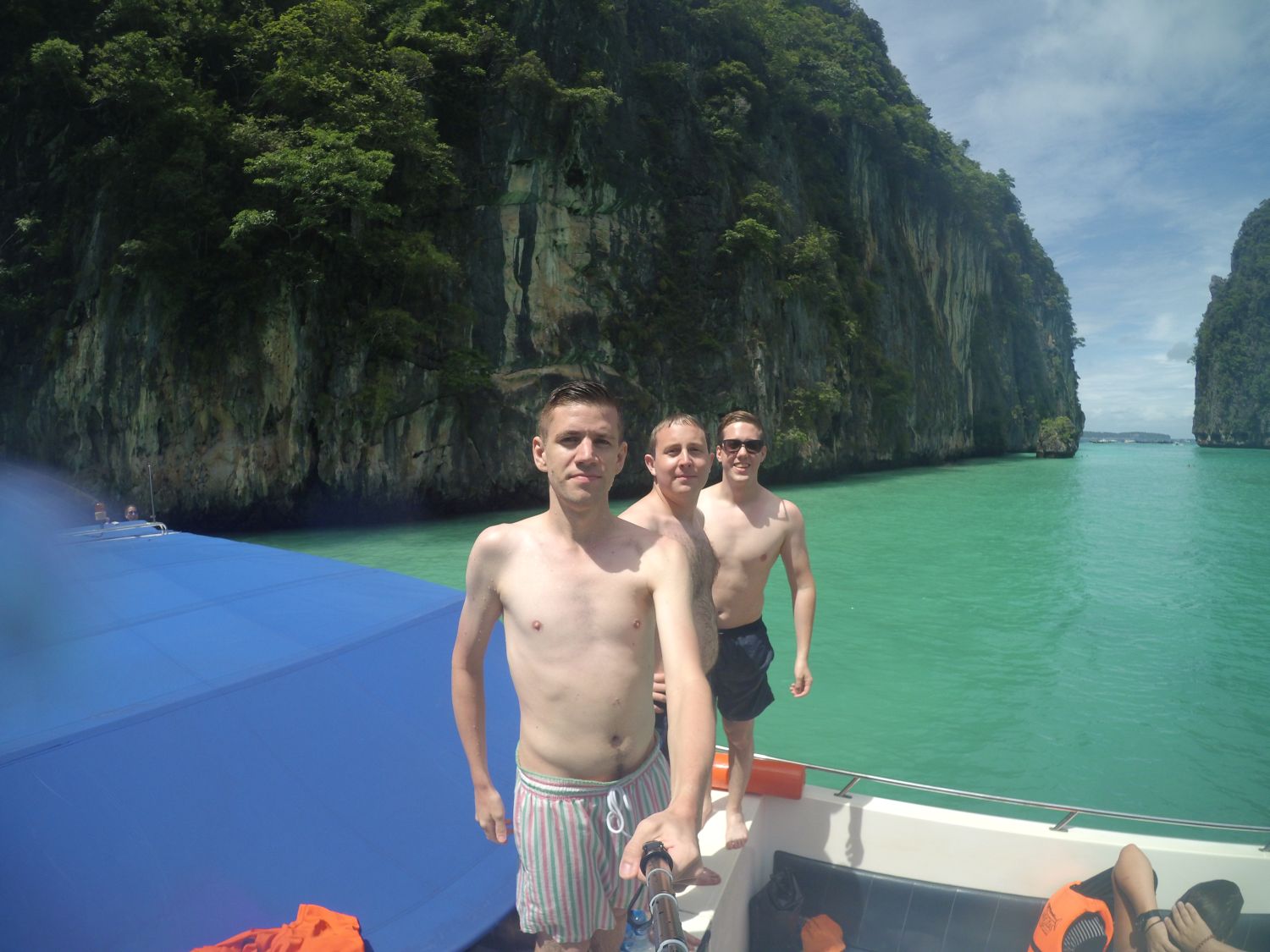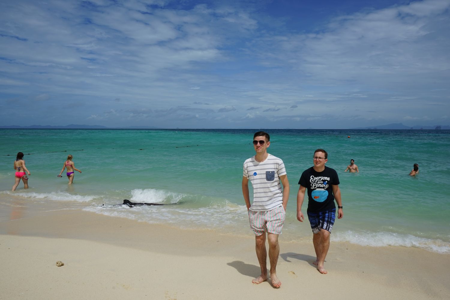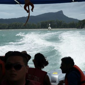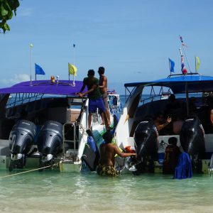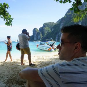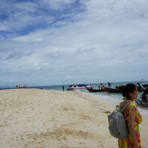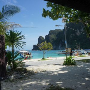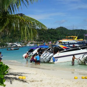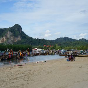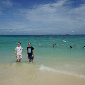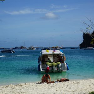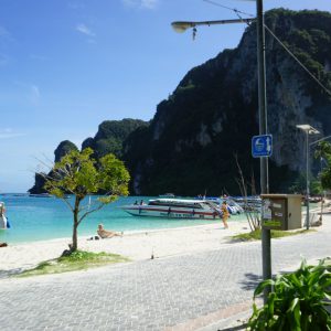 Morgenstund hat Gold im Mund. Um 7:30 Uhr stand unser gebuchter Mini-Van bereits vor der Tür und sollte uns in das nächste Abenteuer führen. Nach einer dreiviertel stündigen Fahrt standen wir am Strand von Ao Nang, der Touristenortschaft in der Nähe von Krabi-Stadt in der sich unser Hotel befand. Nun wurde es richtig zum Kotzen. Dies ist wörtlich gemeint denn die Bootsfahrt zu den Phi Phi Inseln führte bei einem Großteil der Bootsinsassen zu plötzlichen schwall artigen Entleerungen des Mageninhalts. Auf Grund der Regenzeit war der Wellengang besonders hoch. Auf der ersten Insel angekommen wankten alle Tourteilnehmer zum Strand und hatten 40 Minuten Zeit wieder auf ihr Leben klar zukommen. Dann ging es auch schon weiter zum Schnorcheln. Auch diese eher unspektakulären 30 Minuten gingen schnell vorbei und wir machten uns endlich auf zum Höhepunkt der Tour, Maya Beach. Hier wurde der bekannte Film „The Beach“ gedreht, in dem Leonardo DiCaprio die Hauptrolle besetzt. Nach einem kurzen Zwischenstopp an der Affeninsel ging es endlich zum Mittagessen nach Ko Phi Phi Don wo es neben einem großen Buffet auch einen herrlichen Strand zum entspannen gab. Die Rückfahrt verlief, bedingt durch das gute Wetter weitestgehend ruhig so dass die Körperinhalte der Bootsinsassen an ihren angestammten Orten blieben.