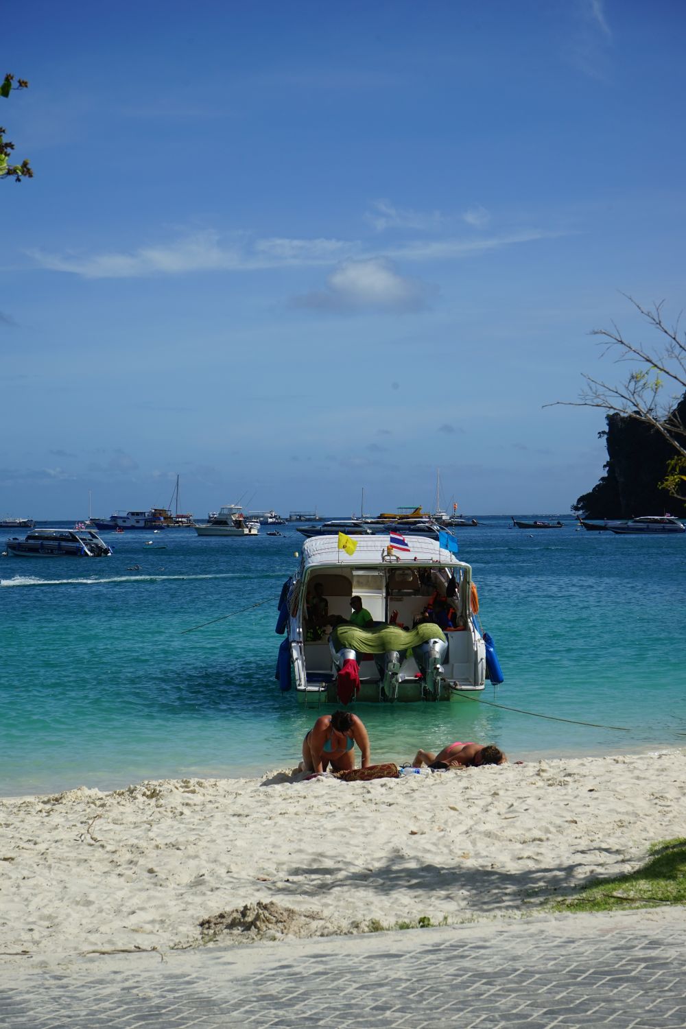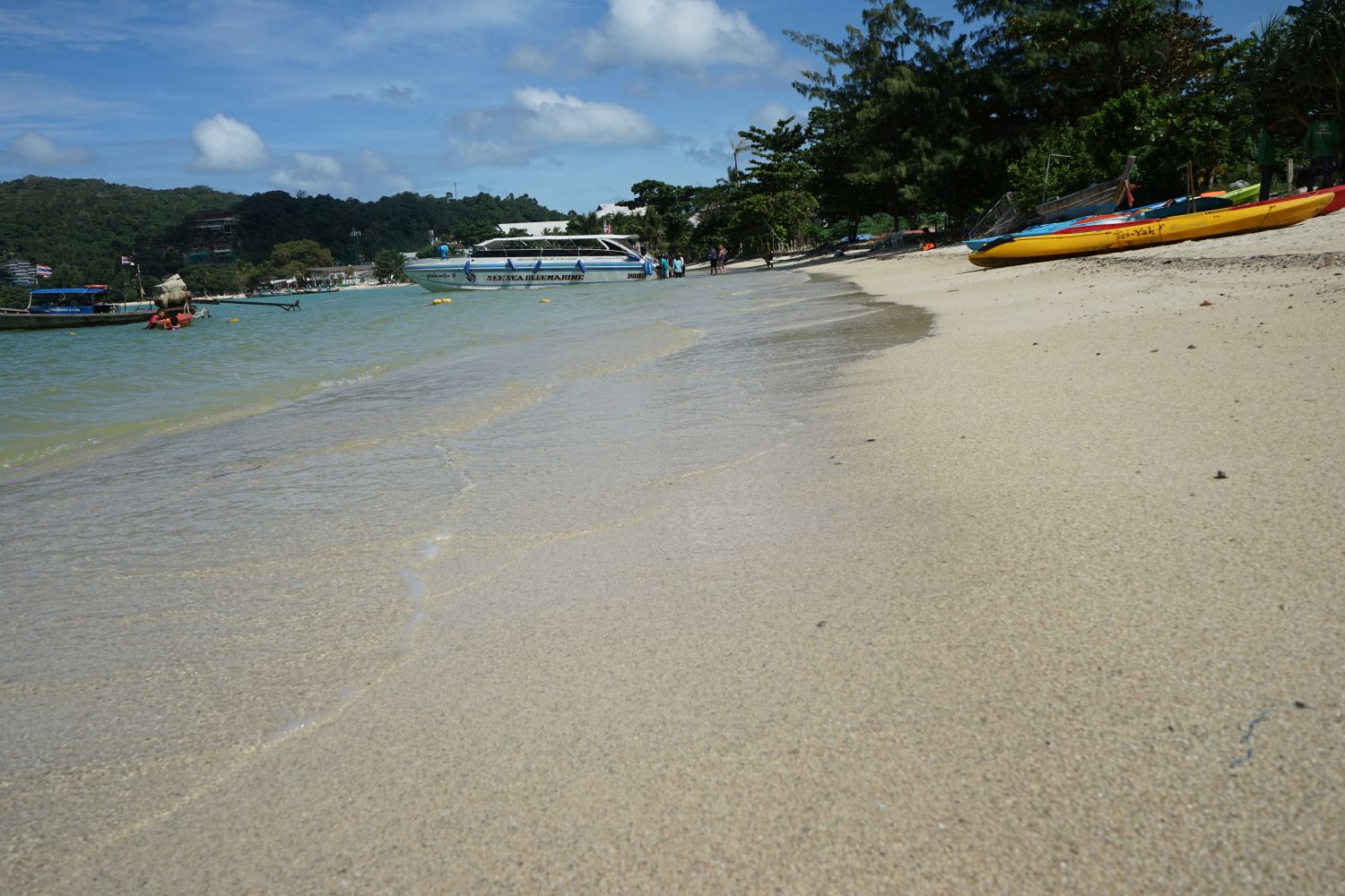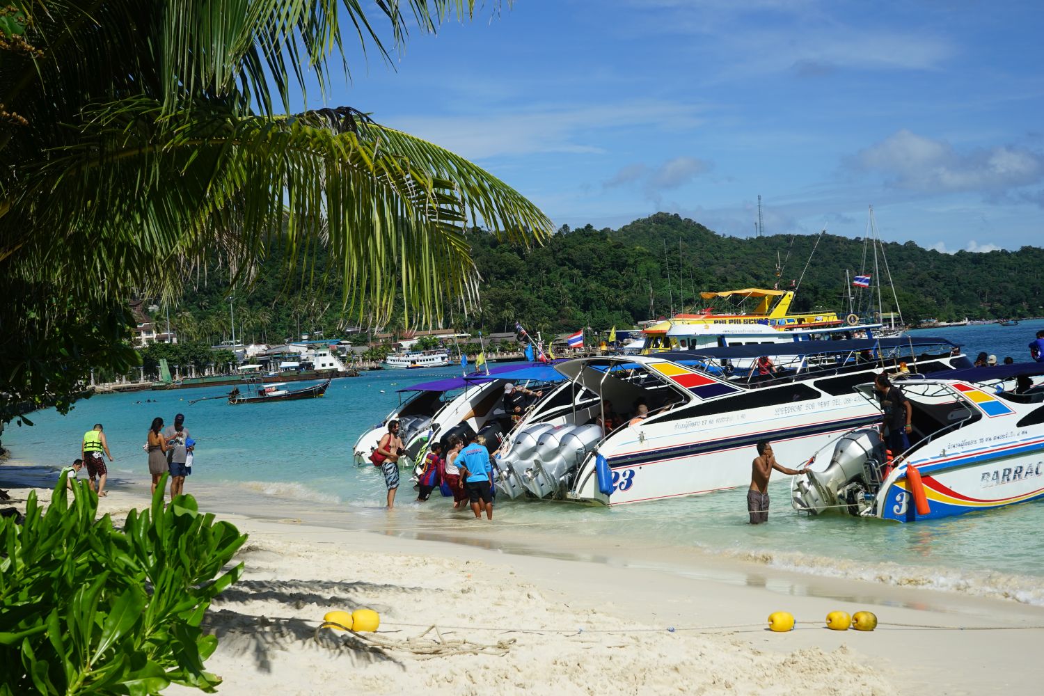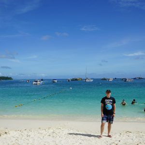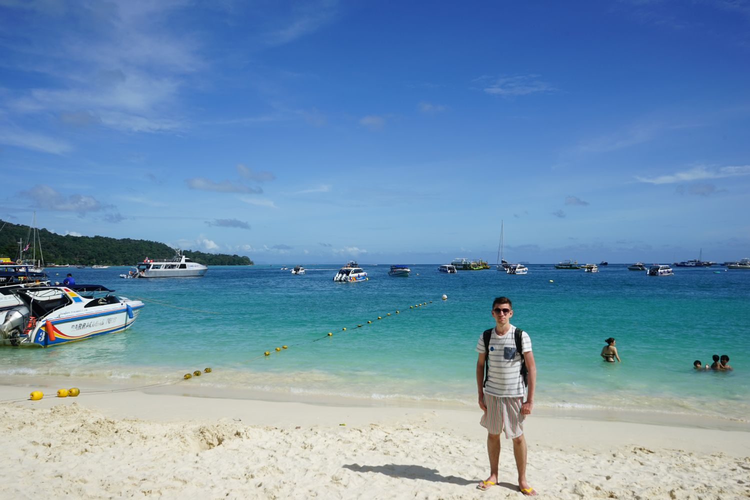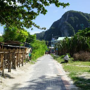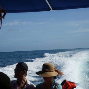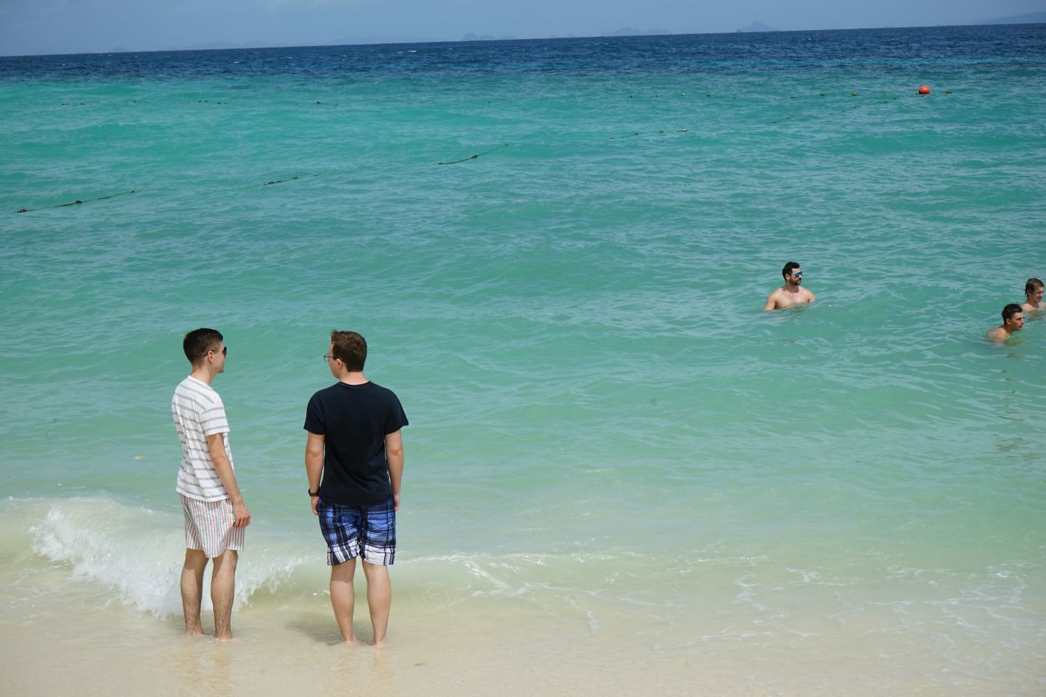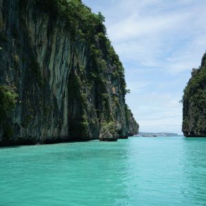 Morgenstund hat Gold im Mund. Um 7:30 Uhr stand unser gebuchter Mini-Van bereits vor der Tür und sollte uns in das nächste Abenteuer führen. Nach einer dreiviertel stündigen Fahrt standen wir am Strand von Ao Nang, der Touristenortschaft in der Nähe von Krabi-Stadt in der sich unser Hotel befand. Nun wurde es richtig zum Kotzen. Dies ist wörtlich gemeint denn die Bootsfahrt zu den Phi Phi Inseln führte bei einem Großteil der Bootsinsassen zu plötzlichen schwall artigen Entleerungen des Mageninhalts. Auf Grund der Regenzeit war der Wellengang besonders hoch. Auf der ersten Insel angekommen wankten alle Tourteilnehmer zum Strand und hatten 40 Minuten Zeit wieder auf ihr Leben klar zukommen. Dann ging es auch schon weiter zum Schnorcheln. Auch diese eher unspektakulären 30 Minuten gingen schnell vorbei und wir machten uns endlich auf zum Höhepunkt der Tour, Maya Beach. Hier wurde der bekannte Film „The Beach“ gedreht, in dem Leonardo DiCaprio die Hauptrolle besetzt. Nach einem kurzen Zwischenstopp an der Affeninsel ging es endlich zum Mittagessen nach Ko Phi Phi Don wo es neben einem großen Buffet auch einen herrlichen Strand zum entspannen gab. Die Rückfahrt verlief, bedingt durch das gute Wetter weitestgehend ruhig so dass die Körperinhalte der Bootsinsassen an ihren angestammten Orten blieben.