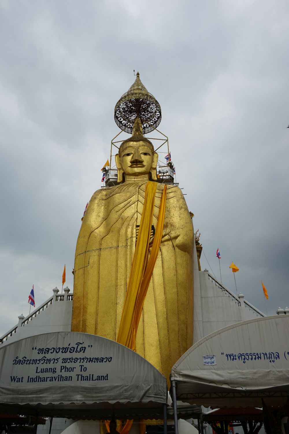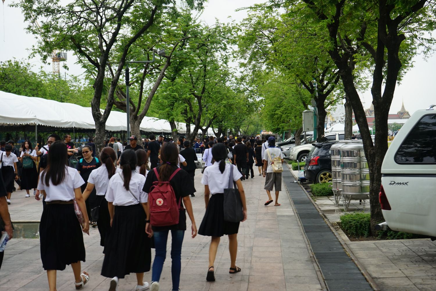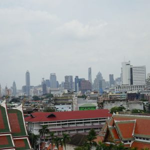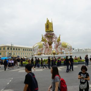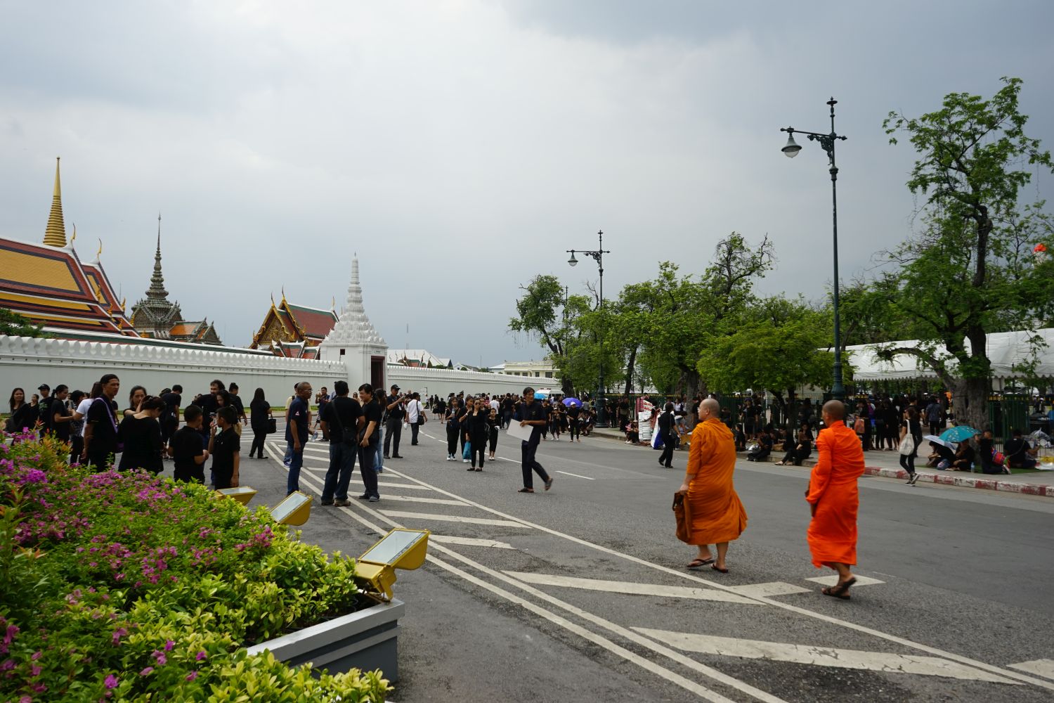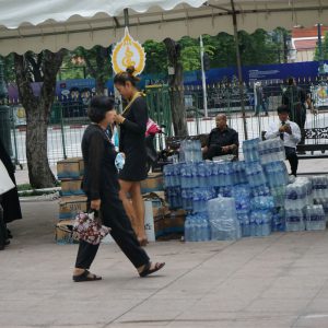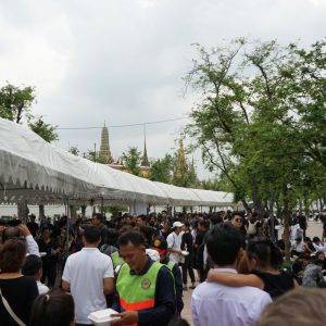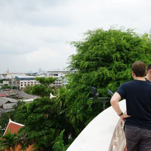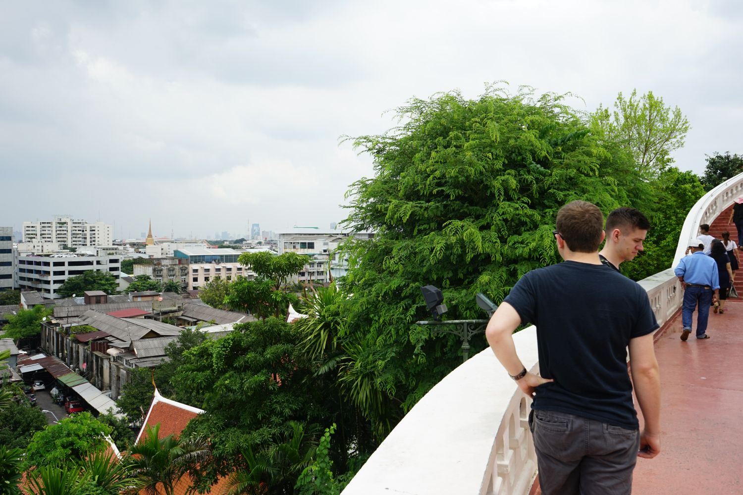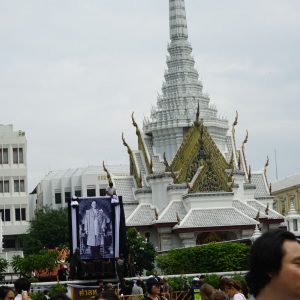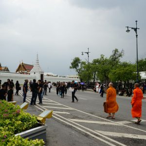 Heute stand etwas Sightseeing auf dem Programm, also schnappten wir uns ein Tuktuk, in der nähe vom Hotel und fuhren zunächst zum Tempel des goldenen Bergs (Wat Saket). Nach 318 Stufen waren wir am Gipfel angekommen und konnten etwas die Aussicht über Bangkok genießen. Nächster Stop war dann der 32 Meter hohe stehende Buddah (Luang Pho Tho) des Wat Intharawihan Tempels. Zum Abschluss Stand eigentlich ein Besuch des Königspalasts auf dem Programm. Dieser ist jedoch aufgrund der aktuellen Staatstrauer geschlossen. Trotzdem hat sich ein Besuch gelohnt. Riesige schwarz gekleidete Menschenmengen reisen aktuell zum Palast, um ihrem König beizustehen. Für uns Außenstehende hat das ganze Treiben etwas von einer Naturkatastrophe: Militär, riesige Wasservorräte und andere Hilfsgüter, die an die Menschen kostenlos verteilt werden. Aufgrund der Staatstrauer wird aktuell kein Alkohol verkauft bzw. ausgeschenkt, wodurch ich die Kao San Road noch nie so leer und vor allem ruhig erlebt habe. Morgen geht es für uns weiter nach Krabi, wo wir hoffentlich etwas weniger durchwachsenes Wetter haben.