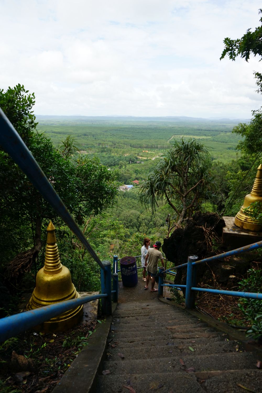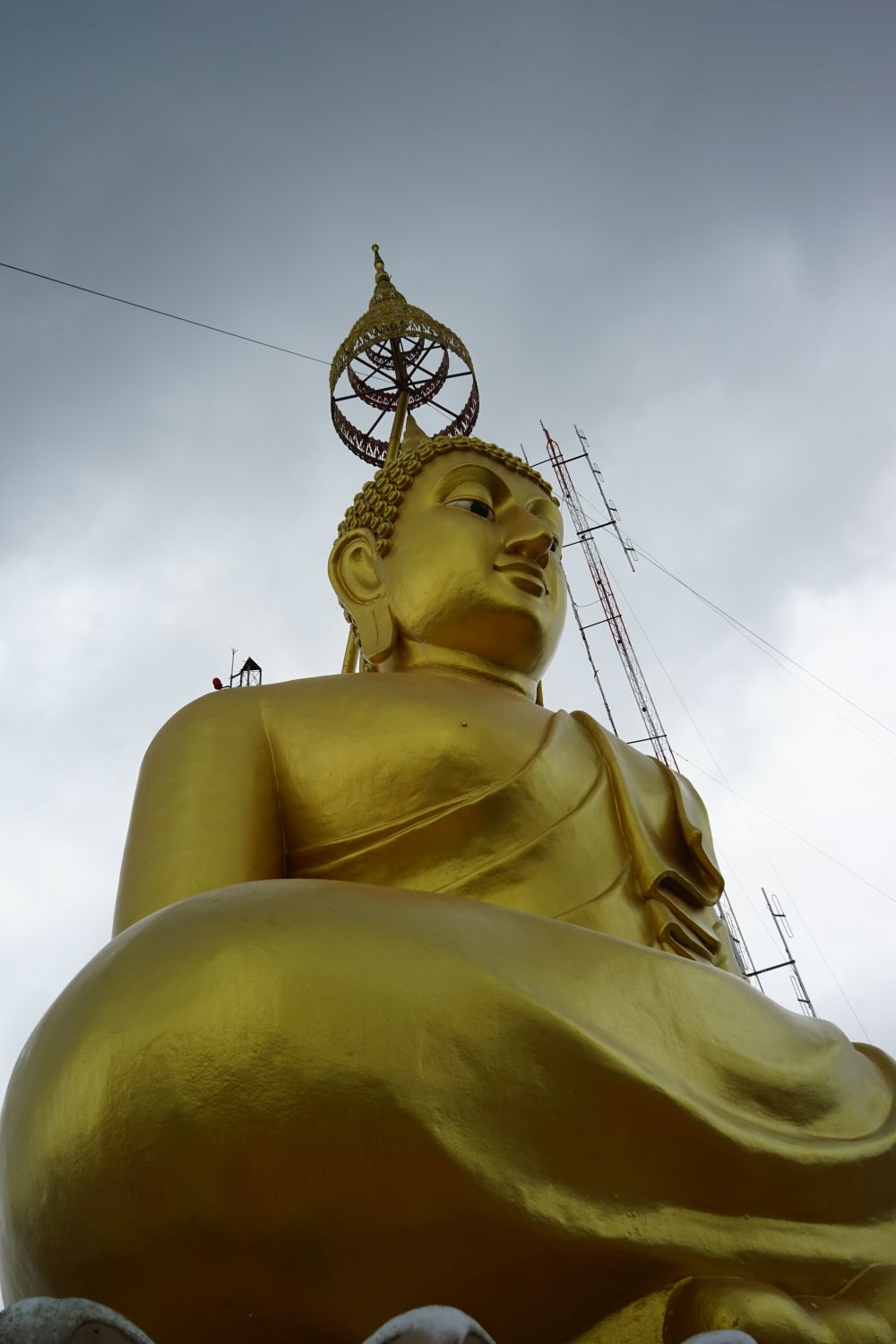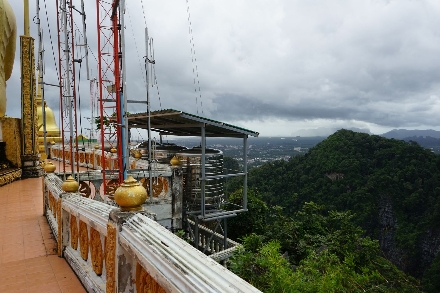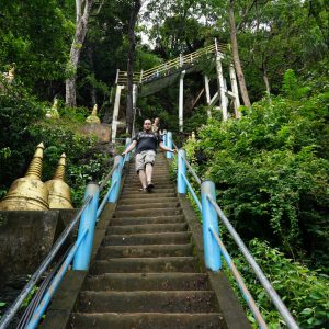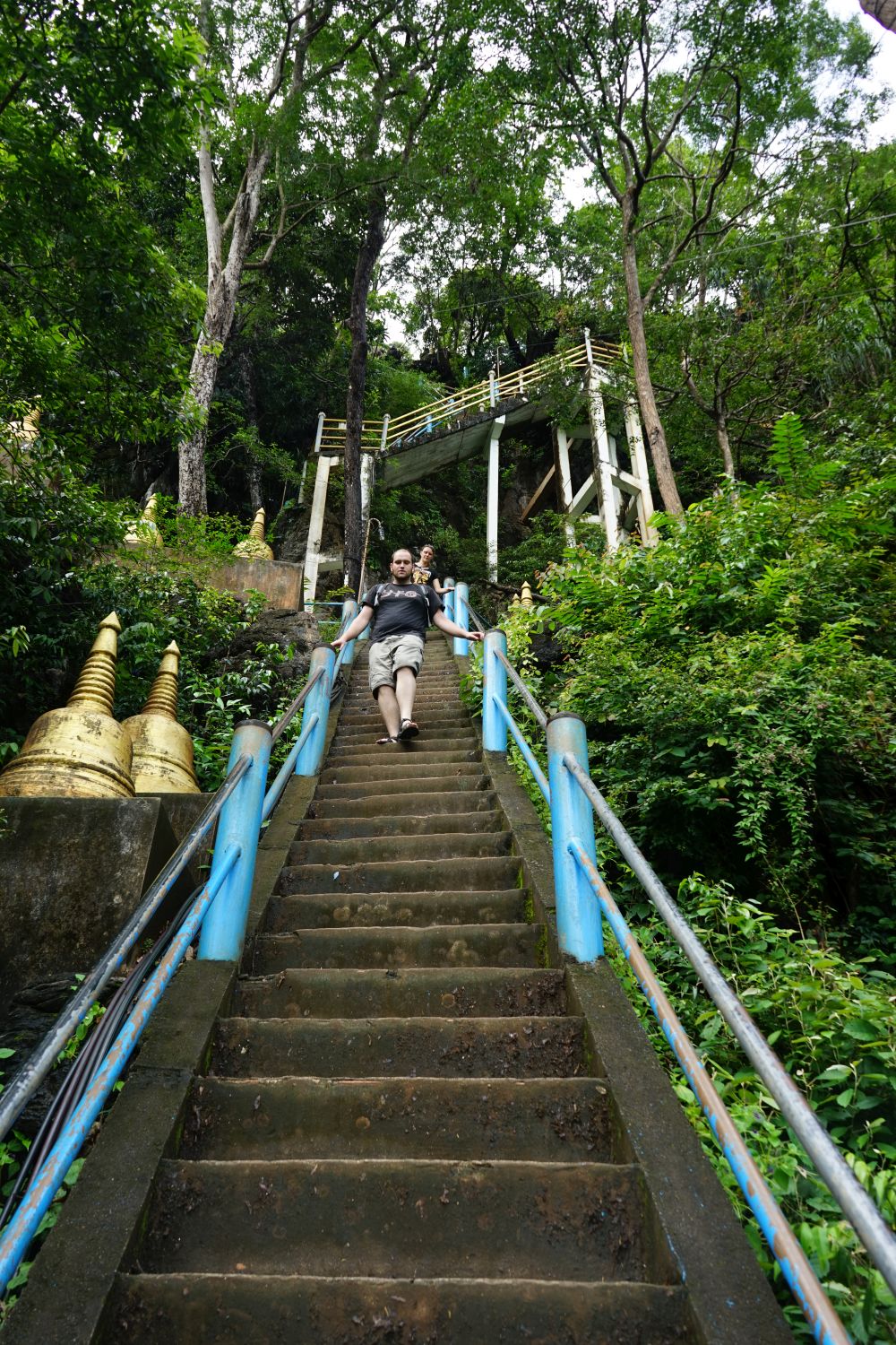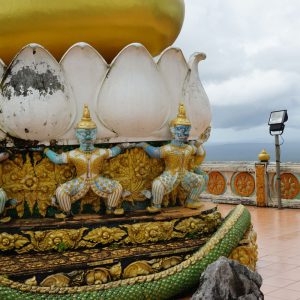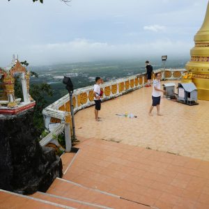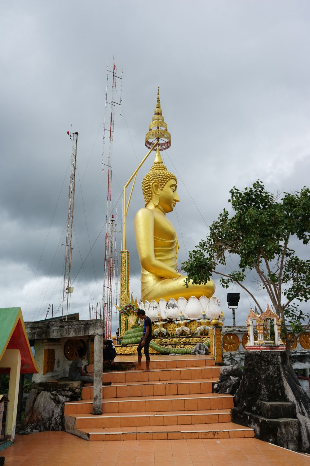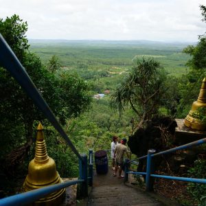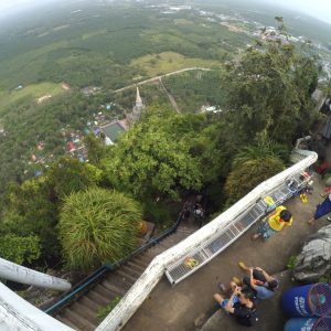 Am nächsten Mittag ging es für Philip und mich zum Wat Tham Suea Tempel (Tiger Cave Temple). Dieser teilt sich in zwei Bereiche auf. Zum einen die Tempelanlage am Fuße des Berges sowie der große sitzende Buddha auf der Bergspitze. Diese kann nur per Fuß erreicht werden, genau gesagt über 1237 Stufen hinweg. Als der Buddha noch im Bau war, wurden Touristen gebeten Baumaterial mit auf die Bergspitze zu tragen, glücklicherweise ist das aktuell nicht mehr so. Was aber nicht bedeutet das der Aufstieg nur im Ansatz leicht gewesen wäre. Nach einem hohen Tempo die erste Hälfte der Stufen kroch ich förmlich nur noch die letzten Stufen hoch. Als wir dann schweißgebadet am Gipfel ankamen, wurden wir zumindest mit einer herrlichen Aussicht sowie einer kühlen Brise belohnt. Nach gut einer drei viertel Stunde ausschwitzen und Bilder machen ging es dann wieder den Berg hinunter, der Abstieg verlief bis auf einen Regenschauer problemfrei und den Rest des Tages wurde faul im Hotelzimmer verbracht.