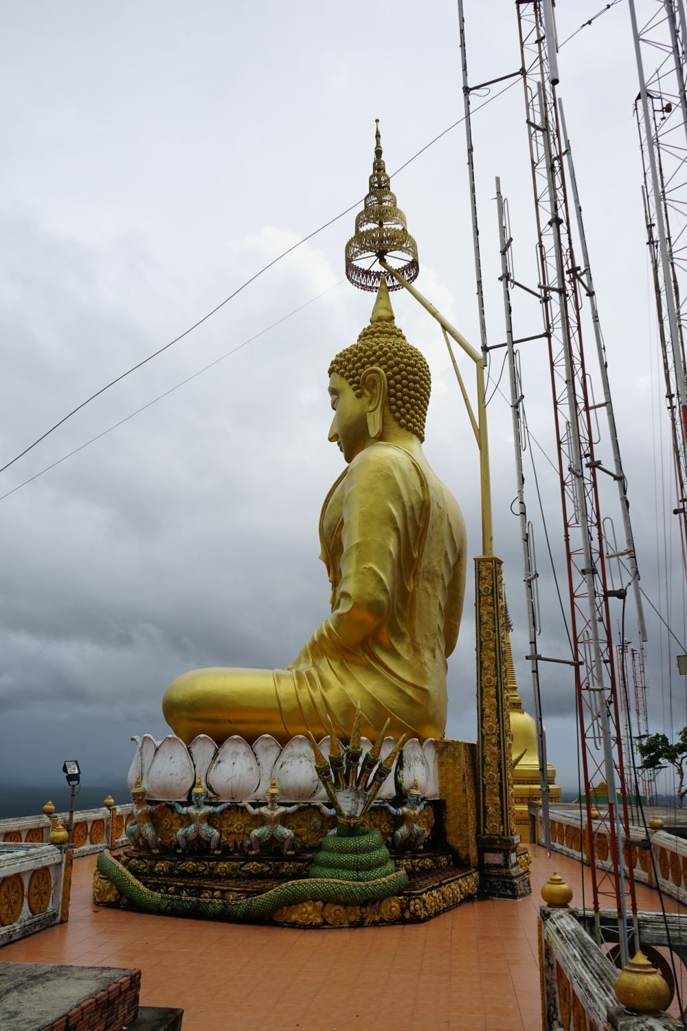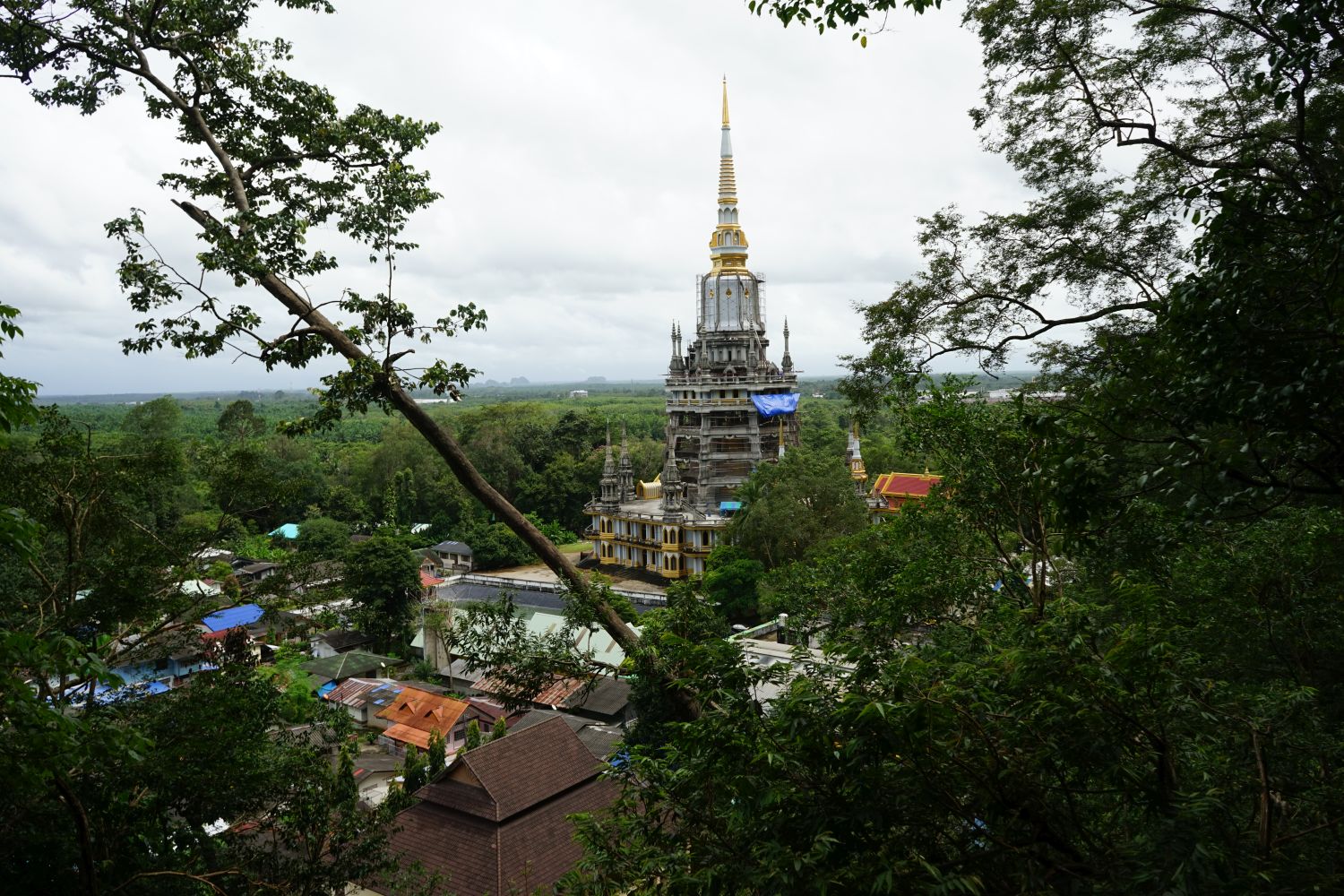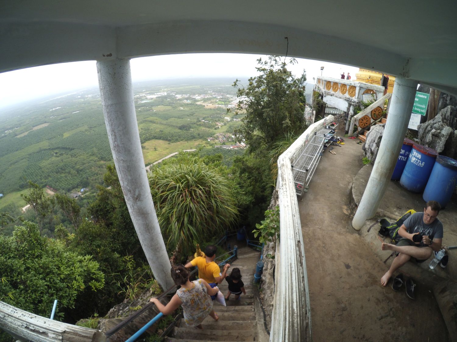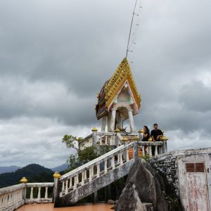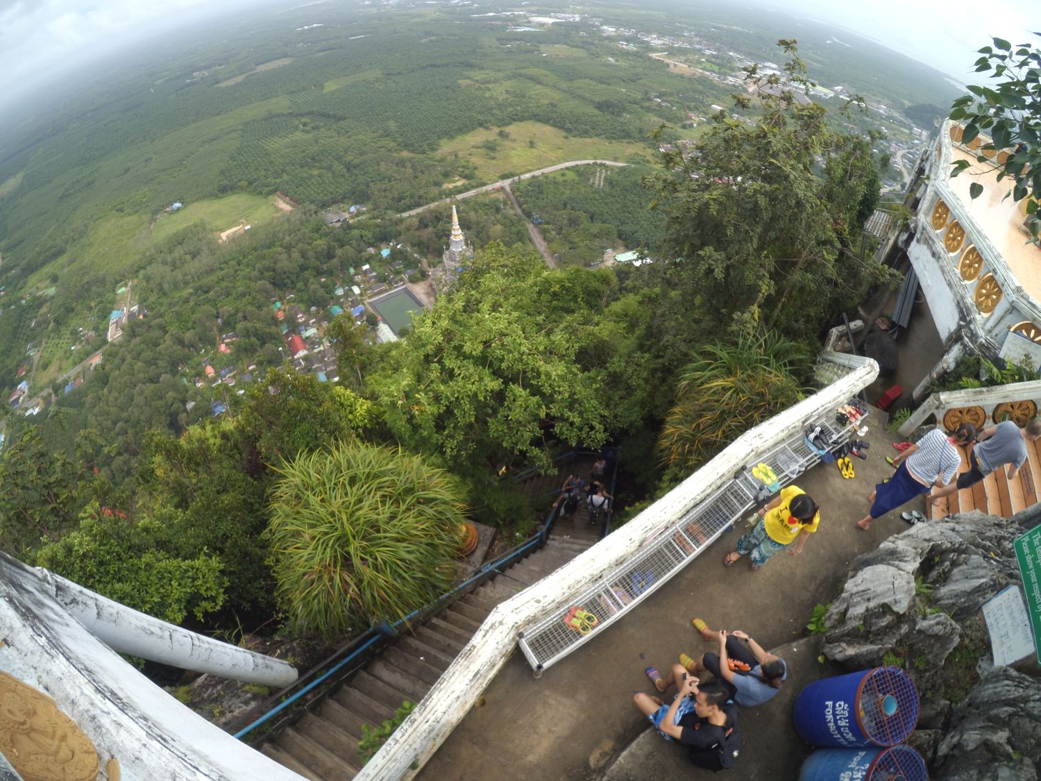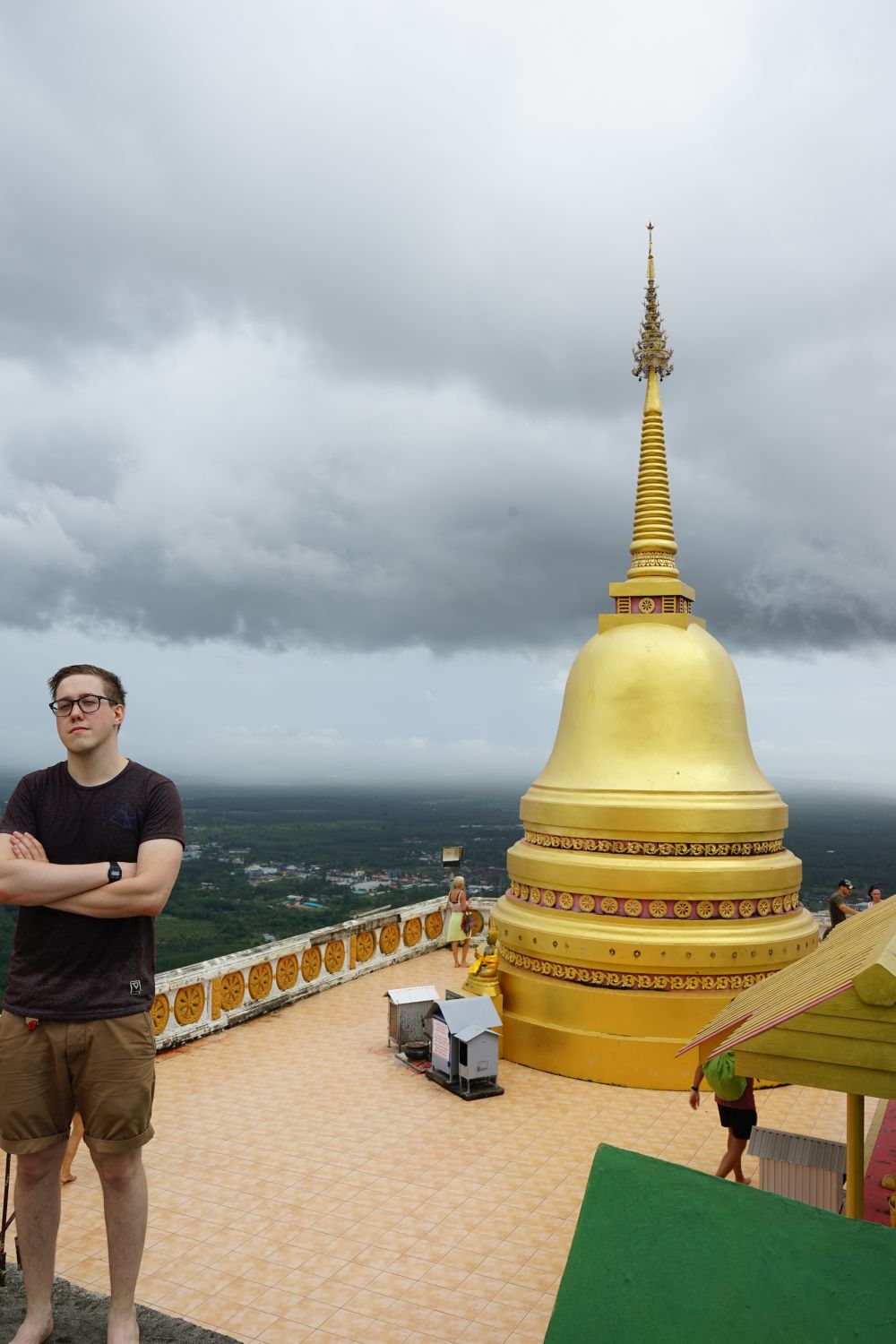 Am nächsten Mittag ging es für Philip und mich zum Wat Tham Suea Tempel (Tiger Cave Temple). Dieser teilt sich in zwei Bereiche auf. Zum einen die Tempelanlage am Fuße des Berges sowie der große sitzende Buddha auf der Bergspitze. Diese kann nur per Fuß erreicht werden, genau gesagt über 1237 Stufen hinweg. Als der Buddha noch im Bau war, wurden Touristen gebeten Baumaterial mit auf die Bergspitze zu tragen, glücklicherweise ist das aktuell nicht mehr so. Was aber nicht bedeutet das der Aufstieg nur im Ansatz leicht gewesen wäre. Nach einem hohen Tempo die erste Hälfte der Stufen kroch ich förmlich nur noch die letzten Stufen hoch. Als wir dann schweißgebadet am Gipfel ankamen, wurden wir zumindest mit einer herrlichen Aussicht sowie einer kühlen Brise belohnt. Nach gut einer drei viertel Stunde ausschwitzen und Bilder machen ging es dann wieder den Berg hinunter, der Abstieg verlief bis auf einen Regenschauer problemfrei und den Rest des Tages wurde faul im Hotelzimmer verbracht.