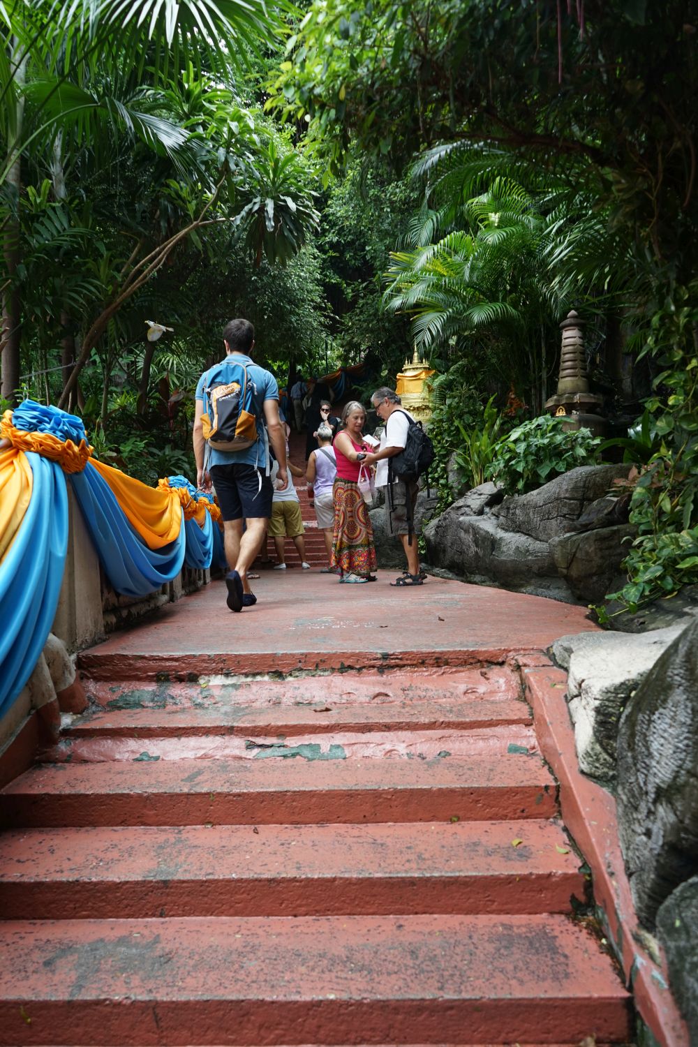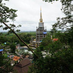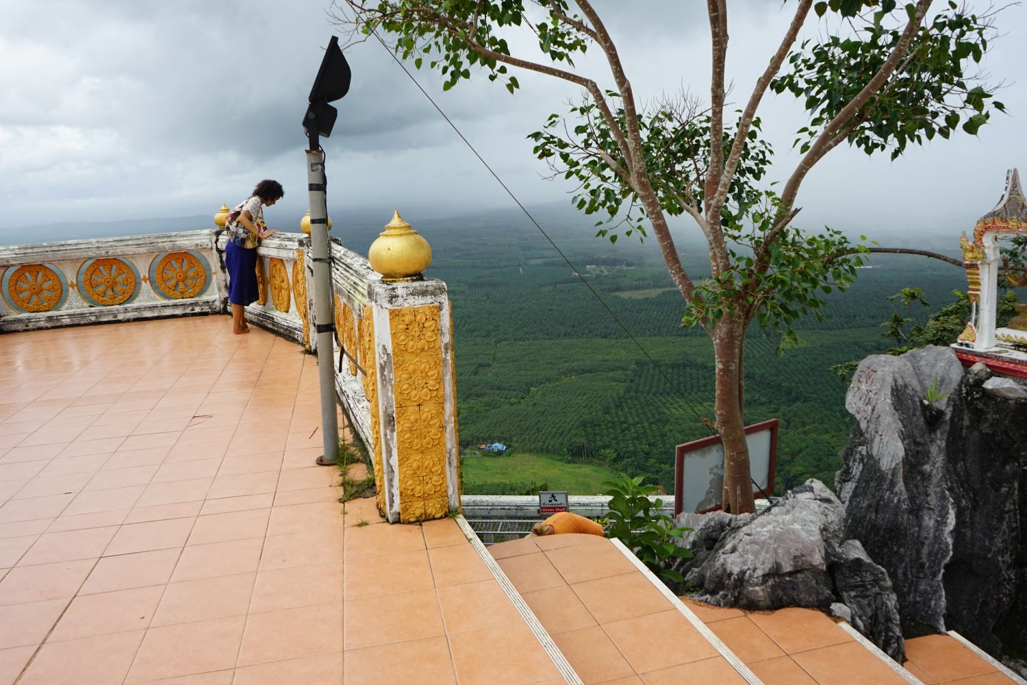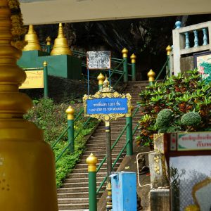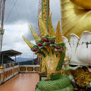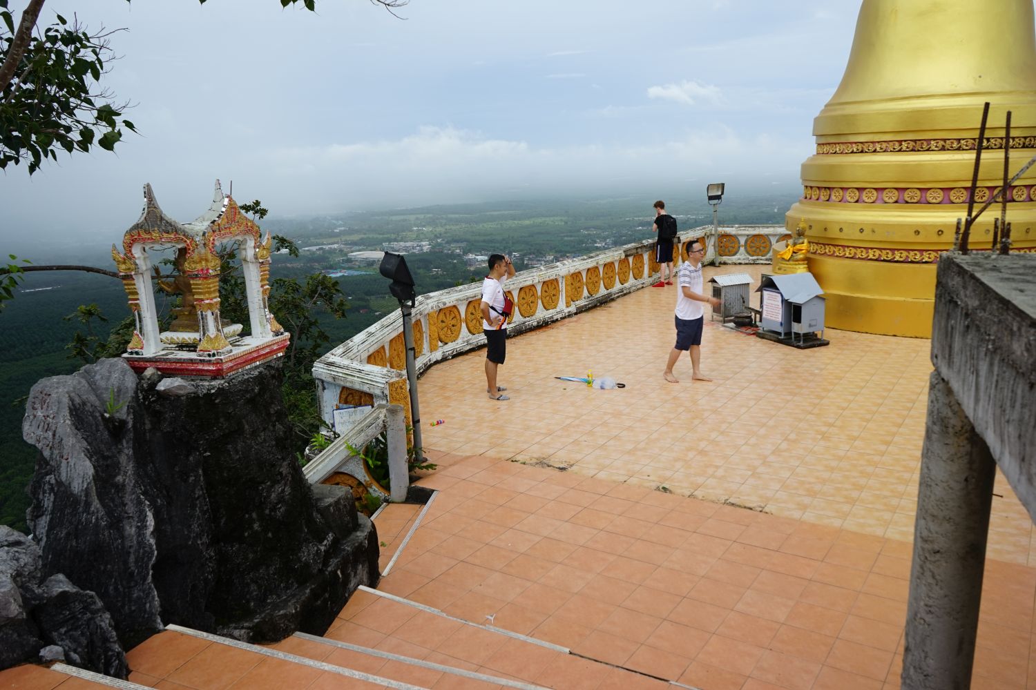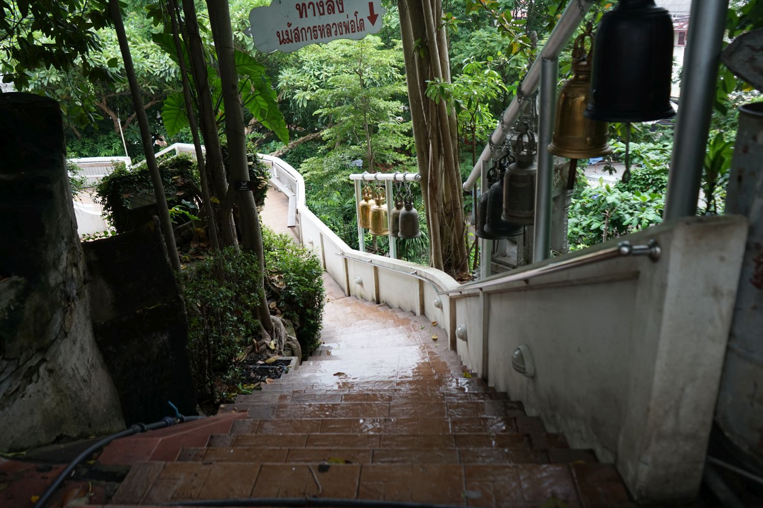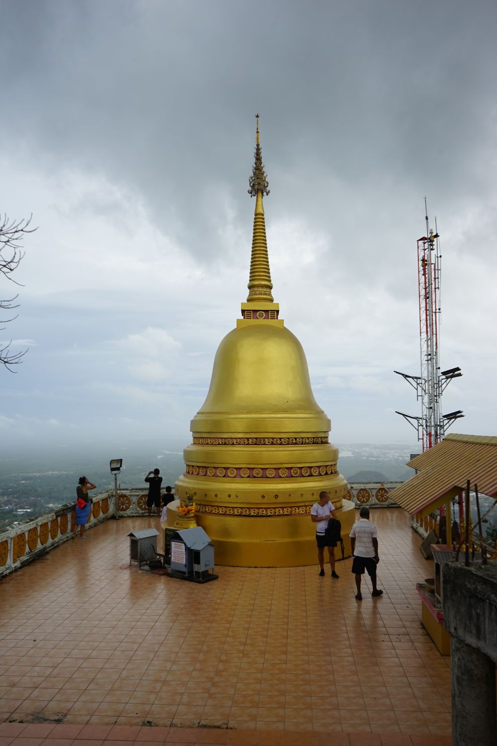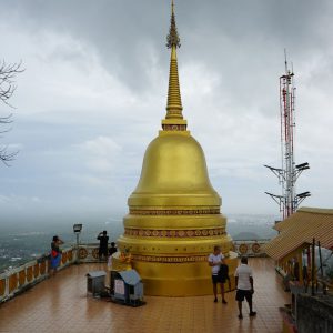 Am nächsten Mittag ging es für Philip und mich zum Wat Tham Suea Tempel (Tiger Cave Temple). Dieser teilt sich in zwei Bereiche auf. Zum einen die Tempelanlage am Fuße des Berges sowie der große sitzende Buddha auf der Bergspitze. Diese kann nur per Fuß erreicht werden, genau gesagt über 1237 Stufen hinweg. Als der Buddha noch im Bau war, wurden Touristen gebeten Baumaterial mit auf die Bergspitze zu tragen, glücklicherweise ist das aktuell nicht mehr so. Was aber nicht bedeutet das der Aufstieg nur im Ansatz leicht gewesen wäre. Nach einem hohen Tempo die erste Hälfte der Stufen kroch ich förmlich nur noch die letzten Stufen hoch. Als wir dann schweißgebadet am Gipfel ankamen, wurden wir zumindest mit einer herrlichen Aussicht sowie einer kühlen Brise belohnt. Nach gut einer drei viertel Stunde ausschwitzen und Bilder machen ging es dann wieder den Berg hinunter, der Abstieg verlief bis auf einen Regenschauer problemfrei und den Rest des Tages wurde faul im Hotelzimmer verbracht.