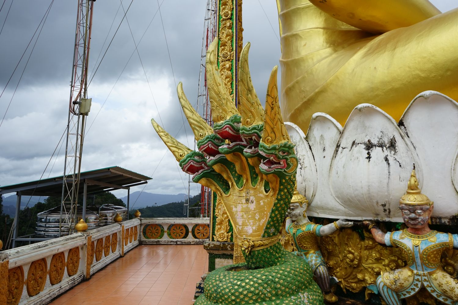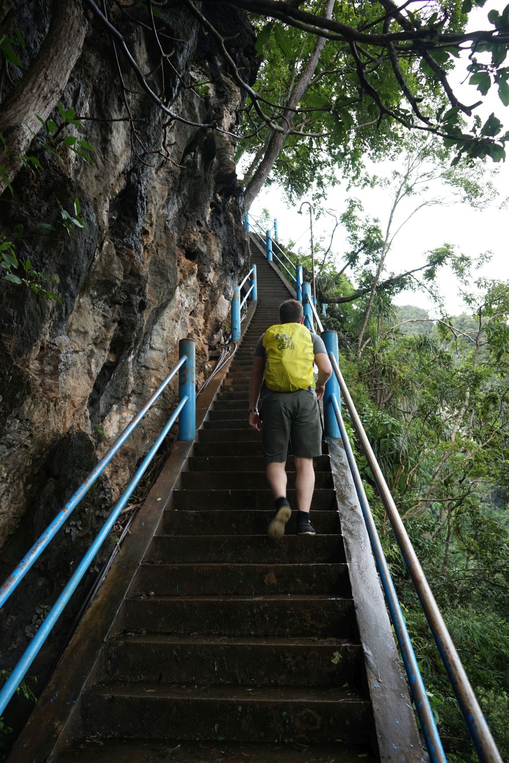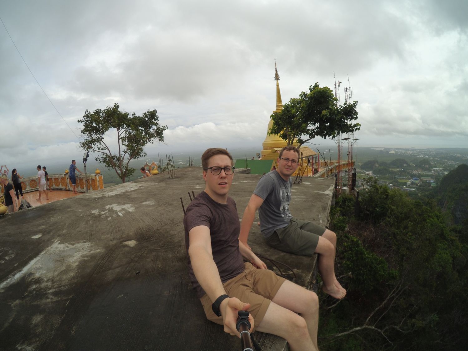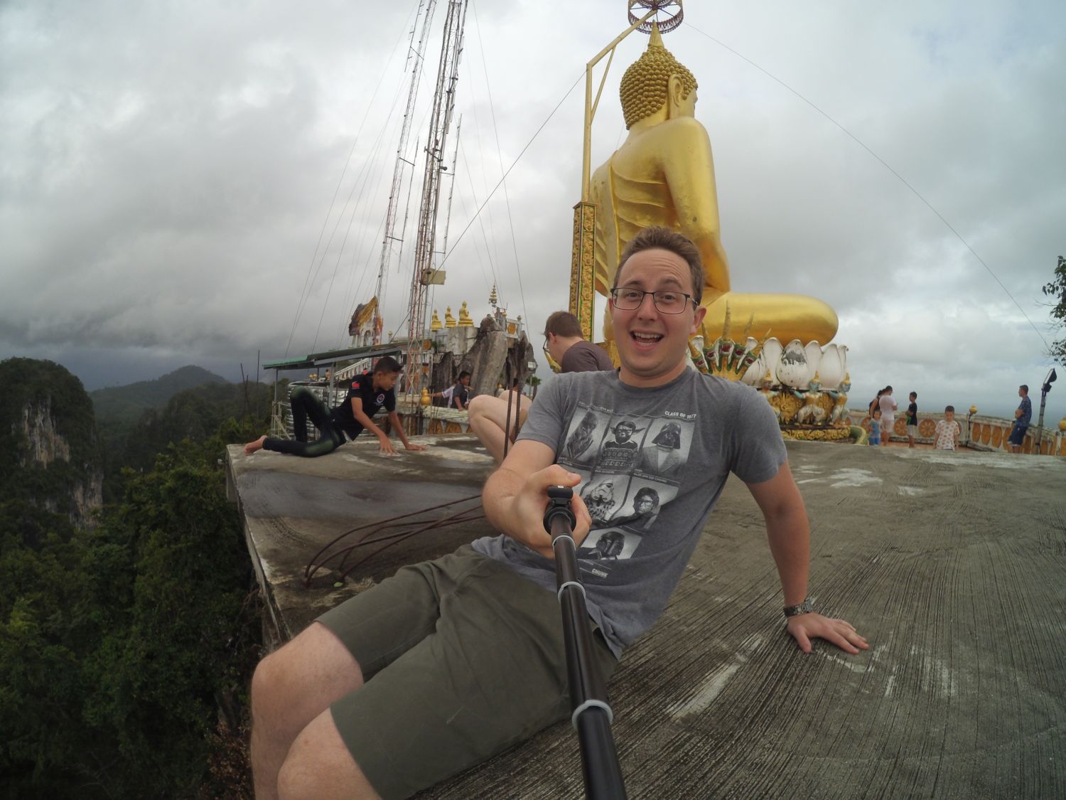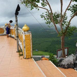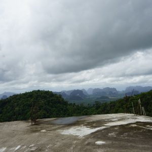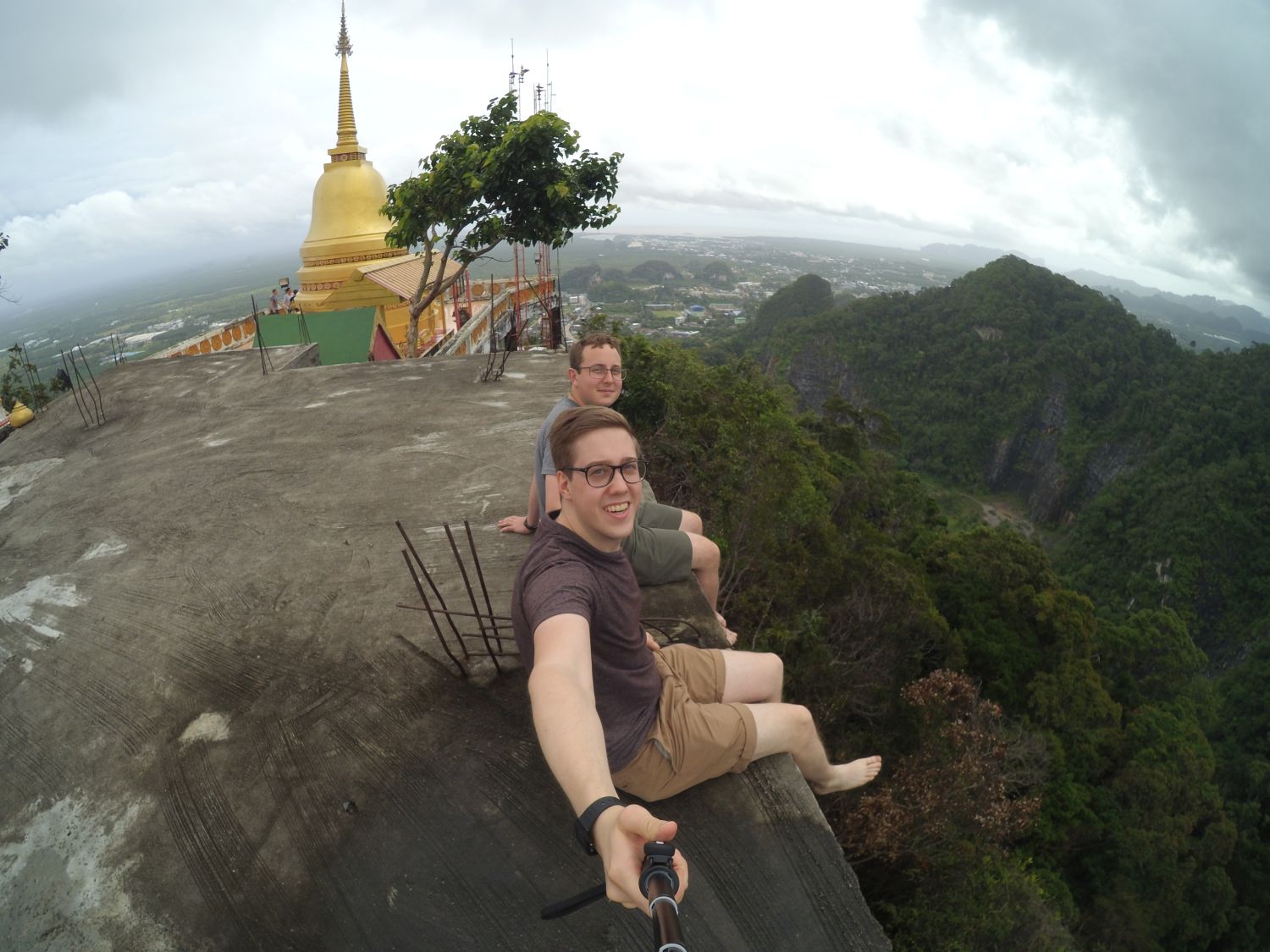 Am nächsten Mittag ging es für Philip und mich zum Wat Tham Suea Tempel (Tiger Cave Temple). Dieser teilt sich in zwei Bereiche auf. Zum einen die Tempelanlage am Fuße des Berges sowie der große sitzende Buddha auf der Bergspitze. Diese kann nur per Fuß erreicht werden, genau gesagt über 1237 Stufen hinweg. Als der Buddha noch im Bau war, wurden Touristen gebeten Baumaterial mit auf die Bergspitze zu tragen, glücklicherweise ist das aktuell nicht mehr so. Was aber nicht bedeutet das der Aufstieg nur im Ansatz leicht gewesen wäre. Nach einem hohen Tempo die erste Hälfte der Stufen kroch ich förmlich nur noch die letzten Stufen hoch. Als wir dann schweißgebadet am Gipfel ankamen, wurden wir zumindest mit einer herrlichen Aussicht sowie einer kühlen Brise belohnt. Nach gut einer drei viertel Stunde ausschwitzen und Bilder machen ging es dann wieder den Berg hinunter, der Abstieg verlief bis auf einen Regenschauer problemfrei und den Rest des Tages wurde faul im Hotelzimmer verbracht.