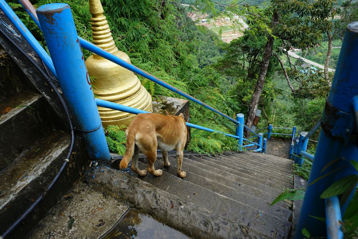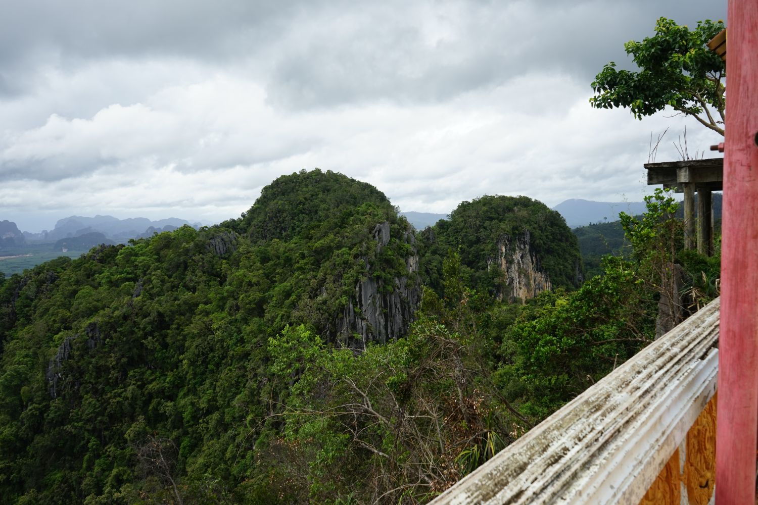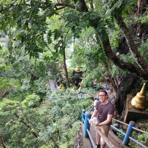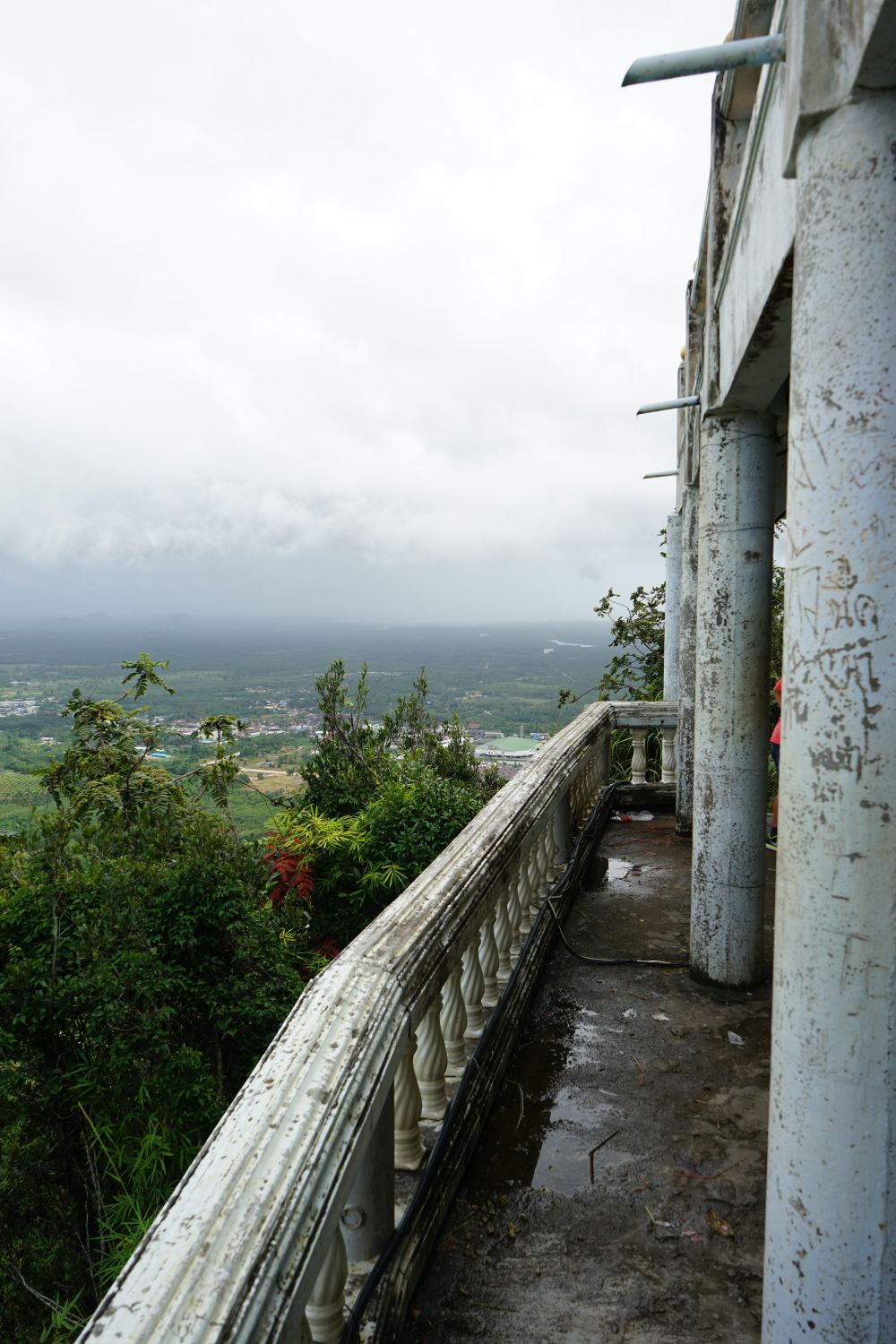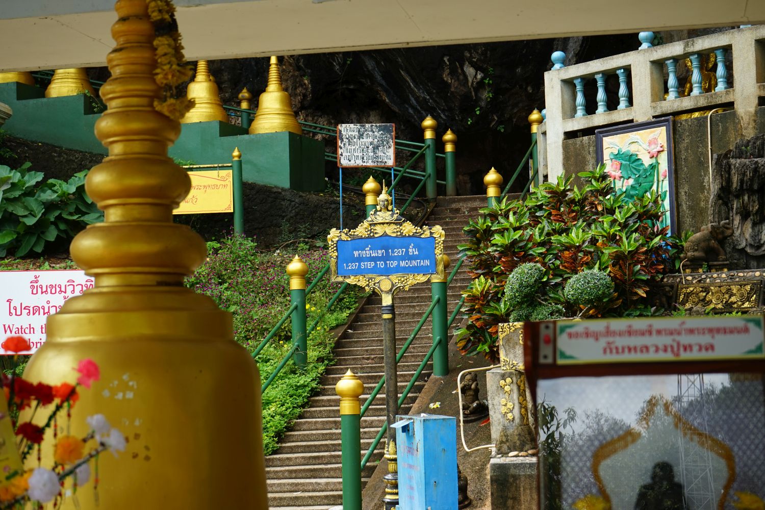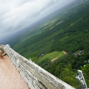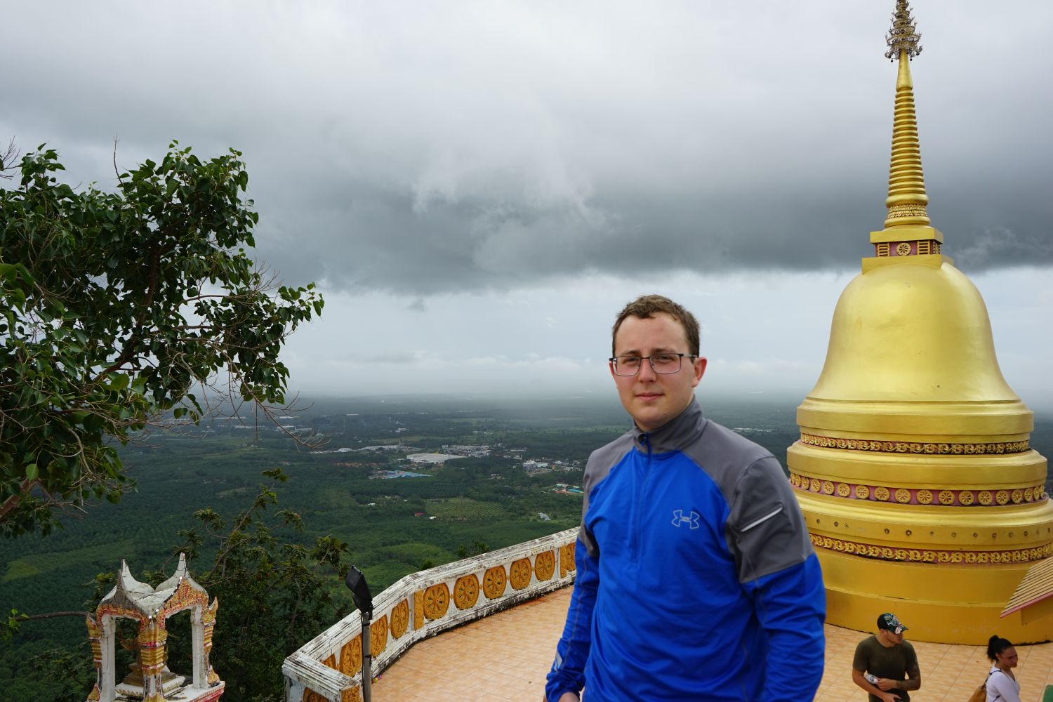 Am nächsten Mittag ging es für Philip und mich zum Wat Tham Suea Tempel (Tiger Cave Temple). Dieser teilt sich in zwei Bereiche auf. Zum einen die Tempelanlage am Fuße des Berges sowie der große sitzende Buddha auf der Bergspitze. Diese kann nur per Fuß erreicht werden, genau gesagt über 1237 Stufen hinweg. Als der Buddha noch im Bau war, wurden Touristen gebeten Baumaterial mit auf die Bergspitze zu tragen, glücklicherweise ist das aktuell nicht mehr so. Was aber nicht bedeutet das der Aufstieg nur im Ansatz leicht gewesen wäre. Nach einem hohen Tempo die erste Hälfte der Stufen kroch ich förmlich nur noch die letzten Stufen hoch. Als wir dann schweißgebadet am Gipfel ankamen, wurden wir zumindest mit einer herrlichen Aussicht sowie einer kühlen Brise belohnt. Nach gut einer drei viertel Stunde ausschwitzen und Bilder machen ging es dann wieder den Berg hinunter, der Abstieg verlief bis auf einen Regenschauer problemfrei und den Rest des Tages wurde faul im Hotelzimmer verbracht.