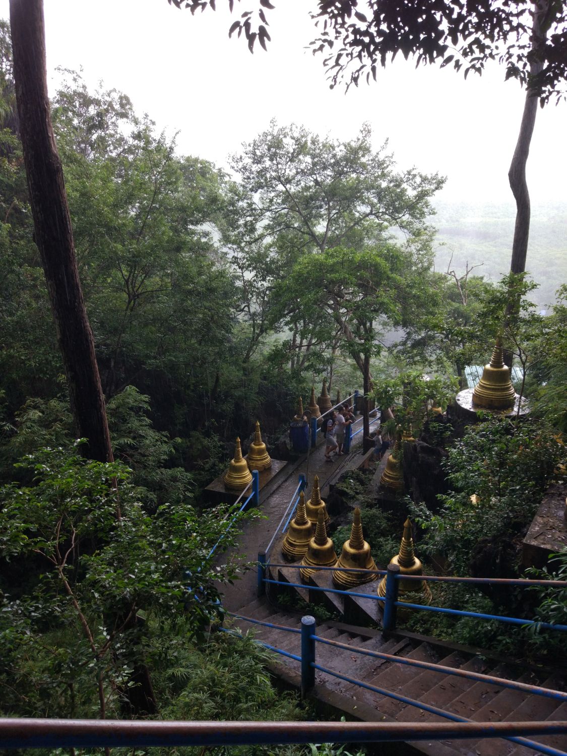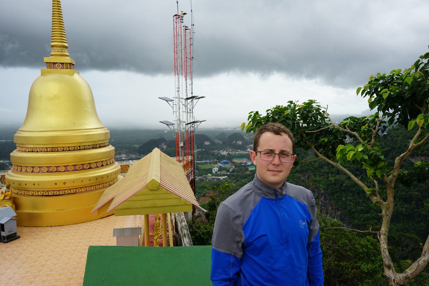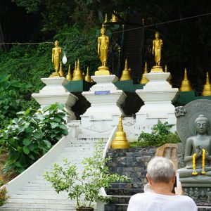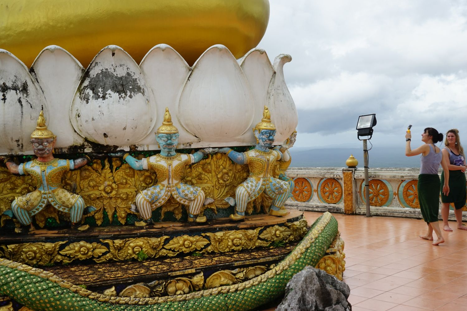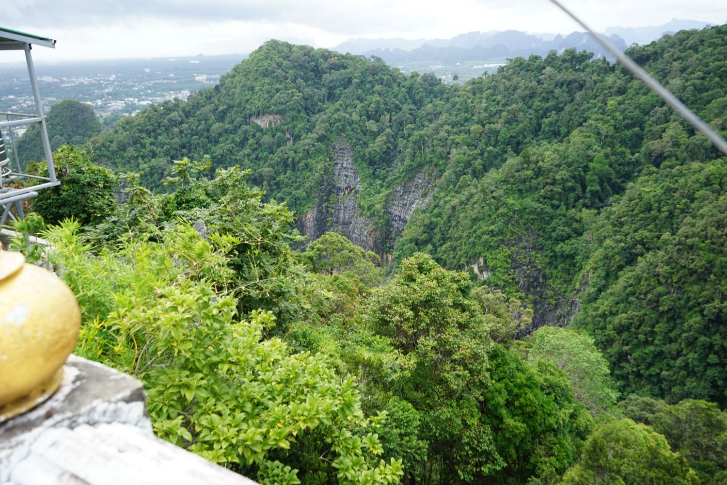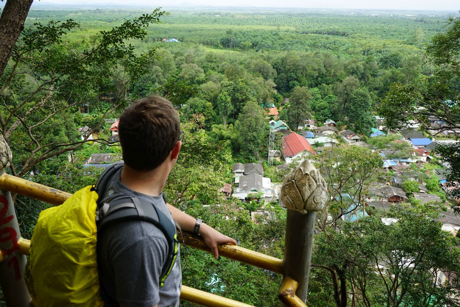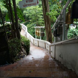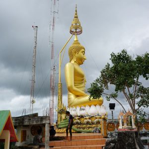 Am nächsten Mittag ging es für Philip und mich zum Wat Tham Suea Tempel (Tiger Cave Temple). Dieser teilt sich in zwei Bereiche auf. Zum einen die Tempelanlage am Fuße des Berges sowie der große sitzende Buddha auf der Bergspitze. Diese kann nur per Fuß erreicht werden, genau gesagt über 1237 Stufen hinweg. Als der Buddha noch im Bau war, wurden Touristen gebeten Baumaterial mit auf die Bergspitze zu tragen, glücklicherweise ist das aktuell nicht mehr so. Was aber nicht bedeutet das der Aufstieg nur im Ansatz leicht gewesen wäre. Nach einem hohen Tempo die erste Hälfte der Stufen kroch ich förmlich nur noch die letzten Stufen hoch. Als wir dann schweißgebadet am Gipfel ankamen, wurden wir zumindest mit einer herrlichen Aussicht sowie einer kühlen Brise belohnt. Nach gut einer drei viertel Stunde ausschwitzen und Bilder machen ging es dann wieder den Berg hinunter, der Abstieg verlief bis auf einen Regenschauer problemfrei und den Rest des Tages wurde faul im Hotelzimmer verbracht.
