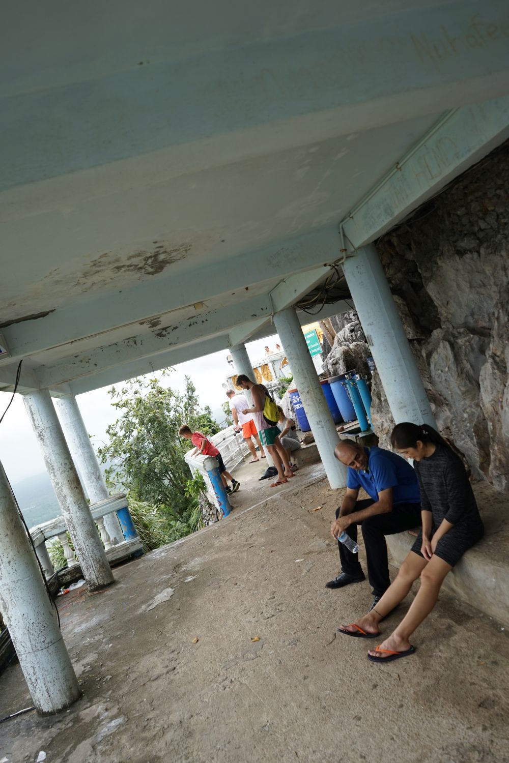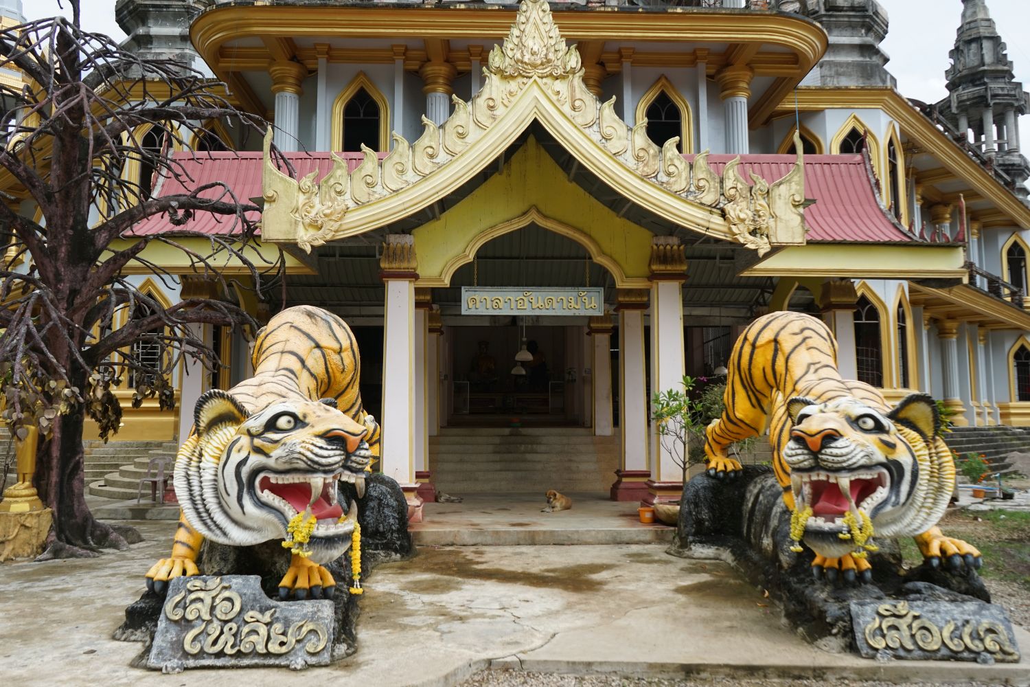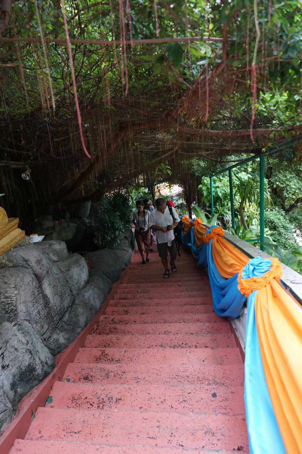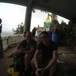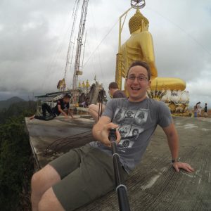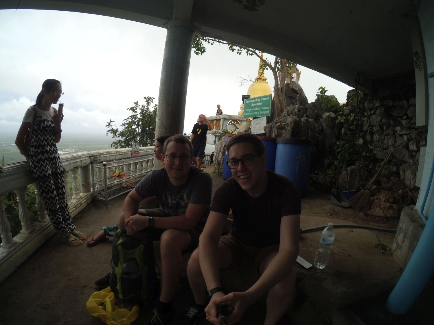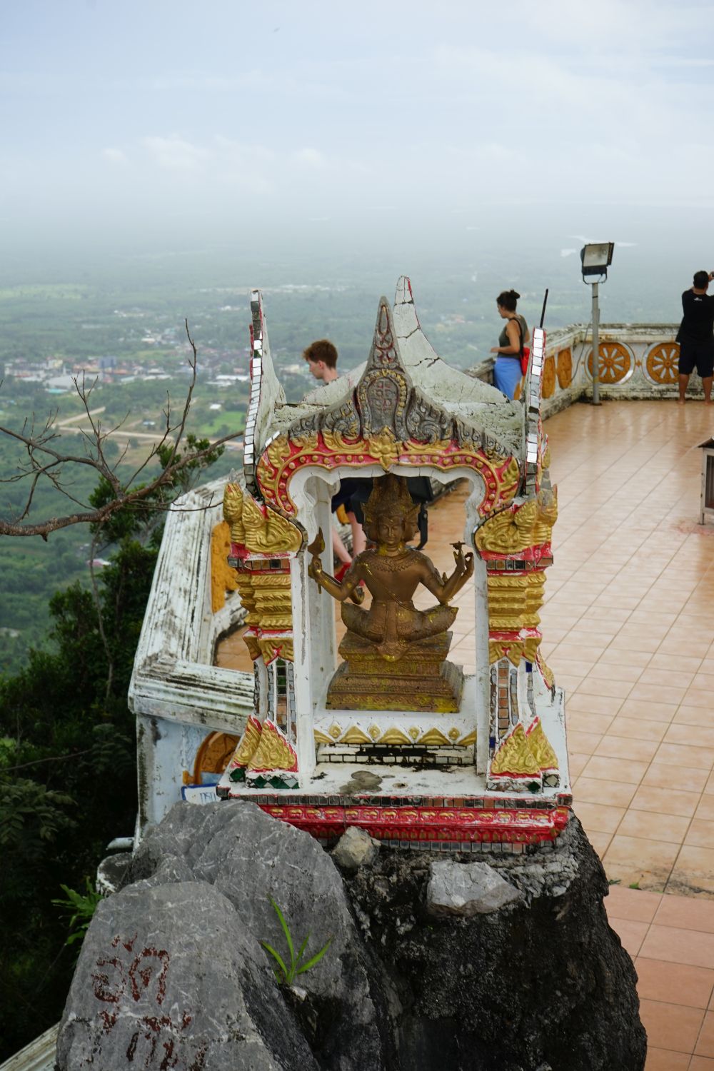 Am nächsten Mittag ging es für Philip und mich zum Wat Tham Suea Tempel (Tiger Cave Temple). Dieser teilt sich in zwei Bereiche auf. Zum einen die Tempelanlage am Fuße des Berges sowie der große sitzende Buddha auf der Bergspitze. Diese kann nur per Fuß erreicht werden, genau gesagt über 1237 Stufen hinweg. Als der Buddha noch im Bau war, wurden Touristen gebeten Baumaterial mit auf die Bergspitze zu tragen, glücklicherweise ist das aktuell nicht mehr so. Was aber nicht bedeutet das der Aufstieg nur im Ansatz leicht gewesen wäre. Nach einem hohen Tempo die erste Hälfte der Stufen kroch ich förmlich nur noch die letzten Stufen hoch. Als wir dann schweißgebadet am Gipfel ankamen, wurden wir zumindest mit einer herrlichen Aussicht sowie einer kühlen Brise belohnt. Nach gut einer drei viertel Stunde ausschwitzen und Bilder machen ging es dann wieder den Berg hinunter, der Abstieg verlief bis auf einen Regenschauer problemfrei und den Rest des Tages wurde faul im Hotelzimmer verbracht.