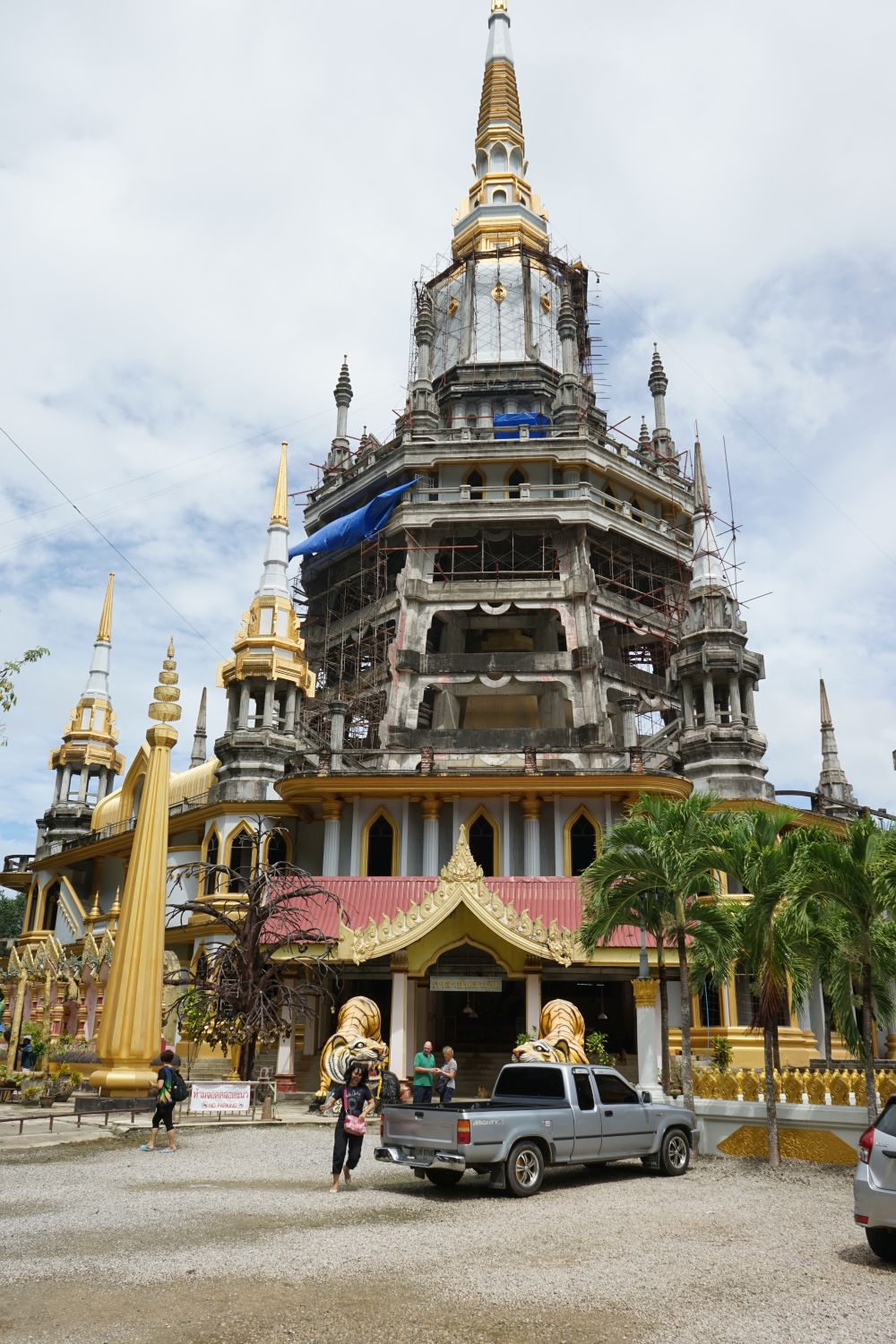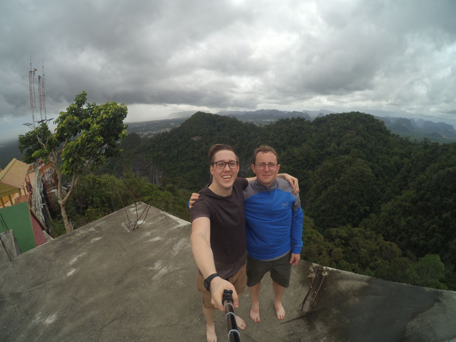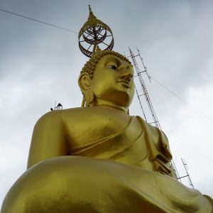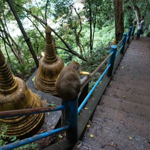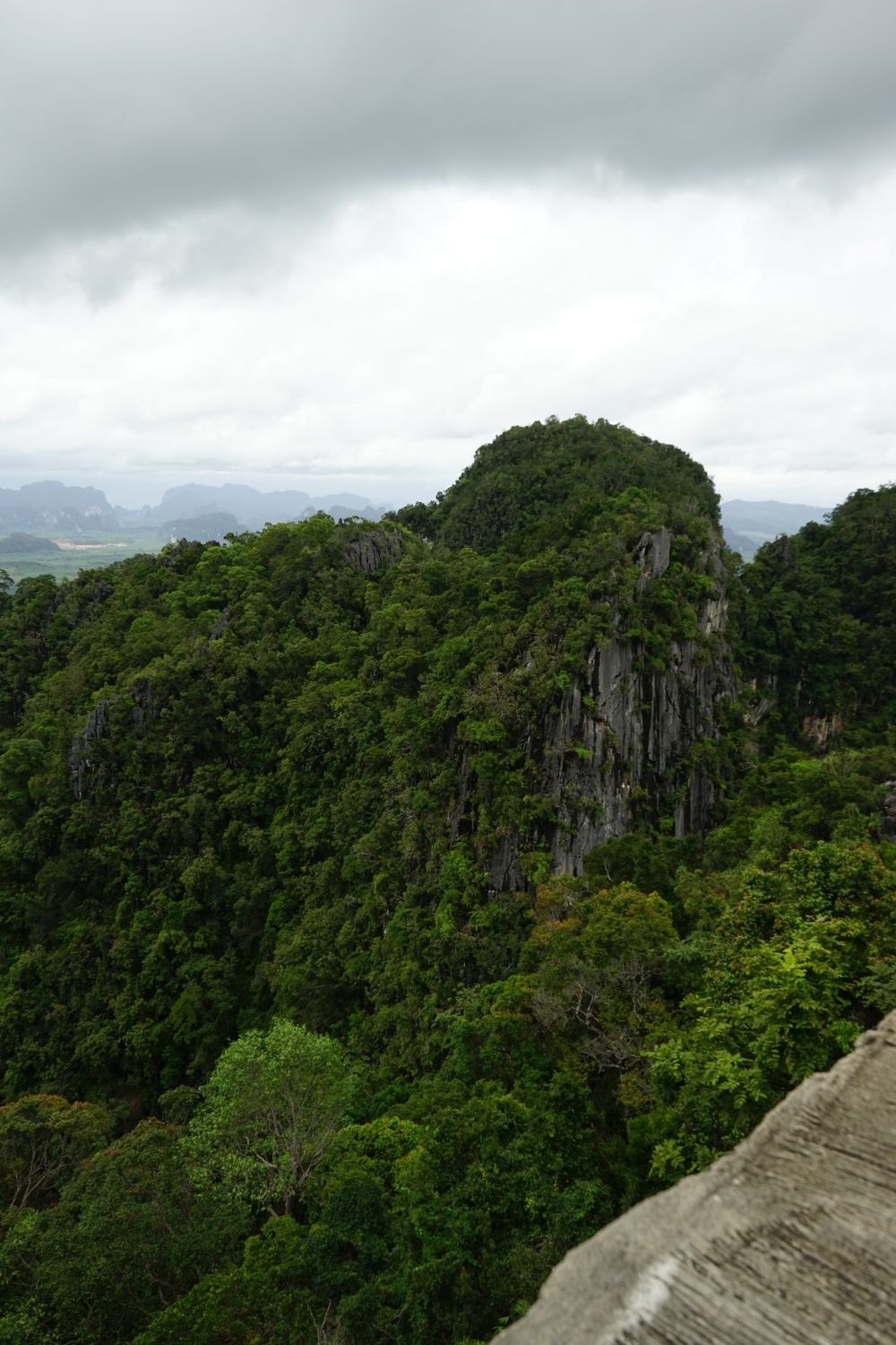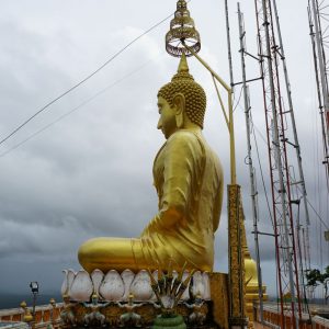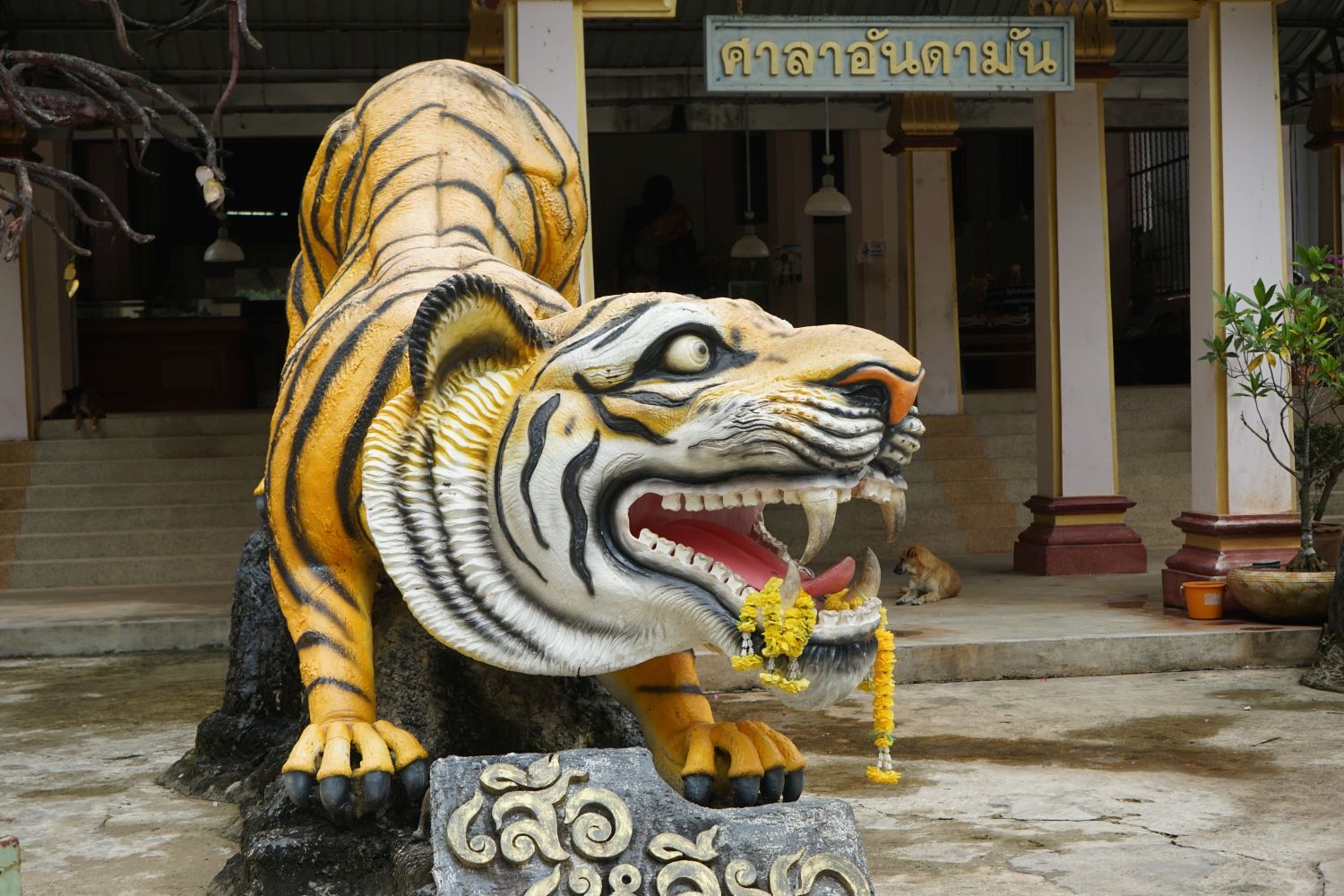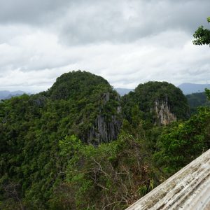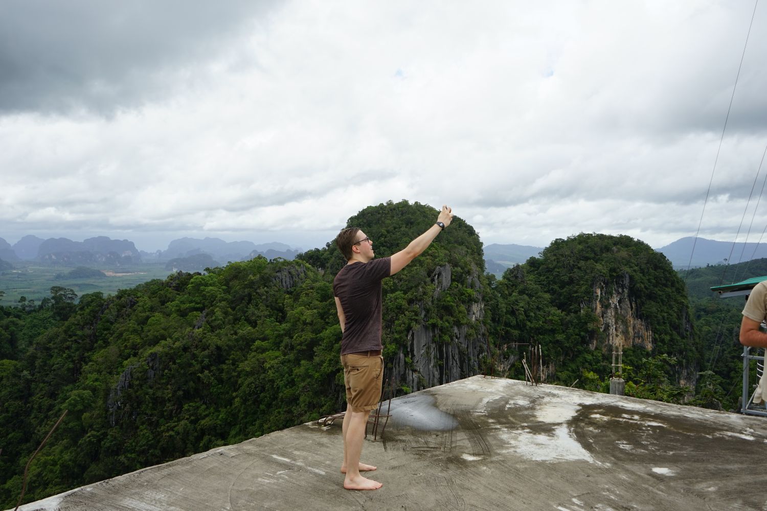 Am nächsten Mittag ging es für Philip und mich zum Wat Tham Suea Tempel (Tiger Cave Temple). Dieser teilt sich in zwei Bereiche auf. Zum einen die Tempelanlage am Fuße des Berges sowie der große sitzende Buddha auf der Bergspitze. Diese kann nur per Fuß erreicht werden, genau gesagt über 1237 Stufen hinweg. Als der Buddha noch im Bau war, wurden Touristen gebeten Baumaterial mit auf die Bergspitze zu tragen, glücklicherweise ist das aktuell nicht mehr so. Was aber nicht bedeutet das der Aufstieg nur im Ansatz leicht gewesen wäre. Nach einem hohen Tempo die erste Hälfte der Stufen kroch ich förmlich nur noch die letzten Stufen hoch. Als wir dann schweißgebadet am Gipfel ankamen, wurden wir zumindest mit einer herrlichen Aussicht sowie einer kühlen Brise belohnt. Nach gut einer drei viertel Stunde ausschwitzen und Bilder machen ging es dann wieder den Berg hinunter, der Abstieg verlief bis auf einen Regenschauer problemfrei und den Rest des Tages wurde faul im Hotelzimmer verbracht.