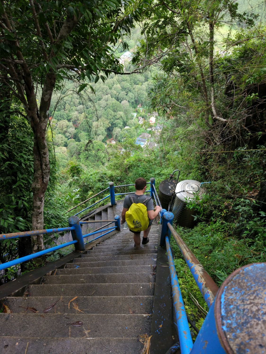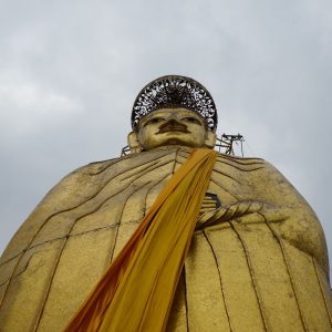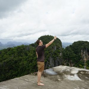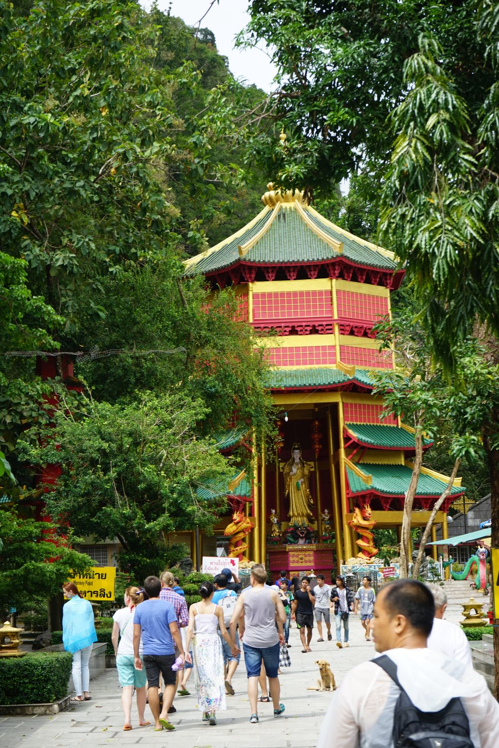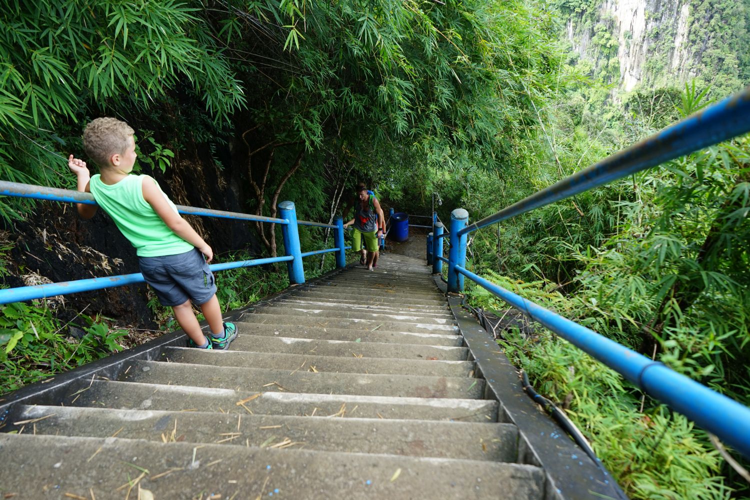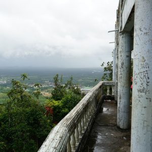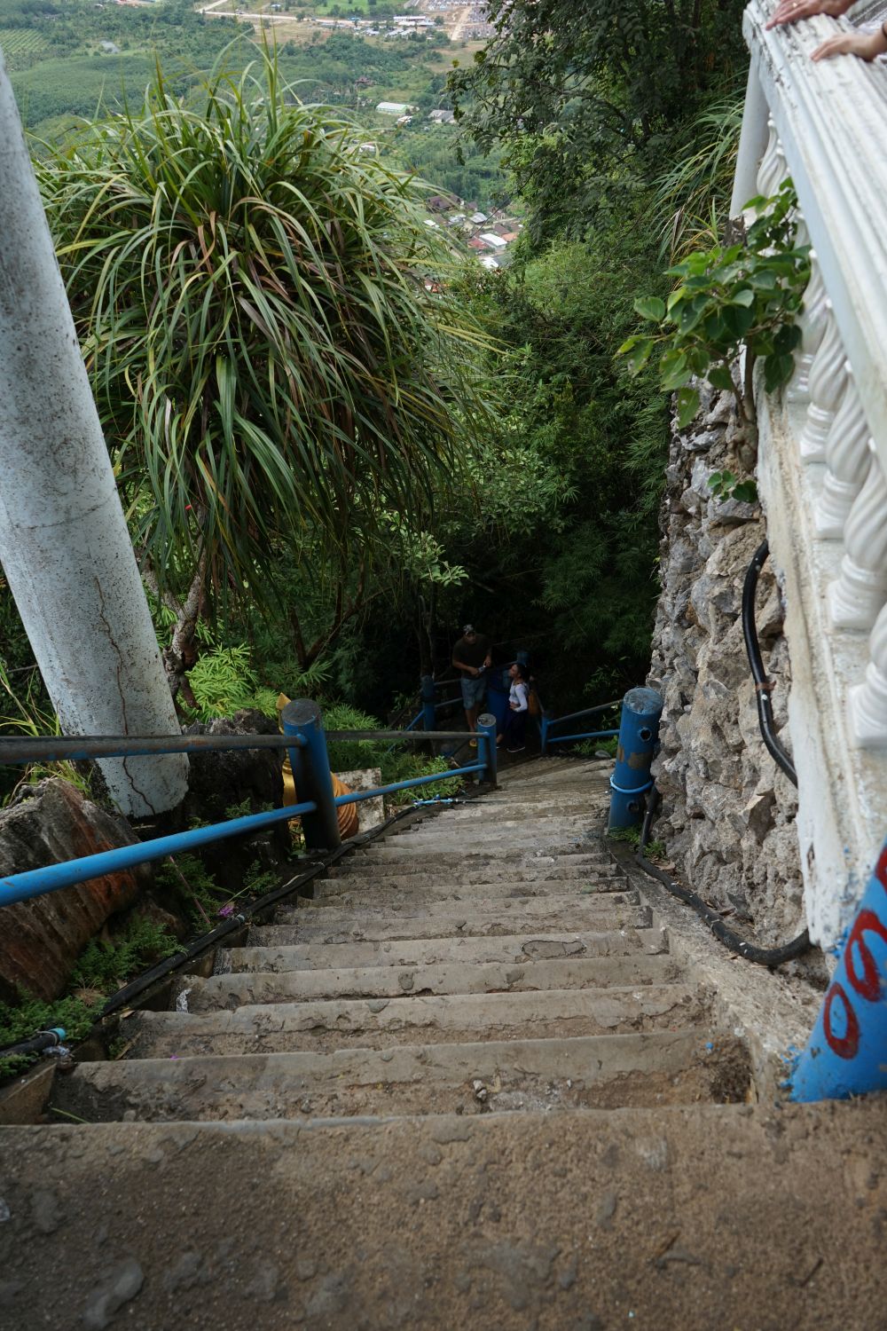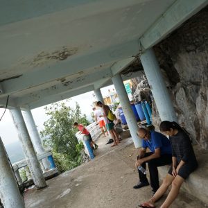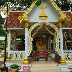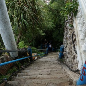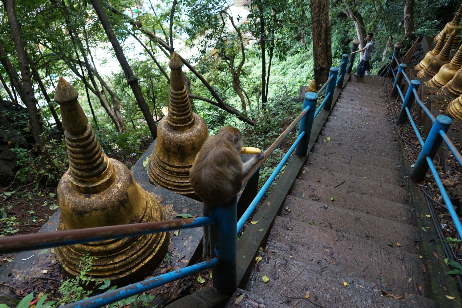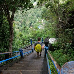Am nächsten Mittag ging es für Philip und mich zum Wat Tham Suea Tempel (Tiger Cave Temple). Dieser teilt sich in zwei Bereiche auf. Zum einen die Tempelanlage am Fuße des Berges sowie der große sitzende Buddha auf der Bergspitze. Diese kann nur per Fuß erreicht werden, genau gesagt über 1237 Stufen hinweg. Als der Buddha noch im Bau war, wurden Touristen gebeten Baumaterial mit auf die Bergspitze zu tragen, glücklicherweise ist das aktuell nicht mehr so. Was aber nicht bedeutet das der Aufstieg nur im Ansatz leicht gewesen wäre. Nach einem hohen Tempo die erste Hälfte der Stufen kroch ich förmlich nur noch die letzten Stufen hoch. Als wir dann schweißgebadet am Gipfel ankamen, wurden wir zumindest mit einer herrlichen Aussicht sowie einer kühlen Brise belohnt. Nach gut einer drei viertel Stunde ausschwitzen und Bilder machen ging es dann wieder den Berg hinunter, der Abstieg verlief bis auf einen Regenschauer problemfrei und den Rest des Tages wurde faul im Hotelzimmer verbracht.