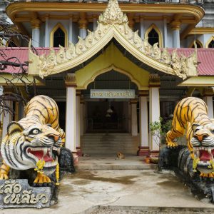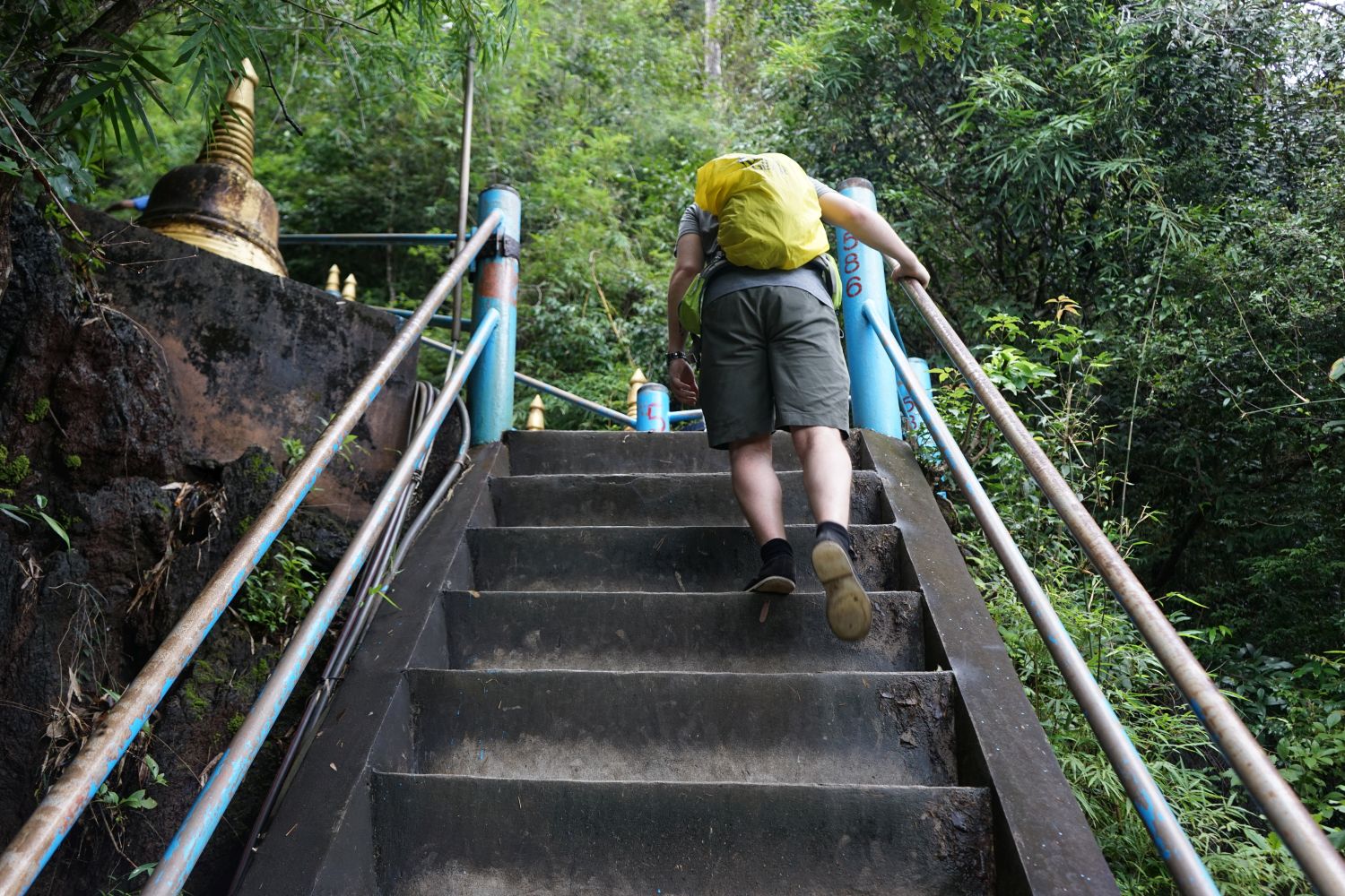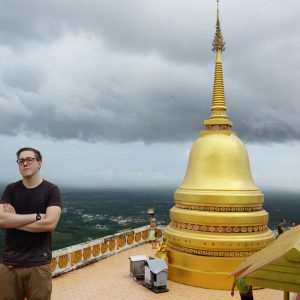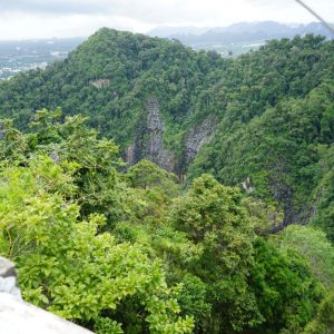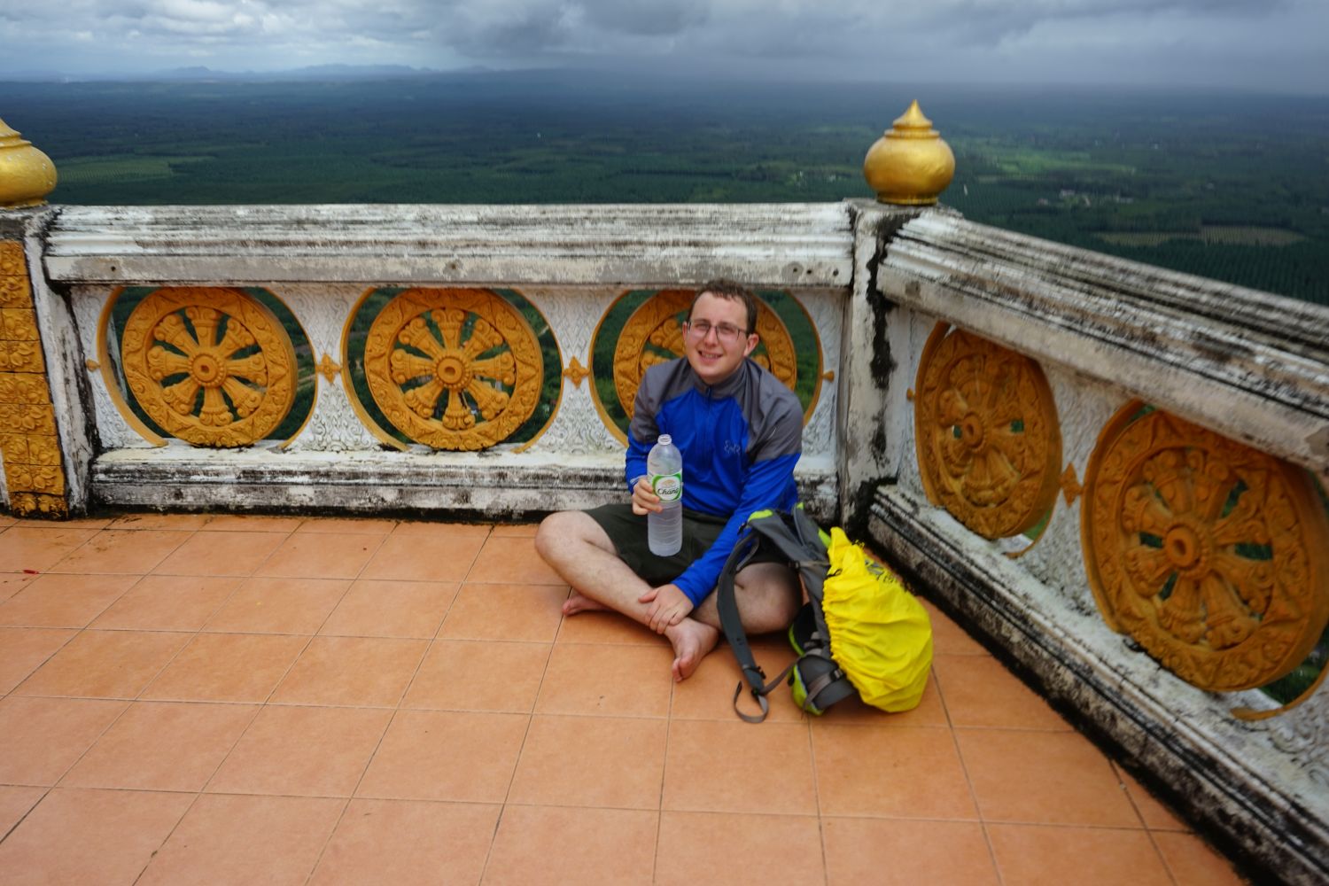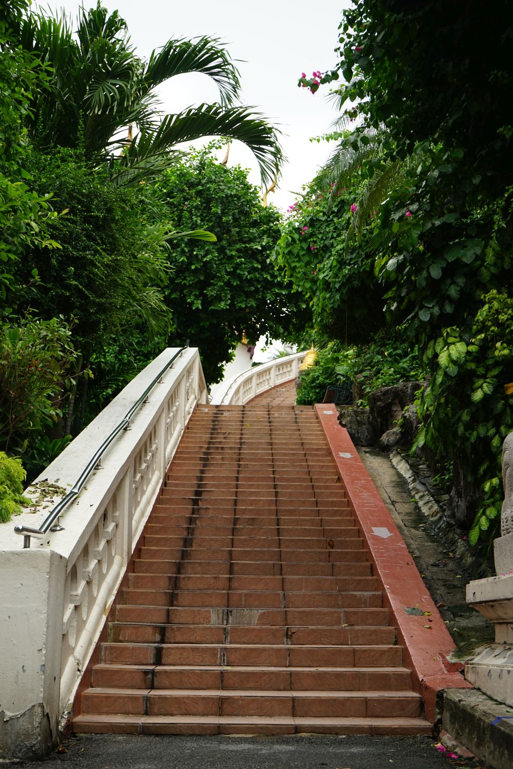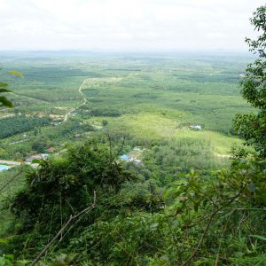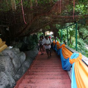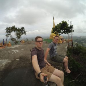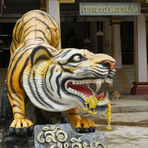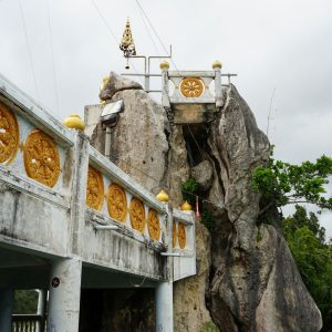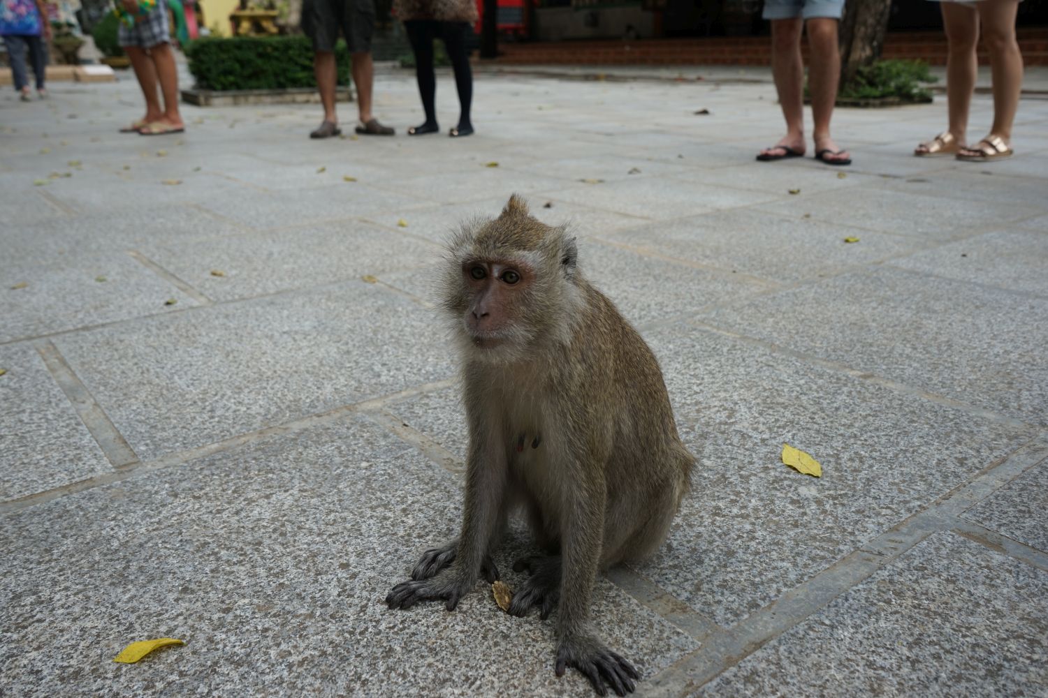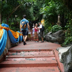 Am nächsten Mittag ging es für Philip und mich zum Wat Tham Suea Tempel (Tiger Cave Temple). Dieser teilt sich in zwei Bereiche auf. Zum einen die Tempelanlage am Fuße des Berges sowie der große sitzende Buddha auf der Bergspitze. Diese kann nur per Fuß erreicht werden, genau gesagt über 1237 Stufen hinweg. Als der Buddha noch im Bau war, wurden Touristen gebeten Baumaterial mit auf die Bergspitze zu tragen, glücklicherweise ist das aktuell nicht mehr so. Was aber nicht bedeutet das der Aufstieg nur im Ansatz leicht gewesen wäre. Nach einem hohen Tempo die erste Hälfte der Stufen kroch ich förmlich nur noch die letzten Stufen hoch. Als wir dann schweißgebadet am Gipfel ankamen, wurden wir zumindest mit einer herrlichen Aussicht sowie einer kühlen Brise belohnt. Nach gut einer drei viertel Stunde ausschwitzen und Bilder machen ging es dann wieder den Berg hinunter, der Abstieg verlief bis auf einen Regenschauer problemfrei und den Rest des Tages wurde faul im Hotelzimmer verbracht.