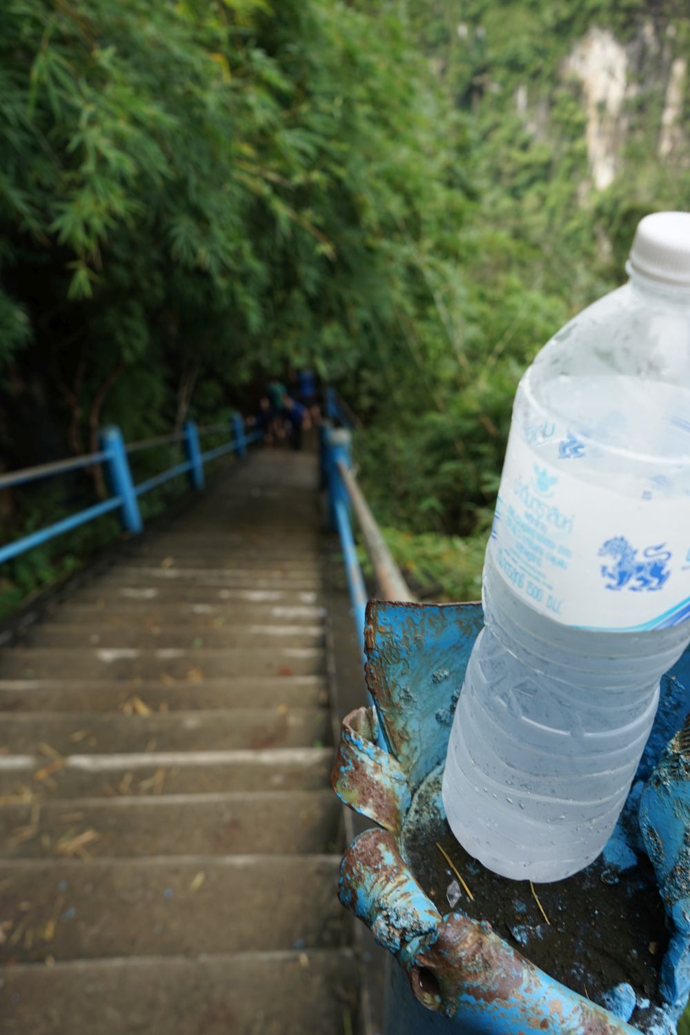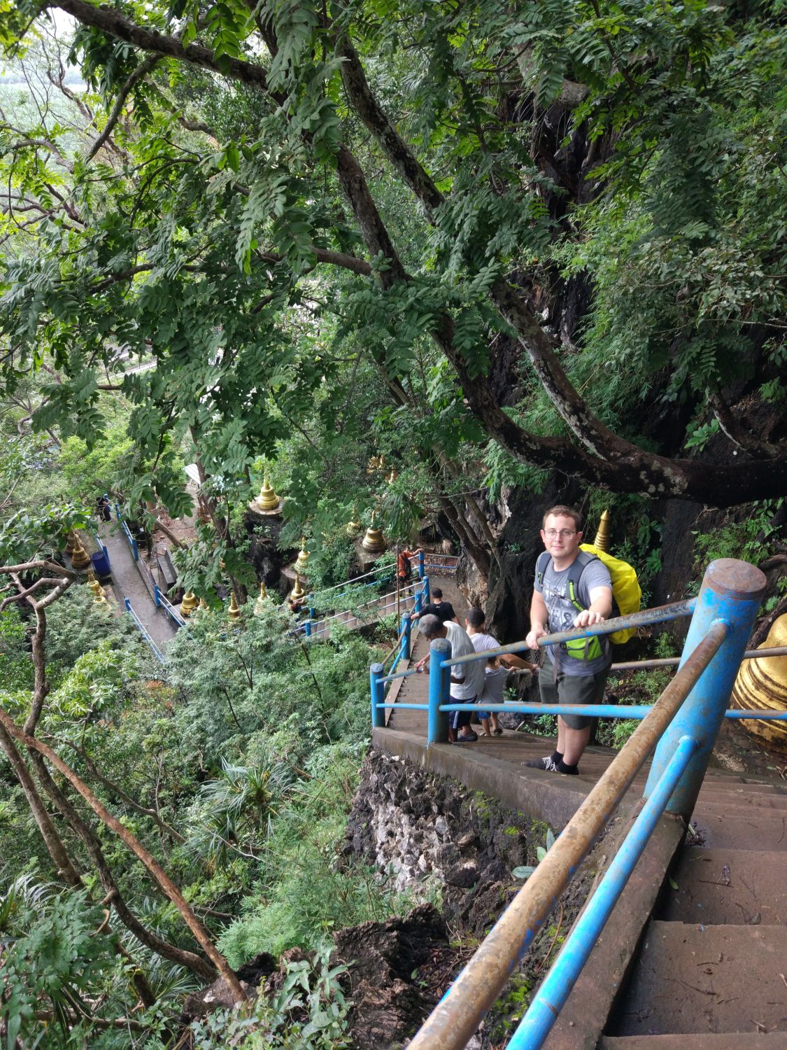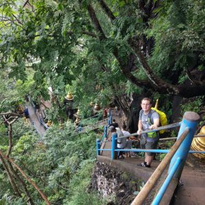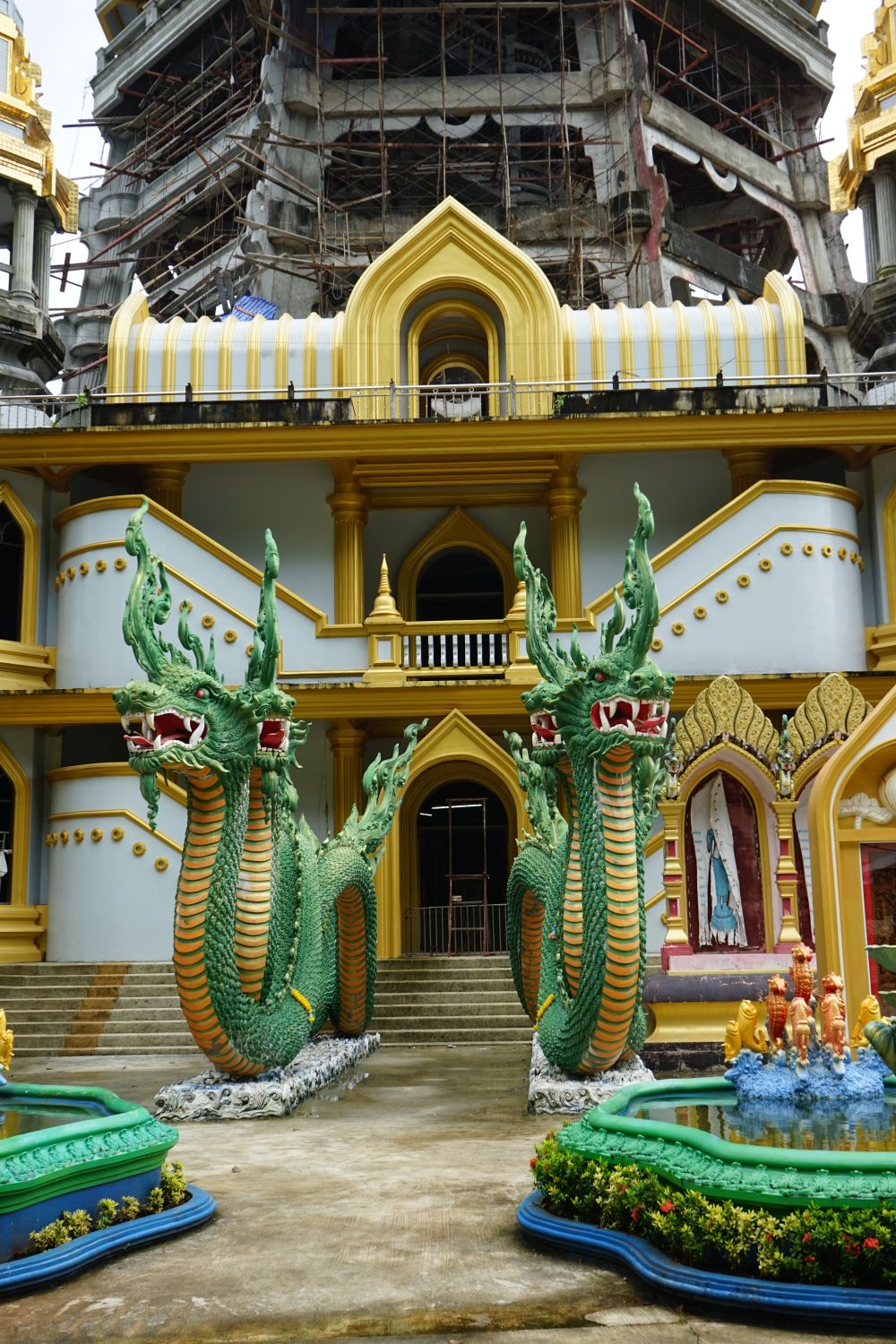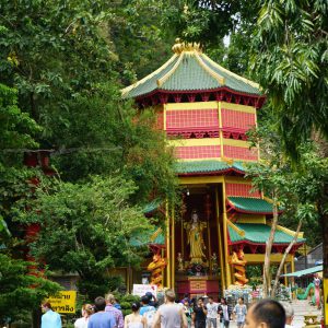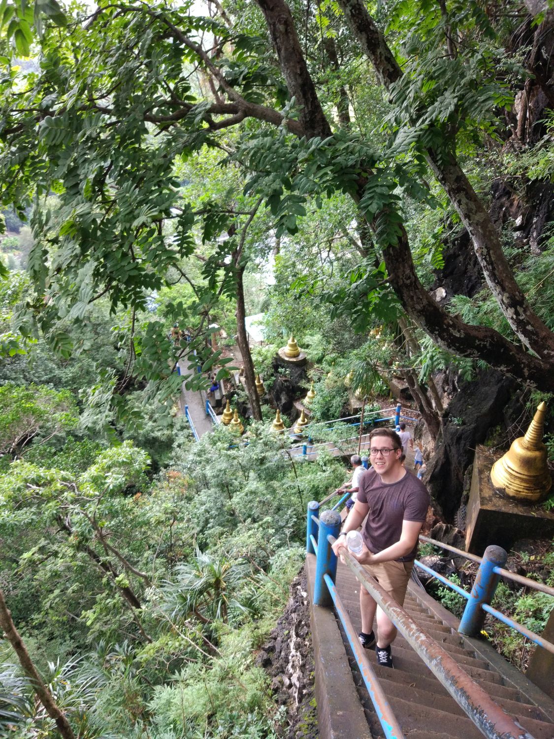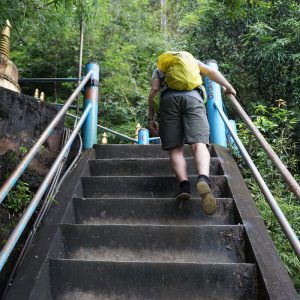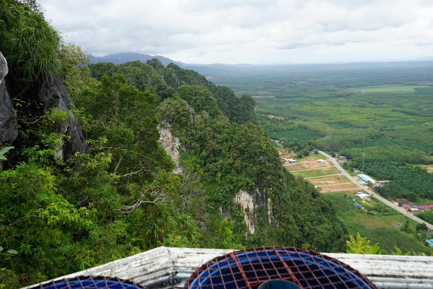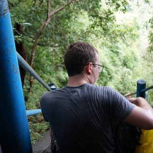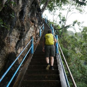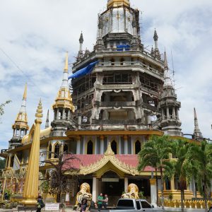 Am nächsten Mittag ging es für Philip und mich zum Wat Tham Suea Tempel (Tiger Cave Temple). Dieser teilt sich in zwei Bereiche auf. Zum einen die Tempelanlage am Fuße des Berges sowie der große sitzende Buddha auf der Bergspitze. Diese kann nur per Fuß erreicht werden, genau gesagt über 1237 Stufen hinweg. Als der Buddha noch im Bau war, wurden Touristen gebeten Baumaterial mit auf die Bergspitze zu tragen, glücklicherweise ist das aktuell nicht mehr so. Was aber nicht bedeutet das der Aufstieg nur im Ansatz leicht gewesen wäre. Nach einem hohen Tempo die erste Hälfte der Stufen kroch ich förmlich nur noch die letzten Stufen hoch. Als wir dann schweißgebadet am Gipfel ankamen, wurden wir zumindest mit einer herrlichen Aussicht sowie einer kühlen Brise belohnt. Nach gut einer drei viertel Stunde ausschwitzen und Bilder machen ging es dann wieder den Berg hinunter, der Abstieg verlief bis auf einen Regenschauer problemfrei und den Rest des Tages wurde faul im Hotelzimmer verbracht.