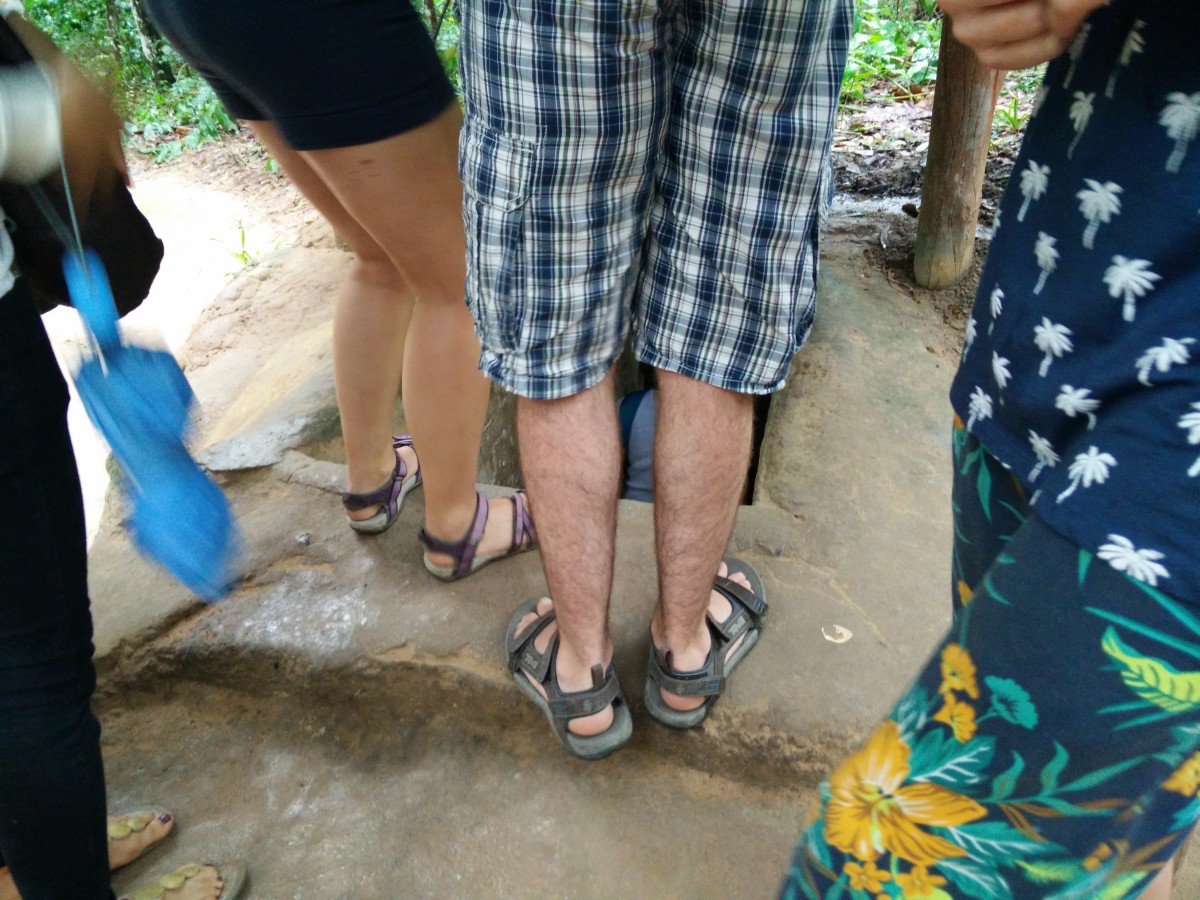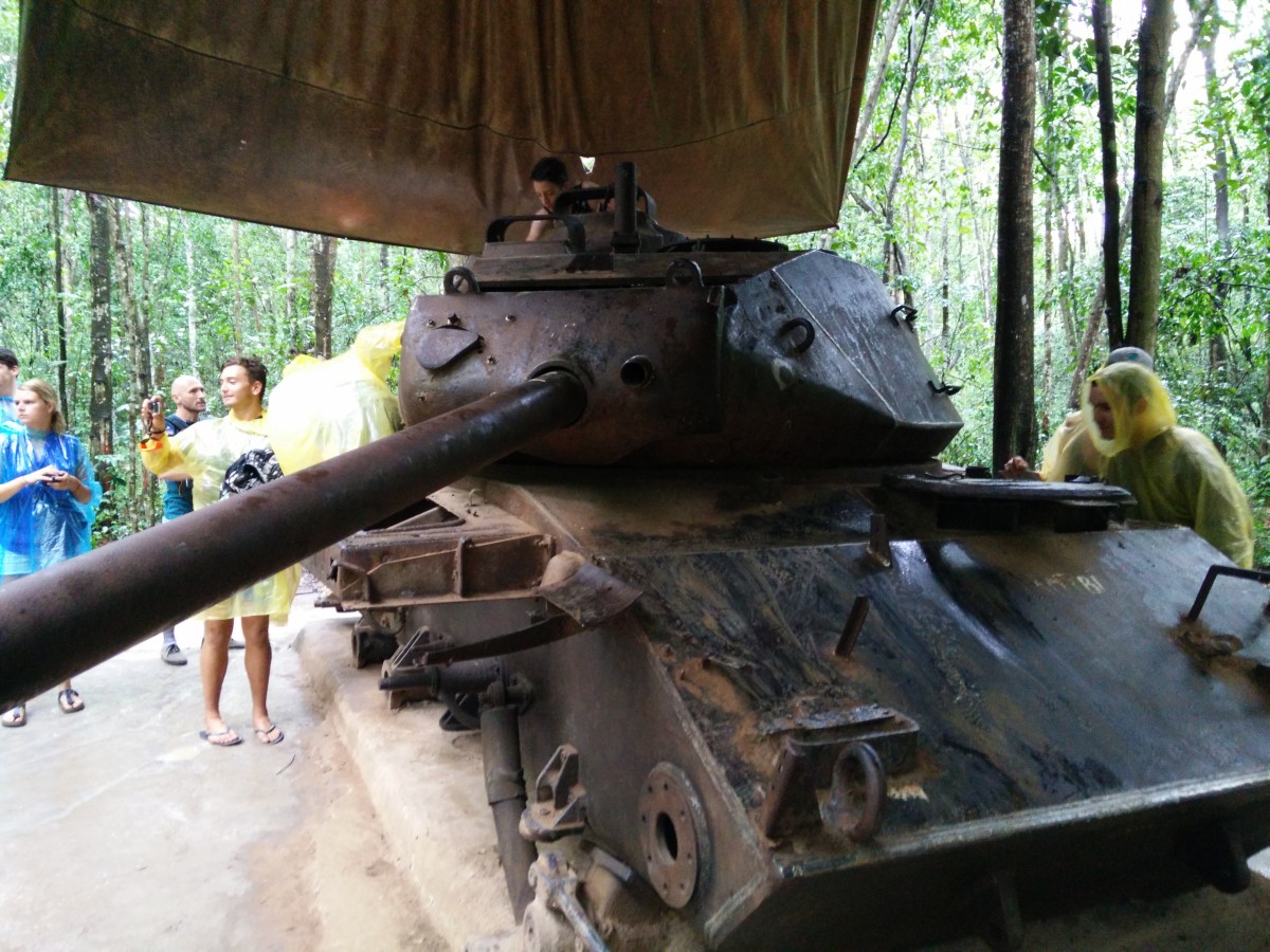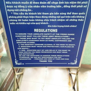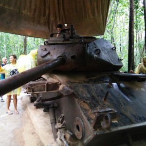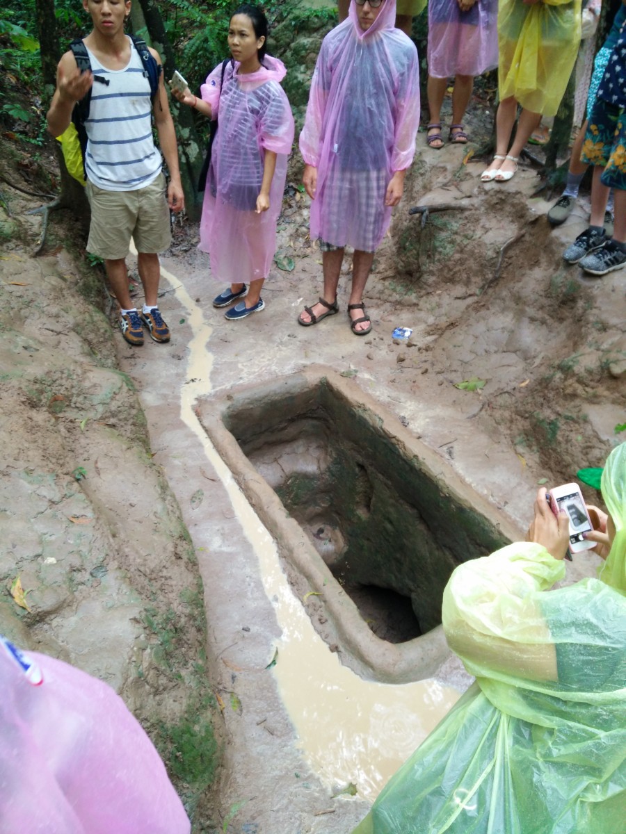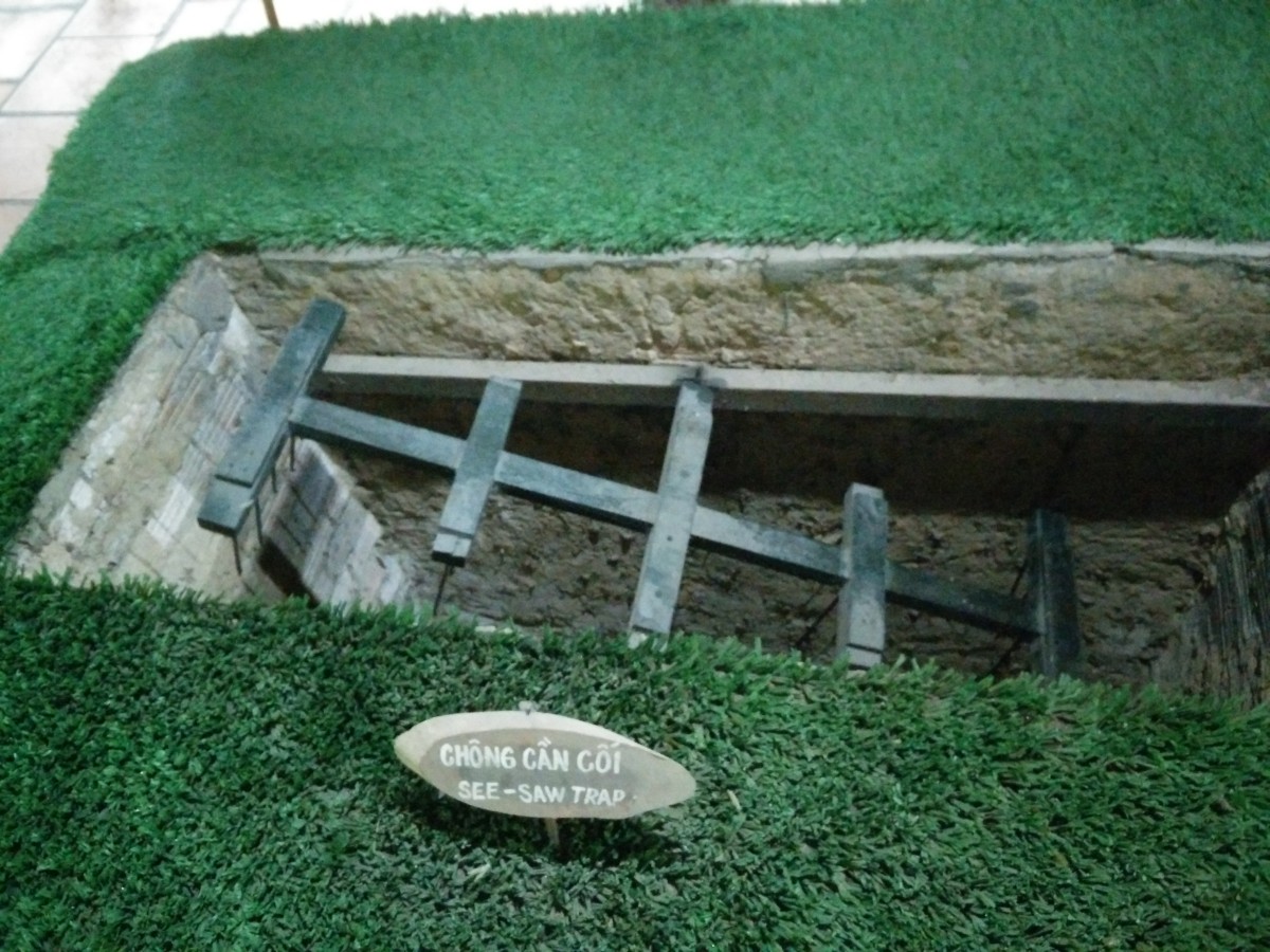 Das beschreibt im Groben und Ganzen den heutigen Ausflug zum Cu Chi Tunnelnetzwerk. Als erstes ging es jedoch in eine Art Behindertenwerkstatt die von der Regierung subventioniert wird und in der Menschen arbeiten die Aufgrund der von den USA eingesetzten Dioxinen behindert zur Welt kamen. Sie setzten Eierschalen in mühevoller Handarbeit zu Bildern zusammen, die dann über mehrere Arbeitsschritte gehärtet und bemalt werden. Danach ging es dann zum eigentlichen Ziel des Ausflugs. Zu nächst gab es Informationen über die allgemeine Kriegsführung der Vietcong, sowie den Bau der Tunnel und den damit verbundene Fallen. Nach einem Zwischenstopp an einem Schießstand, bei dem das abfeuern einer AK47 mit 10 Schuss bei etwa 17€ lag, wurde ein 20m langer Tunnel durchkrochen. Bei der Enge und Hitze alles andere als angenehm. Abends waren wir dann noch mit Philips Bruder, der in Saigon wohnt, Essen.