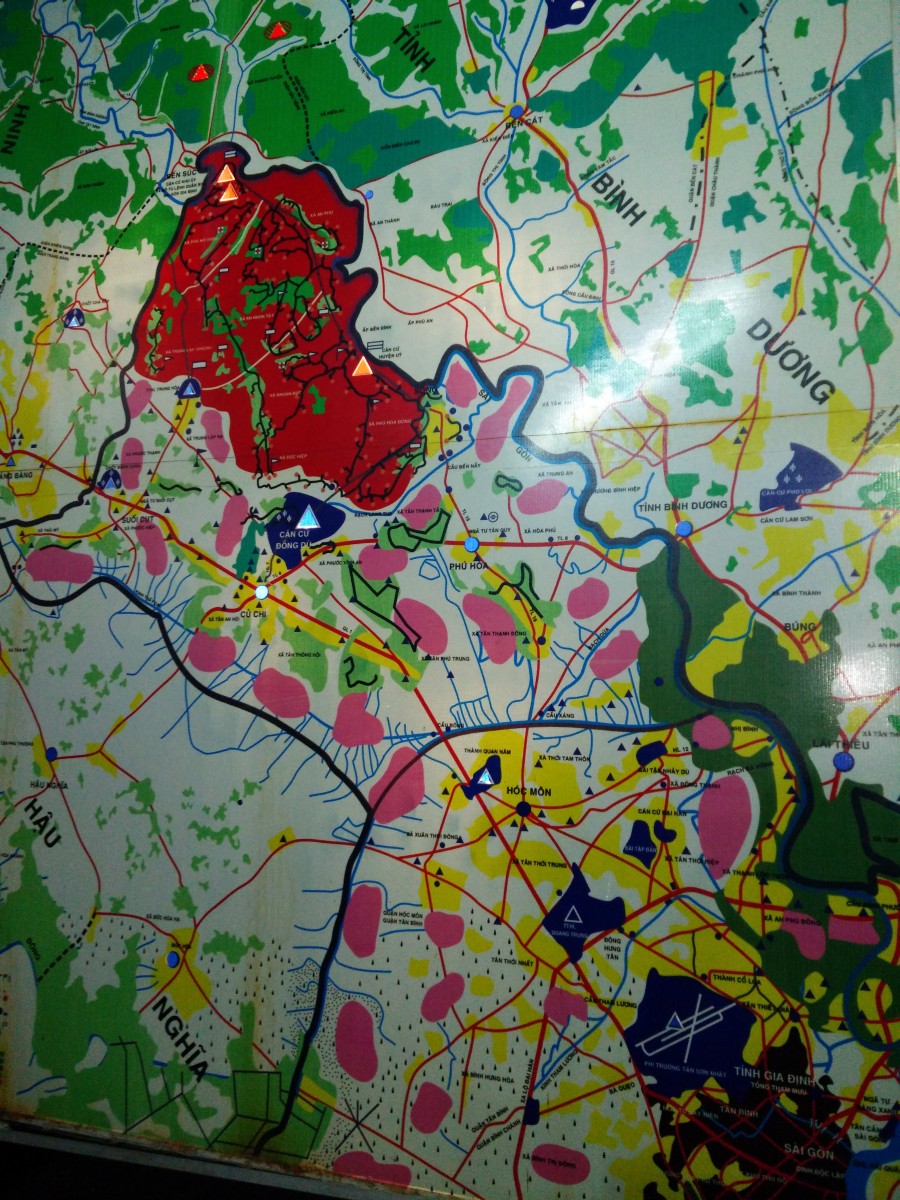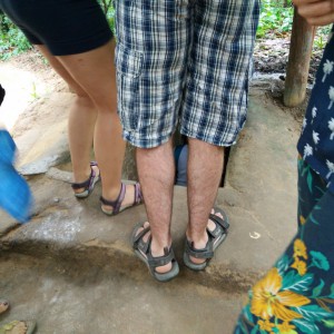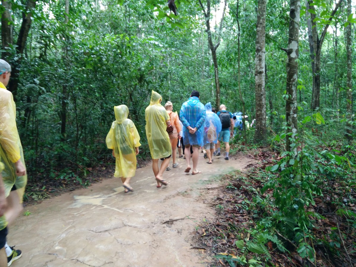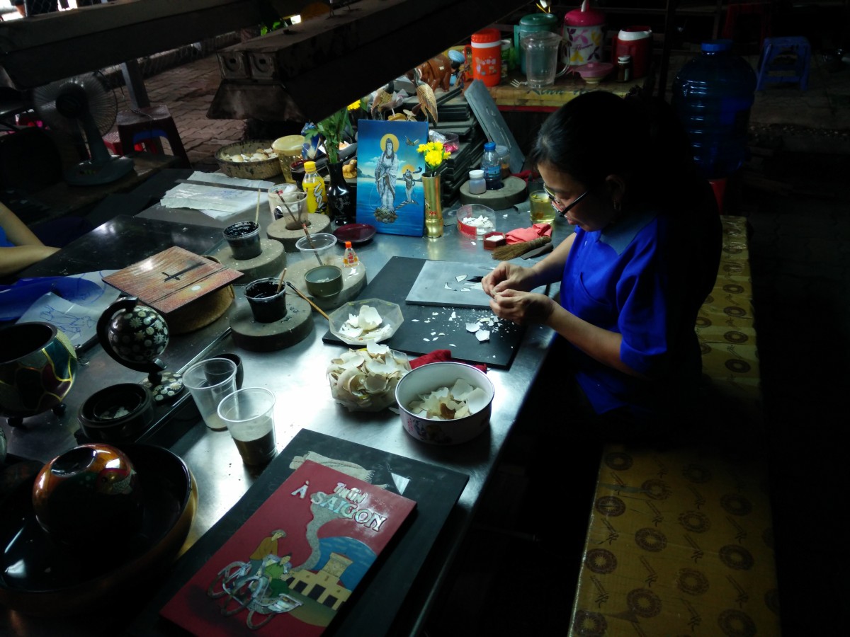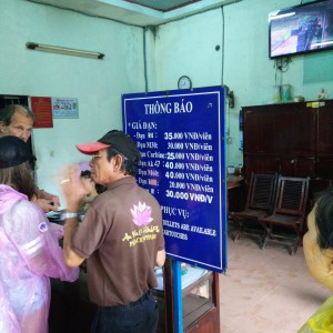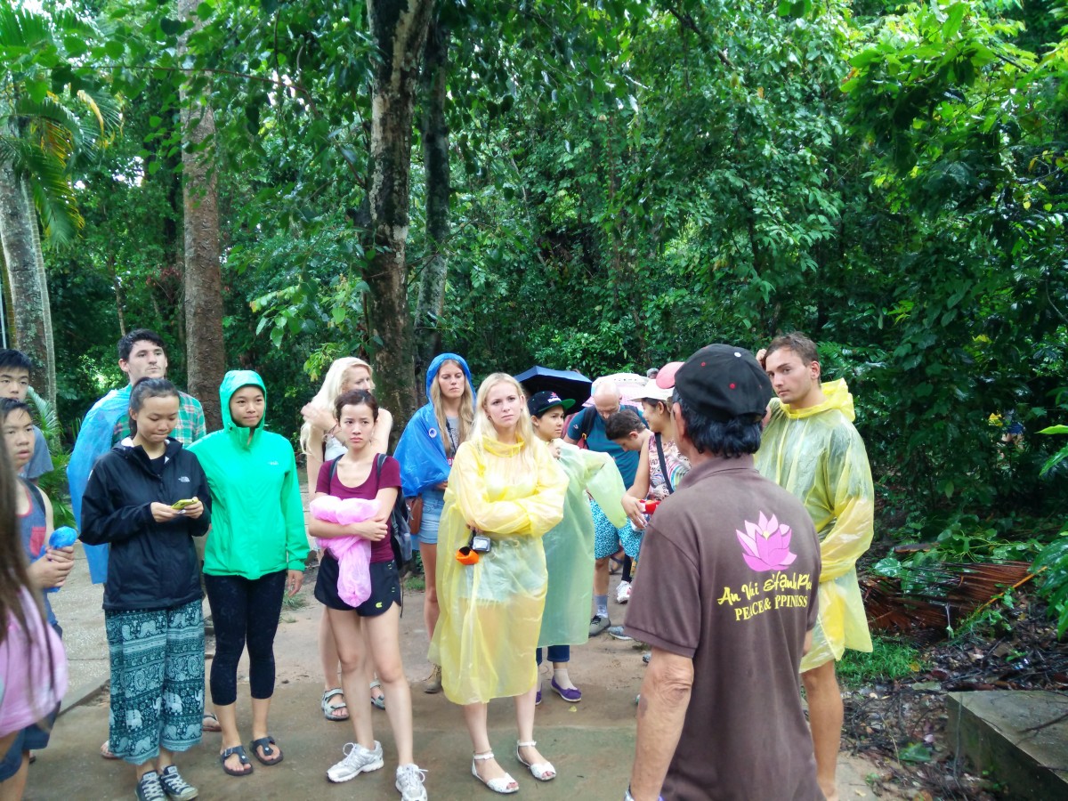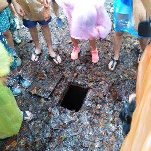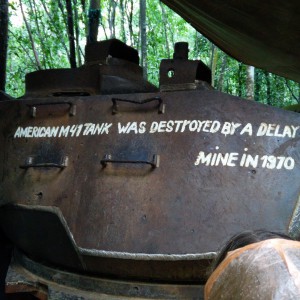 Das beschreibt im Groben und Ganzen den heutigen Ausflug zum Cu Chi Tunnelnetzwerk. Als erstes ging es jedoch in eine Art Behindertenwerkstatt die von der Regierung subventioniert wird und in der Menschen arbeiten die Aufgrund der von den USA eingesetzten Dioxinen behindert zur Welt kamen. Sie setzten Eierschalen in mühevoller Handarbeit zu Bildern zusammen, die dann über mehrere Arbeitsschritte gehärtet und bemalt werden. Danach ging es dann zum eigentlichen Ziel des Ausflugs. Zu nächst gab es Informationen über die allgemeine Kriegsführung der Vietcong, sowie den Bau der Tunnel und den damit verbundene Fallen. Nach einem Zwischenstopp an einem Schießstand, bei dem das abfeuern einer AK47 mit 10 Schuss bei etwa 17€ lag, wurde ein 20m langer Tunnel durchkrochen. Bei der Enge und Hitze alles andere als angenehm. Abends waren wir dann noch mit Philips Bruder, der in Saigon wohnt, Essen.